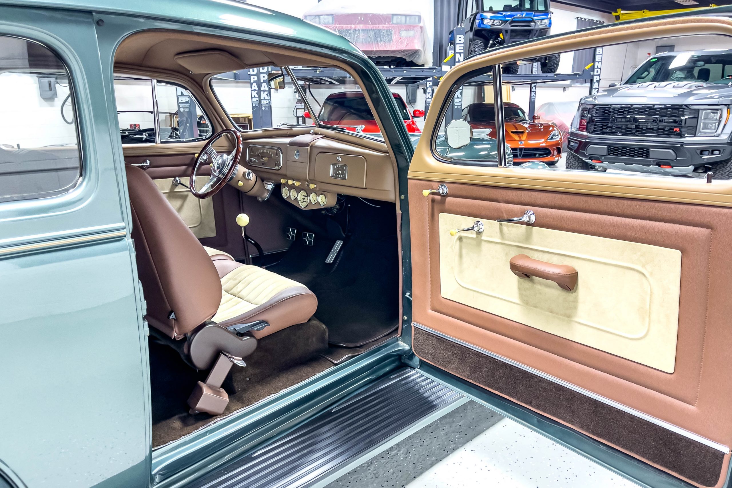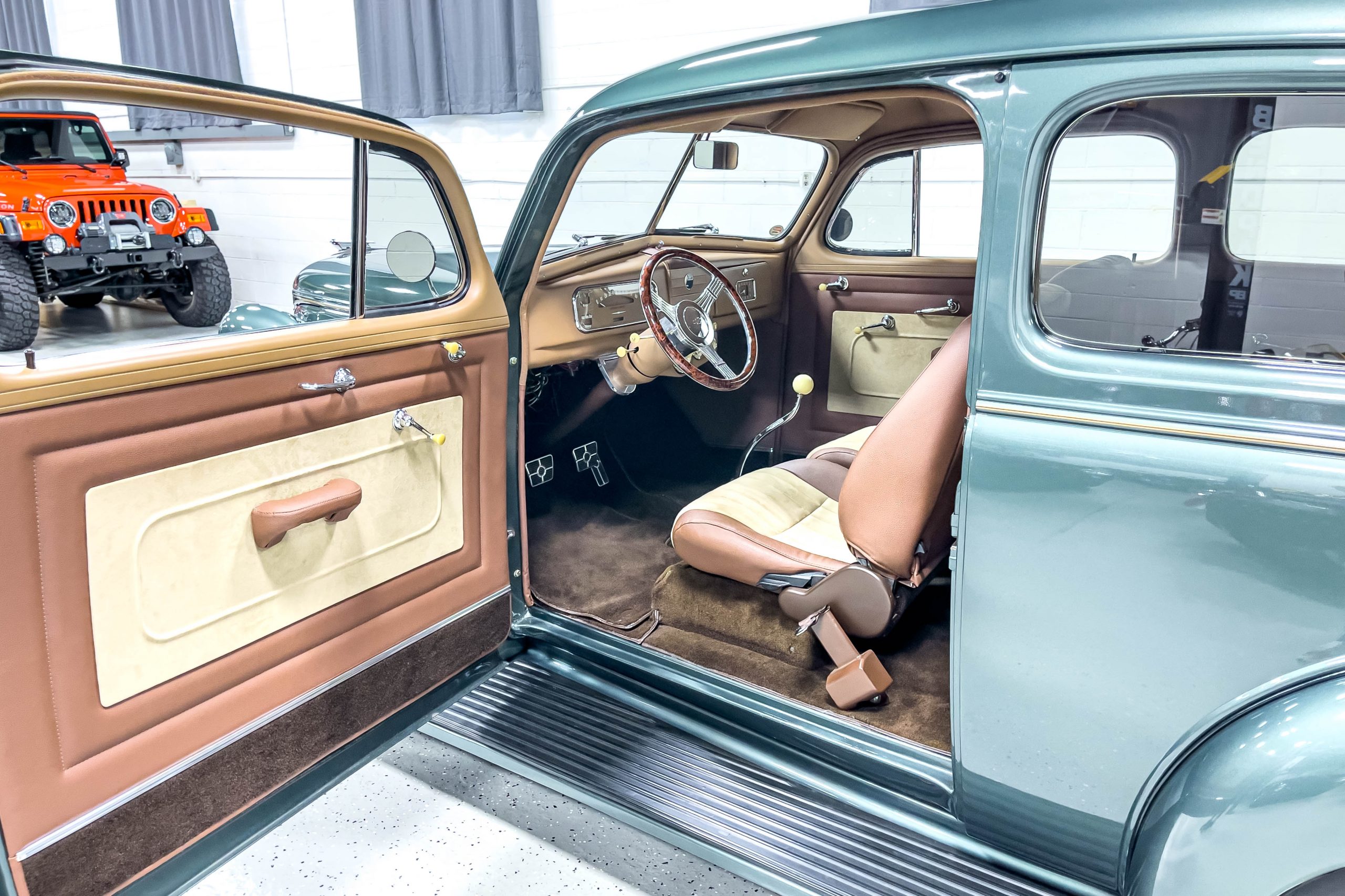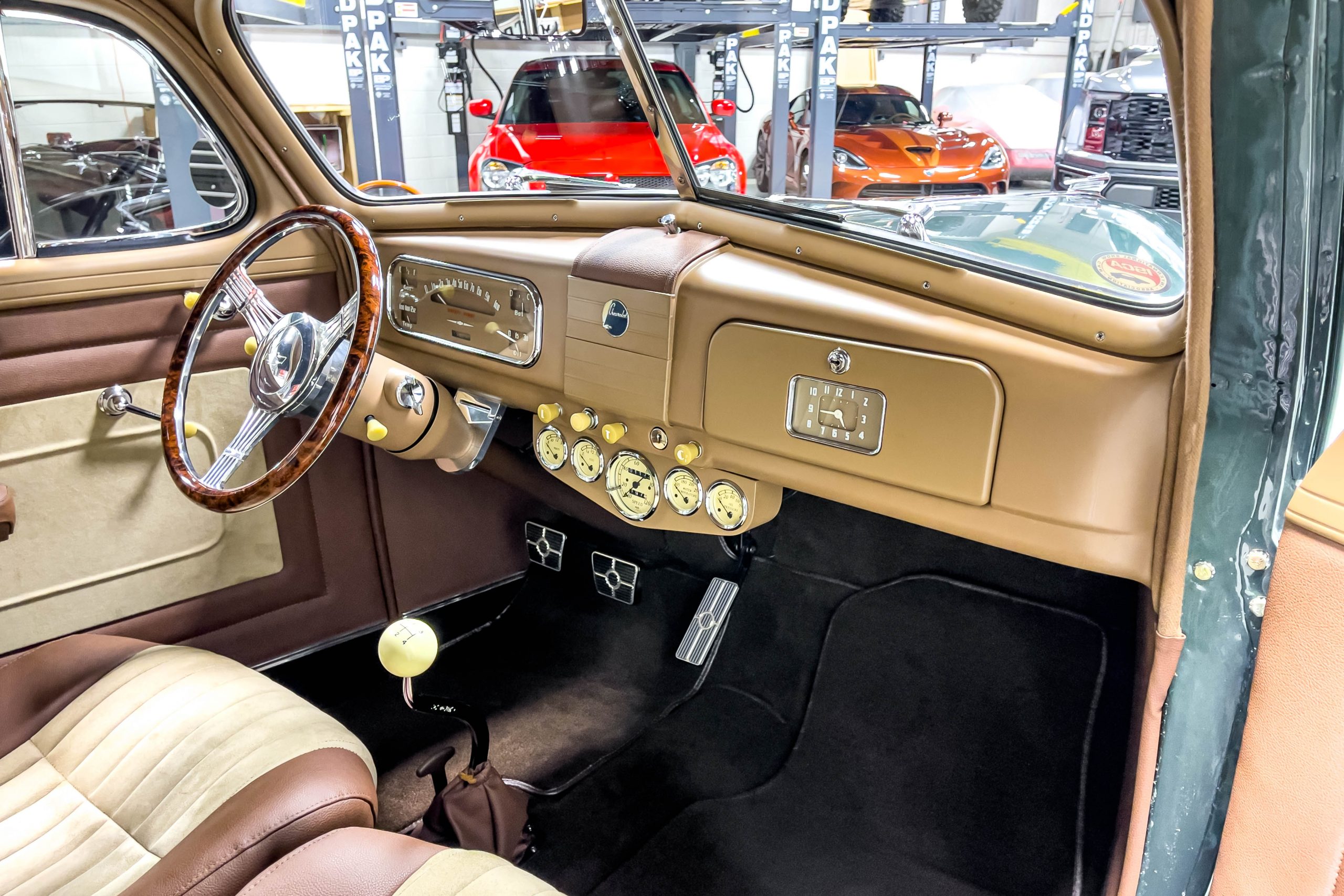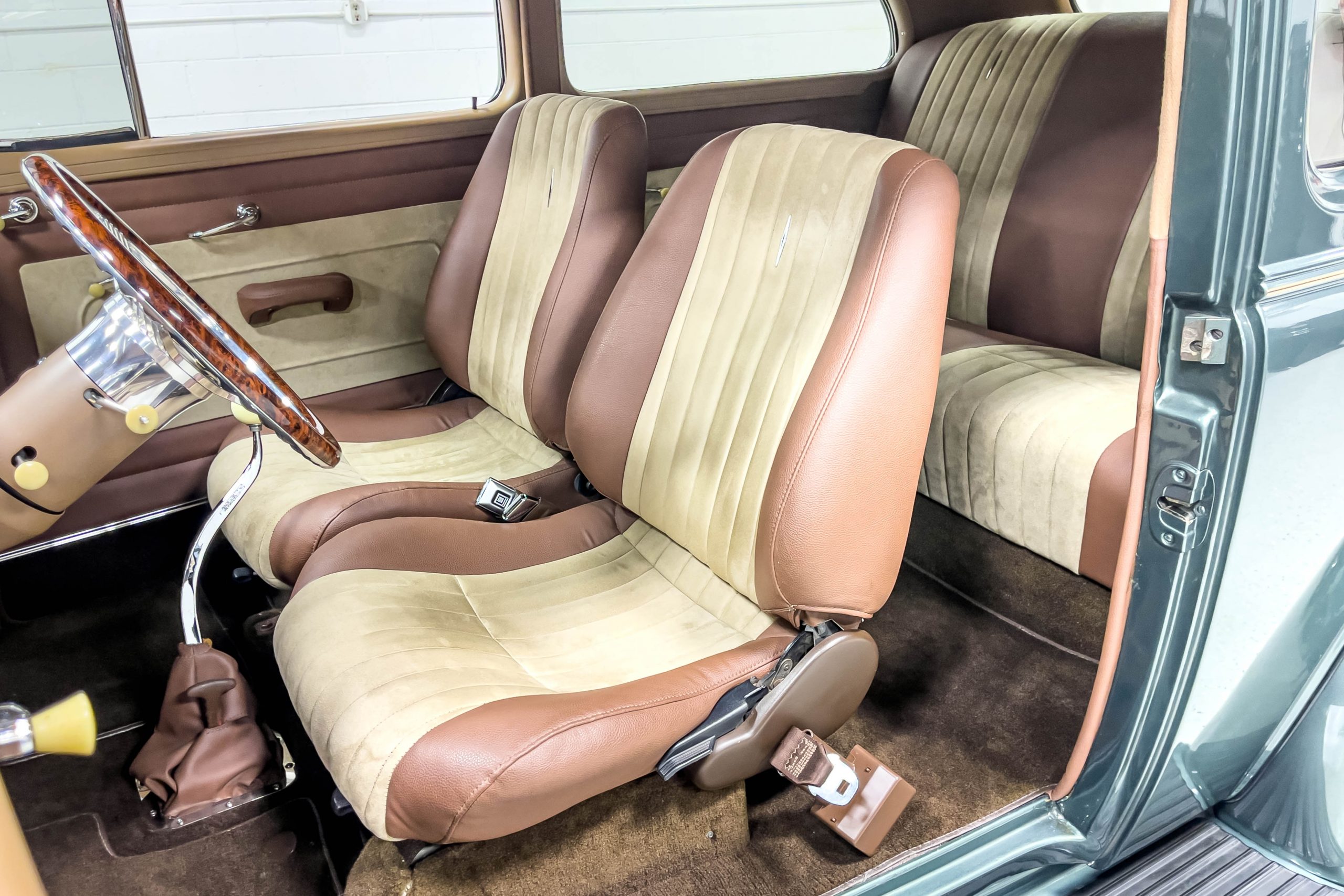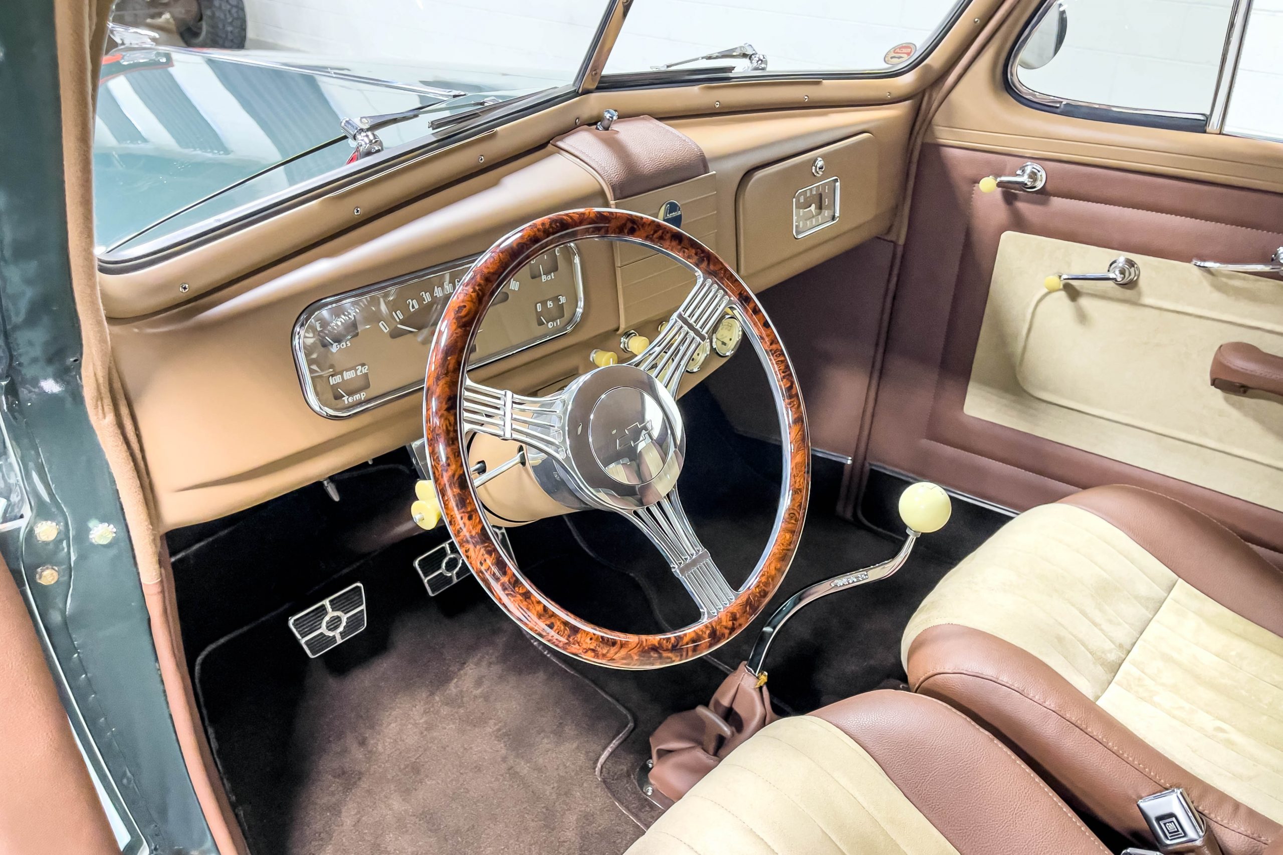 The restoration and hot-rodding process reportedly started in the late 1980s in which it has been preserved and updated as the decades marched on. It is beautifully finished in a custom mix green that was reportedly applied in 1990 by Aman’s in Canton, OH along with a hand applied champaign colored pin stripe and still presents exceptionally well today. The current custom interior appears to have been updated and installed in 2015 as it has a lovely modern presentation in a two-tone tan and chocolate brown color scheme with leather and suede seat material with no visible wear to speak of. The original gauge cluster is not operational and in its place is a beautifully crafted gauge cluster mounted at the bottom of the dash housing VDO gauges for battery voltage, fuel, speedometer, odometer, trip odometer, water temperature, and oil pressure. It also features an Ididit steering column and a chromed Hurst shifter. The current mileage shown is 1,123 miles which is reportedly the mileage accumulated since installation of the new gauges in 2015. We have driven approximately 250 miles in our 3 years of ownership.