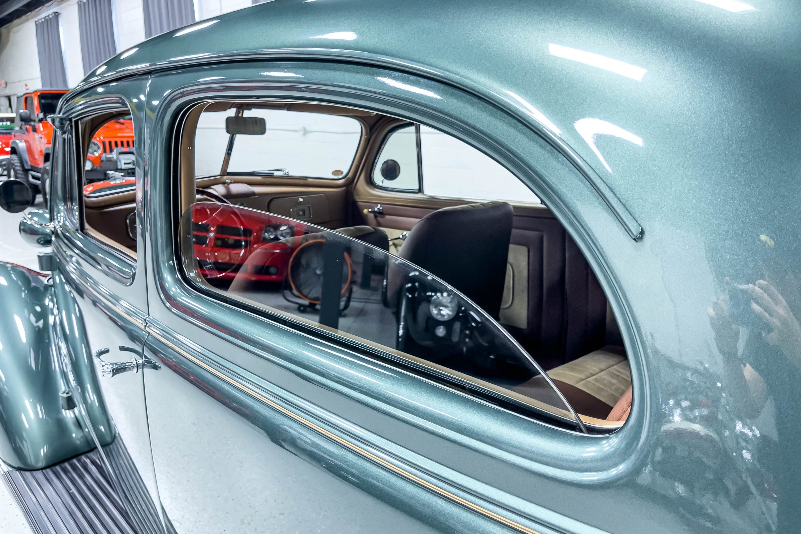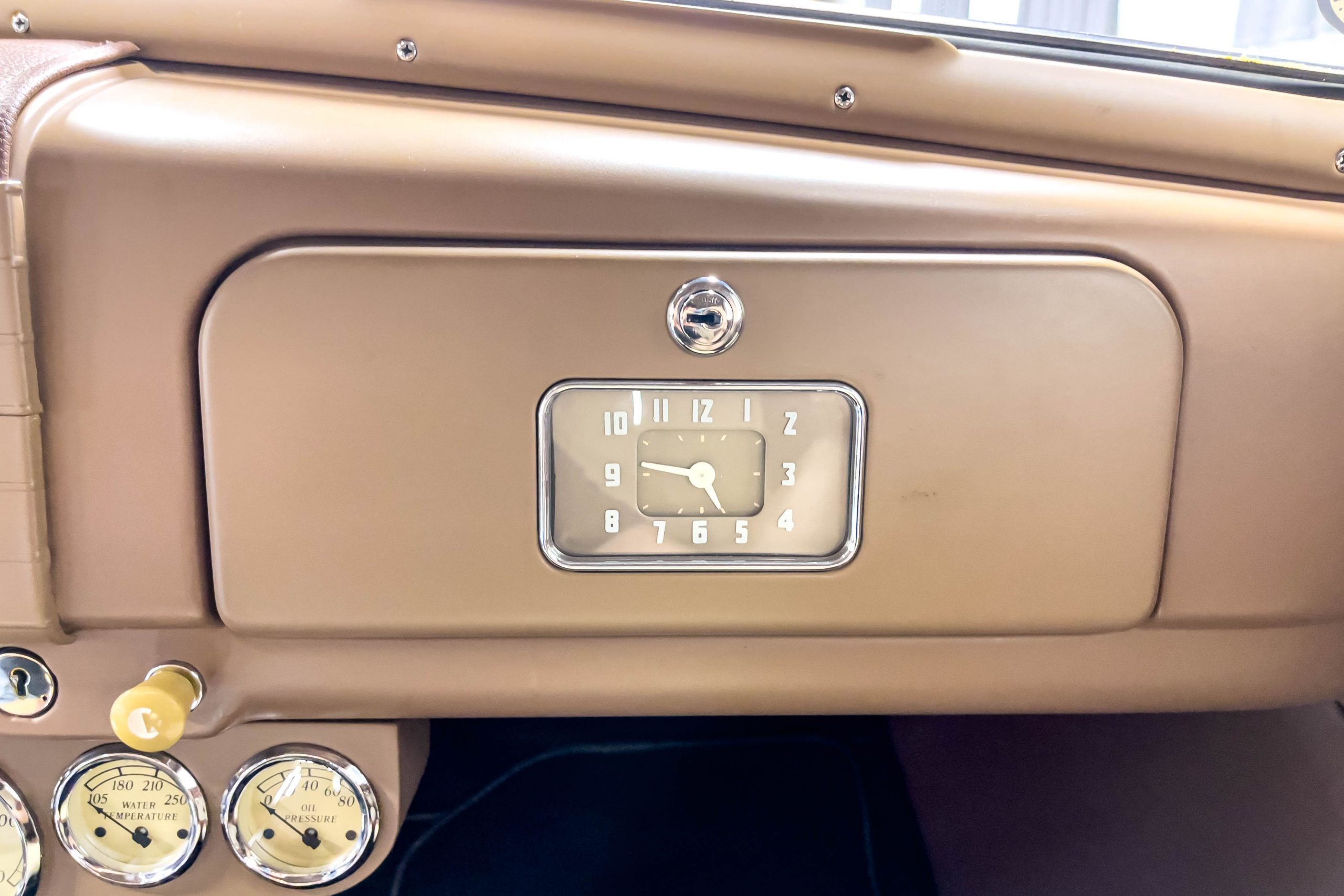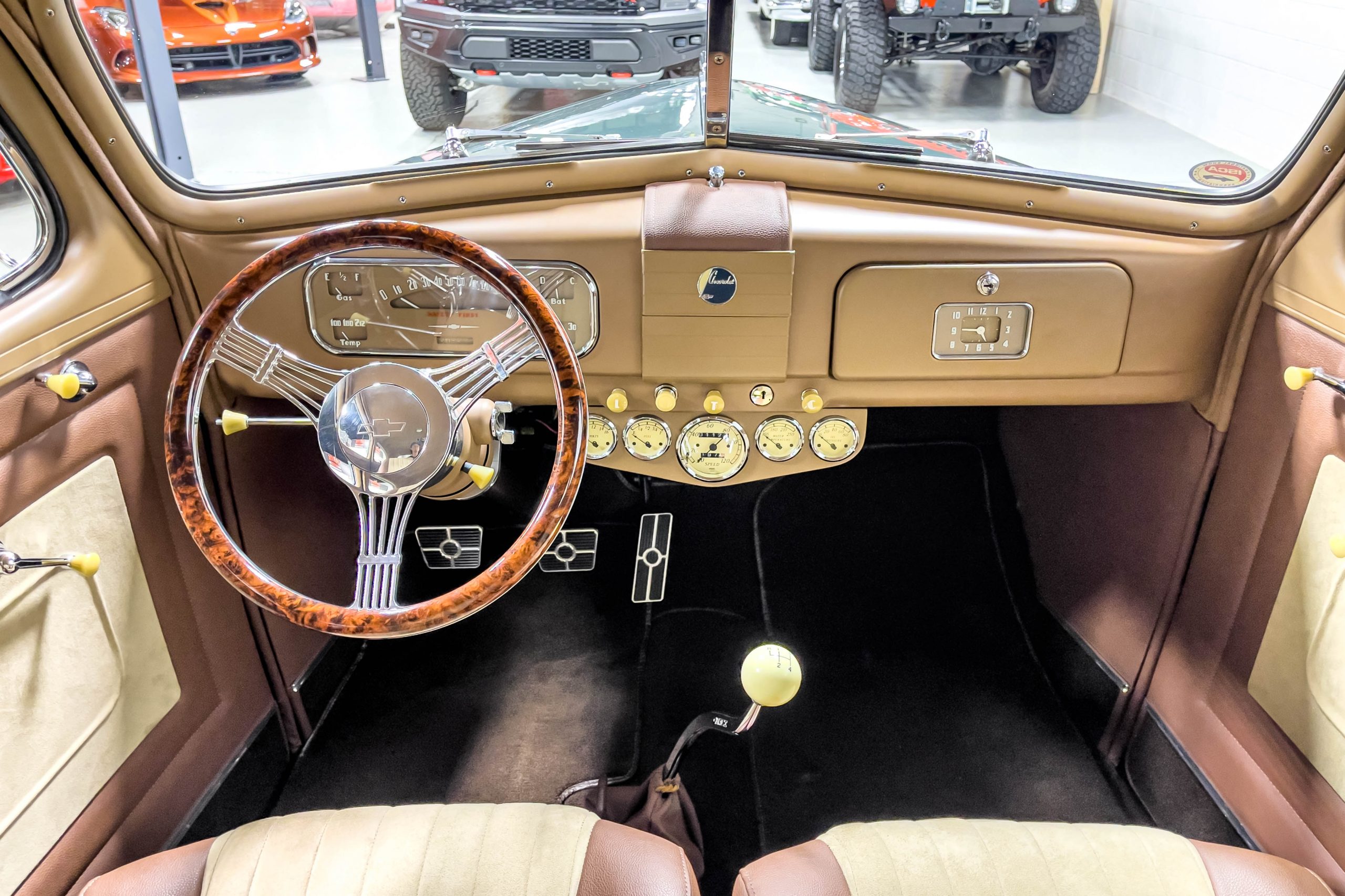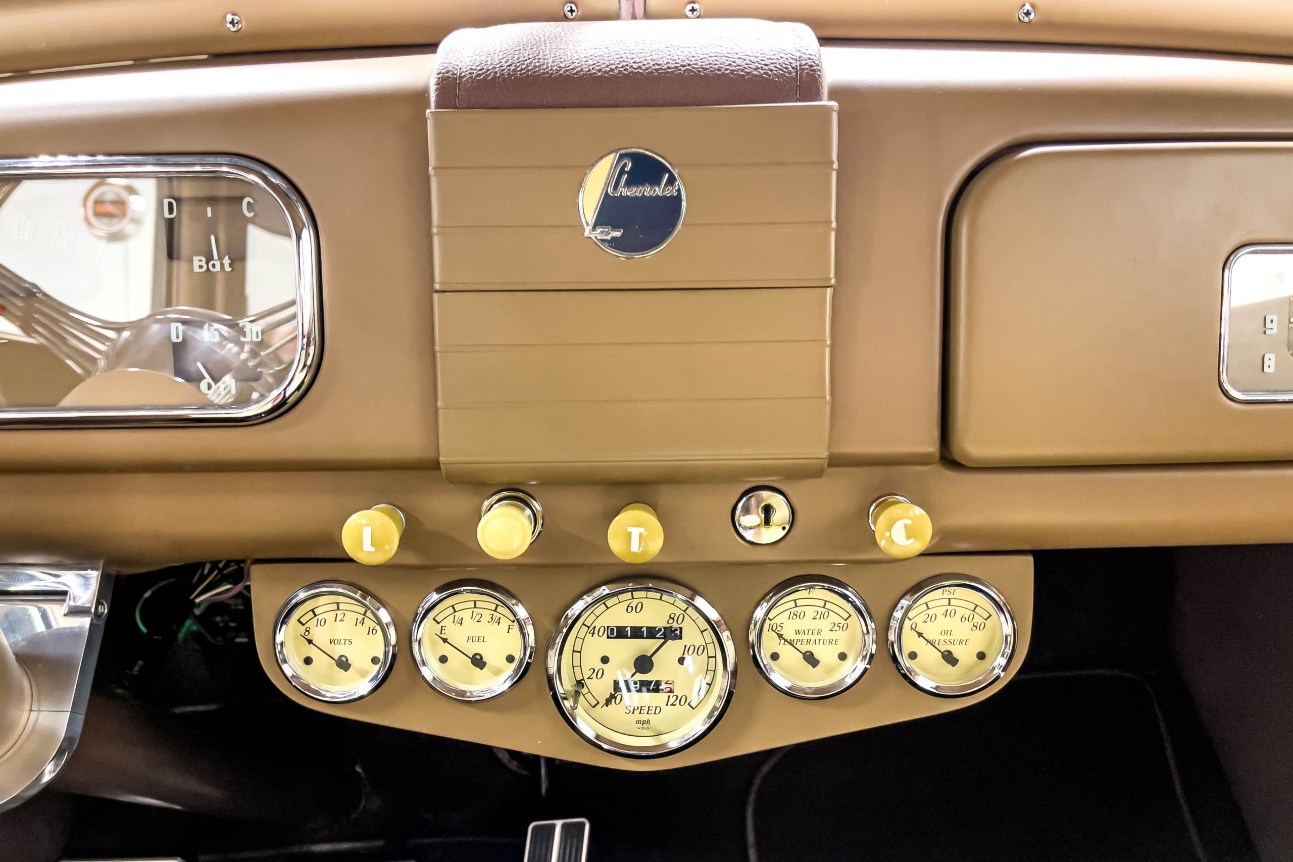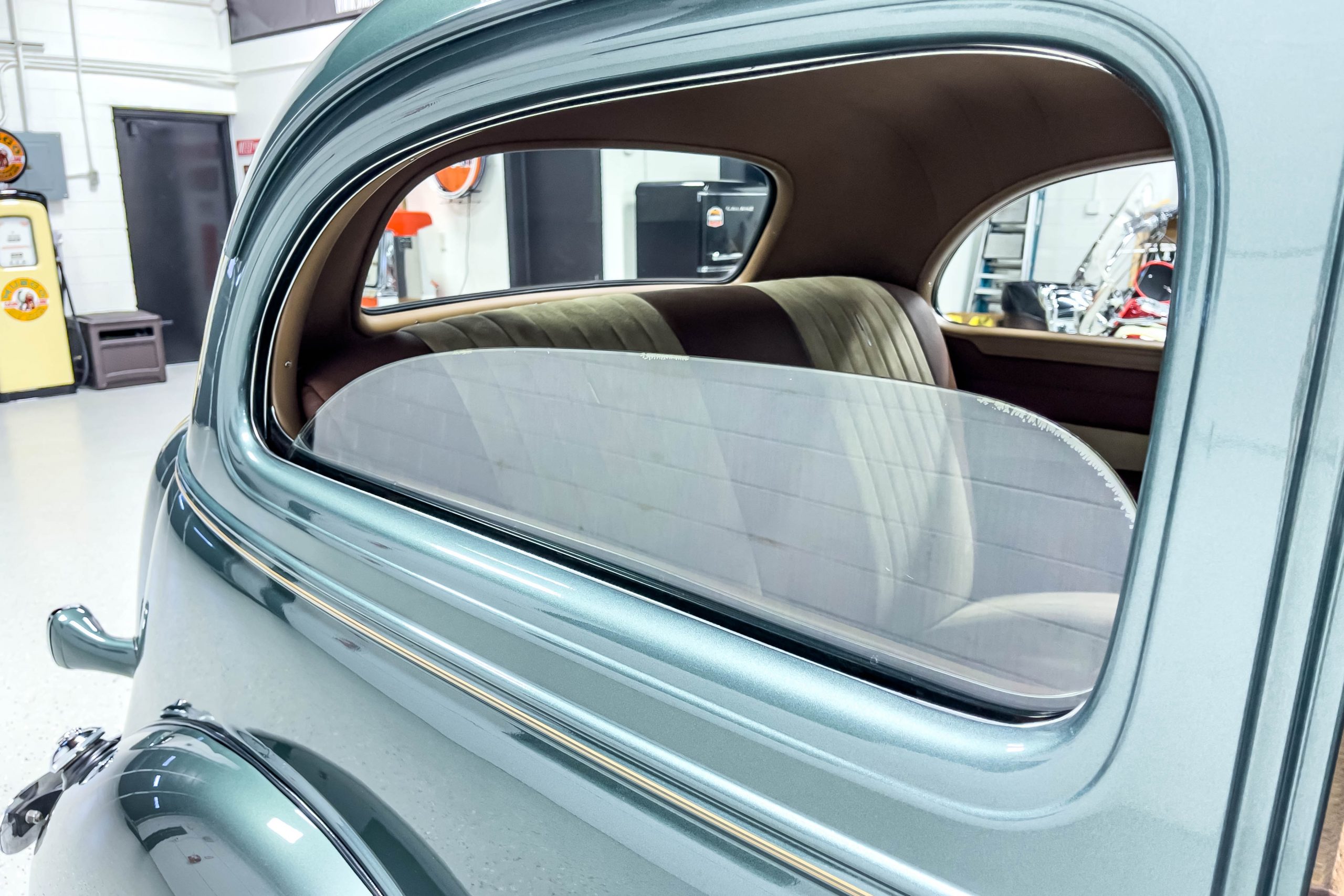 The restoration and hot-rodding process reportedly started in the late 1980s in which it has been preserved and updated as the decades marched on. It is beautifully finished in a custom mix green that was reportedly applied in 1990 by Aman’s in Canton, OH along with a hand applied champaign colored pin stripe and still presents exceptionally well today. The current custom interior appears to have been updated and installed in 2015 as it has a lovely modern presentation in a two-tone tan and chocolate brown color scheme with leather and suede seat material with no visible wear to speak of. The original gauge cluster is not operational and in its place is a beautifully crafted gauge cluster mounted at the bottom of the dash housing VDO gauges for battery voltage, fuel, speedometer, odometer, trip odometer, water temperature, and oil pressure. It also features an Ididit steering column and a chromed Hurst shifter. The current mileage shown is 1,123 miles which is reportedly the mileage accumulated since installation of the new gauges in 2015. We have driven approximately 250 miles in our 3 years of ownership.
