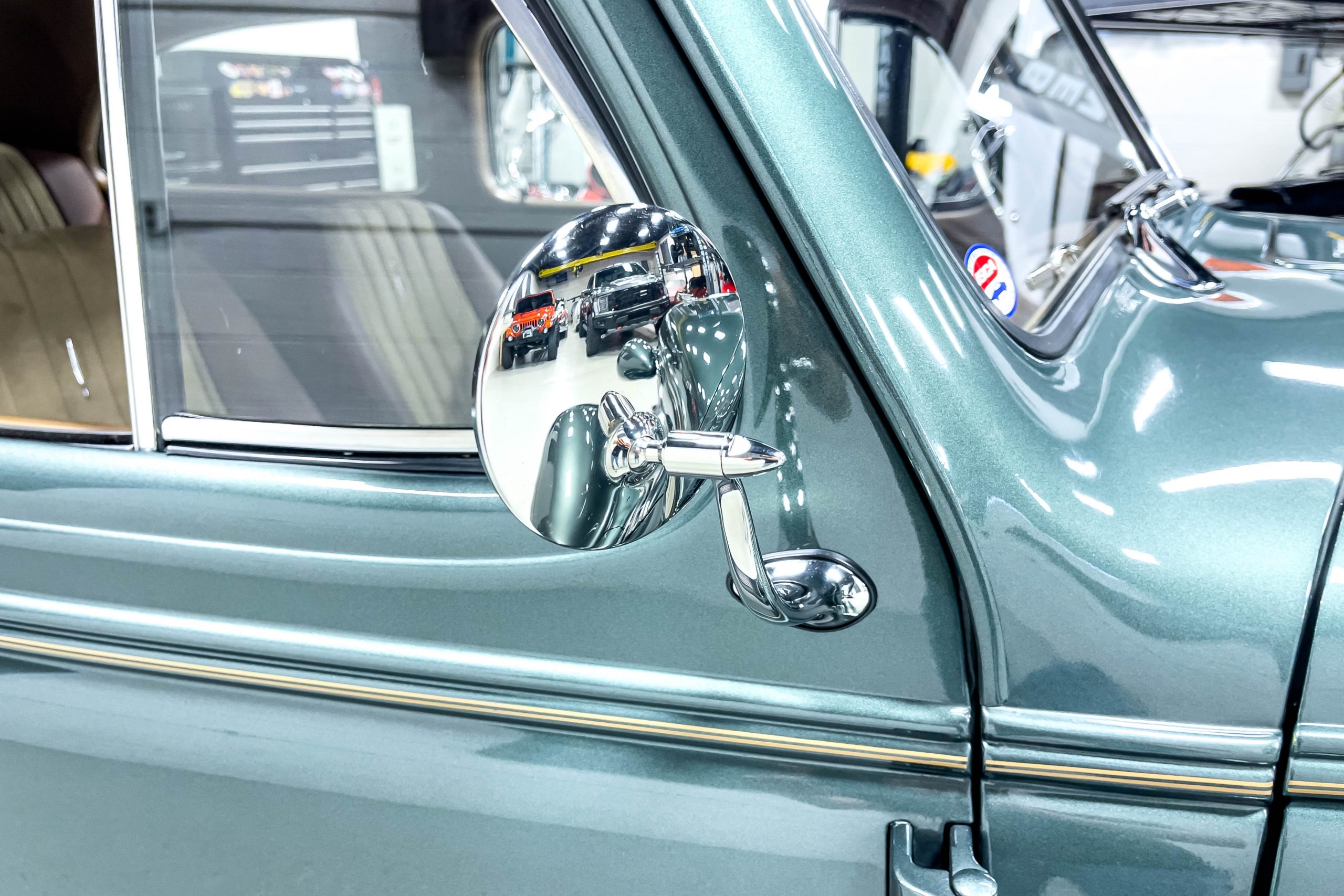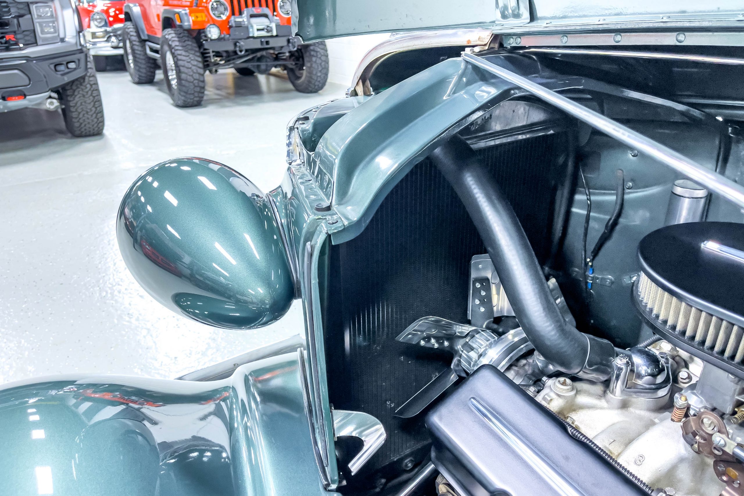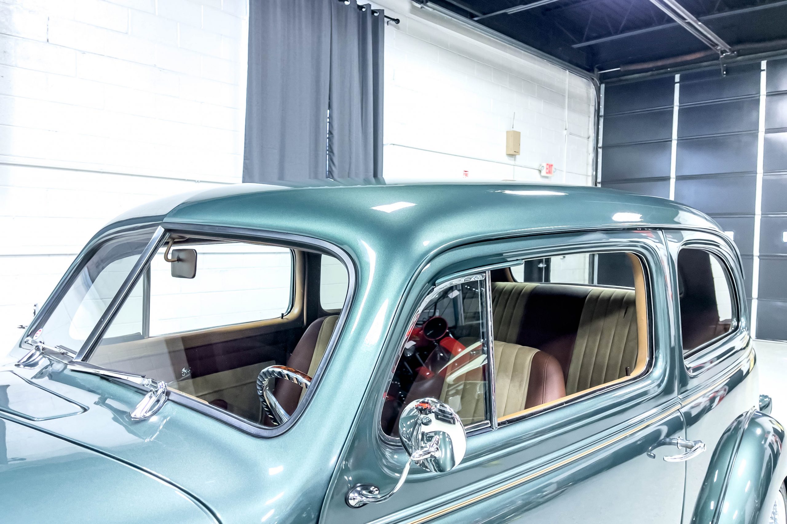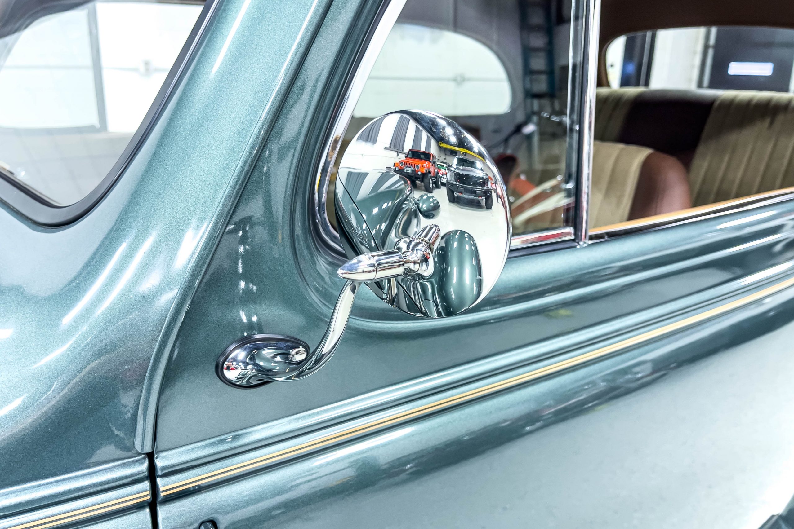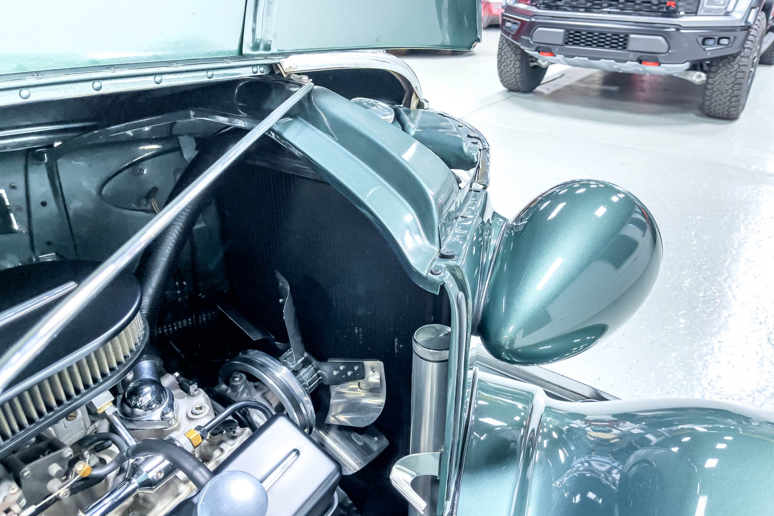 The restoration and hot-rodding process reportedly started in the late 1980s in which it has been preserved and updated as the decades marched on. It is beautifully finished in a custom mix green that was reportedly applied in 1990 by Aman’s in Canton, OH along with a hand applied champaign colored pin stripe and still presents exceptionally well today. The current custom interior appears to have been updated and installed in 2015 as it has a lovely modern presentation in a two-tone tan and chocolate brown color scheme with leather and suede seat material with no visible wear to speak of. The original gauge cluster is not operational and in its place is a beautifully crafted gauge cluster mounted at the bottom of the dash housing VDO gauges for battery voltage, fuel, speedometer, odometer, trip odometer, water temperature, and oil pressure. It also features an Ididit steering column and a chromed Hurst shifter. The current mileage shown is 1,123 miles which is reportedly the mileage accumulated since installation of the new gauges in 2015. We have driven approximately 250 miles in our 3 years of ownership.