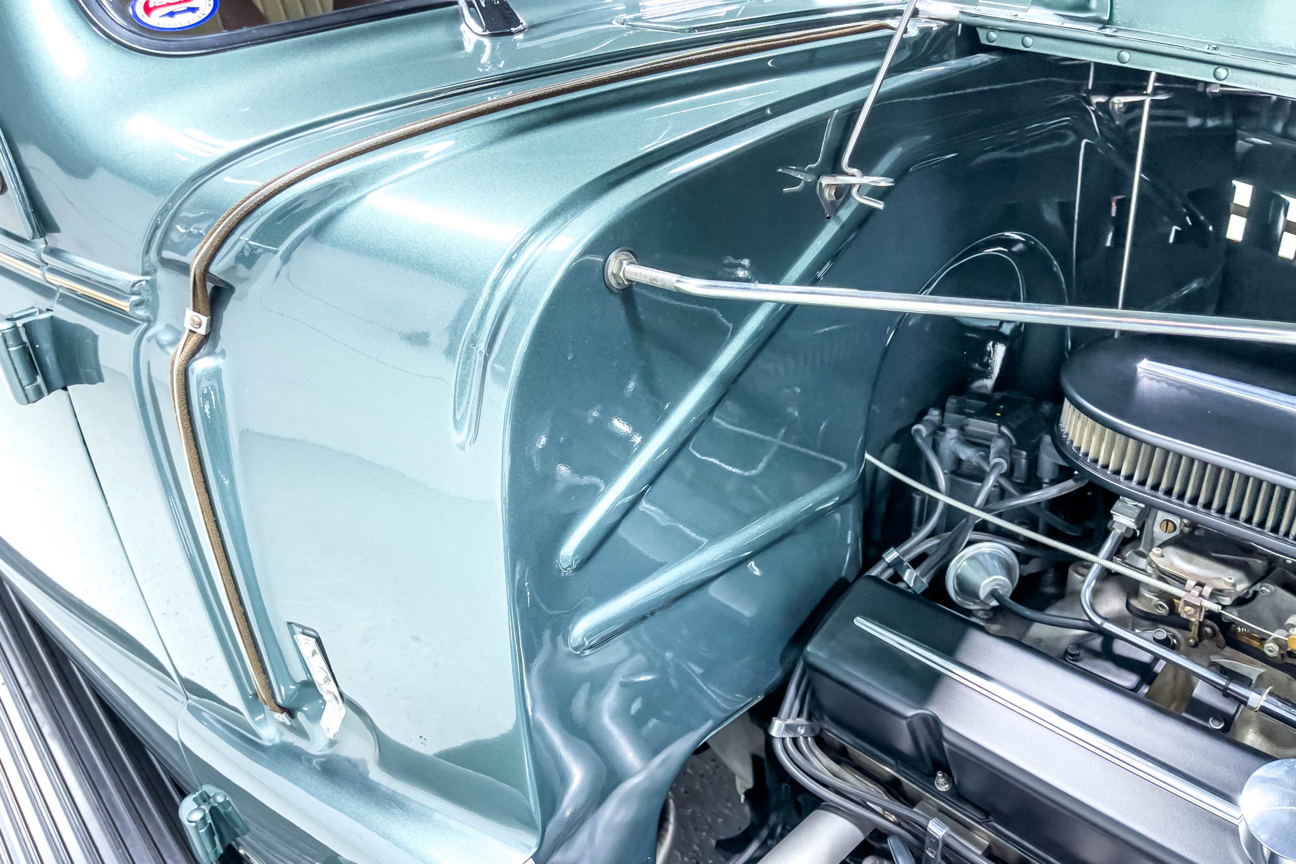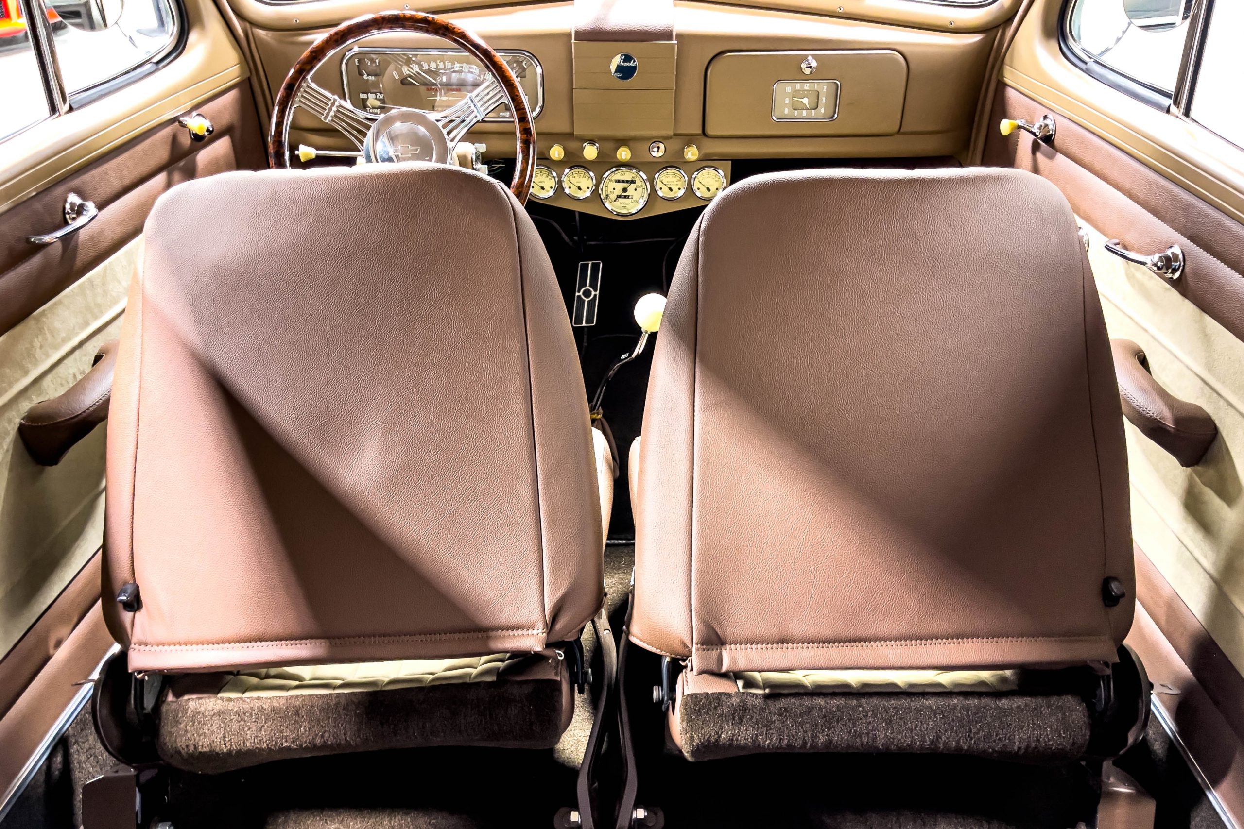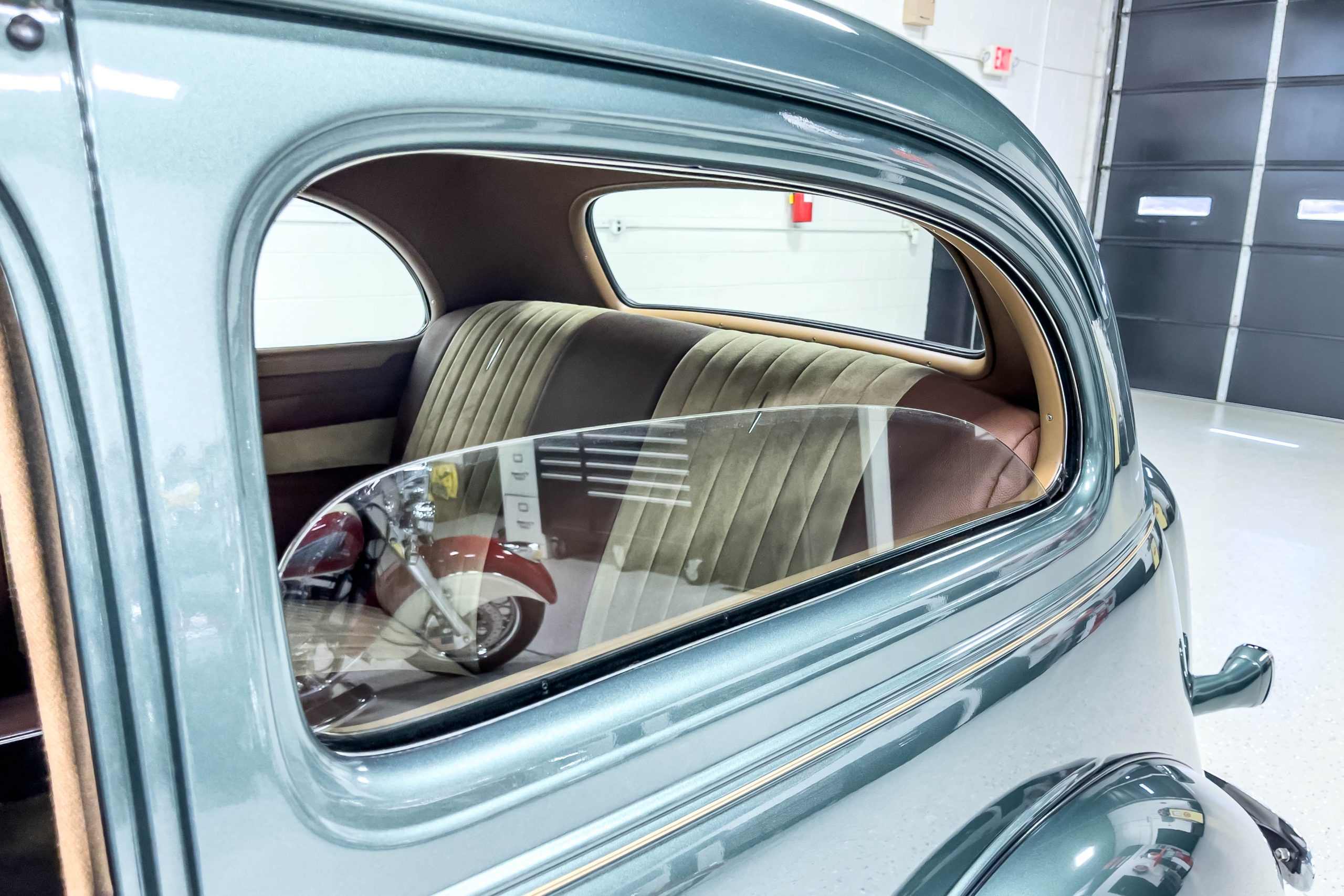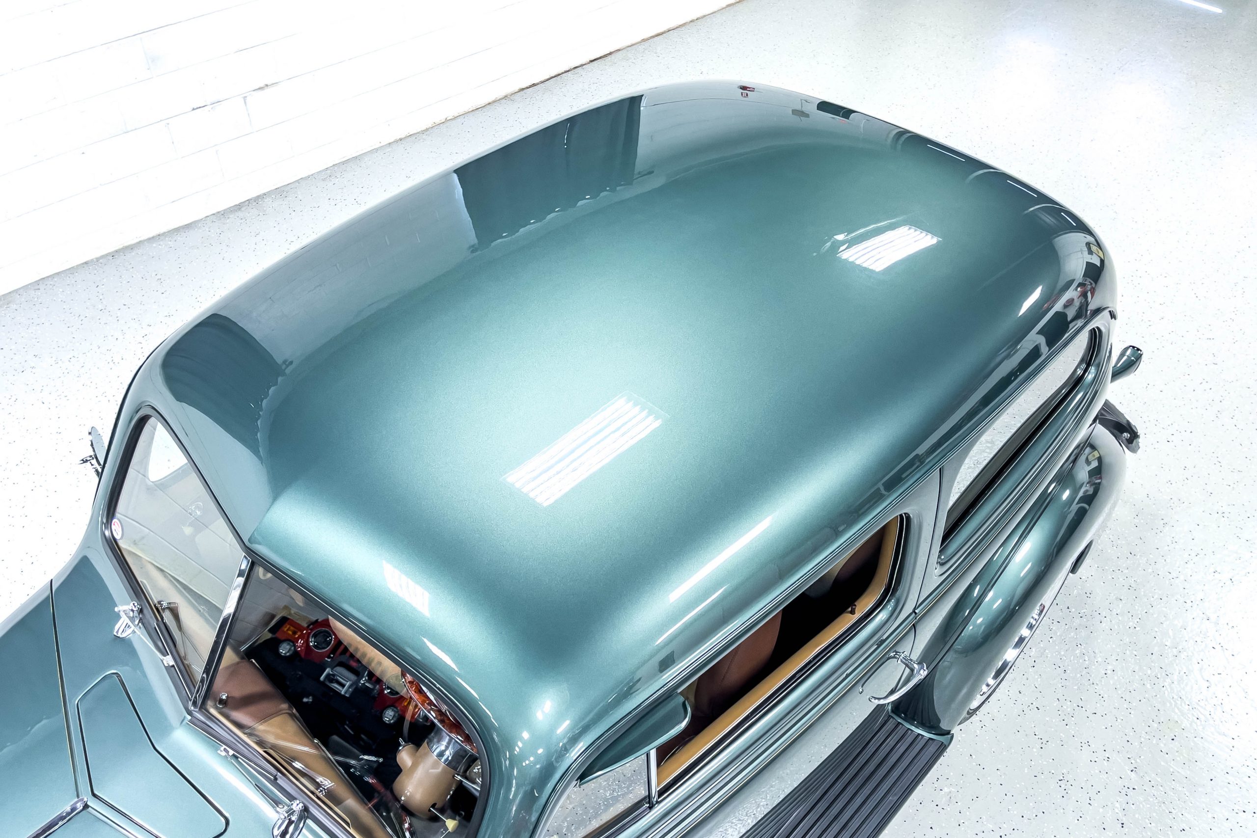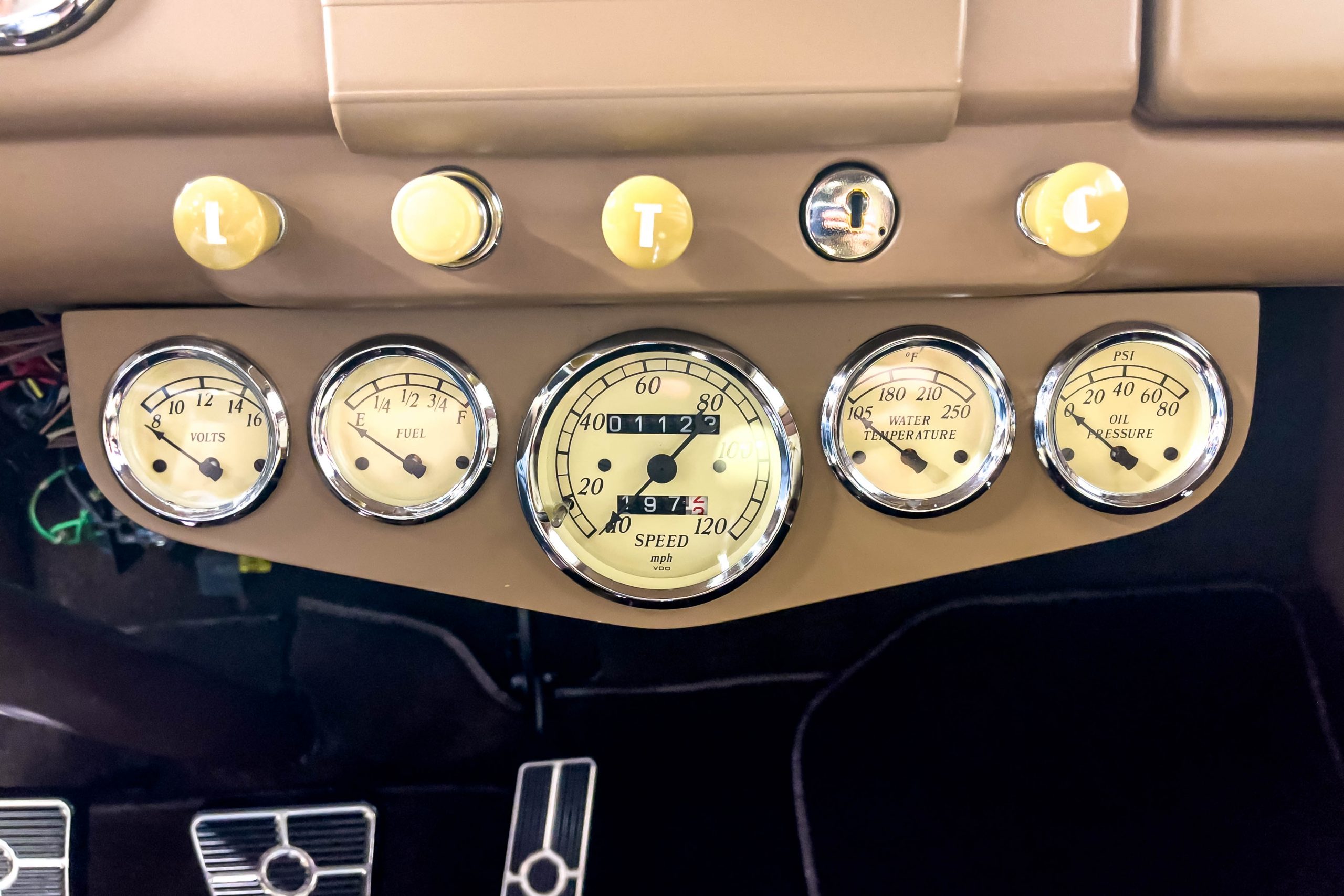 The restoration and hot-rodding process reportedly started in the late 1980s in which it has been preserved and updated as the decades marched on. It is beautifully finished in a custom mix green that was reportedly applied in 1990 by Aman’s in Canton, OH along with a hand applied champaign colored pin stripe and still presents exceptionally well today. The current custom interior appears to have been updated and installed in 2015 as it has a lovely modern presentation in a two-tone tan and chocolate brown color scheme with leather and suede seat material with no visible wear to speak of. The original gauge cluster is not operational and in its place is a beautifully crafted gauge cluster mounted at the bottom of the dash housing VDO gauges for battery voltage, fuel, speedometer, odometer, trip odometer, water temperature, and oil pressure. It also features an Ididit steering column and a chromed Hurst shifter. The current mileage shown is 1,123 miles which is reportedly the mileage accumulated since installation of the new gauges in 2015. We have driven approximately 250 miles in our 3 years of ownership.