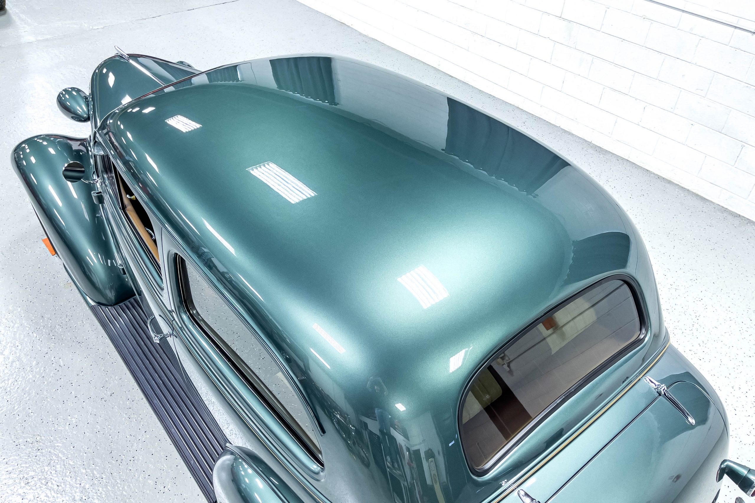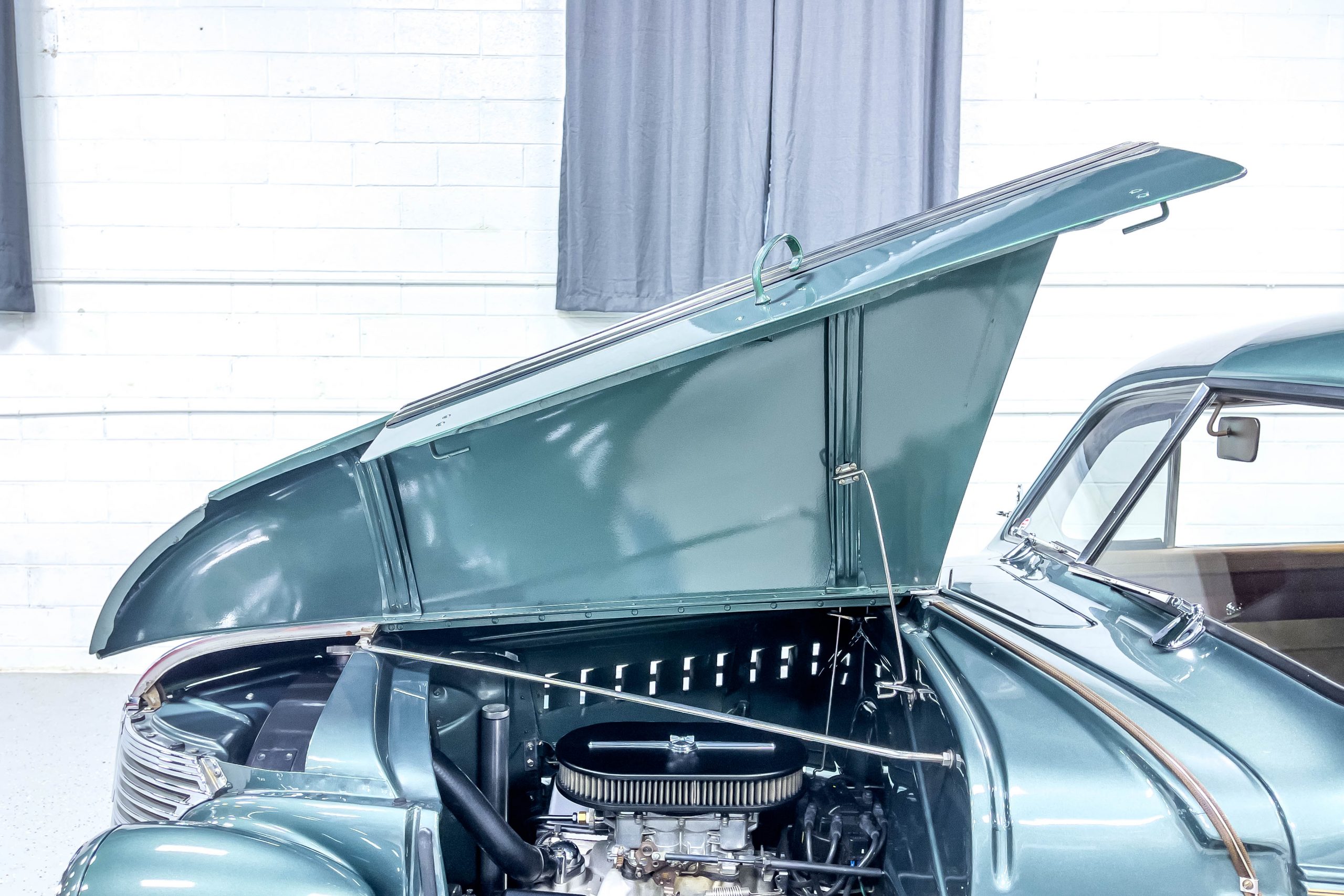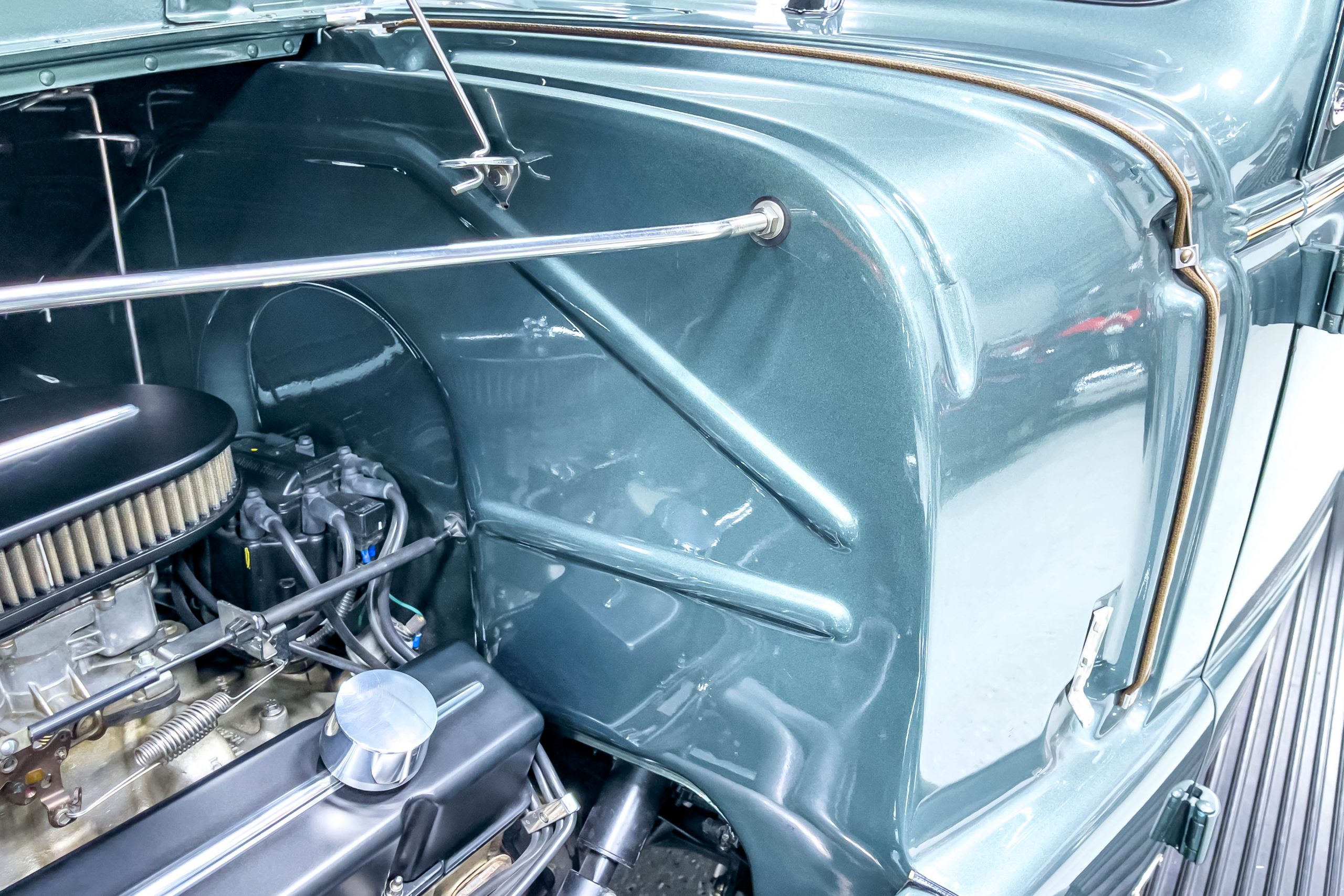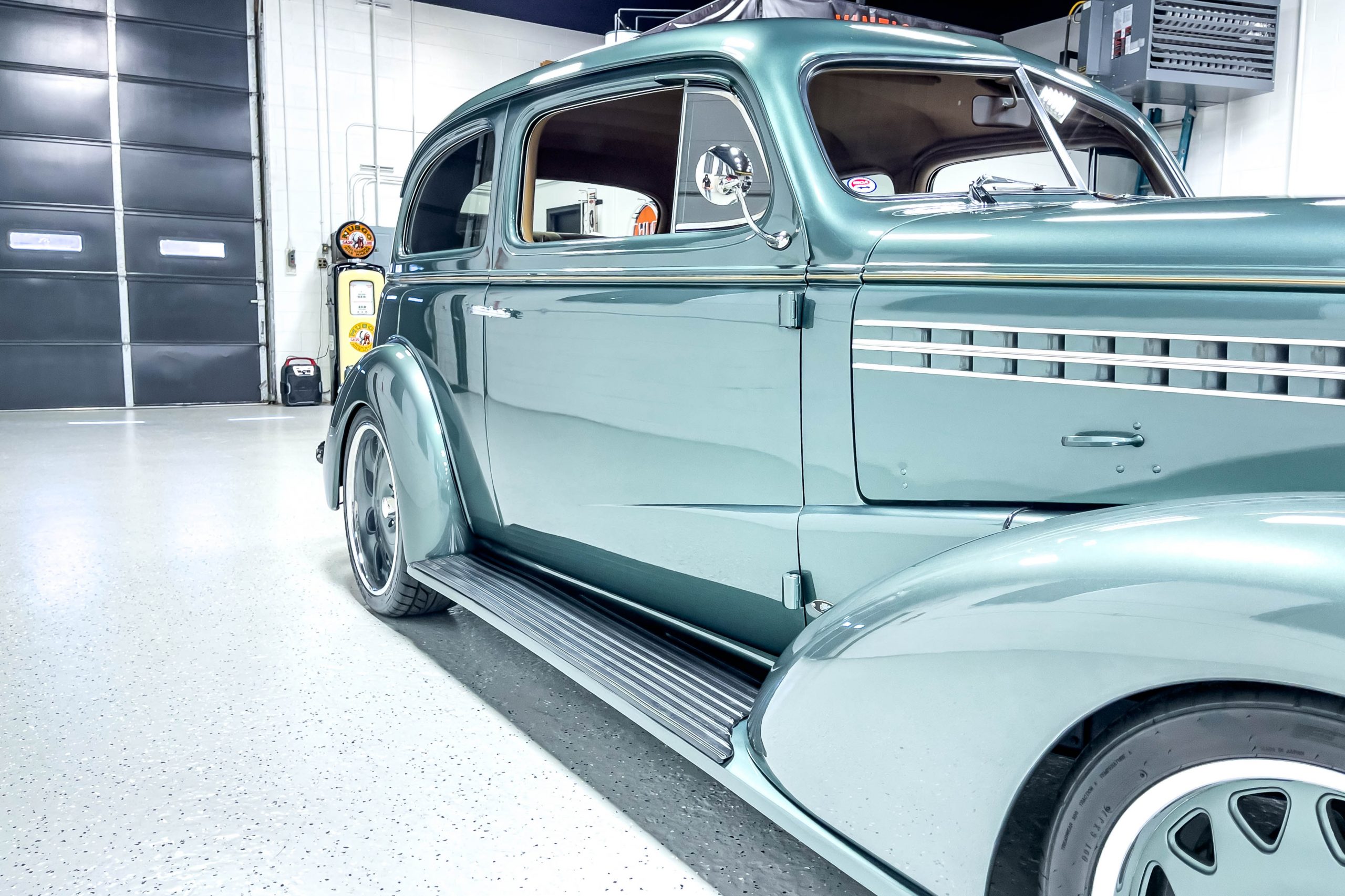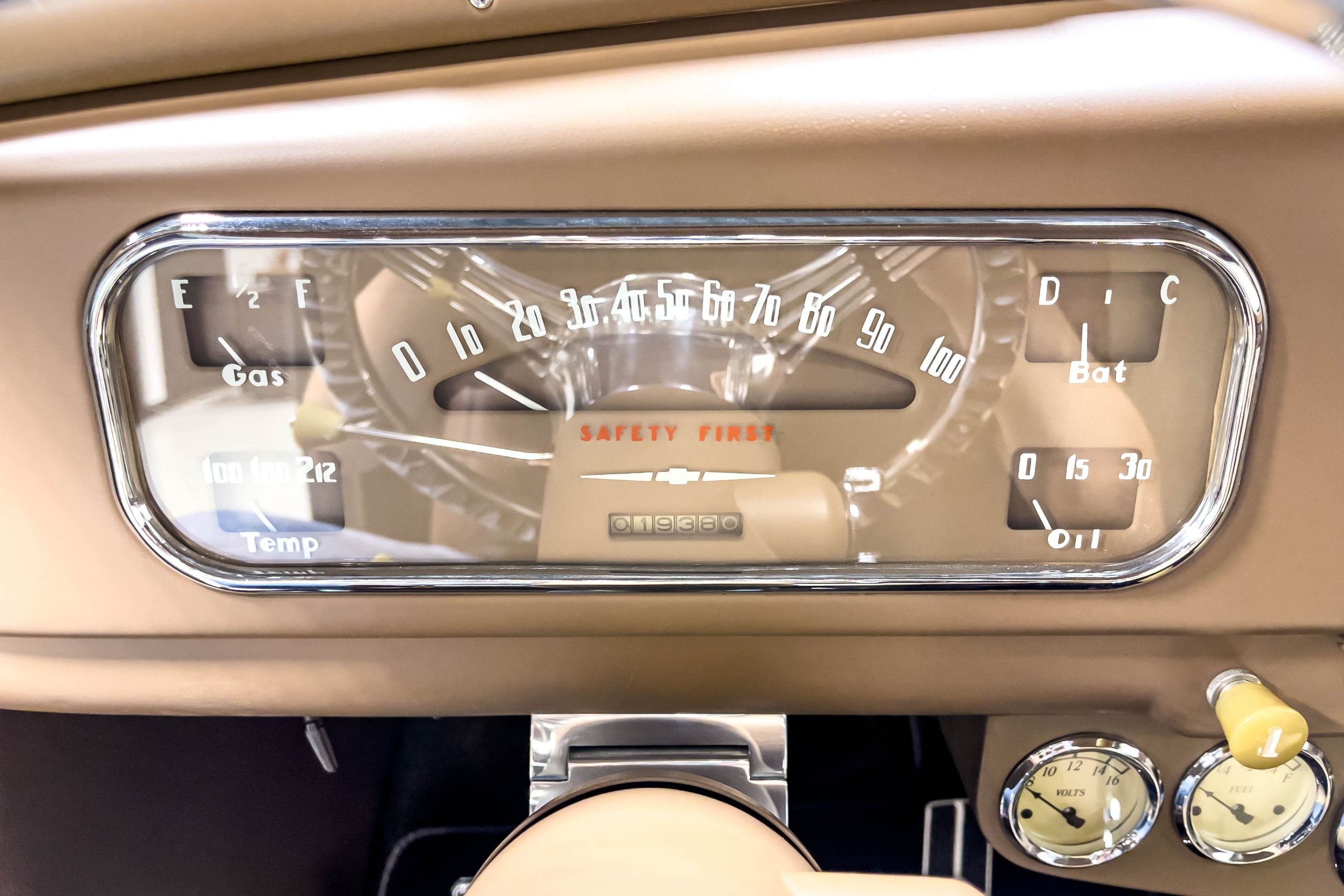 The restoration and hot-rodding process reportedly started in the late 1980s in which it has been preserved and updated as the decades marched on. It is beautifully finished in a custom mix green that was reportedly applied in 1990 by Aman’s in Canton, OH along with a hand applied champaign colored pin stripe and still presents exceptionally well today. The current custom interior appears to have been updated and installed in 2015 as it has a lovely modern presentation in a two-tone tan and chocolate brown color scheme with leather and suede seat material with no visible wear to speak of. The original gauge cluster is not operational and in its place is a beautifully crafted gauge cluster mounted at the bottom of the dash housing VDO gauges for battery voltage, fuel, speedometer, odometer, trip odometer, water temperature, and oil pressure. It also features an Ididit steering column and a chromed Hurst shifter. The current mileage shown is 1,123 miles which is reportedly the mileage accumulated since installation of the new gauges in 2015. We have driven approximately 250 miles in our 3 years of ownership.