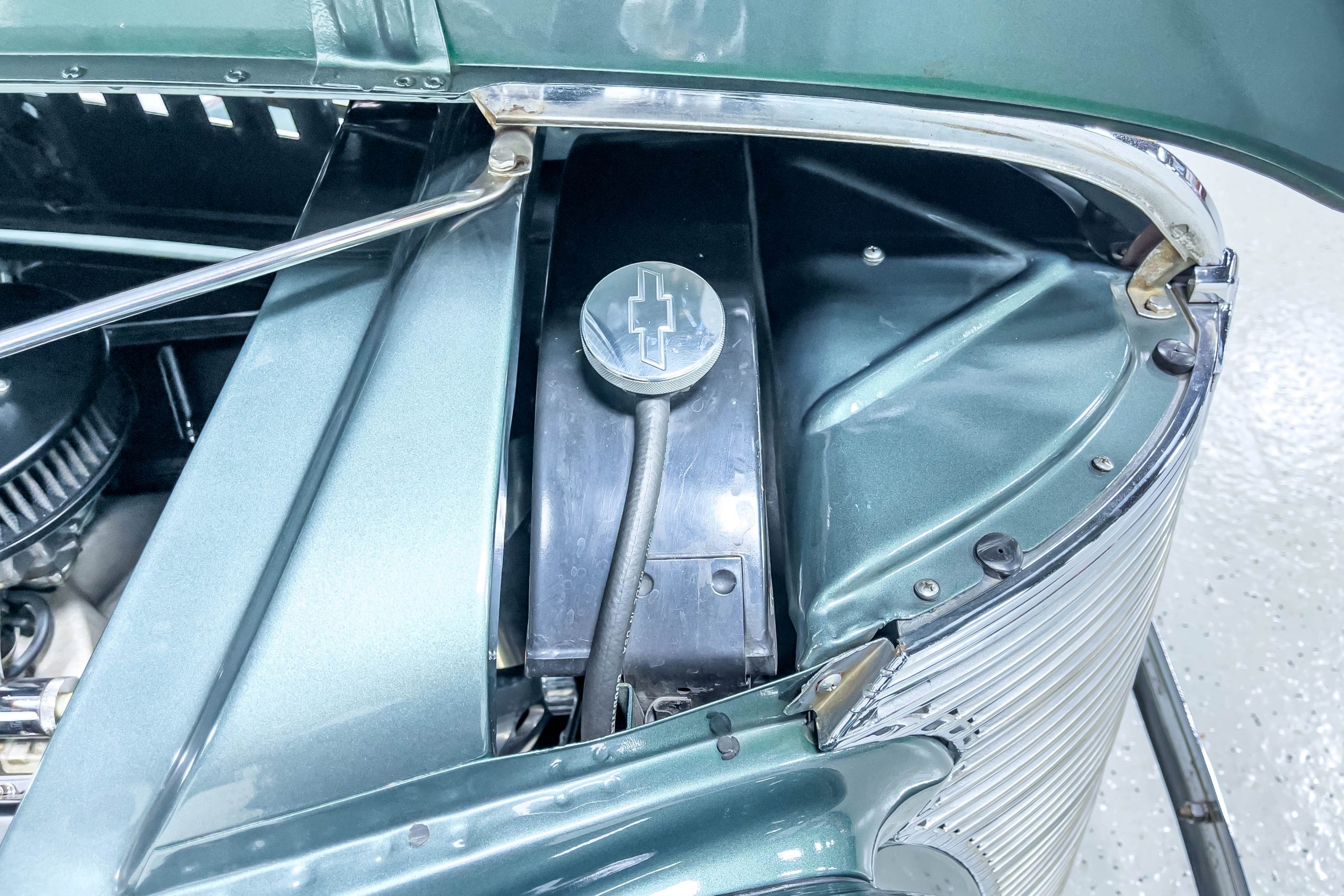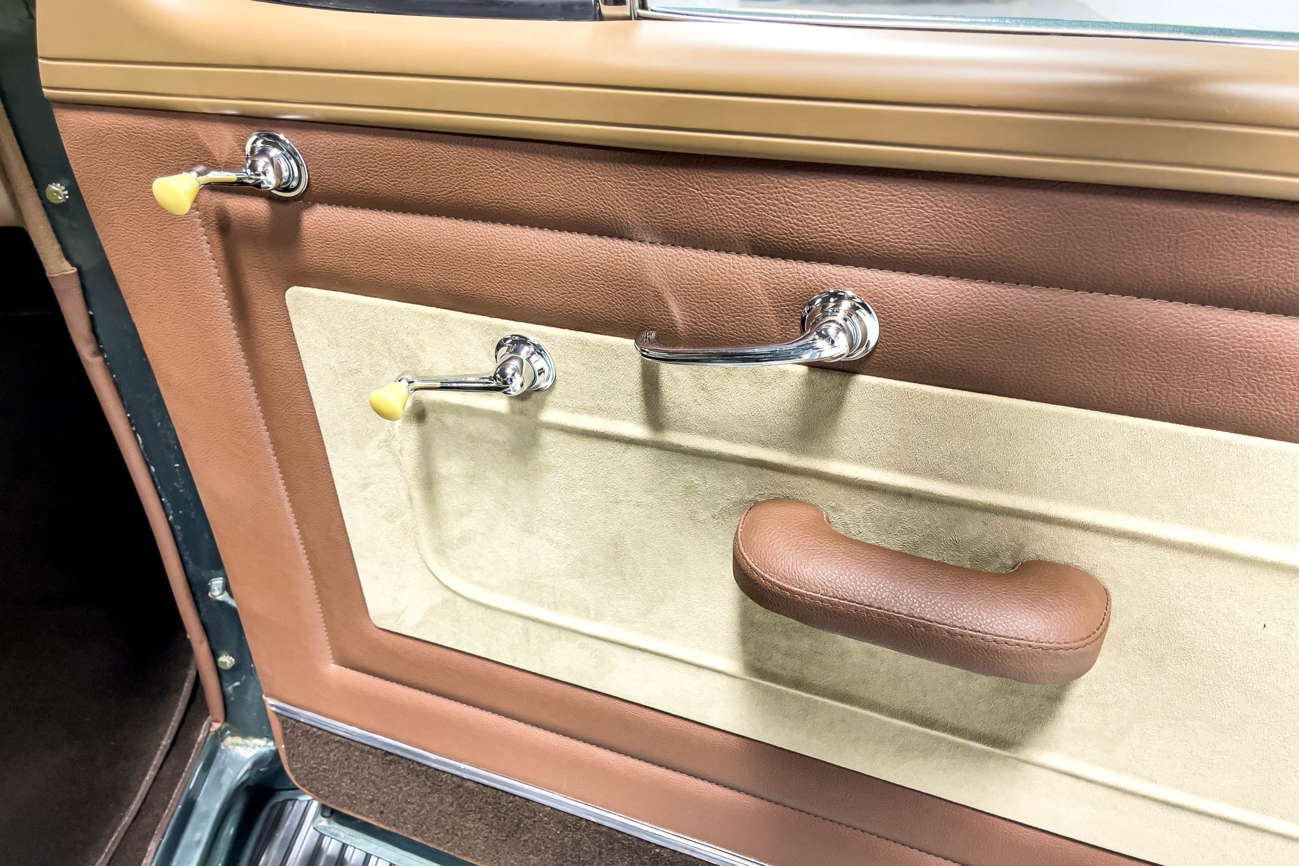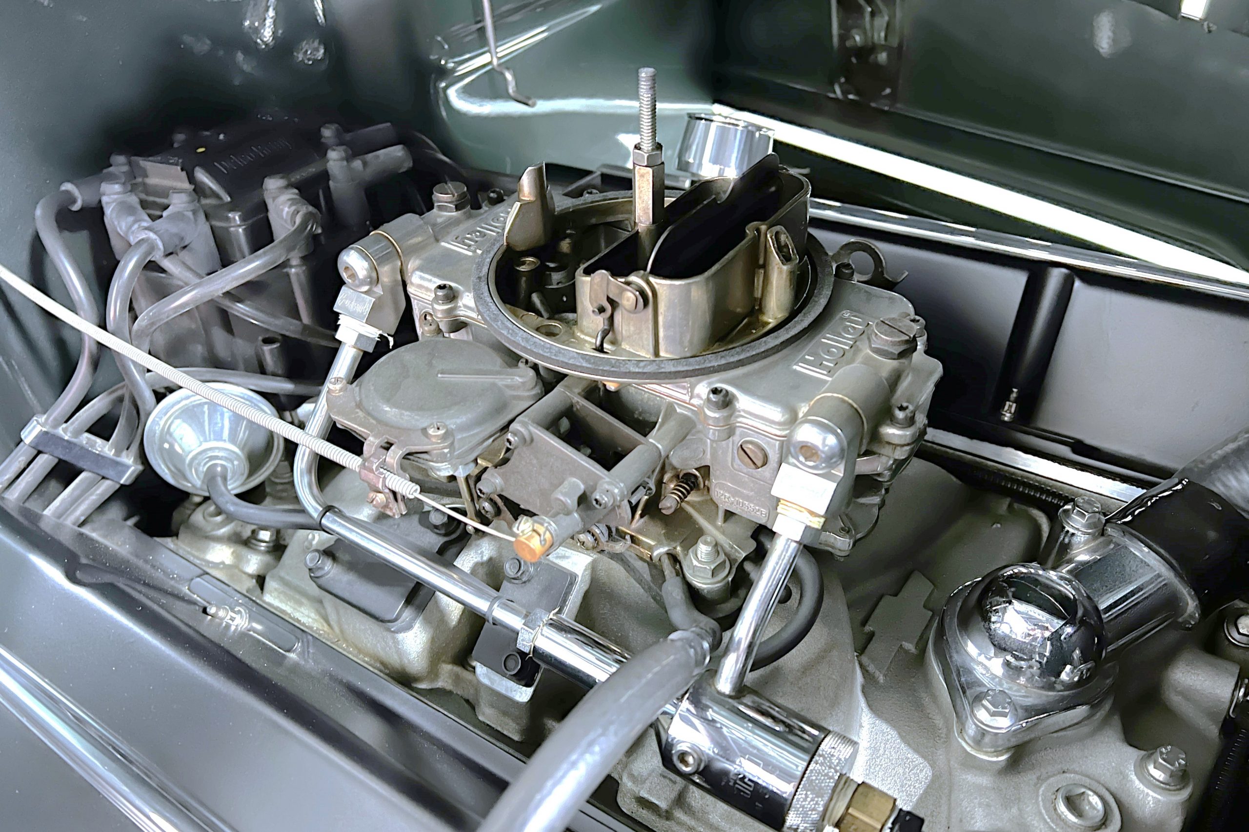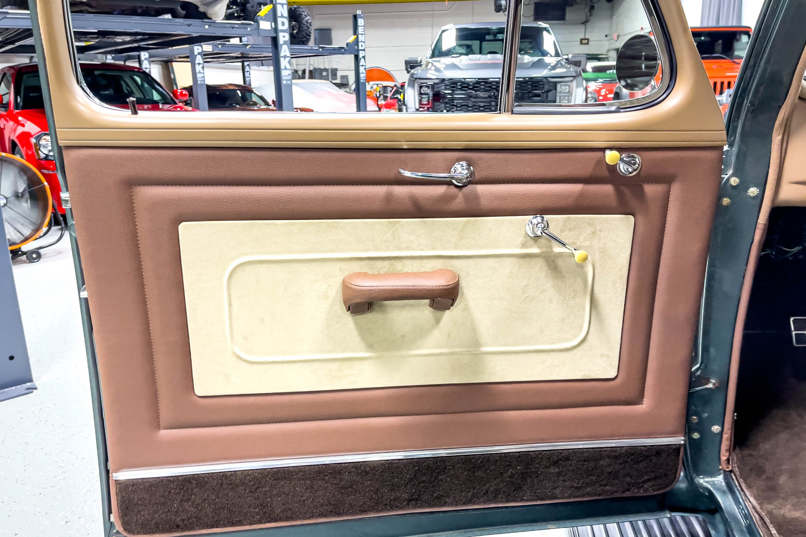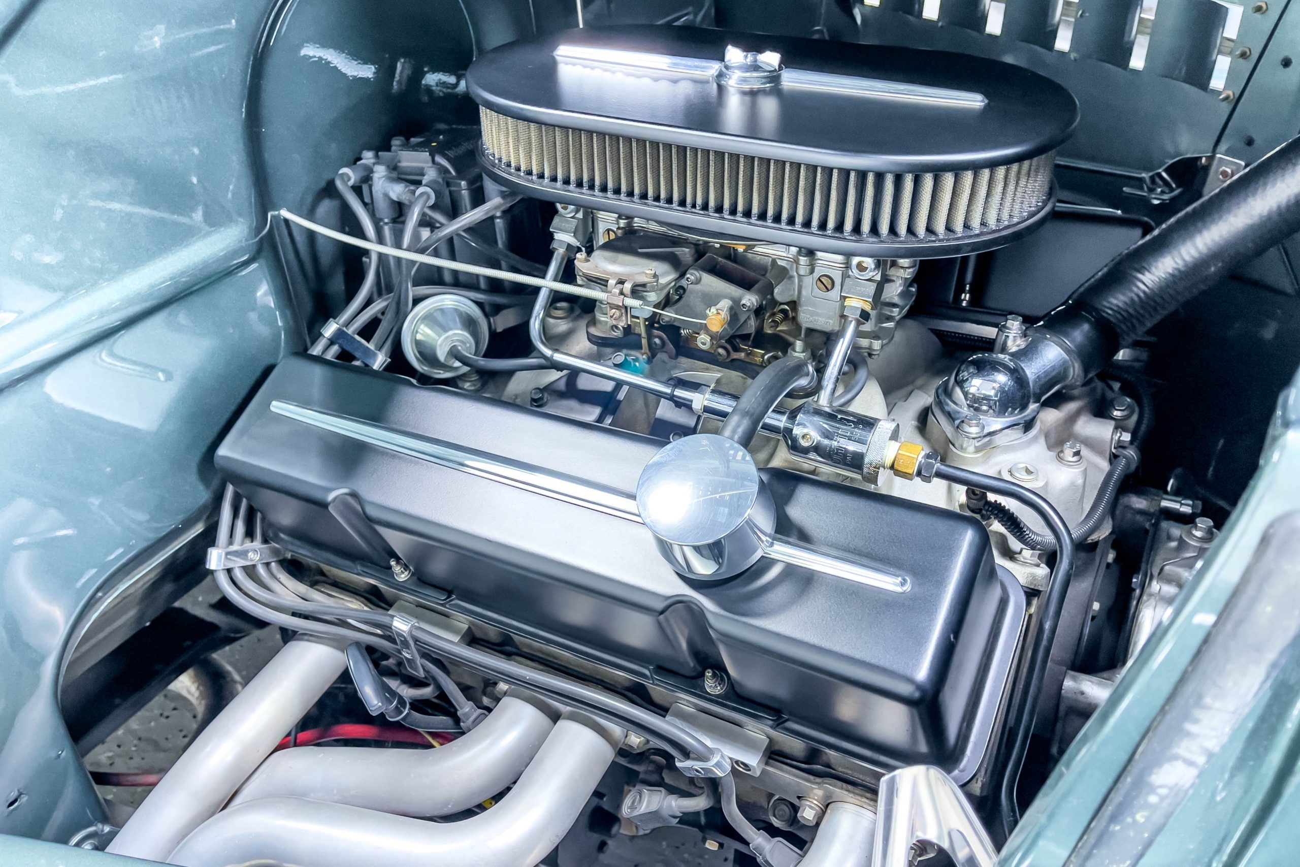 The restoration and hot-rodding process reportedly started in the late 1980s in which it has been preserved and updated as the decades marched on. It is beautifully finished in a custom mix green that was reportedly applied in 1990 by Aman’s in Canton, OH along with a hand applied champaign colored pin stripe and still presents exceptionally well today. The current custom interior appears to have been updated and installed in 2015 as it has a lovely modern presentation in a two-tone tan and chocolate brown color scheme with leather and suede seat material with no visible wear to speak of. The original gauge cluster is not operational and in its place is a beautifully crafted gauge cluster mounted at the bottom of the dash housing VDO gauges for battery voltage, fuel, speedometer, odometer, trip odometer, water temperature, and oil pressure. It also features an Ididit steering column and a chromed Hurst shifter. The current mileage shown is 1,123 miles which is reportedly the mileage accumulated since installation of the new gauges in 2015. We have driven approximately 250 miles in our 3 years of ownership.