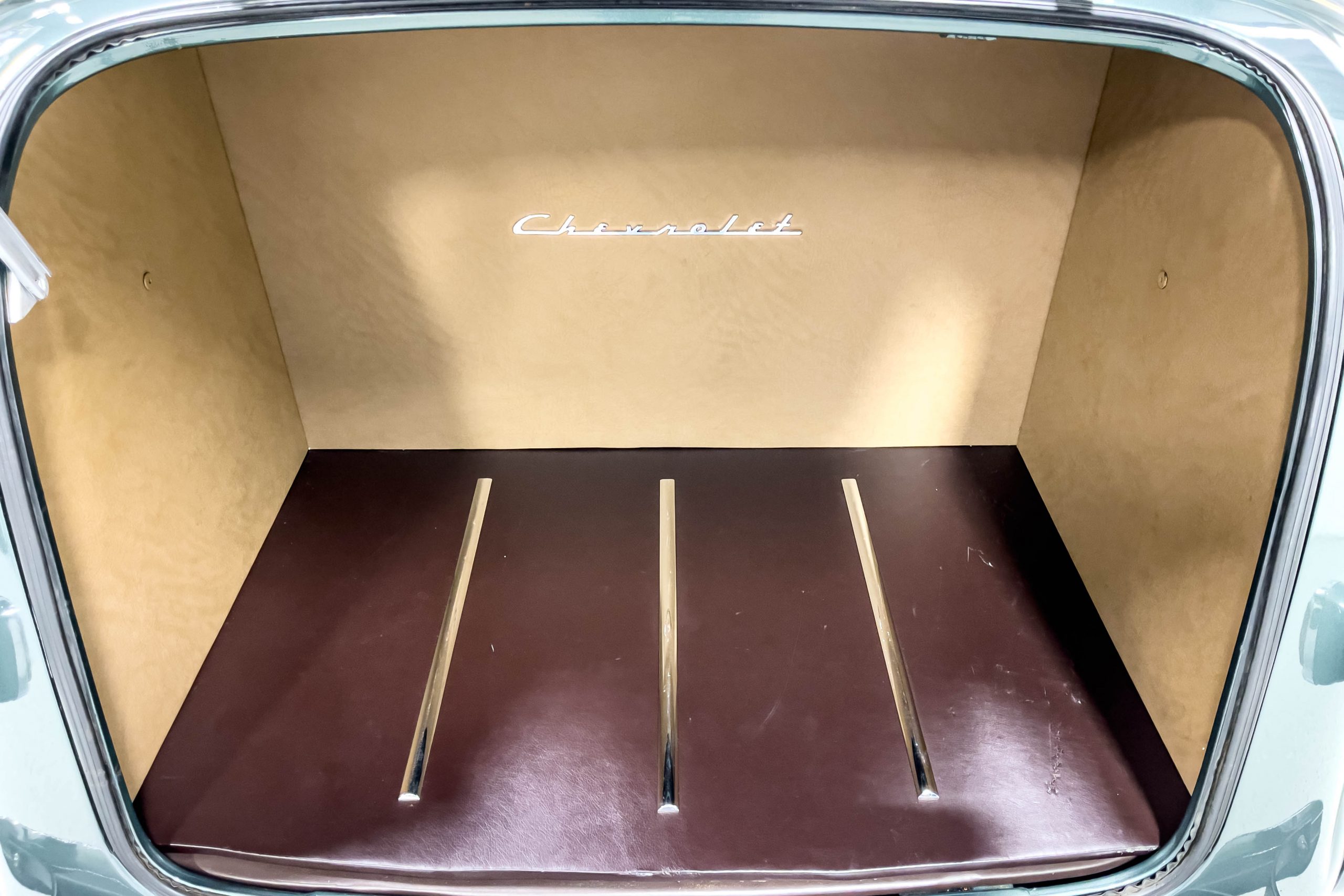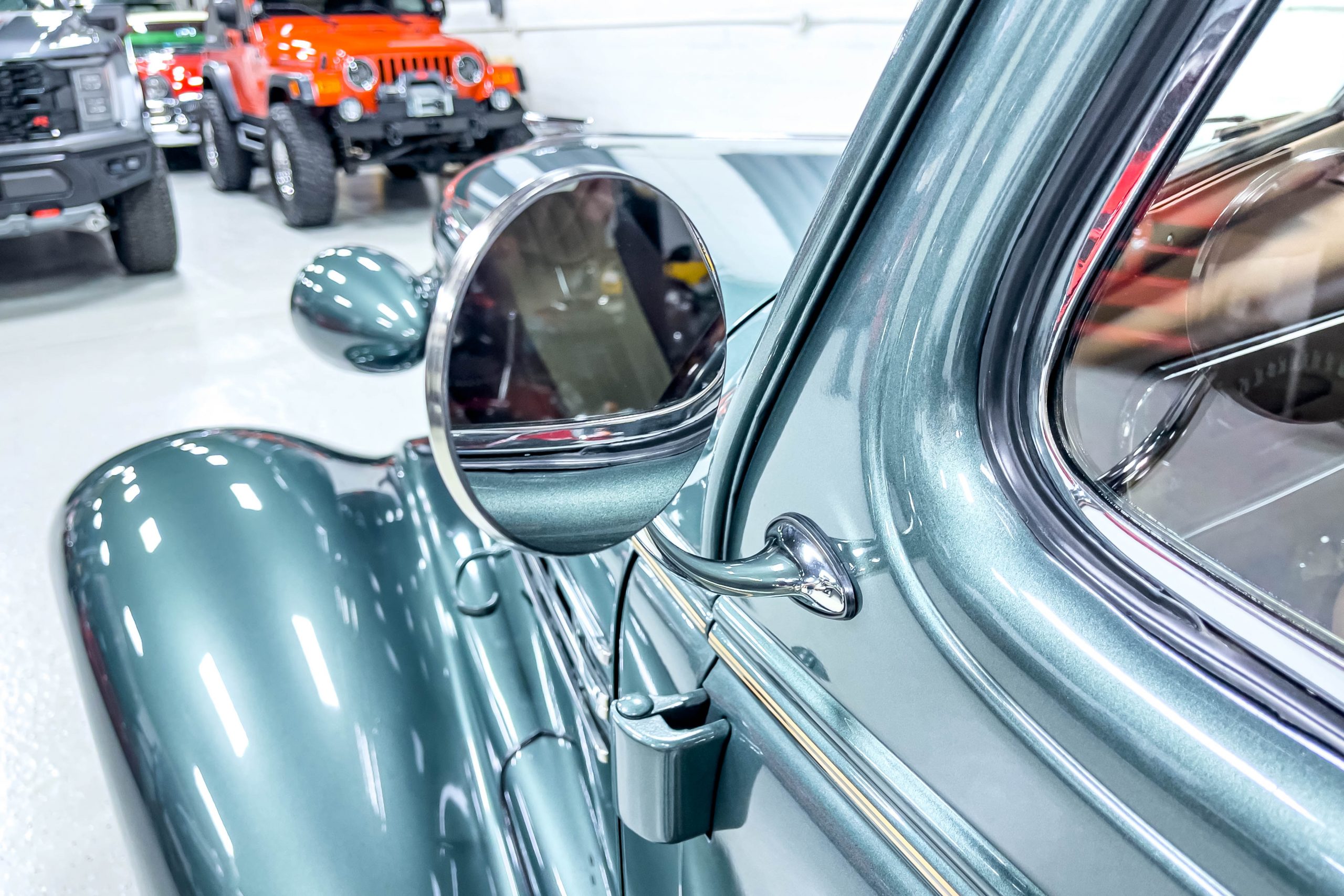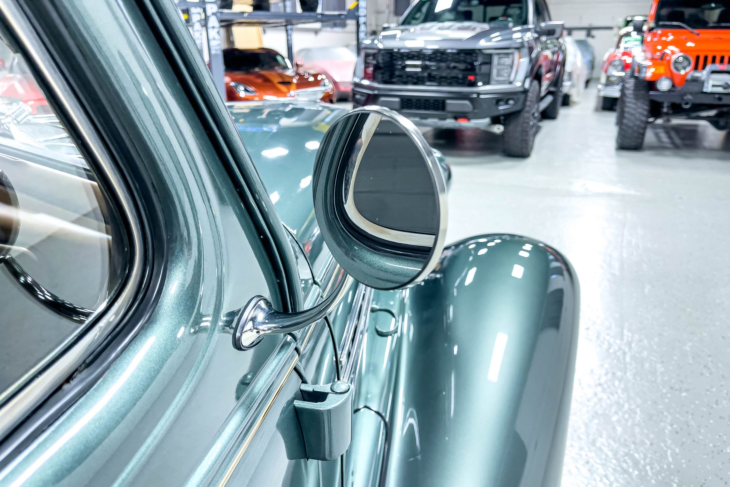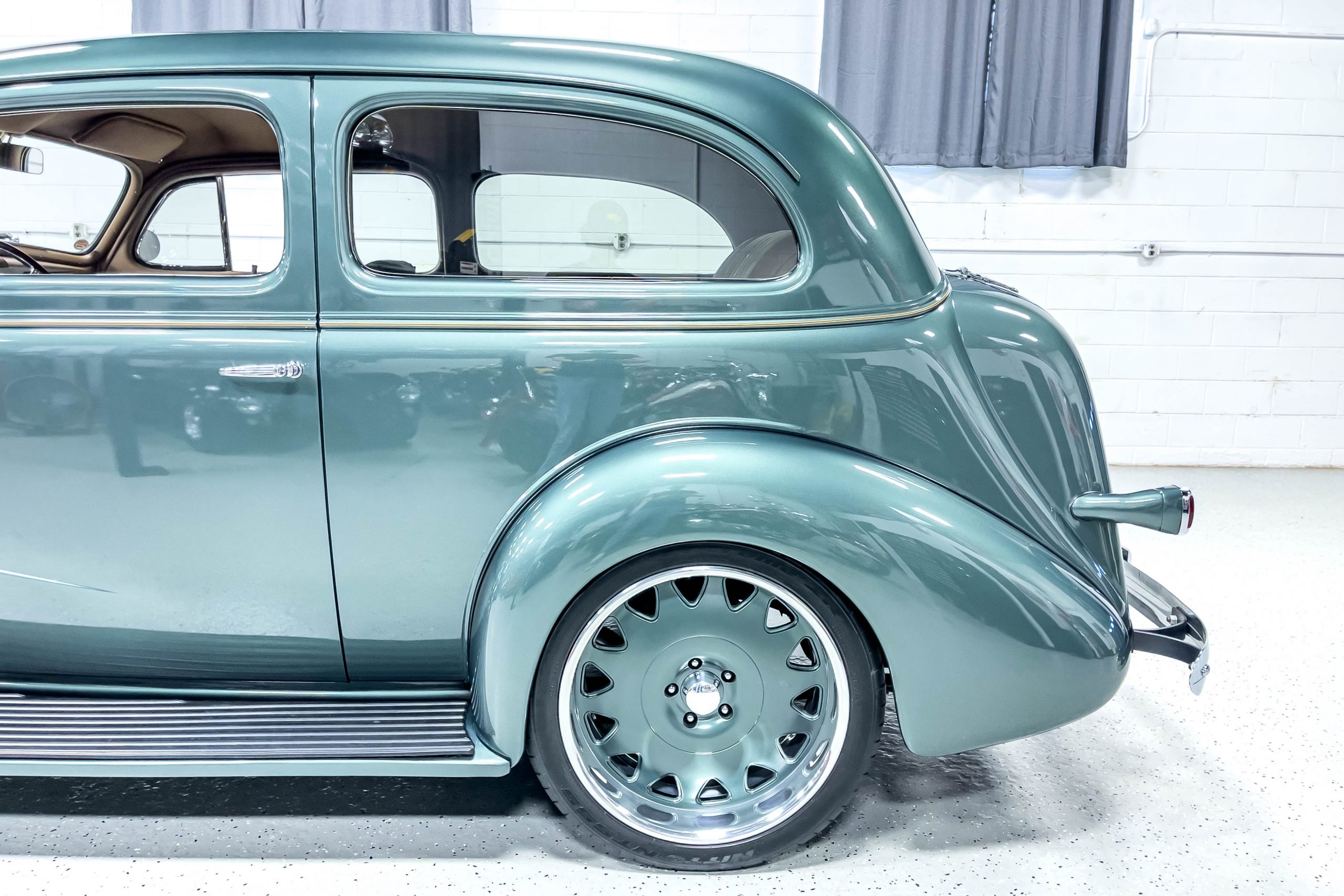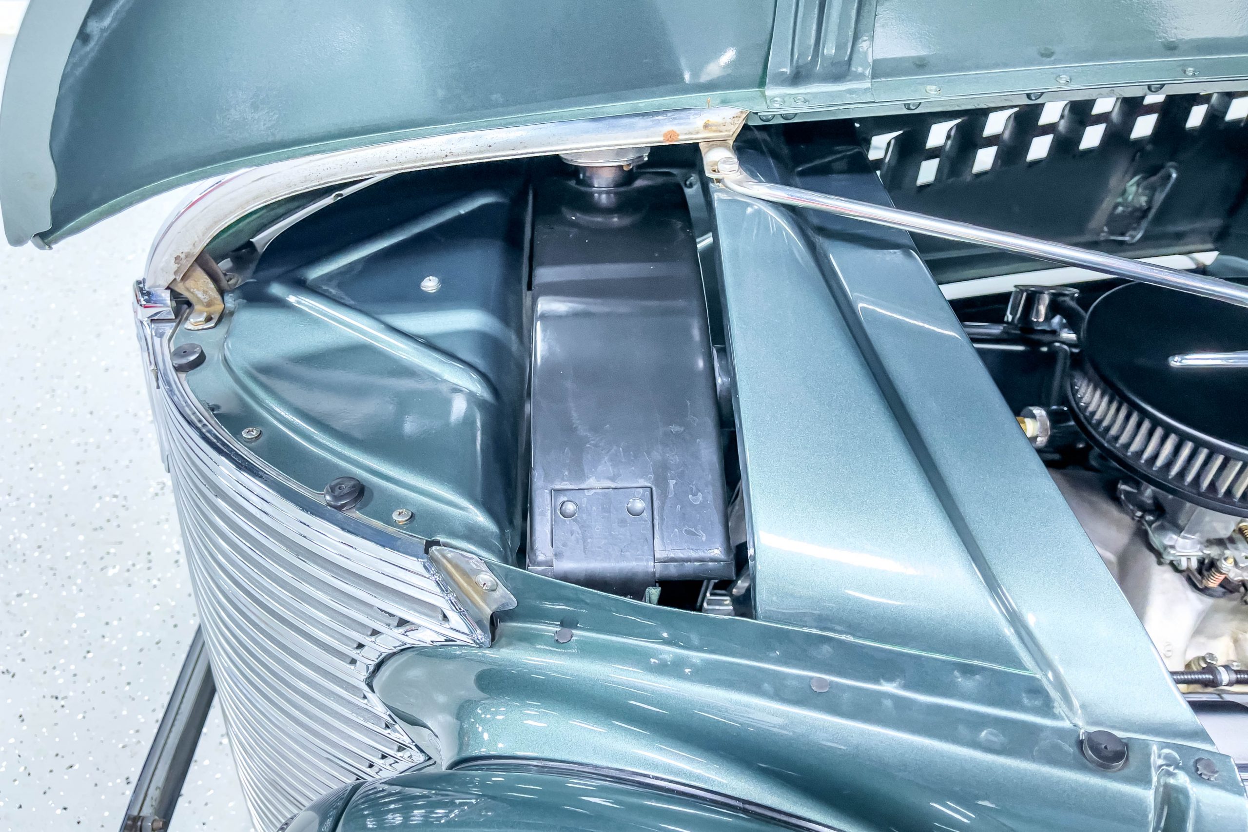 The restoration and hot-rodding process reportedly started in the late 1980s in which it has been preserved and updated as the decades marched on. It is beautifully finished in a custom mix green that was reportedly applied in 1990 by Aman’s in Canton, OH along with a hand applied champaign colored pin stripe and still presents exceptionally well today. The current custom interior appears to have been updated and installed in 2015 as it has a lovely modern presentation in a two-tone tan and chocolate brown color scheme with leather and suede seat material with no visible wear to speak of. The original gauge cluster is not operational and in its place is a beautifully crafted gauge cluster mounted at the bottom of the dash housing VDO gauges for battery voltage, fuel, speedometer, odometer, trip odometer, water temperature, and oil pressure. It also features an Ididit steering column and a chromed Hurst shifter. The current mileage shown is 1,123 miles which is reportedly the mileage accumulated since installation of the new gauges in 2015. We have driven approximately 250 miles in our 3 years of ownership.