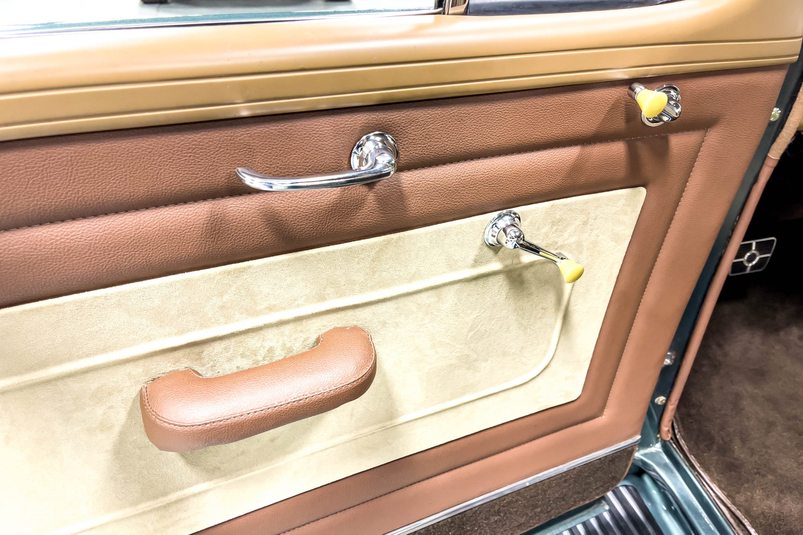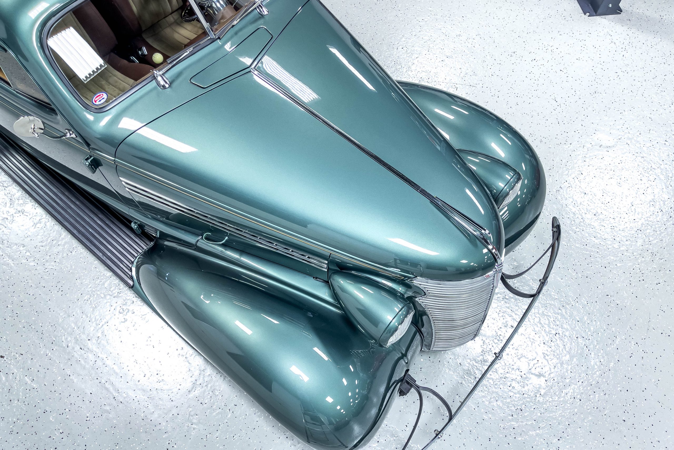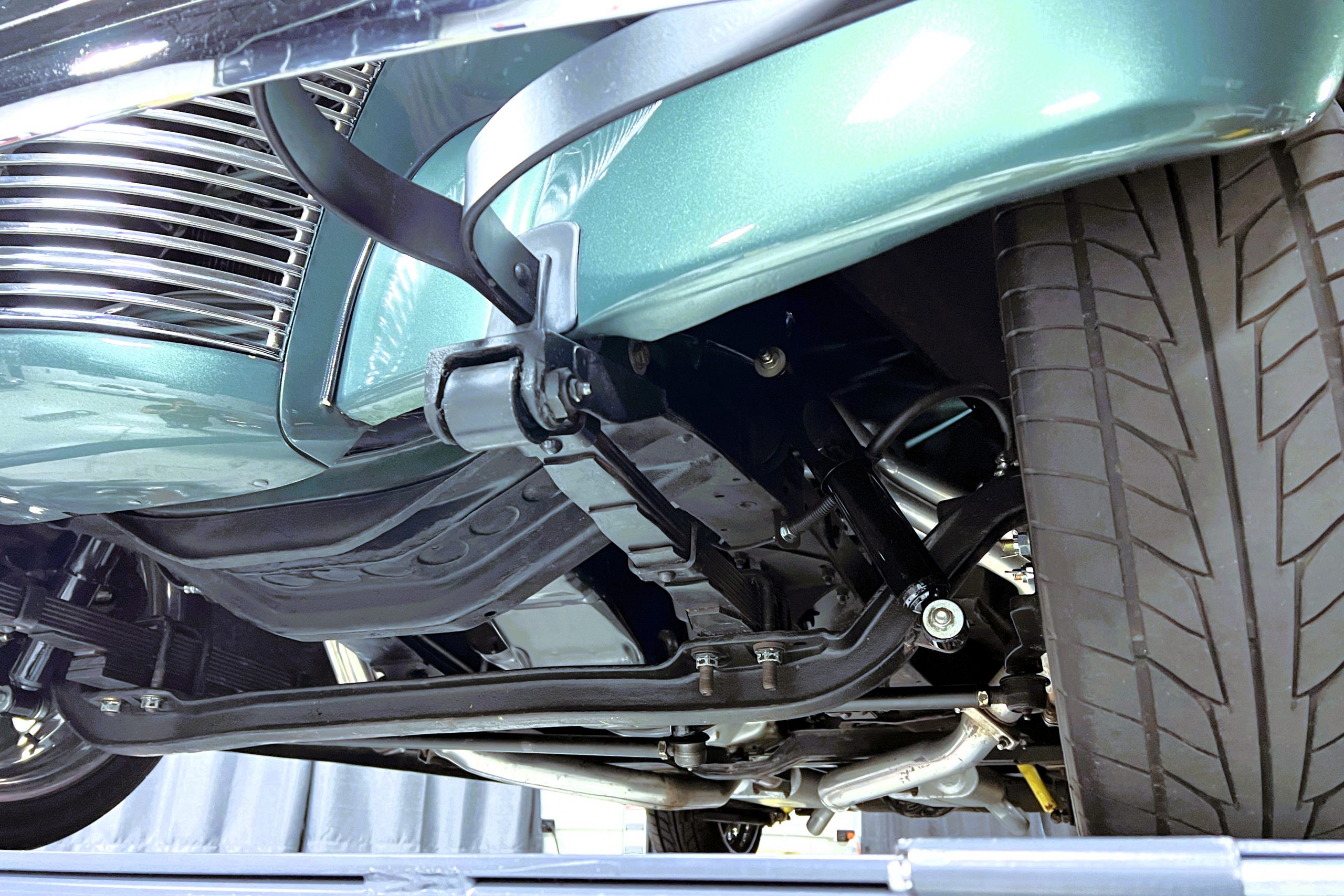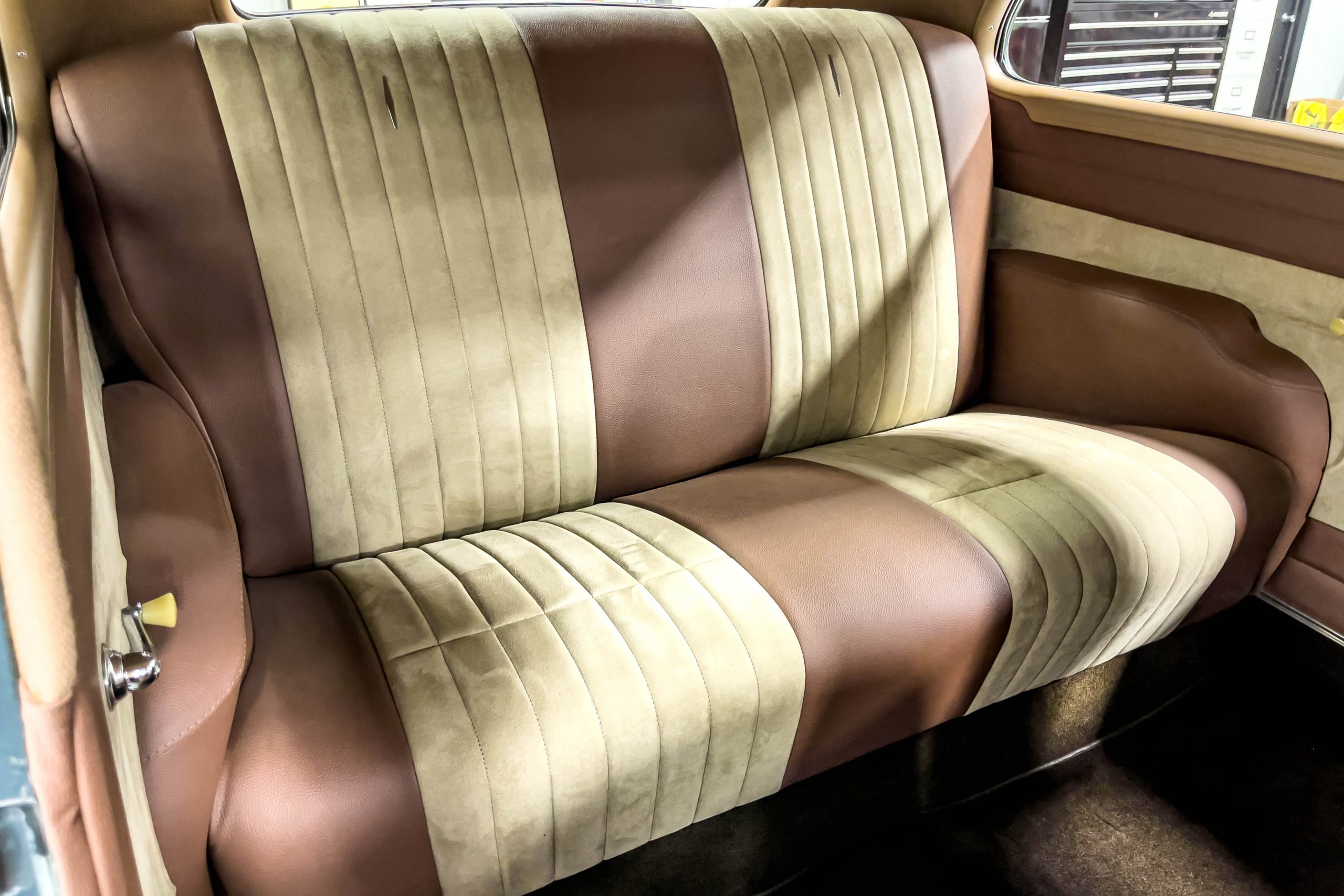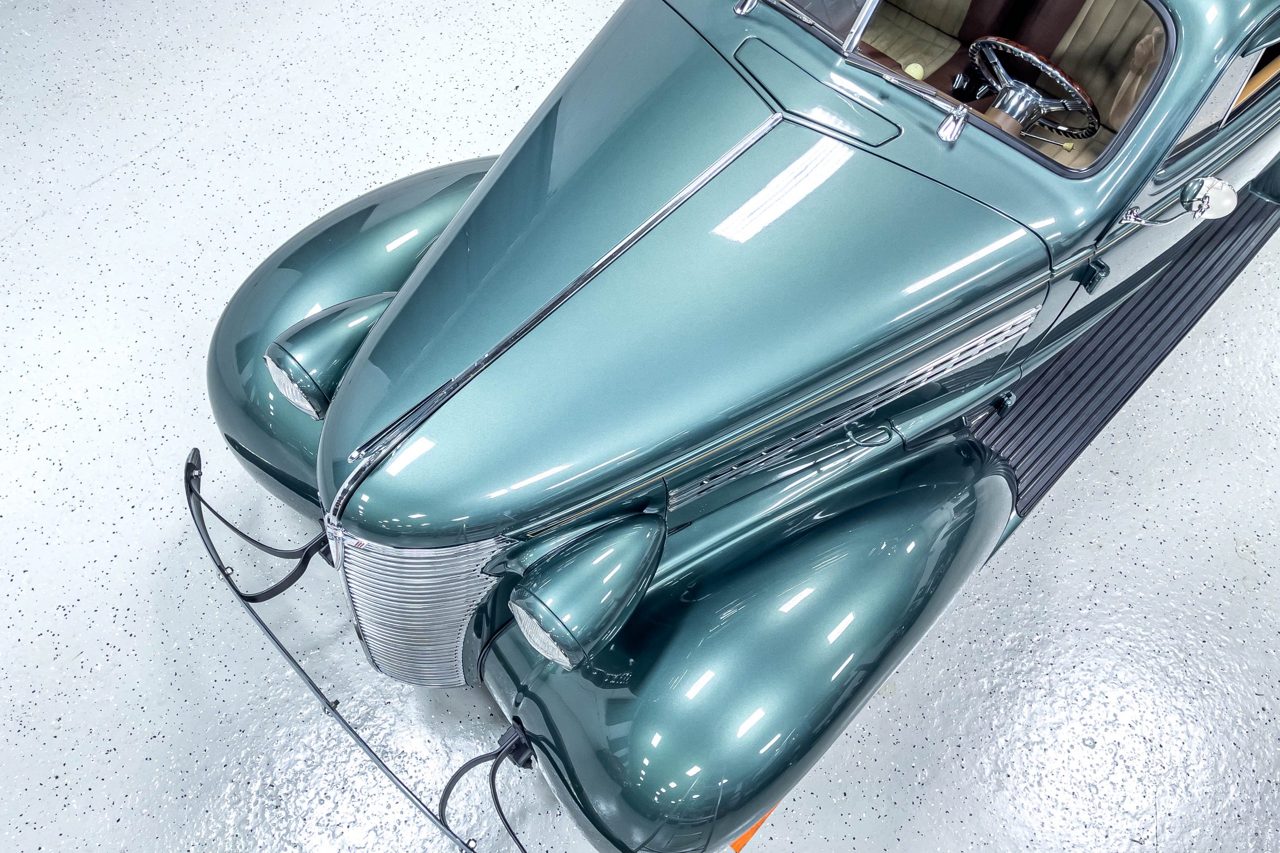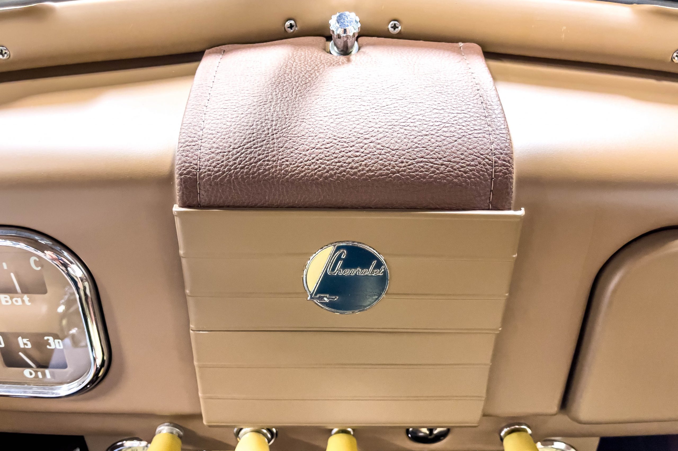 The restoration and hot-rodding process reportedly started in the late 1980s in which it has been preserved and updated as the decades marched on. It is beautifully finished in a custom mix green that was reportedly applied in 1990 by Aman’s in Canton, OH along with a hand applied champaign colored pin stripe and still presents exceptionally well today. The current custom interior appears to have been updated and installed in 2015 as it has a lovely modern presentation in a two-tone tan and chocolate brown color scheme with leather and suede seat material with no visible wear to speak of. The original gauge cluster is not operational and in its place is a beautifully crafted gauge cluster mounted at the bottom of the dash housing VDO gauges for battery voltage, fuel, speedometer, odometer, trip odometer, water temperature, and oil pressure. It also features an Ididit steering column and a chromed Hurst shifter. The current mileage shown is 1,123 miles which is reportedly the mileage accumulated since installation of the new gauges in 2015. We have driven approximately 250 miles in our 3 years of ownership.