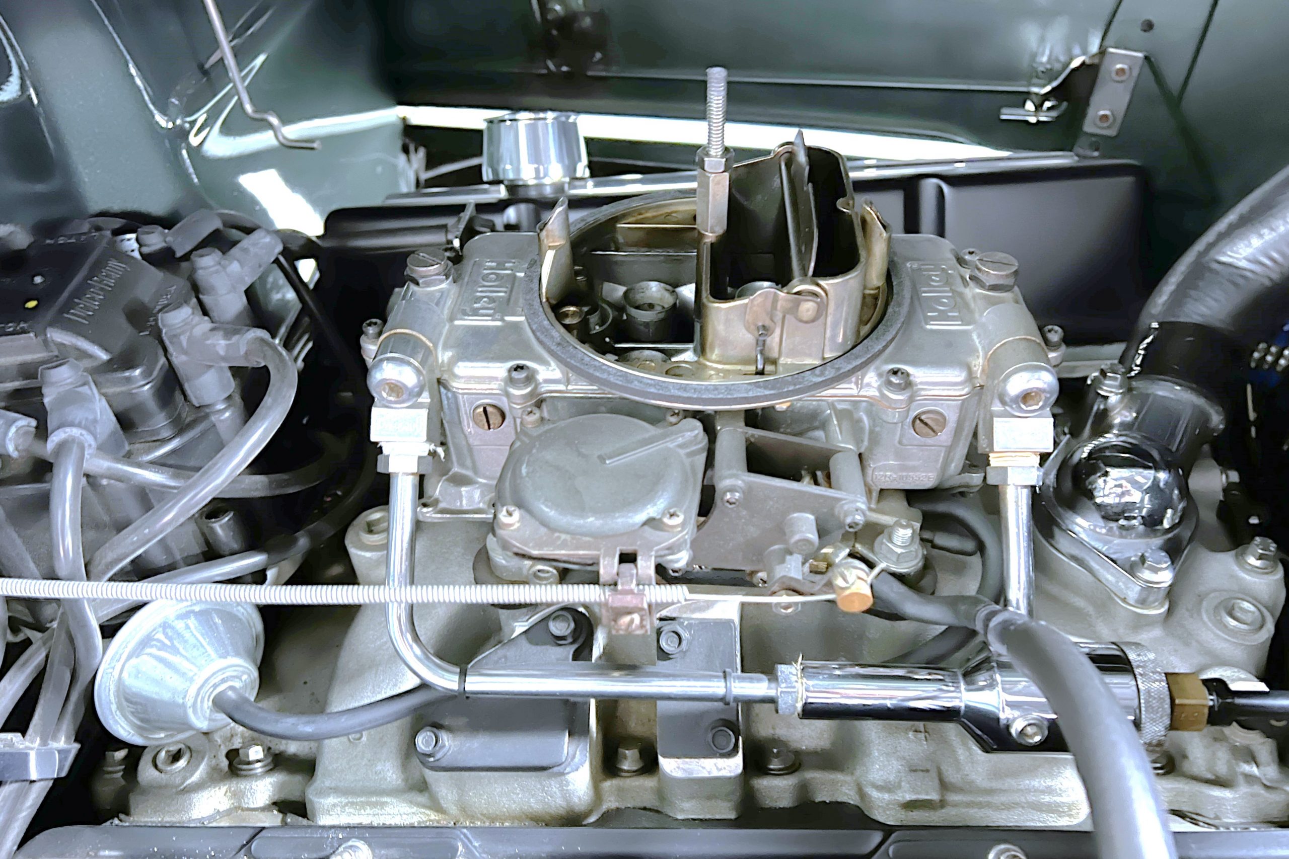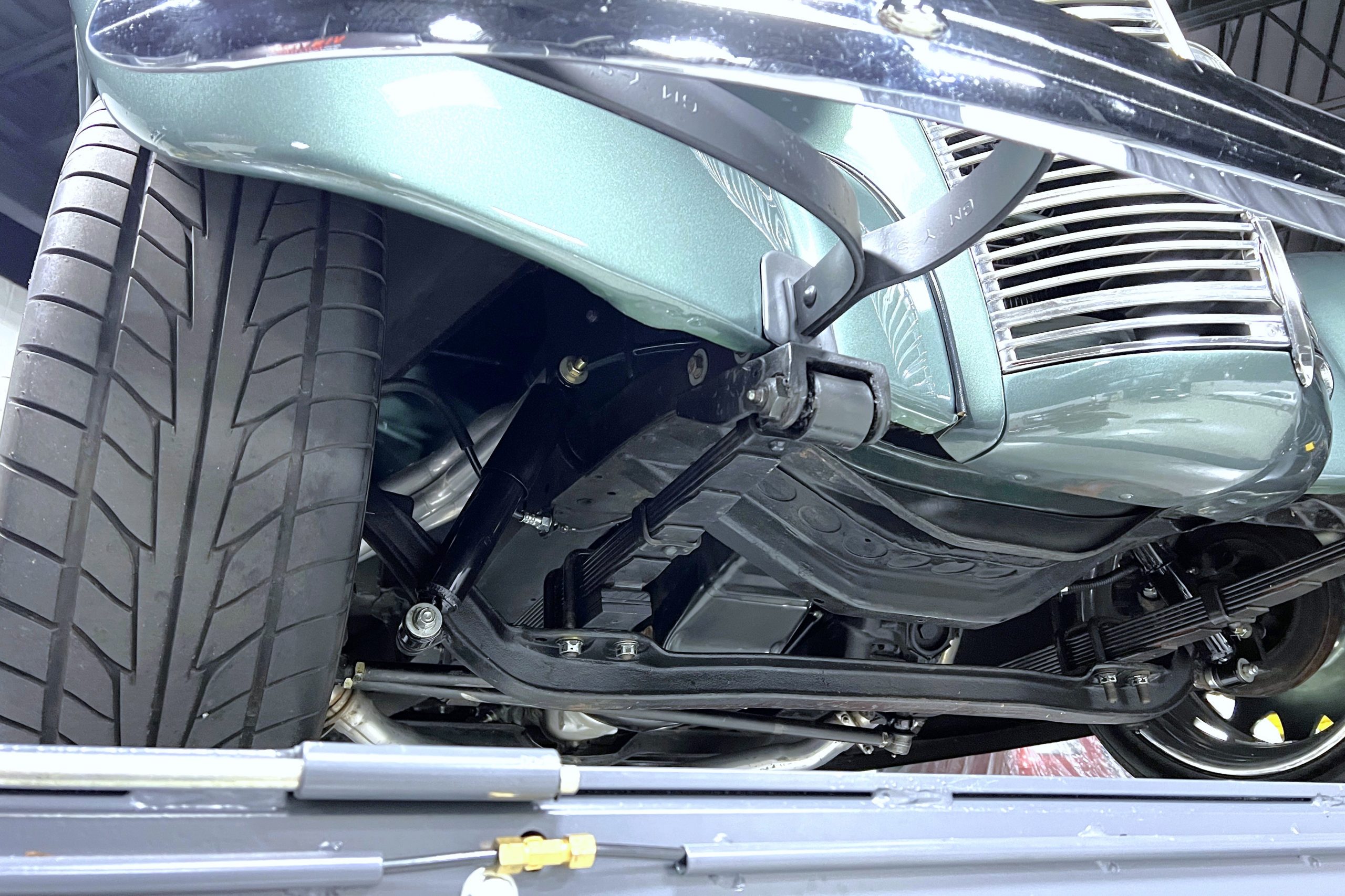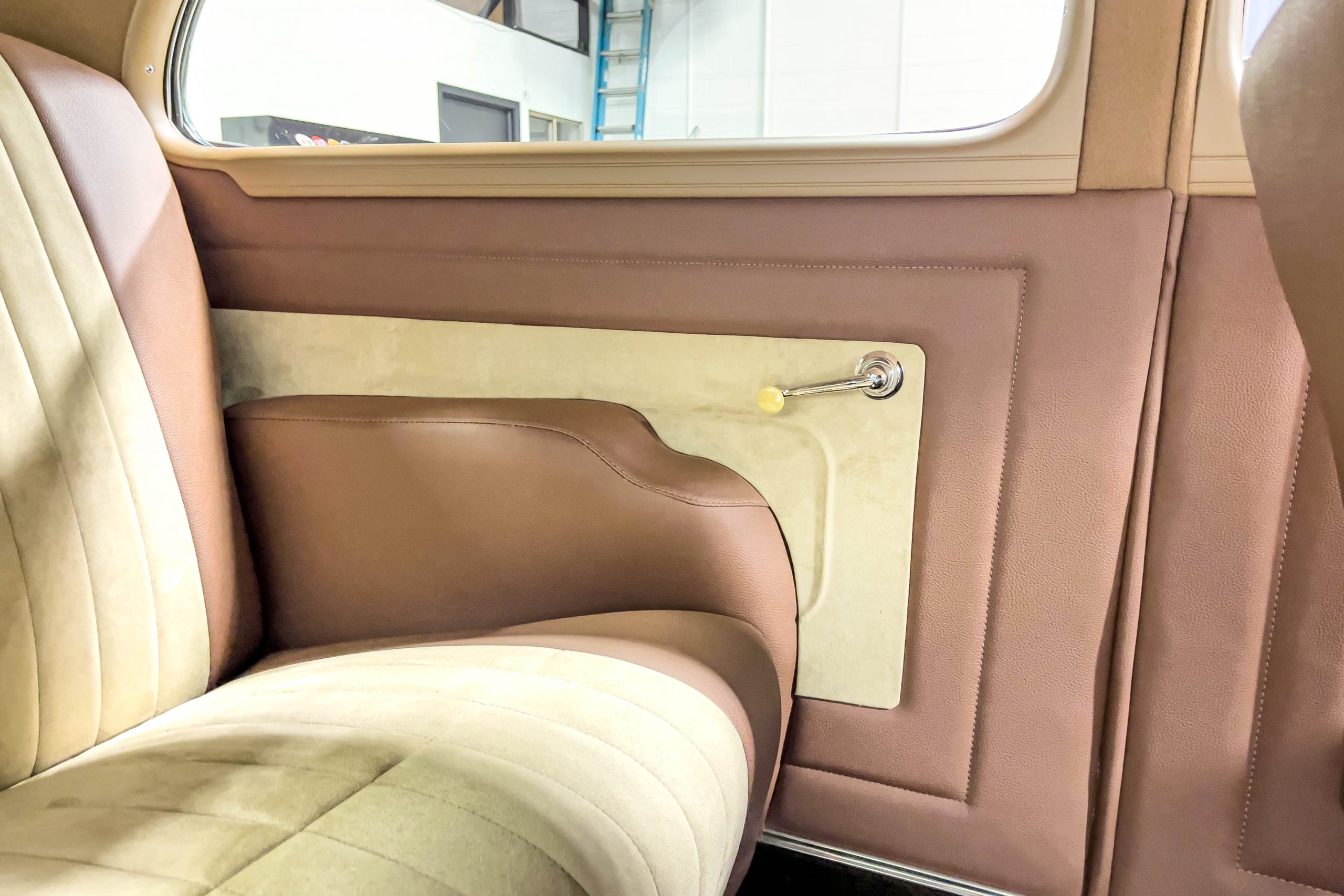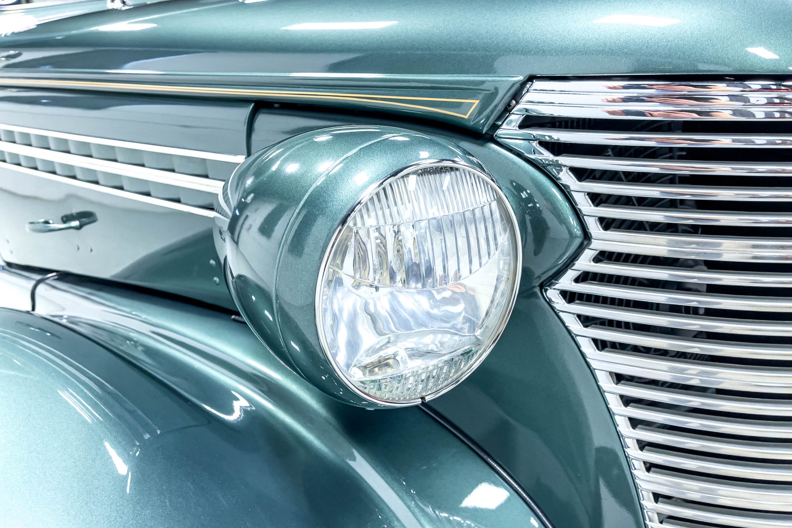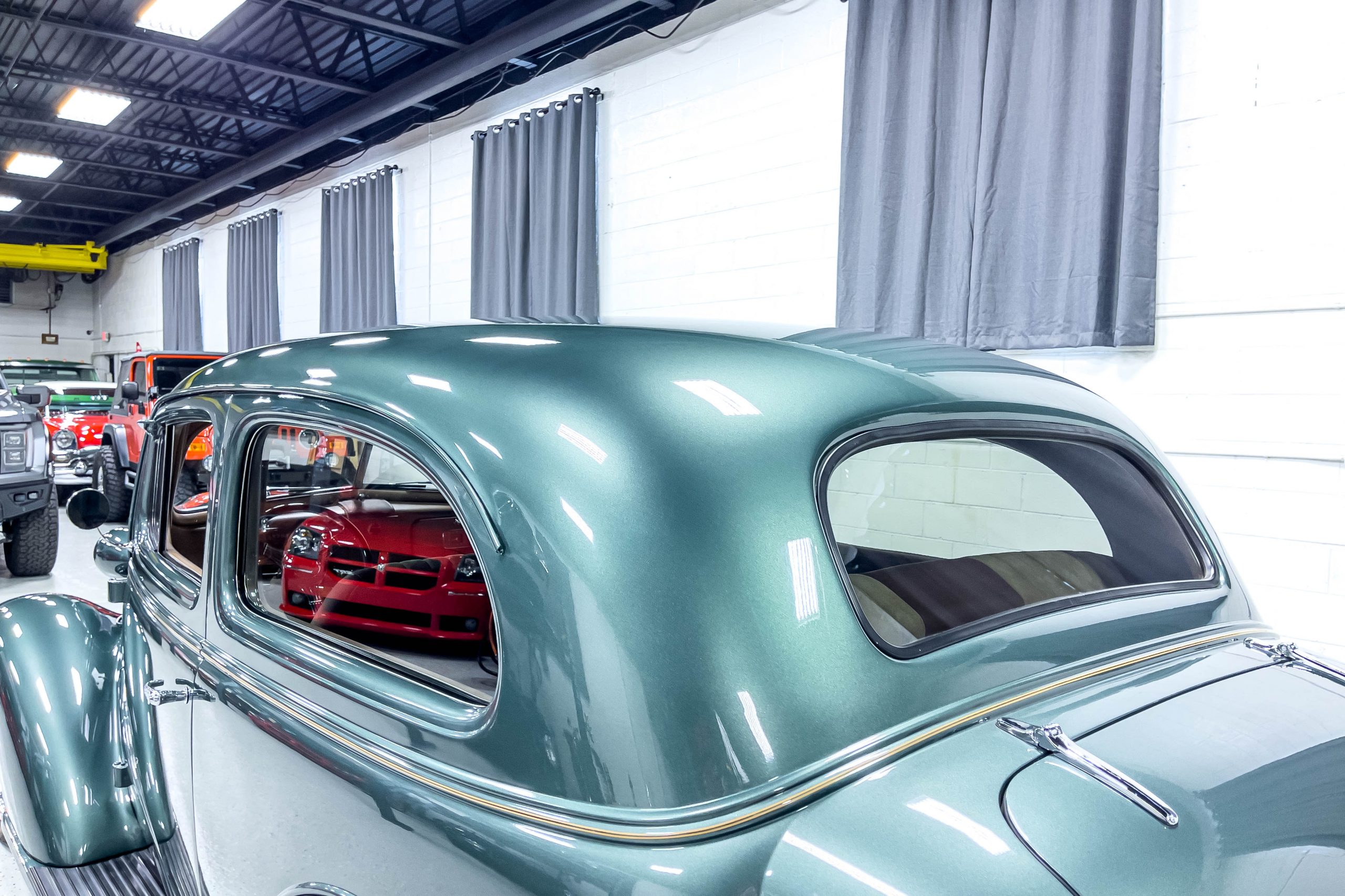 The restoration and hot-rodding process reportedly started in the late 1980s in which it has been preserved and updated as the decades marched on. It is beautifully finished in a custom mix green that was reportedly applied in 1990 by Aman’s in Canton, OH along with a hand applied champaign colored pin stripe and still presents exceptionally well today. The current custom interior appears to have been updated and installed in 2015 as it has a lovely modern presentation in a two-tone tan and chocolate brown color scheme with leather and suede seat material with no visible wear to speak of. The original gauge cluster is not operational and in its place is a beautifully crafted gauge cluster mounted at the bottom of the dash housing VDO gauges for battery voltage, fuel, speedometer, odometer, trip odometer, water temperature, and oil pressure. It also features an Ididit steering column and a chromed Hurst shifter. The current mileage shown is 1,123 miles which is reportedly the mileage accumulated since installation of the new gauges in 2015. We have driven approximately 250 miles in our 3 years of ownership.