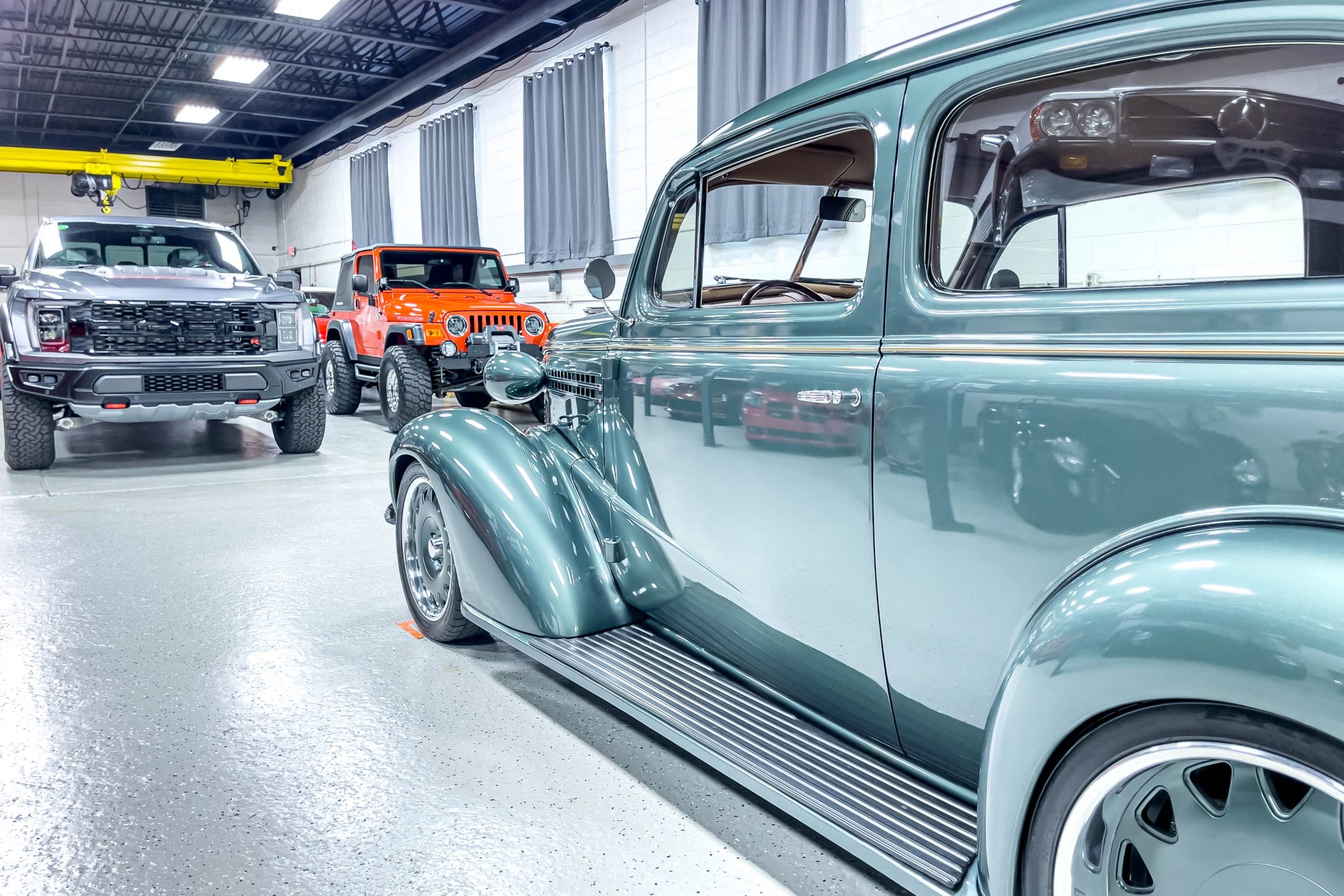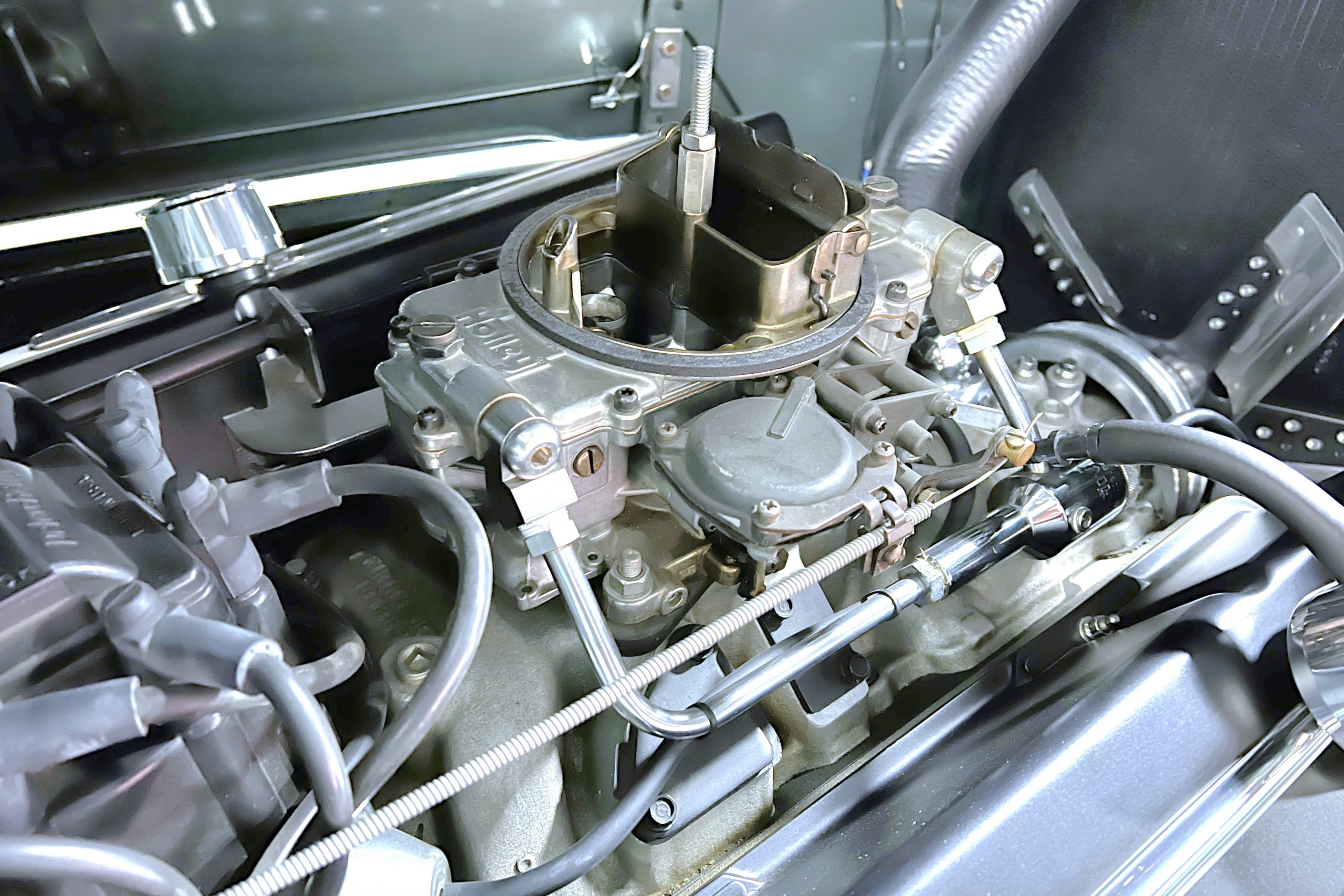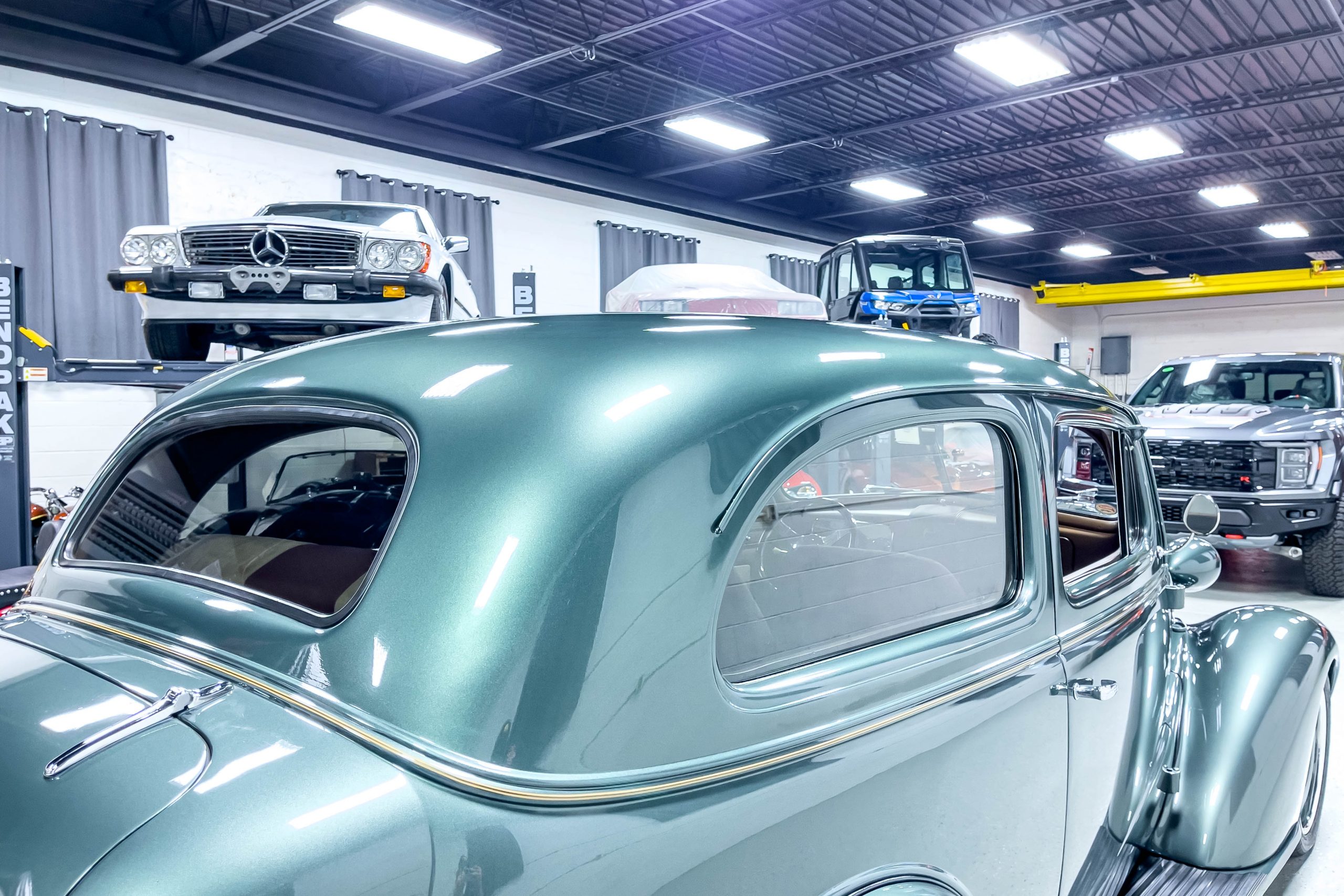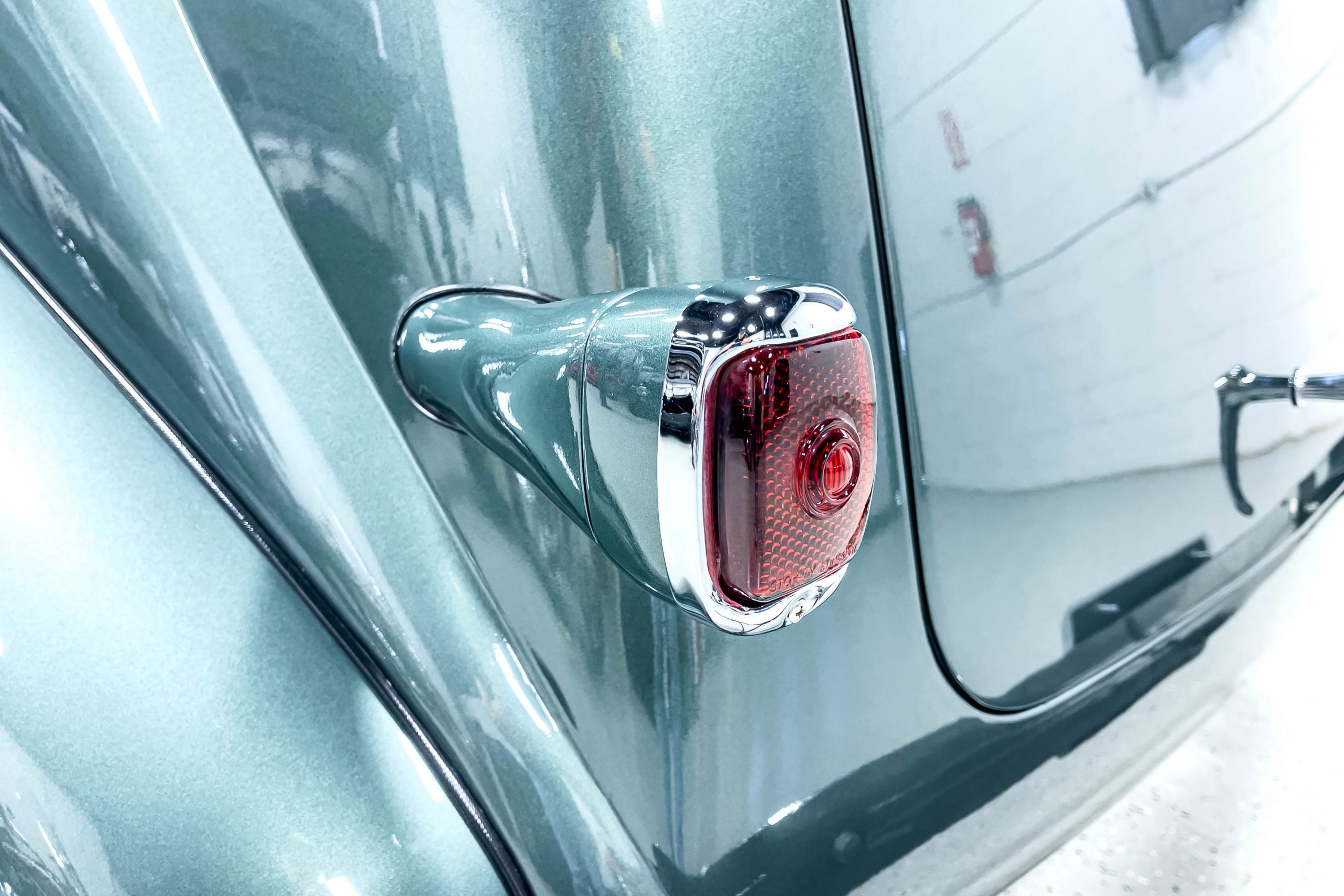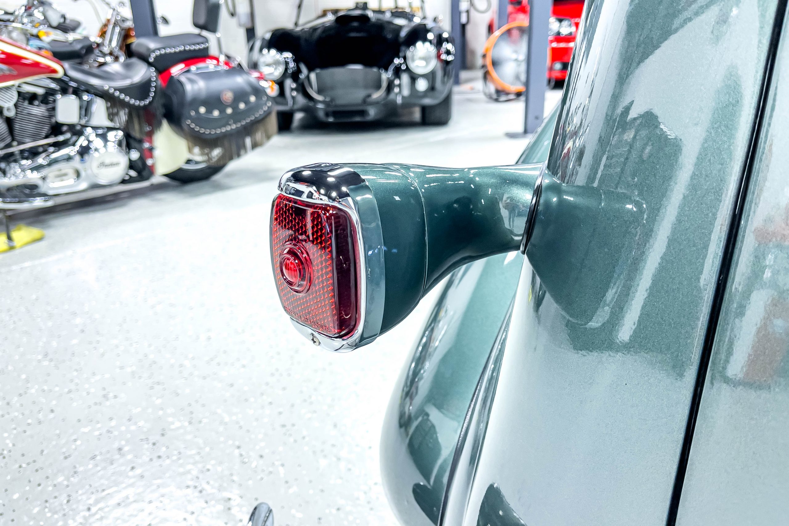 The restoration and hot-rodding process reportedly started in the late 1980s in which it has been preserved and updated as the decades marched on. It is beautifully finished in a custom mix green that was reportedly applied in 1990 by Aman’s in Canton, OH along with a hand applied champaign colored pin stripe and still presents exceptionally well today. The current custom interior appears to have been updated and installed in 2015 as it has a lovely modern presentation in a two-tone tan and chocolate brown color scheme with leather and suede seat material with no visible wear to speak of. The original gauge cluster is not operational and in its place is a beautifully crafted gauge cluster mounted at the bottom of the dash housing VDO gauges for battery voltage, fuel, speedometer, odometer, trip odometer, water temperature, and oil pressure. It also features an Ididit steering column and a chromed Hurst shifter. The current mileage shown is 1,123 miles which is reportedly the mileage accumulated since installation of the new gauges in 2015. We have driven approximately 250 miles in our 3 years of ownership.