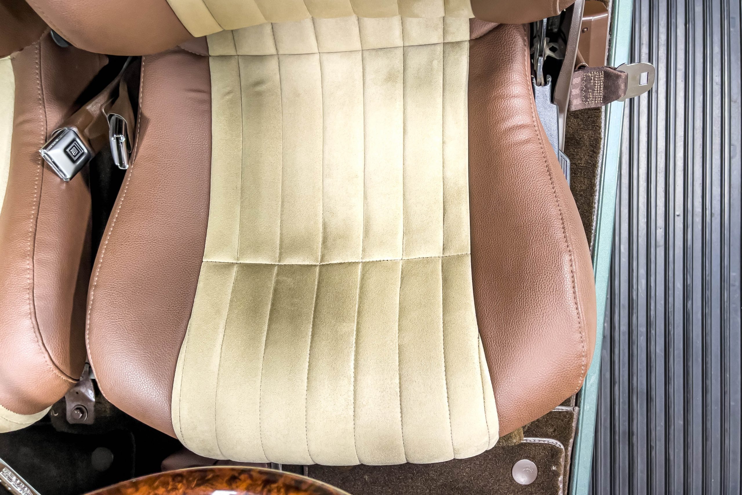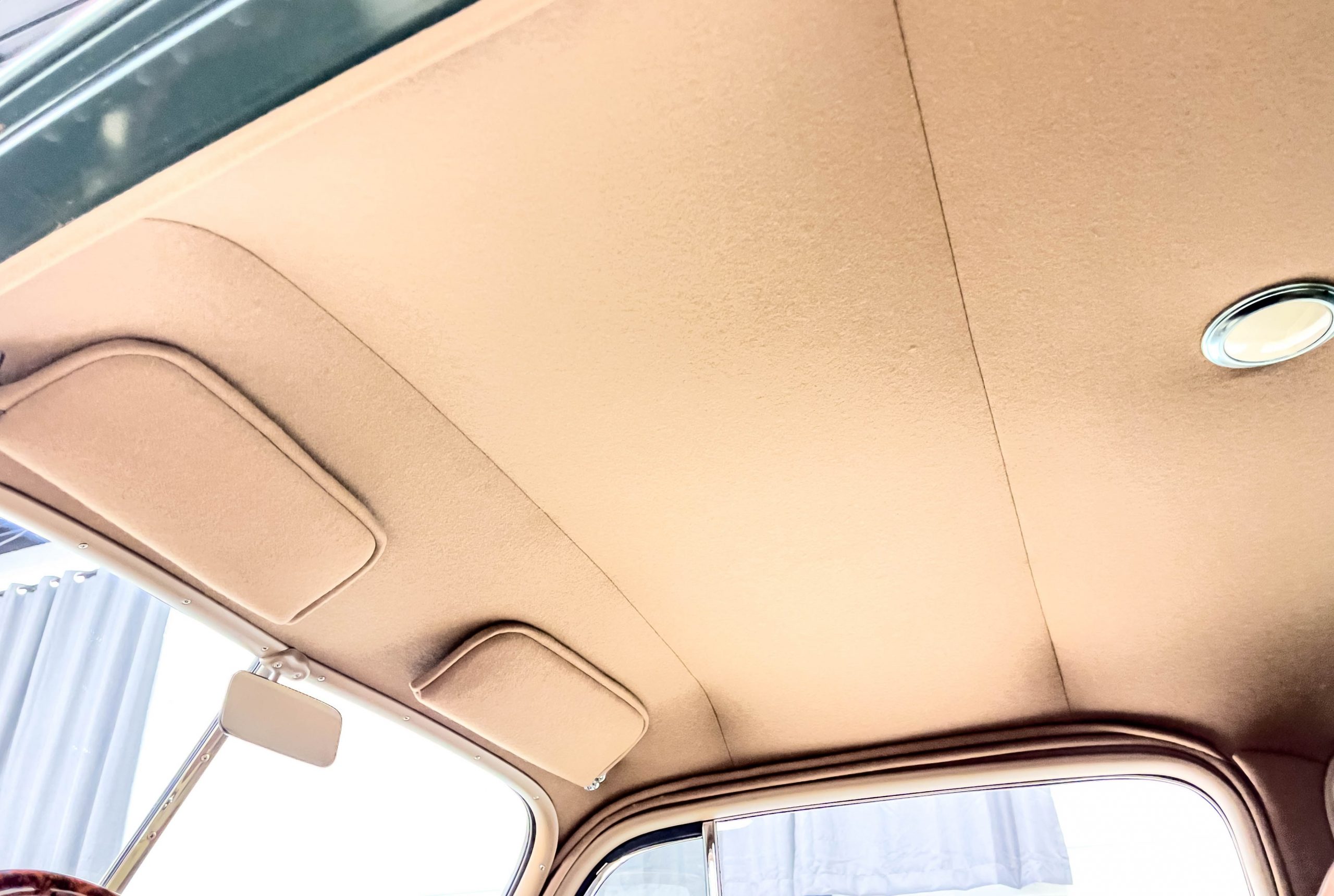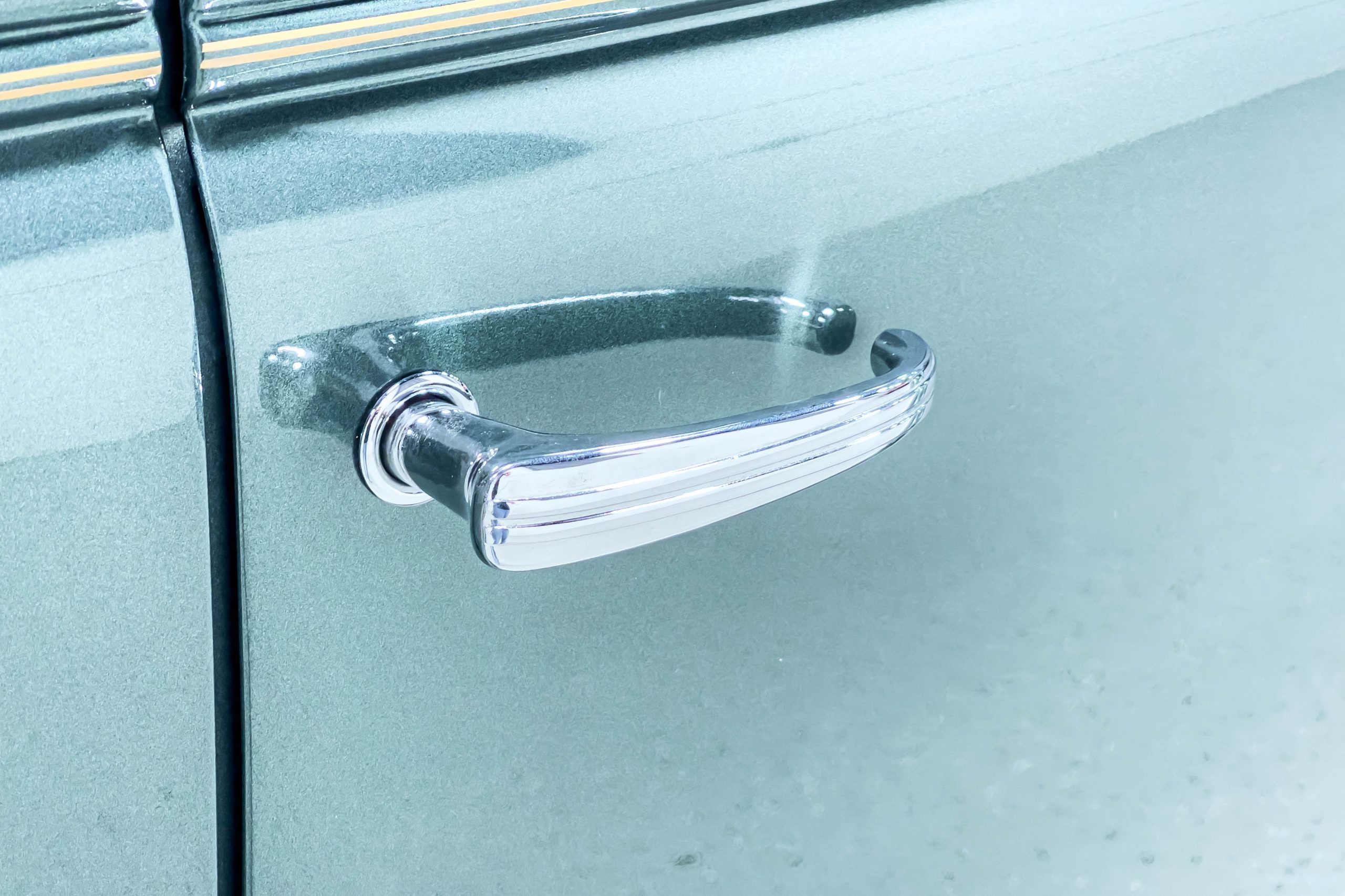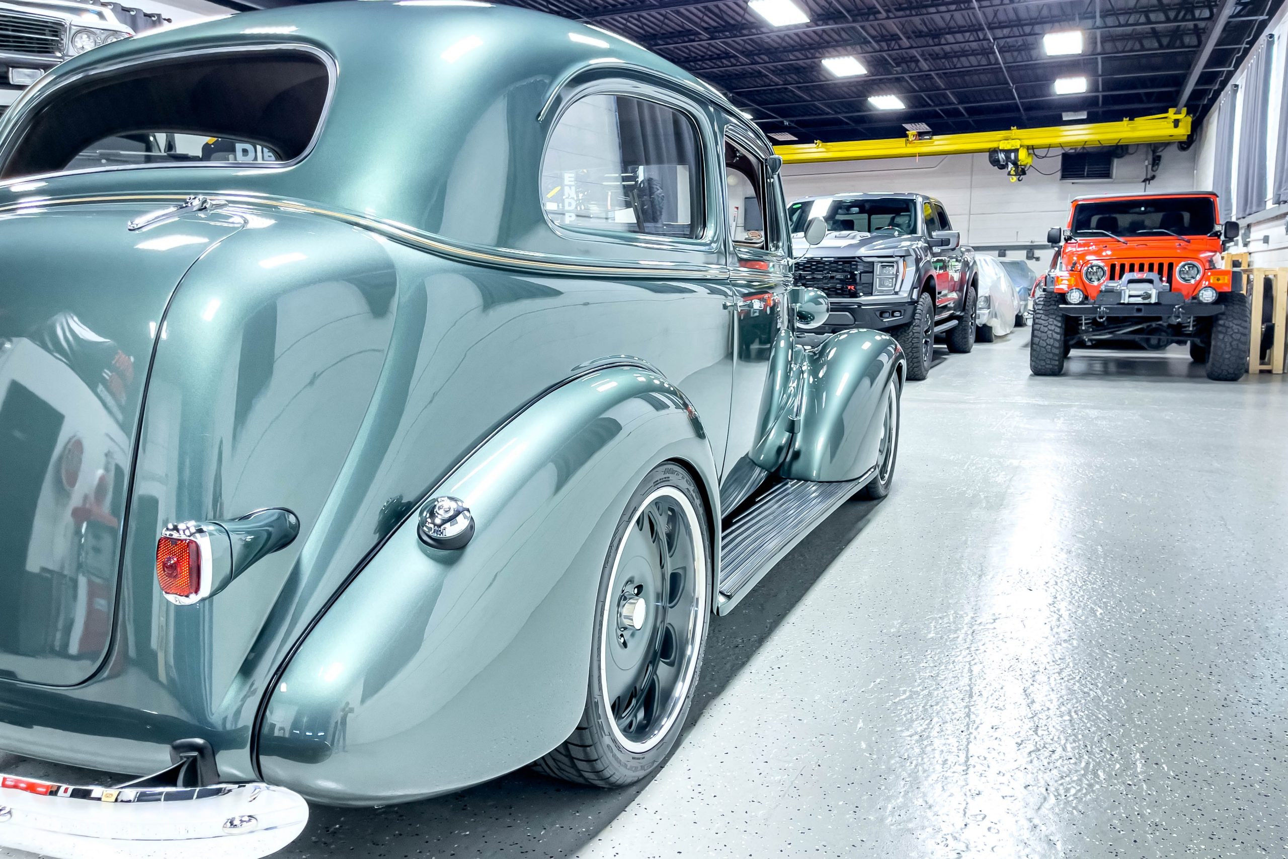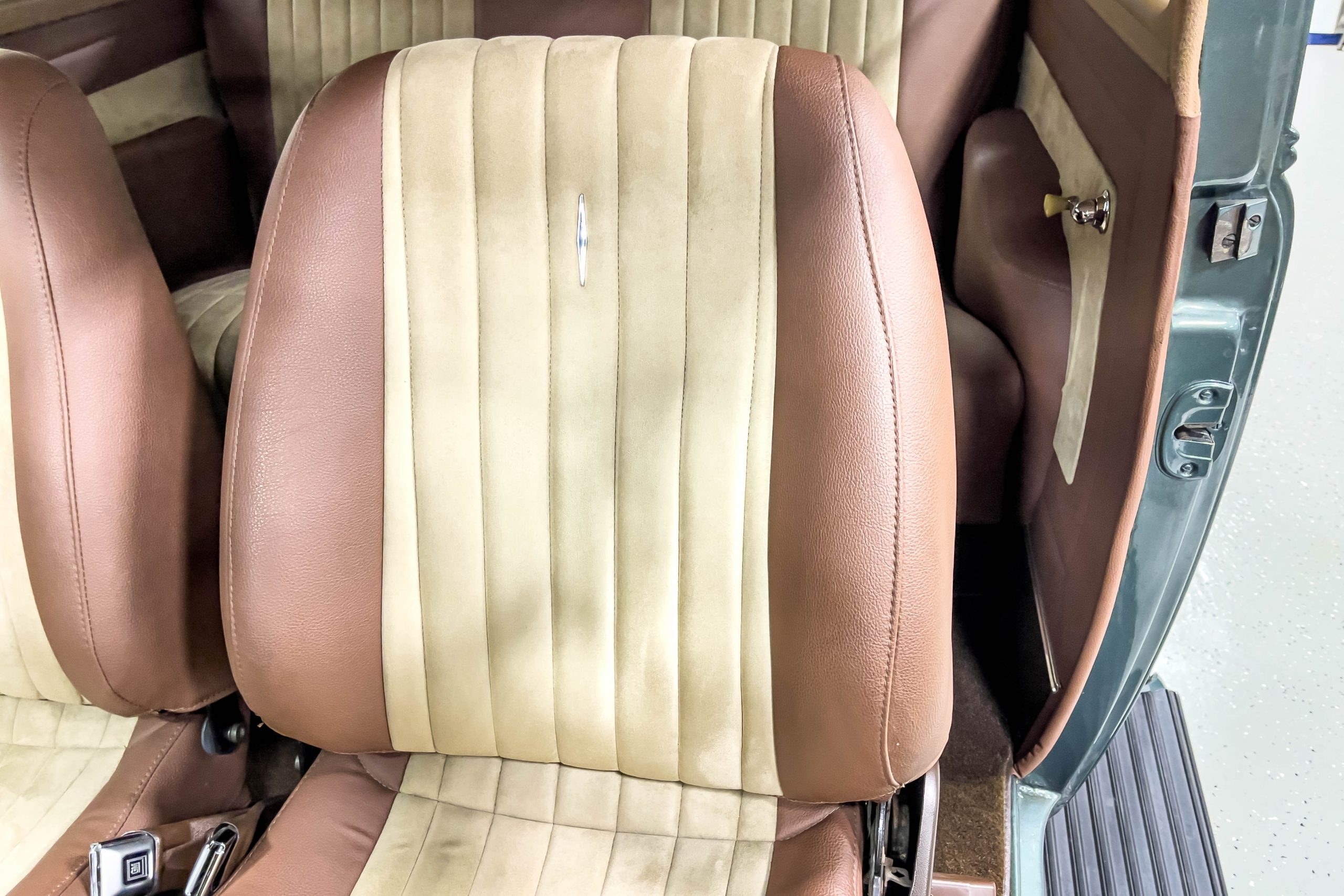 The restoration and hot-rodding process reportedly started in the late 1980s in which it has been preserved and updated as the decades marched on. It is beautifully finished in a custom mix green that was reportedly applied in 1990 by Aman’s in Canton, OH along with a hand applied champaign colored pin stripe and still presents exceptionally well today. The current custom interior appears to have been updated and installed in 2015 as it has a lovely modern presentation in a two-tone tan and chocolate brown color scheme with leather and suede seat material with no visible wear to speak of. The original gauge cluster is not operational and in its place is a beautifully crafted gauge cluster mounted at the bottom of the dash housing VDO gauges for battery voltage, fuel, speedometer, odometer, trip odometer, water temperature, and oil pressure. It also features an Ididit steering column and a chromed Hurst shifter. The current mileage shown is 1,123 miles which is reportedly the mileage accumulated since installation of the new gauges in 2015. We have driven approximately 250 miles in our 3 years of ownership.