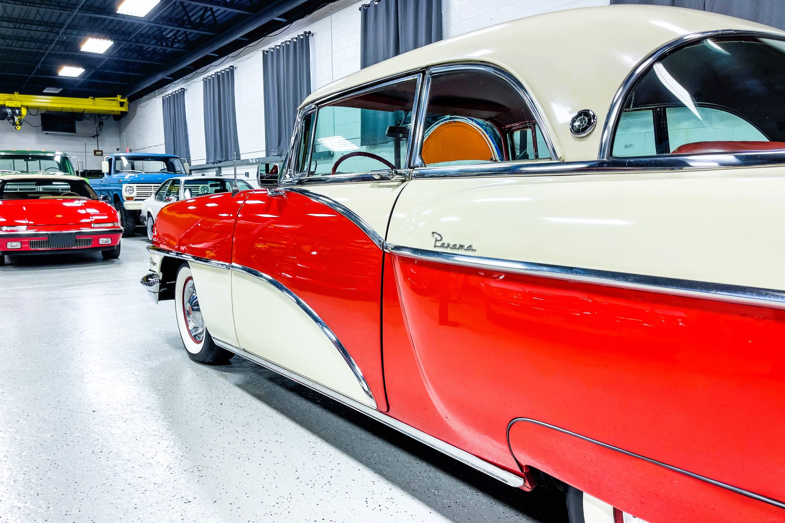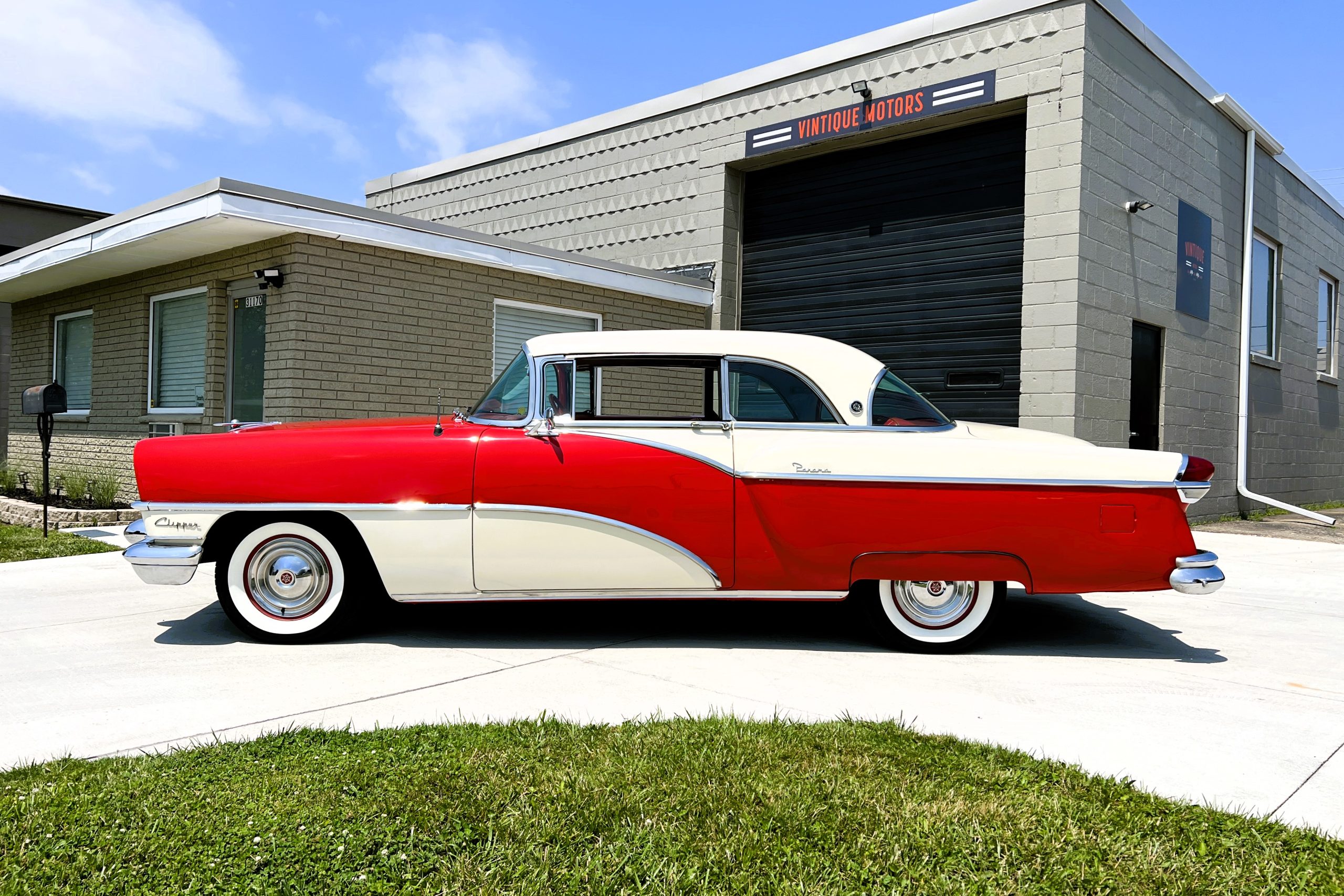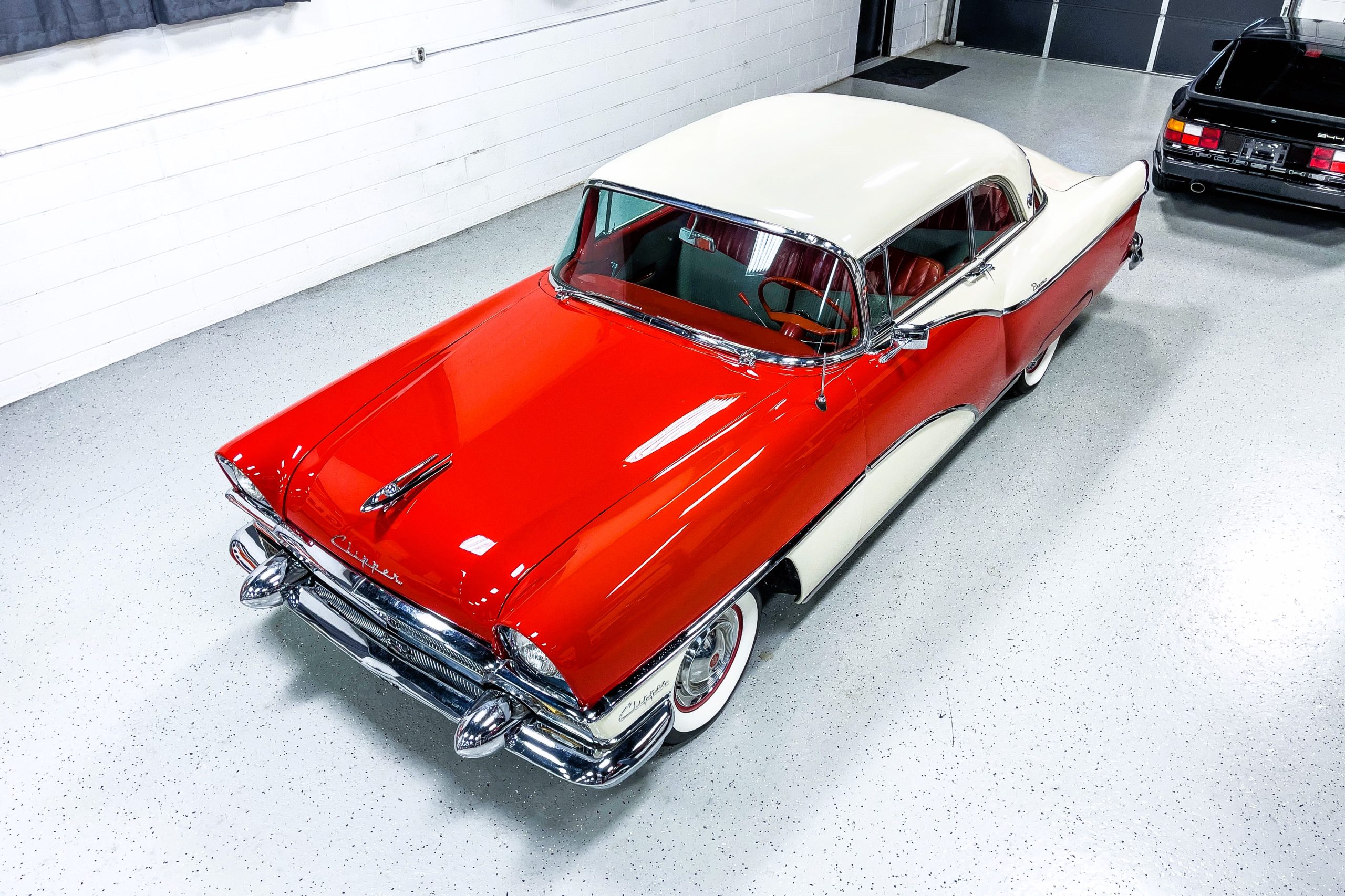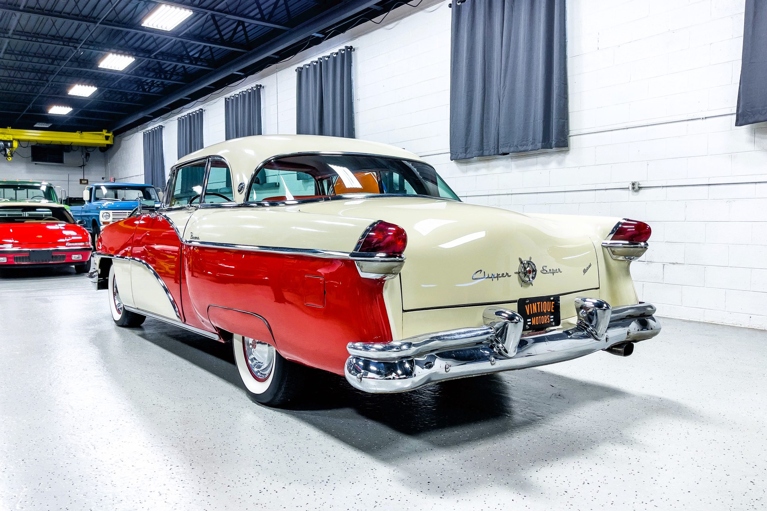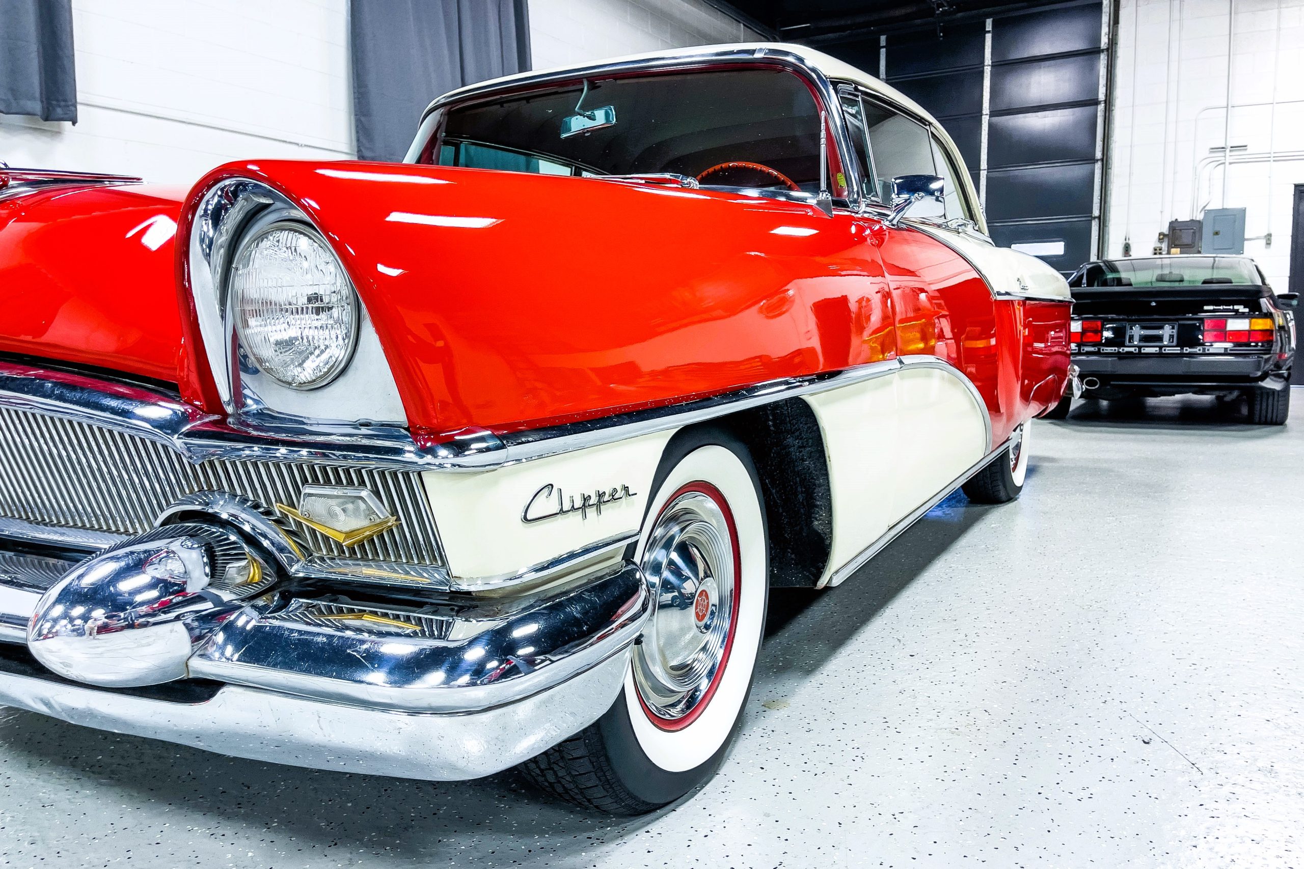 This 1955 Packard Clipper Super Panama, which was only offered as a 2-door hardtop coupe, is finished in two-tone Fire Opal and White Jade over a red interior. The Super Panama trim was the most expensive trim offered on the Clipper model with a retail cost of $3,100. Packard significantly altered the Clipper line in 1955 with a new design, new powertrain, and a new chassis. The car’s front was radically different, with a mesh grille, revised bumper, and a wraparound windshield. Mechanically, a 12-volt electrical system was adopted, a new torsion bar suspension was installed, the Ultramatic transmission was enhanced, and a V8 replaced the straight-eight engines.