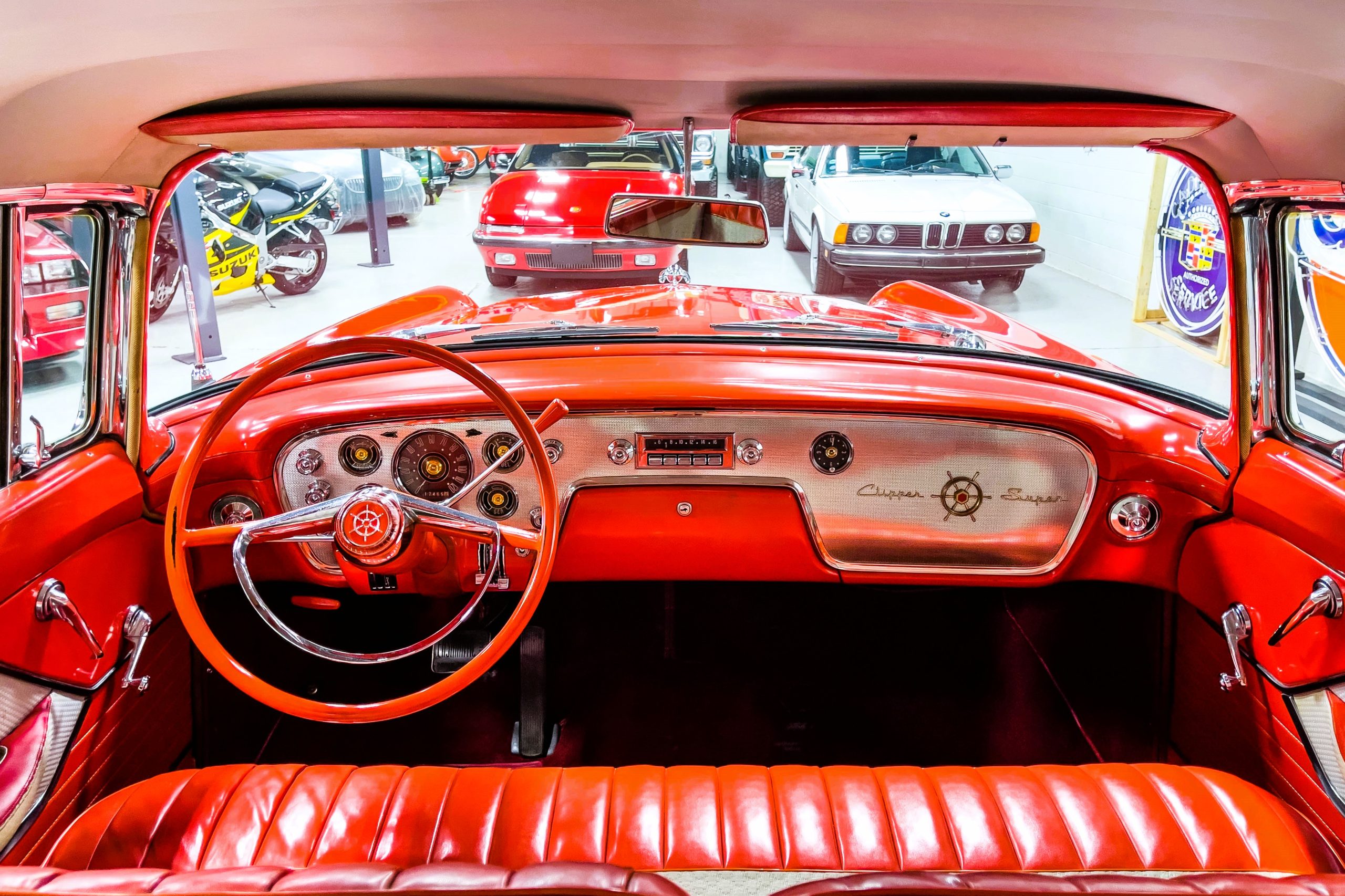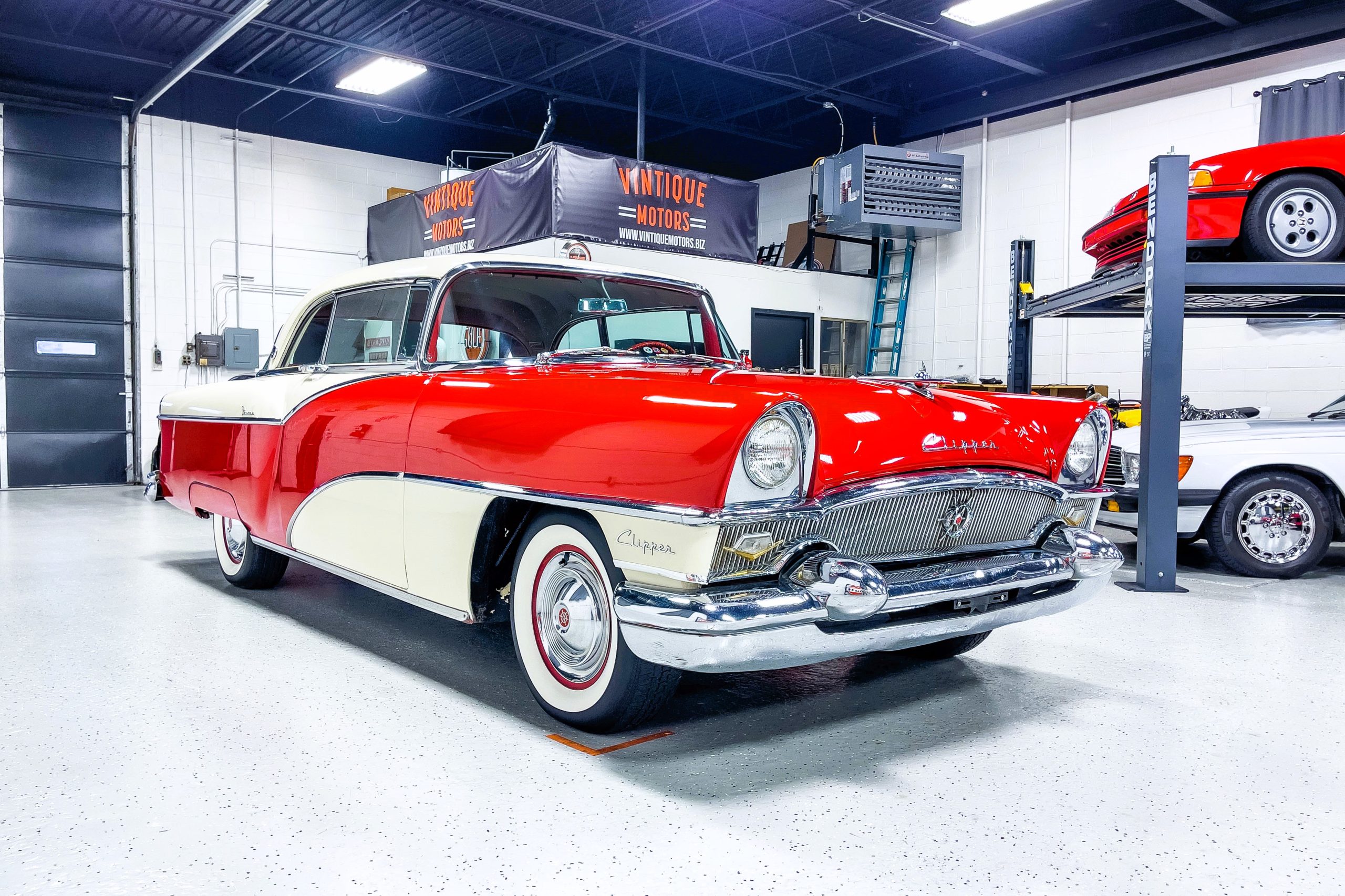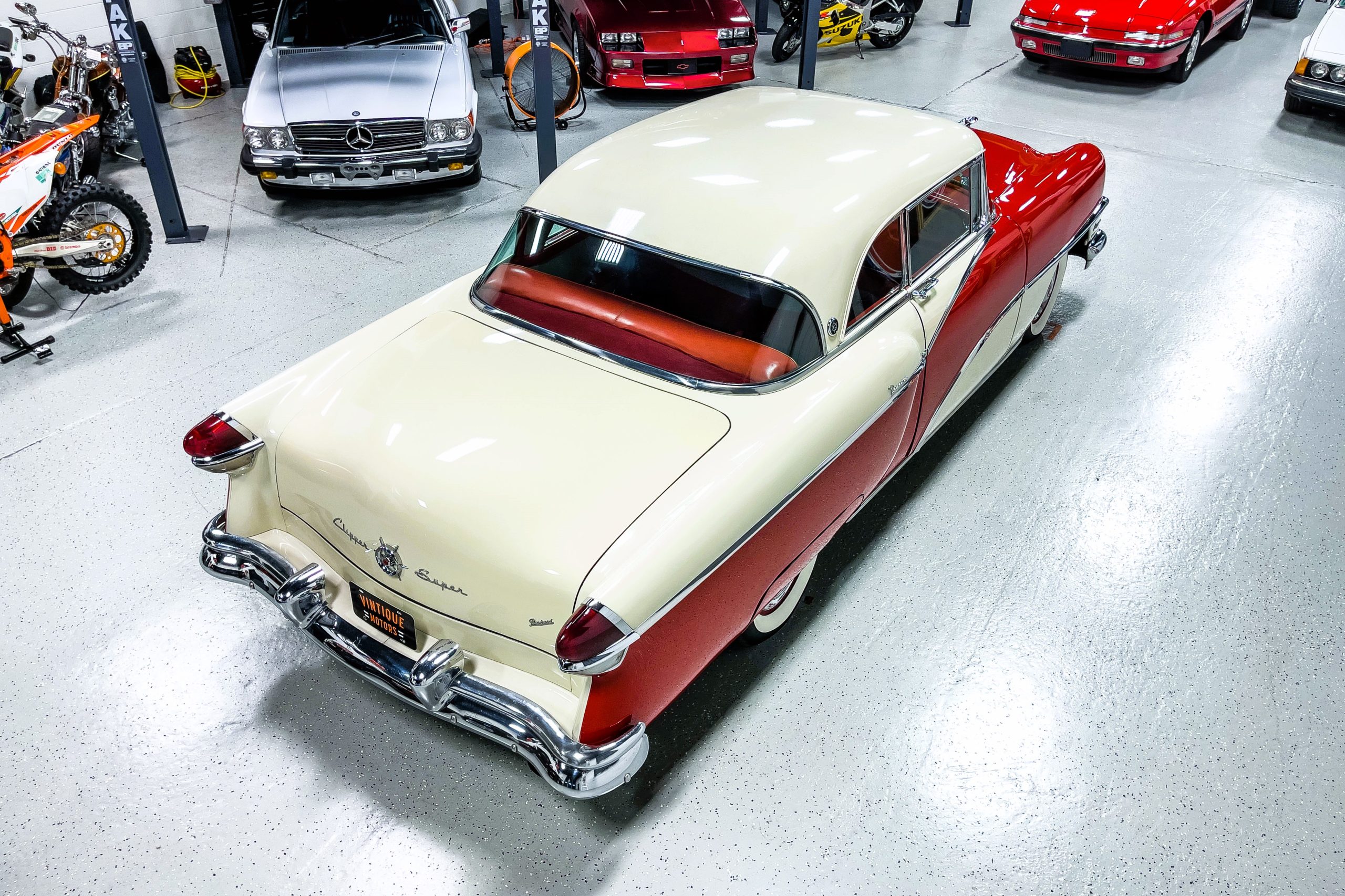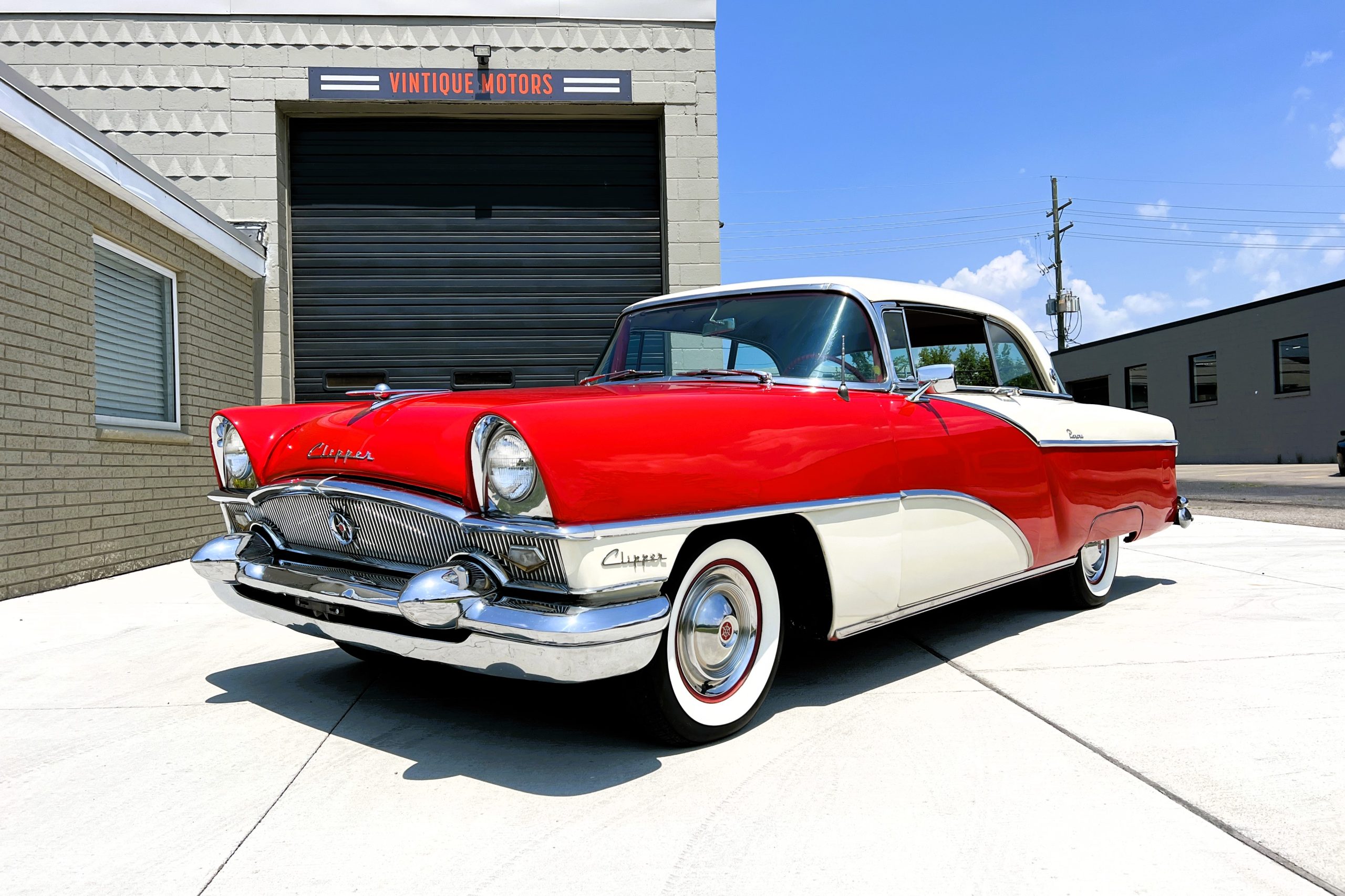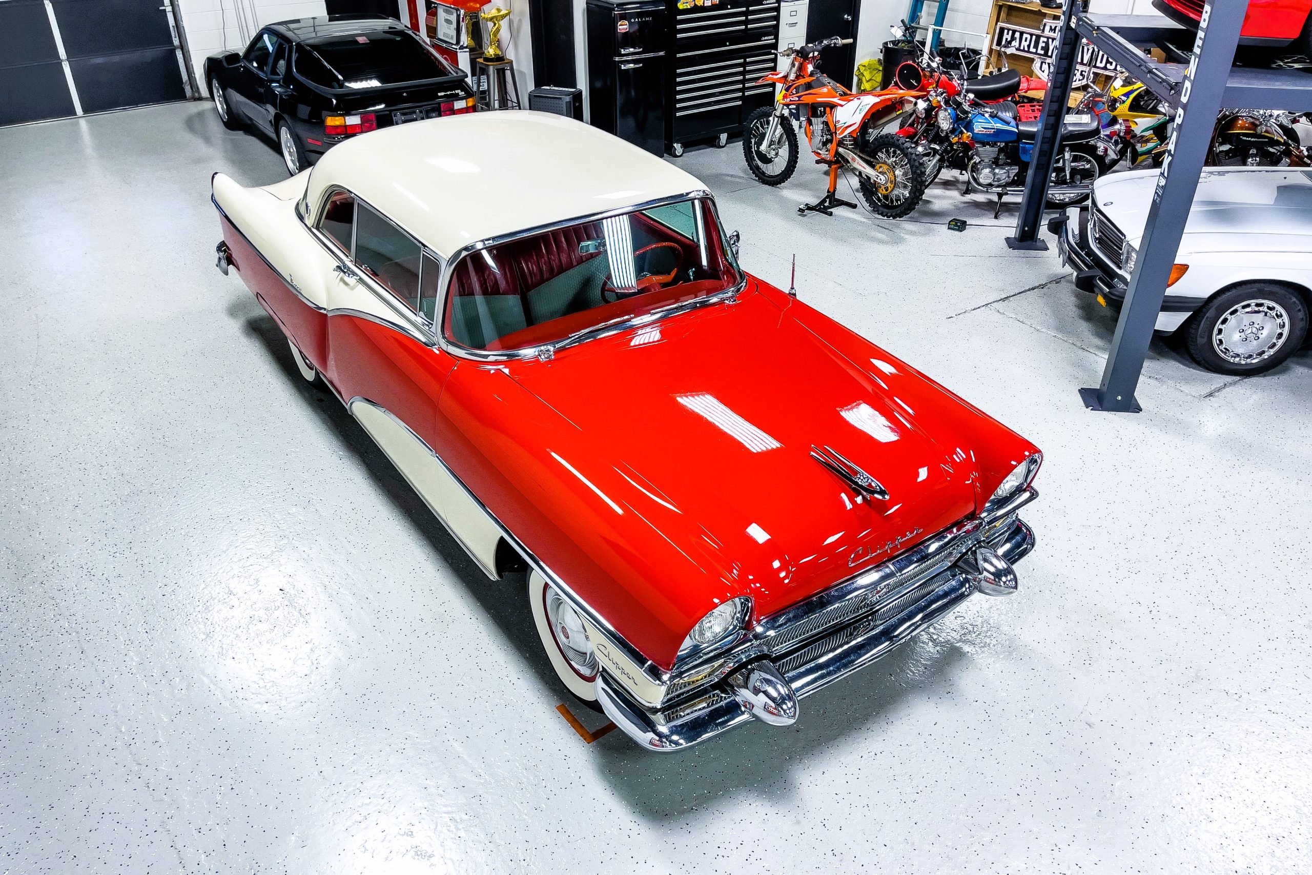 This 1955 Packard Clipper Super Panama, which was only offered as a 2-door hardtop coupe, is finished in two-tone Fire Opal and White Jade over a red interior. The Super Panama trim was the most expensive trim offered on the Clipper model with a retail cost of $3,100. Packard significantly altered the Clipper line in 1955 with a new design, new powertrain, and a new chassis. The car’s front was radically different, with a mesh grille, revised bumper, and a wraparound windshield. Mechanically, a 12-volt electrical system was adopted, a new torsion bar suspension was installed, the Ultramatic transmission was enhanced, and a V8 replaced the straight-eight engines.