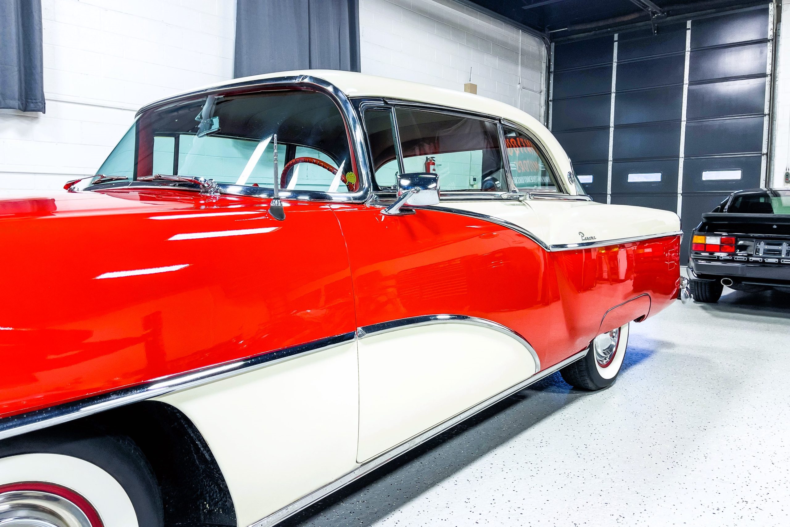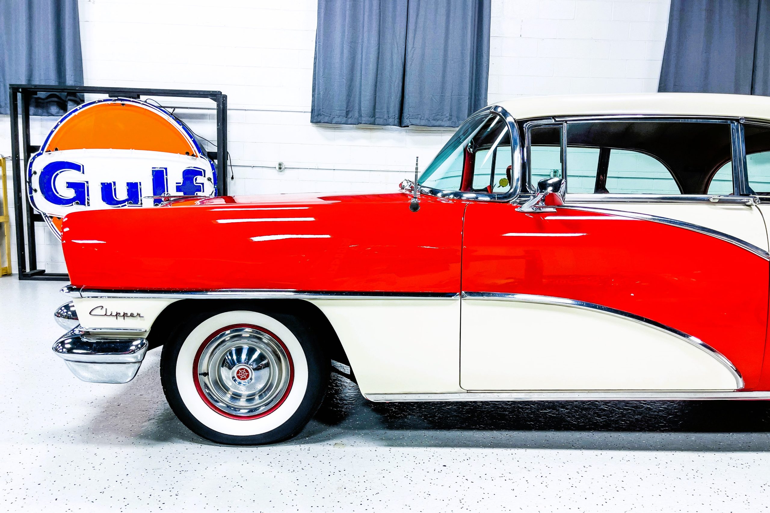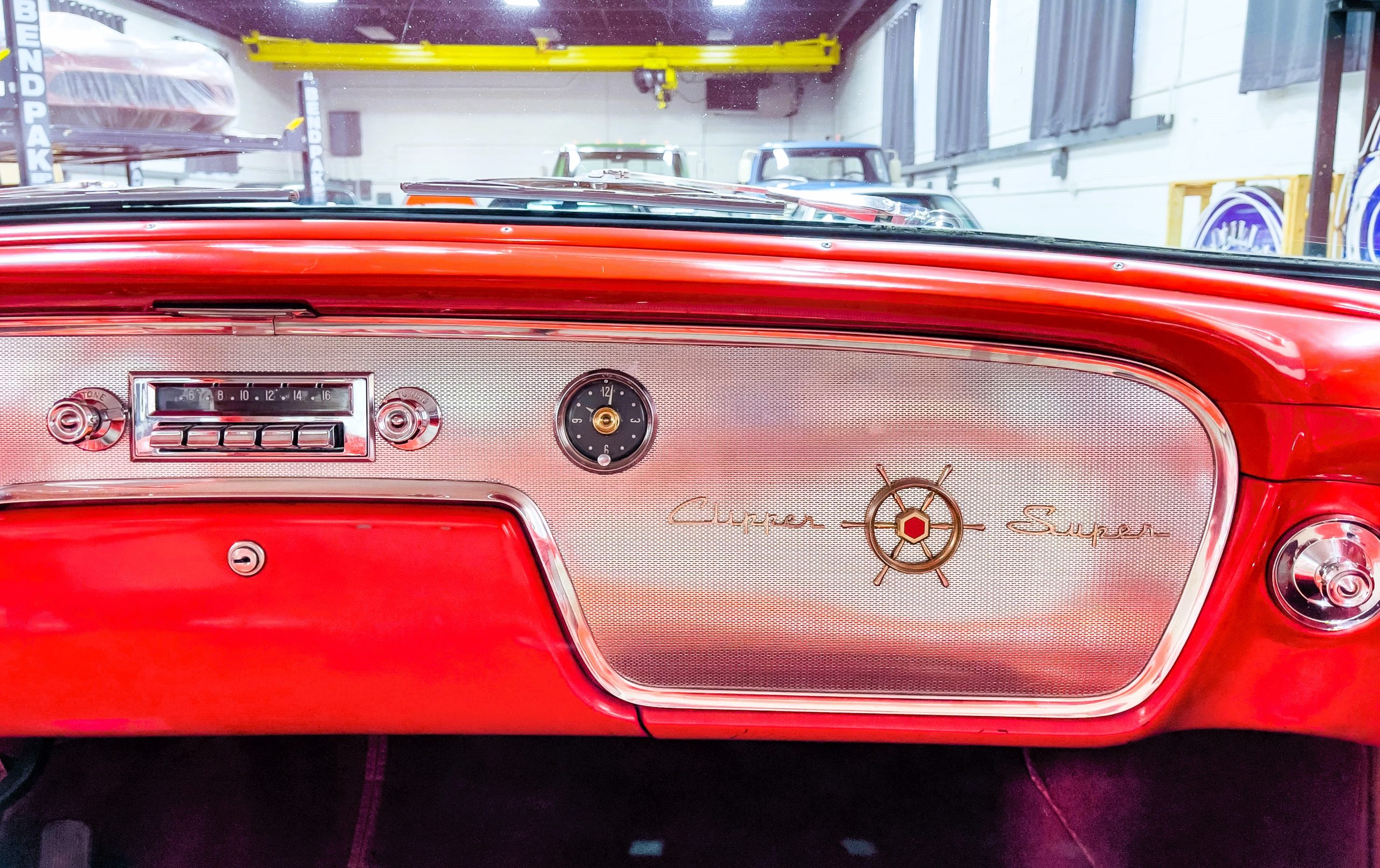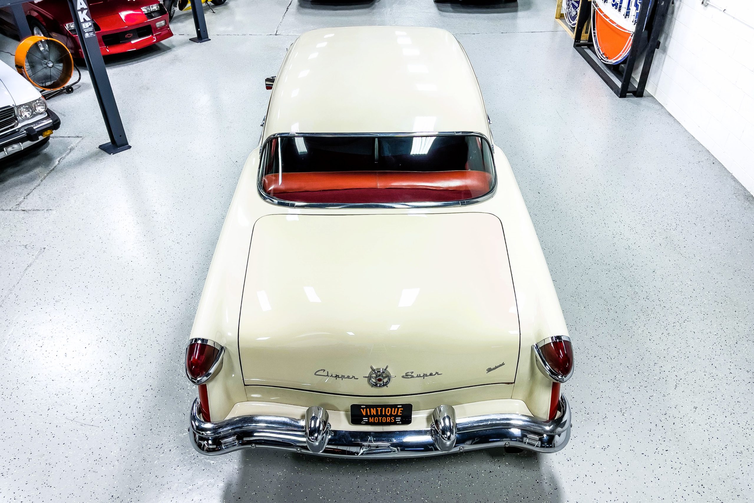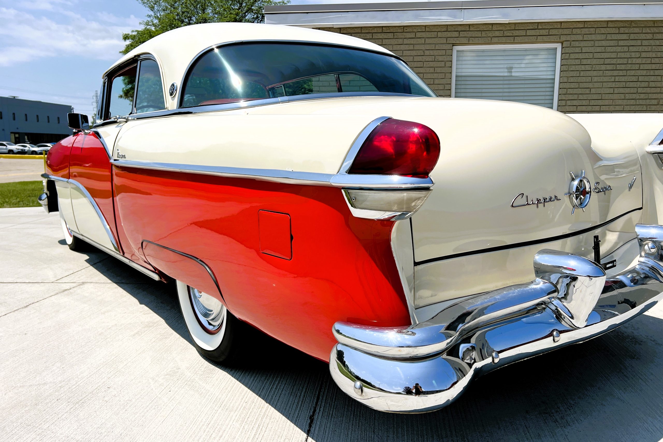 This 1955 Packard Clipper Super Panama, which was only offered as a 2-door hardtop coupe, is finished in two-tone Fire Opal and White Jade over a red interior. The Super Panama trim was the most expensive trim offered on the Clipper model with a retail cost of $3,100. Packard significantly altered the Clipper line in 1955 with a new design, new powertrain, and a new chassis. The car’s front was radically different, with a mesh grille, revised bumper, and a wraparound windshield. Mechanically, a 12-volt electrical system was adopted, a new torsion bar suspension was installed, the Ultramatic transmission was enhanced, and a V8 replaced the straight-eight engines.