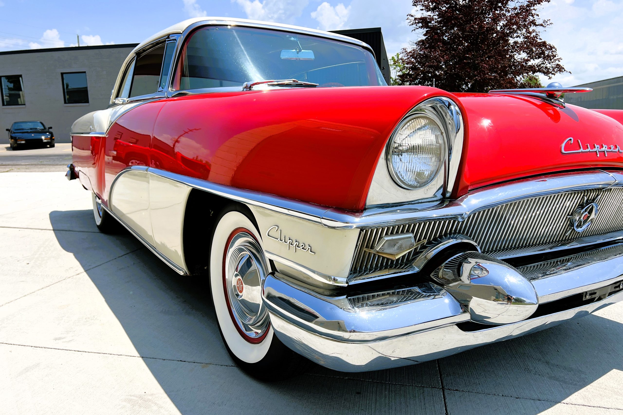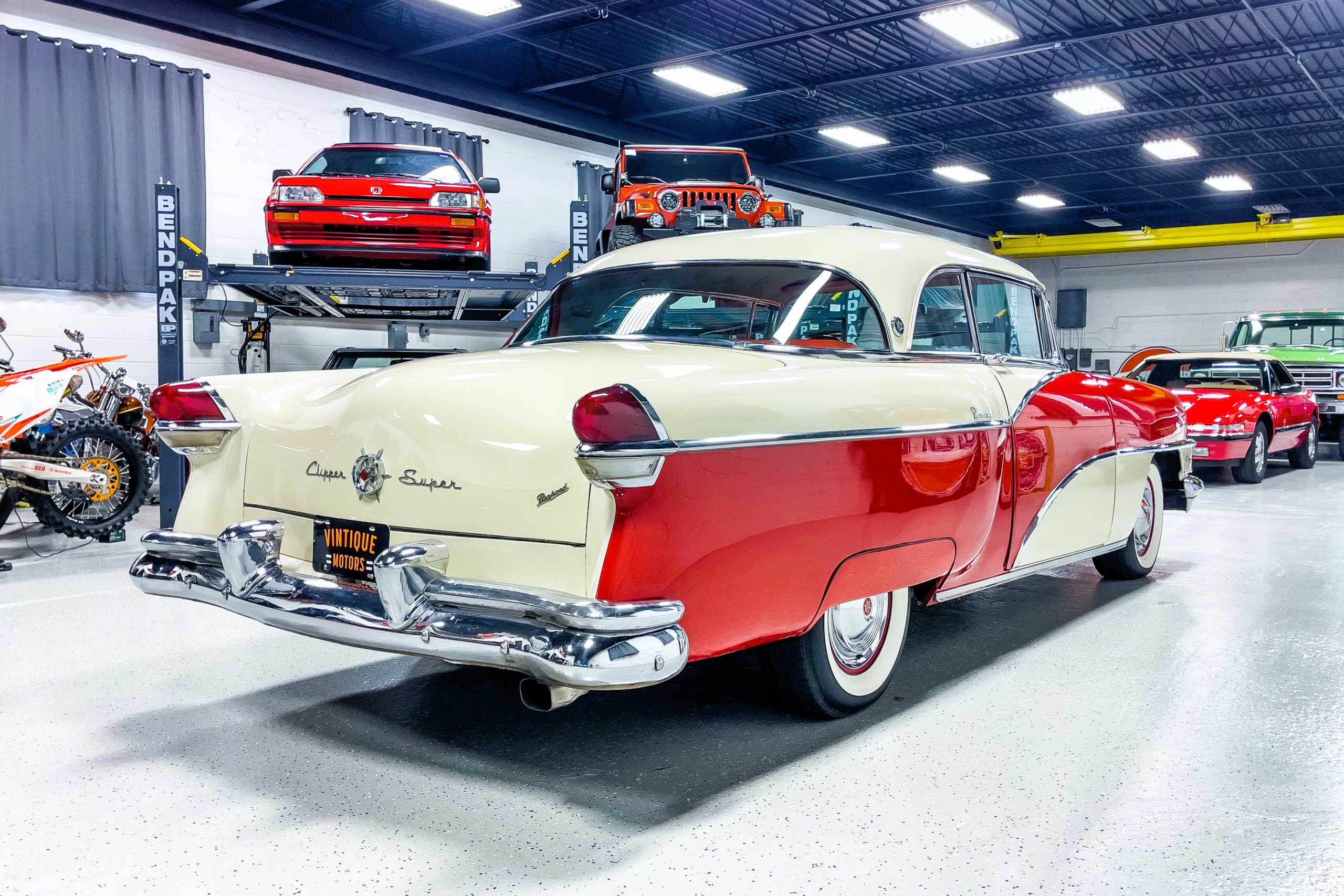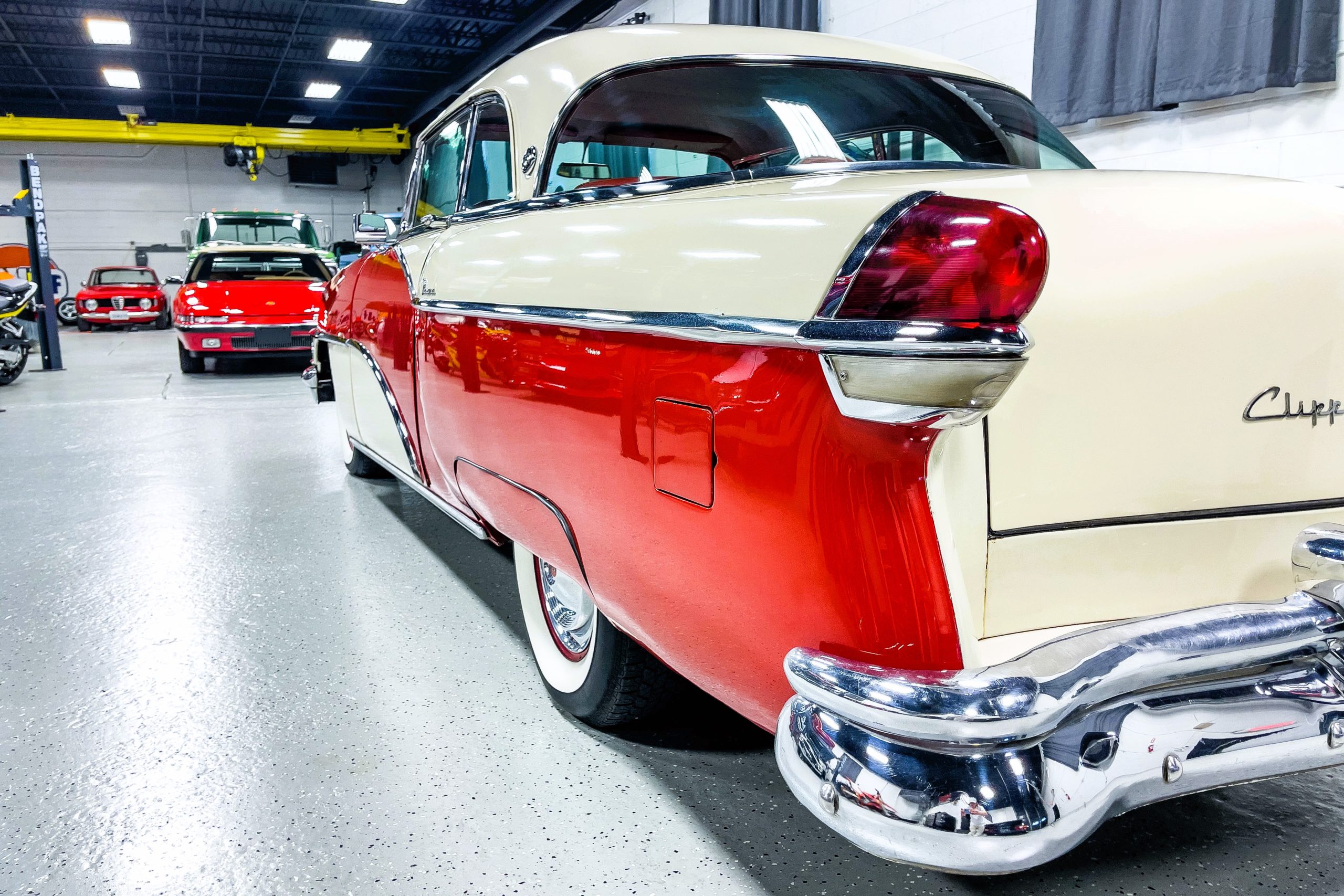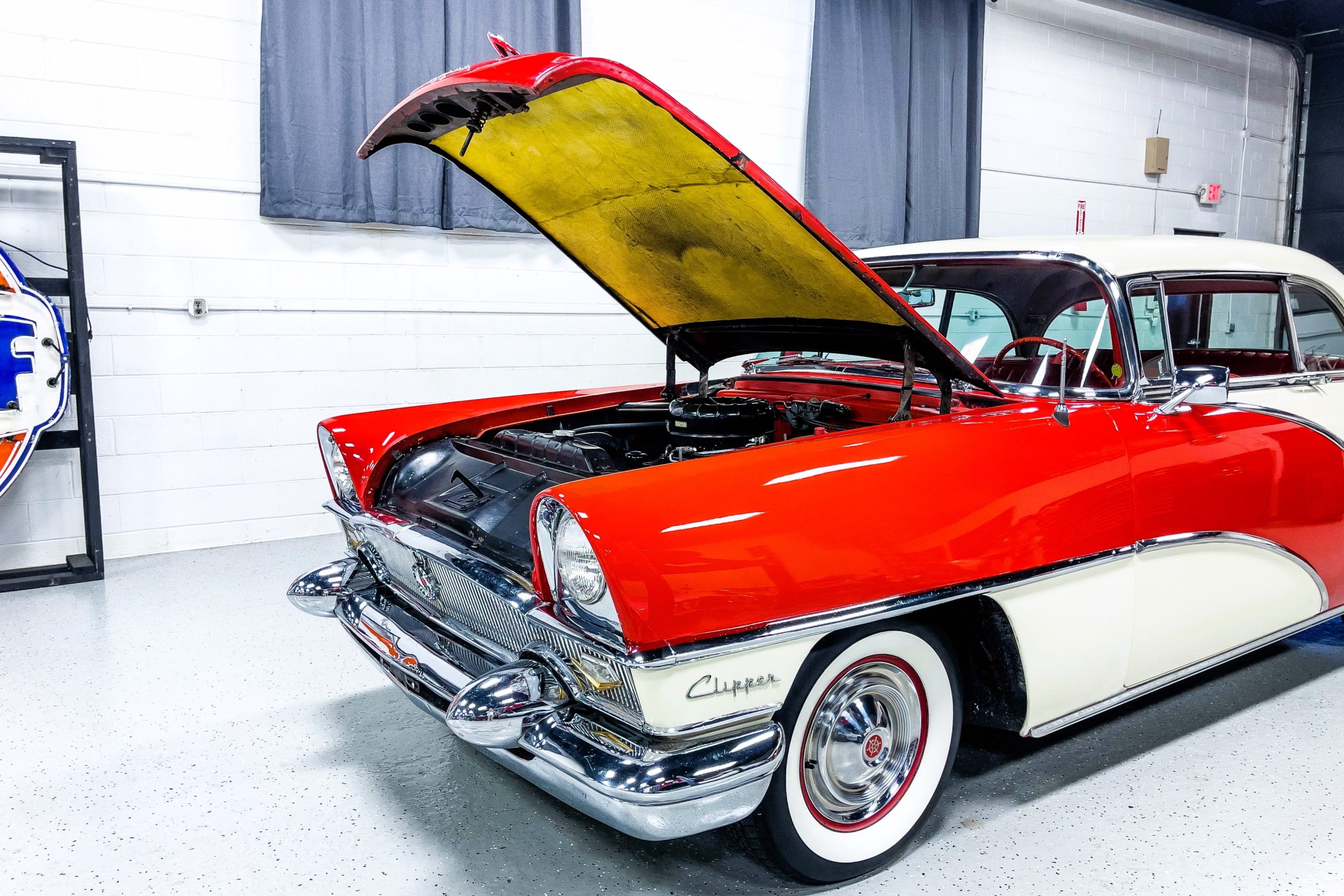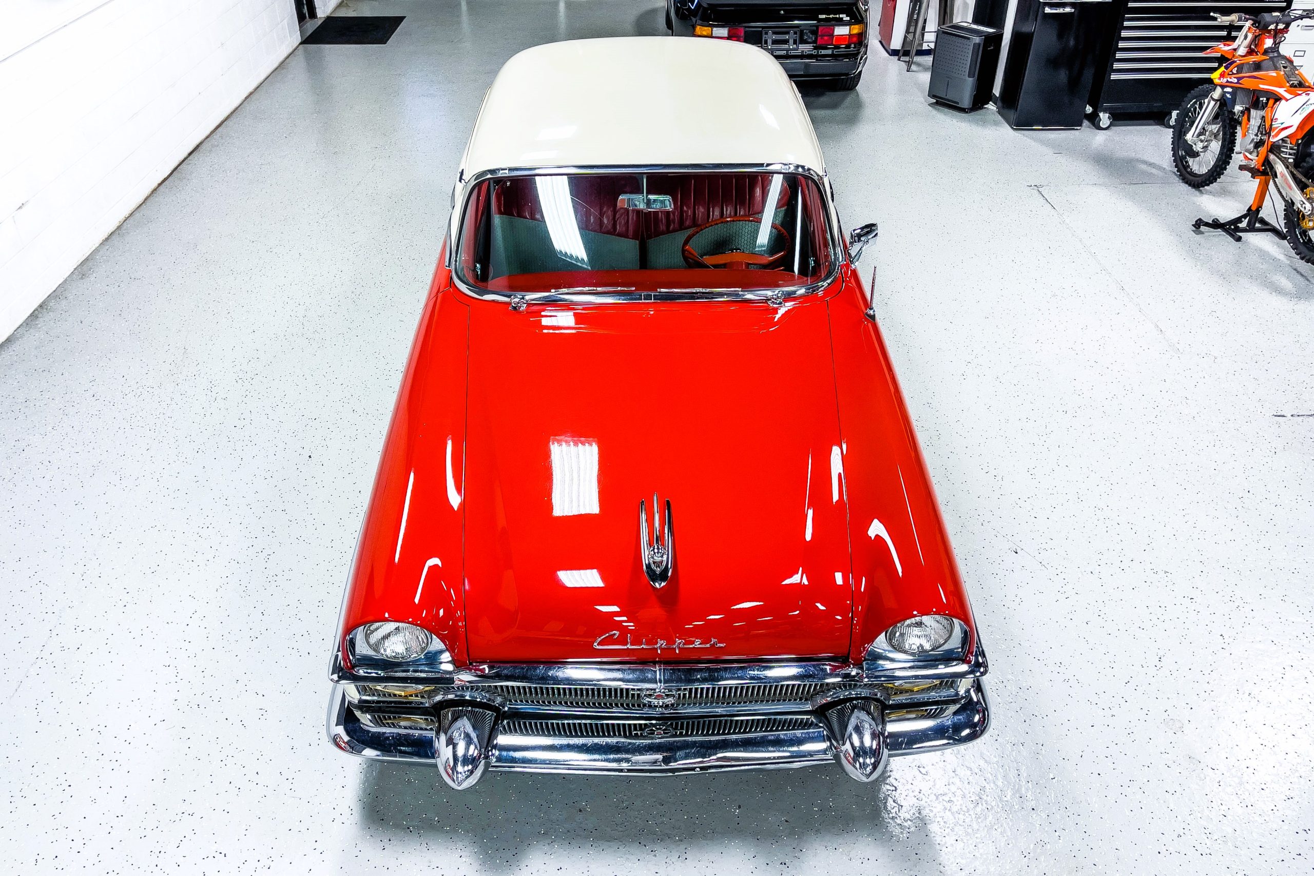 This 1955 Packard Clipper Super Panama, which was only offered as a 2-door hardtop coupe, is finished in two-tone Fire Opal and White Jade over a red interior. The Super Panama trim was the most expensive trim offered on the Clipper model with a retail cost of $3,100. Packard significantly altered the Clipper line in 1955 with a new design, new powertrain, and a new chassis. The car’s front was radically different, with a mesh grille, revised bumper, and a wraparound windshield. Mechanically, a 12-volt electrical system was adopted, a new torsion bar suspension was installed, the Ultramatic transmission was enhanced, and a V8 replaced the straight-eight engines.