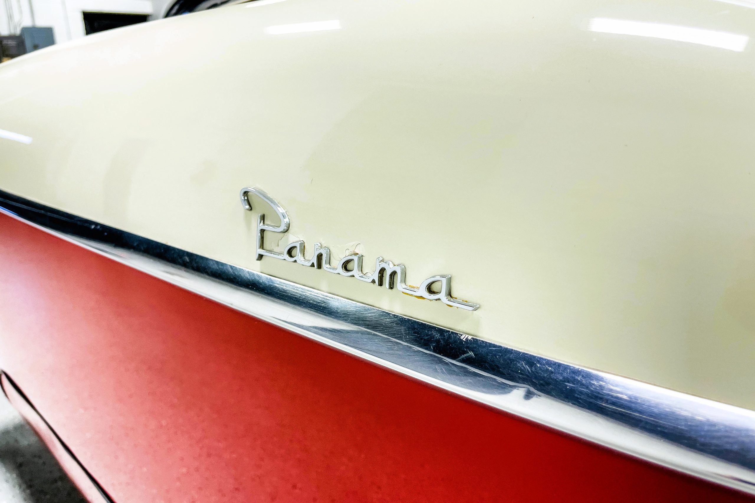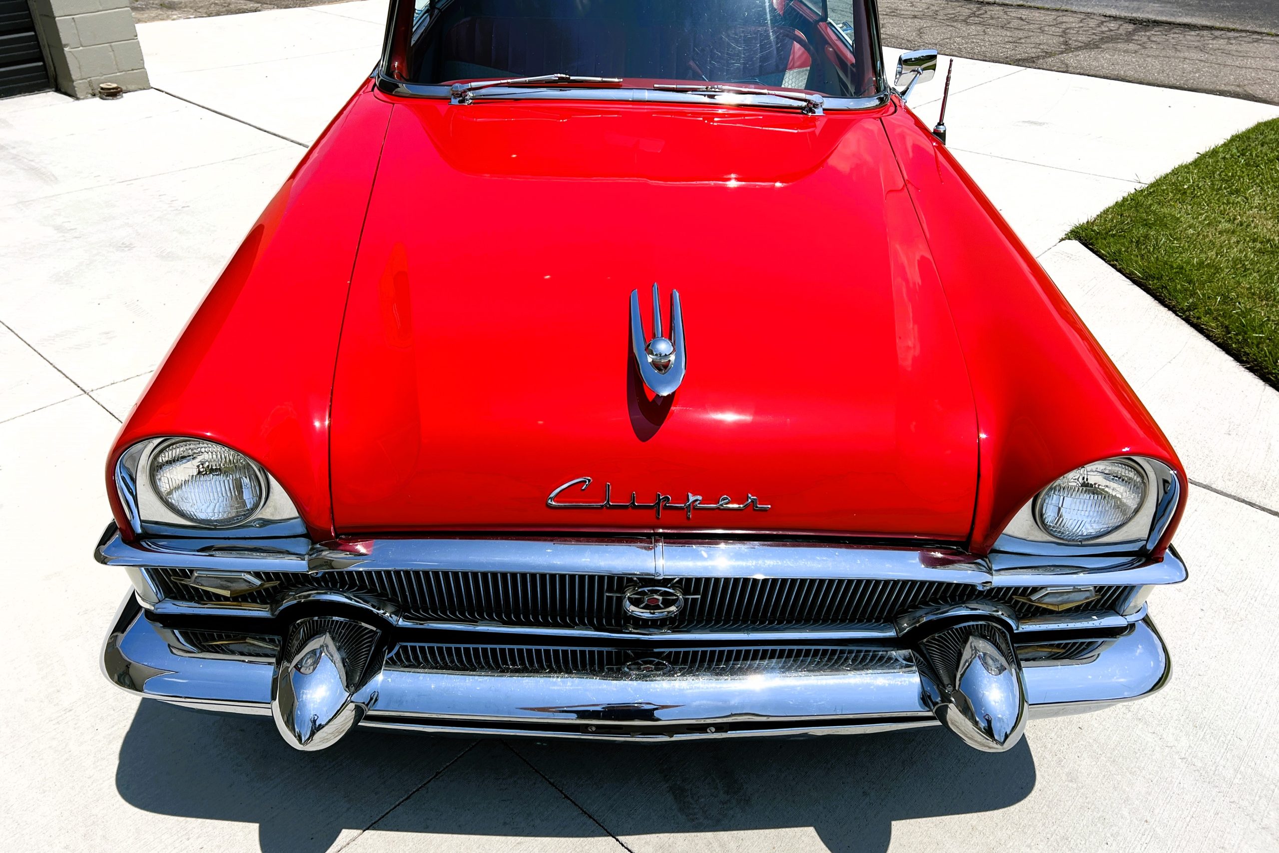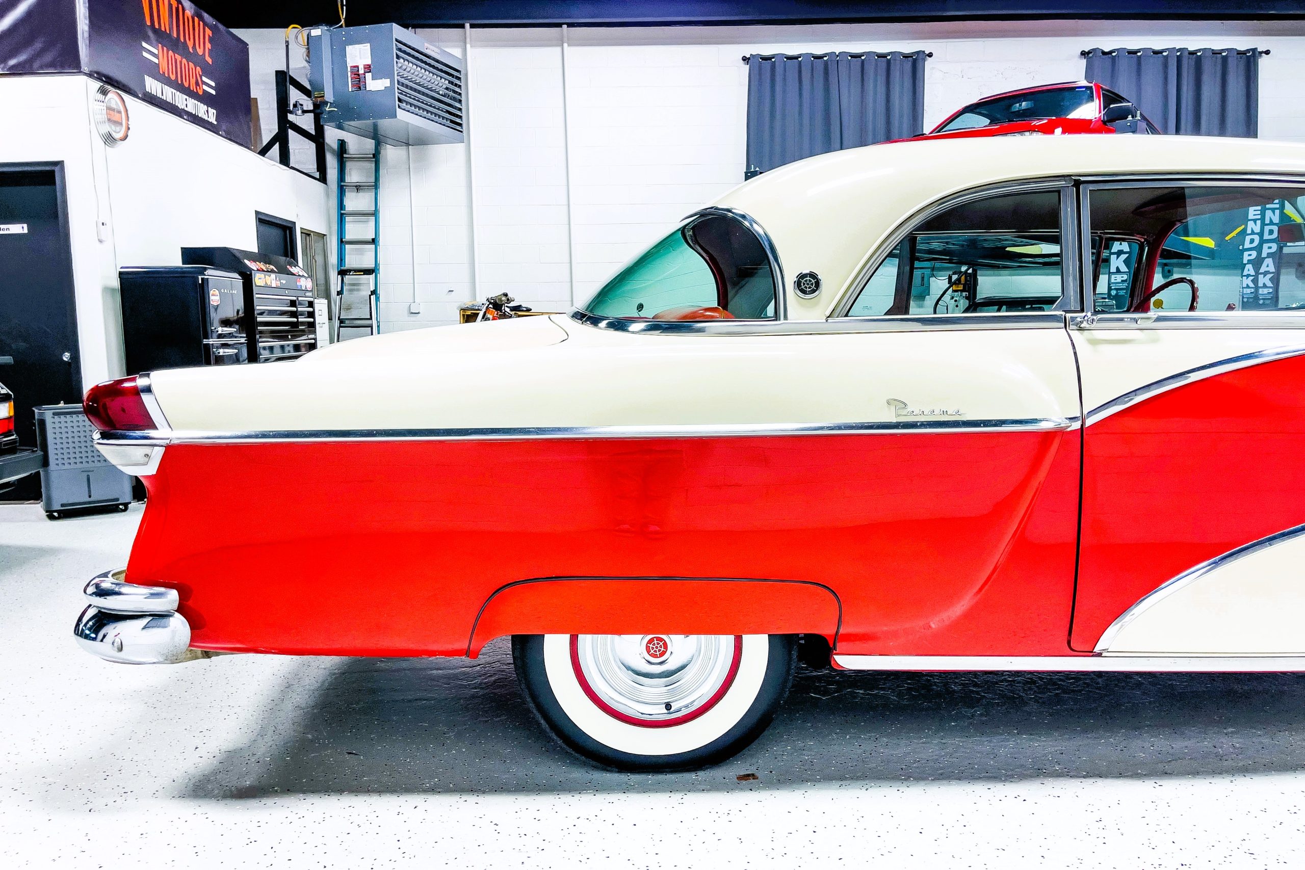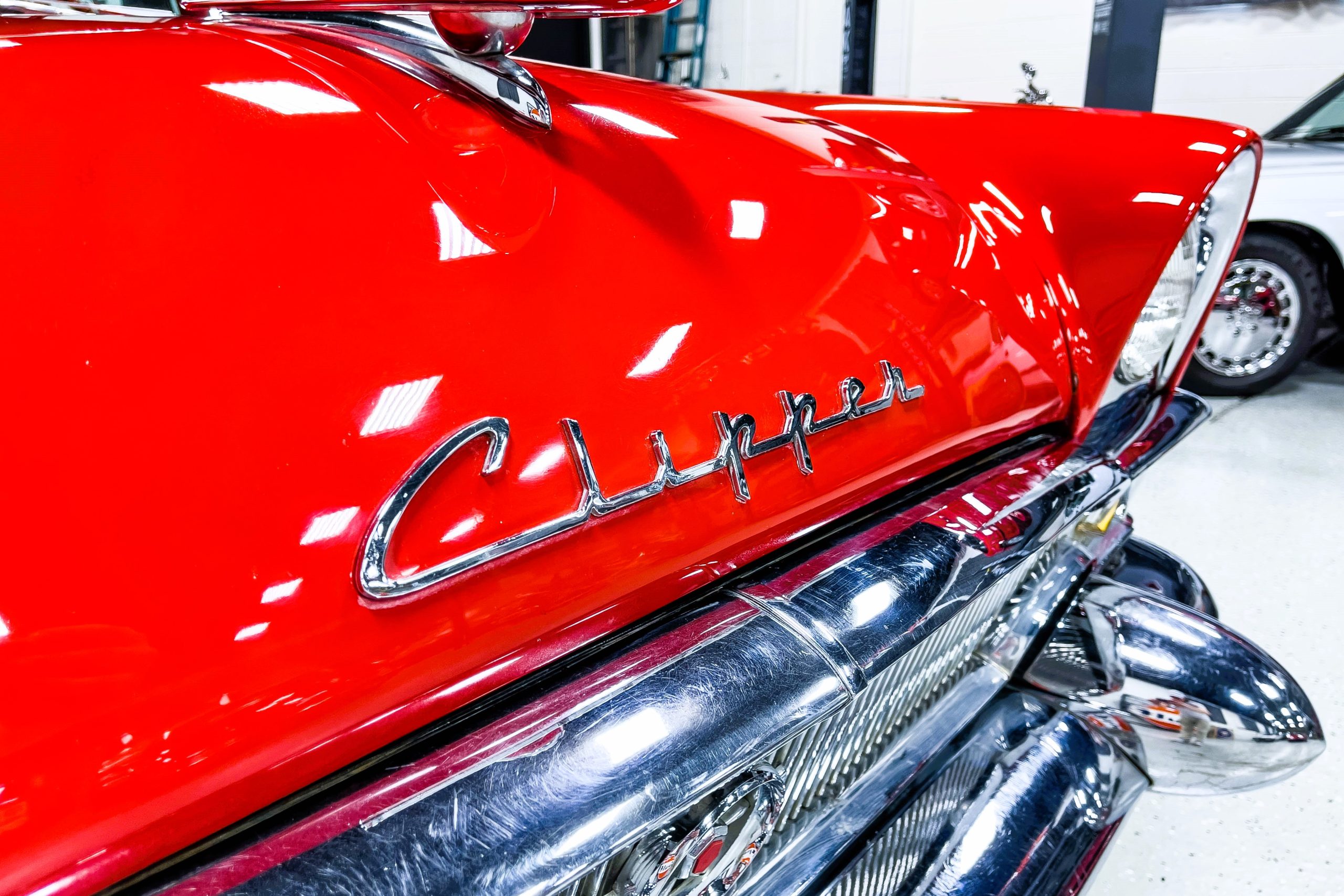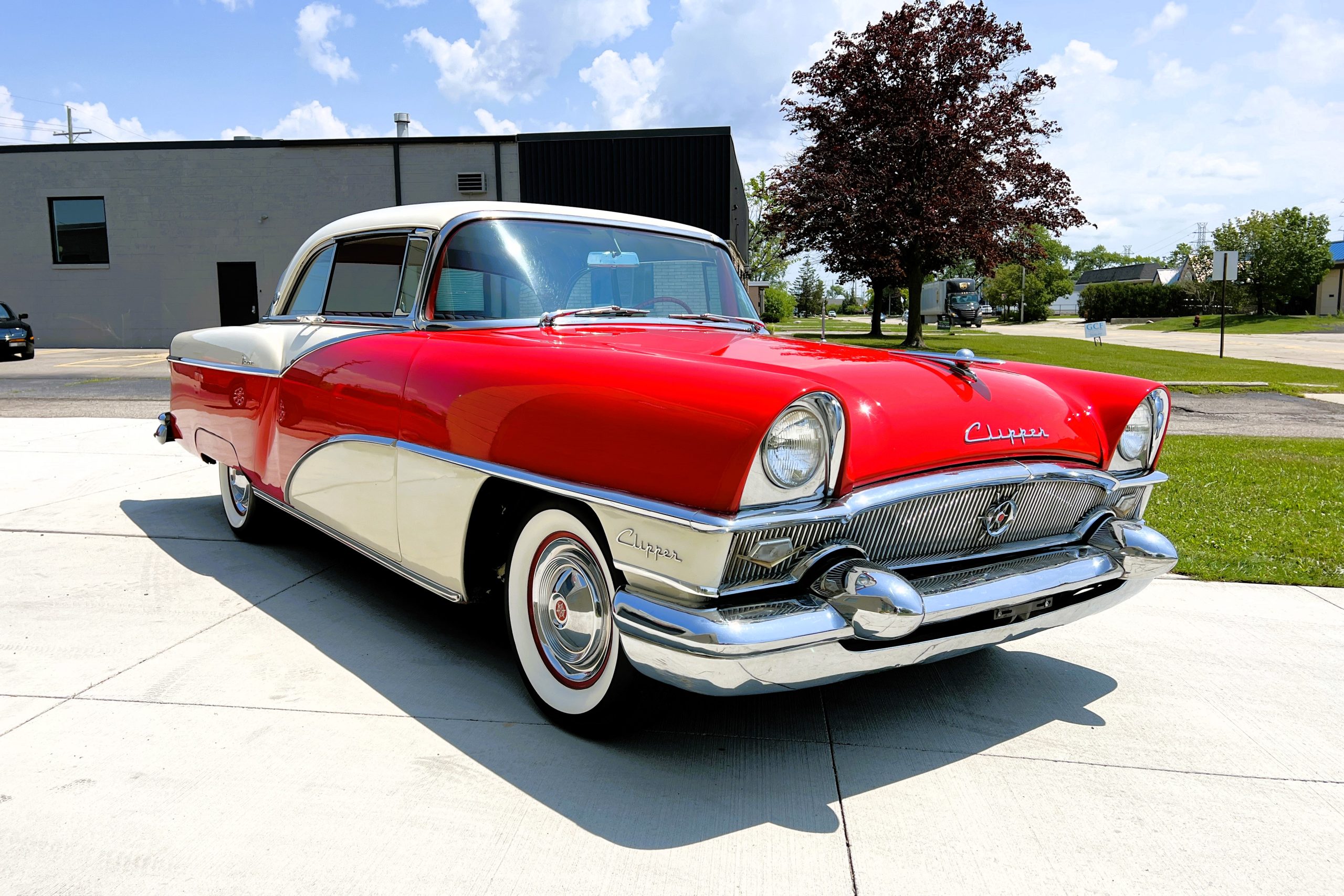 This 1955 Packard Clipper Super Panama, which was only offered as a 2-door hardtop coupe, is finished in two-tone Fire Opal and White Jade over a red interior. The Super Panama trim was the most expensive trim offered on the Clipper model with a retail cost of $3,100. Packard significantly altered the Clipper line in 1955 with a new design, new powertrain, and a new chassis. The car’s front was radically different, with a mesh grille, revised bumper, and a wraparound windshield. Mechanically, a 12-volt electrical system was adopted, a new torsion bar suspension was installed, the Ultramatic transmission was enhanced, and a V8 replaced the straight-eight engines.