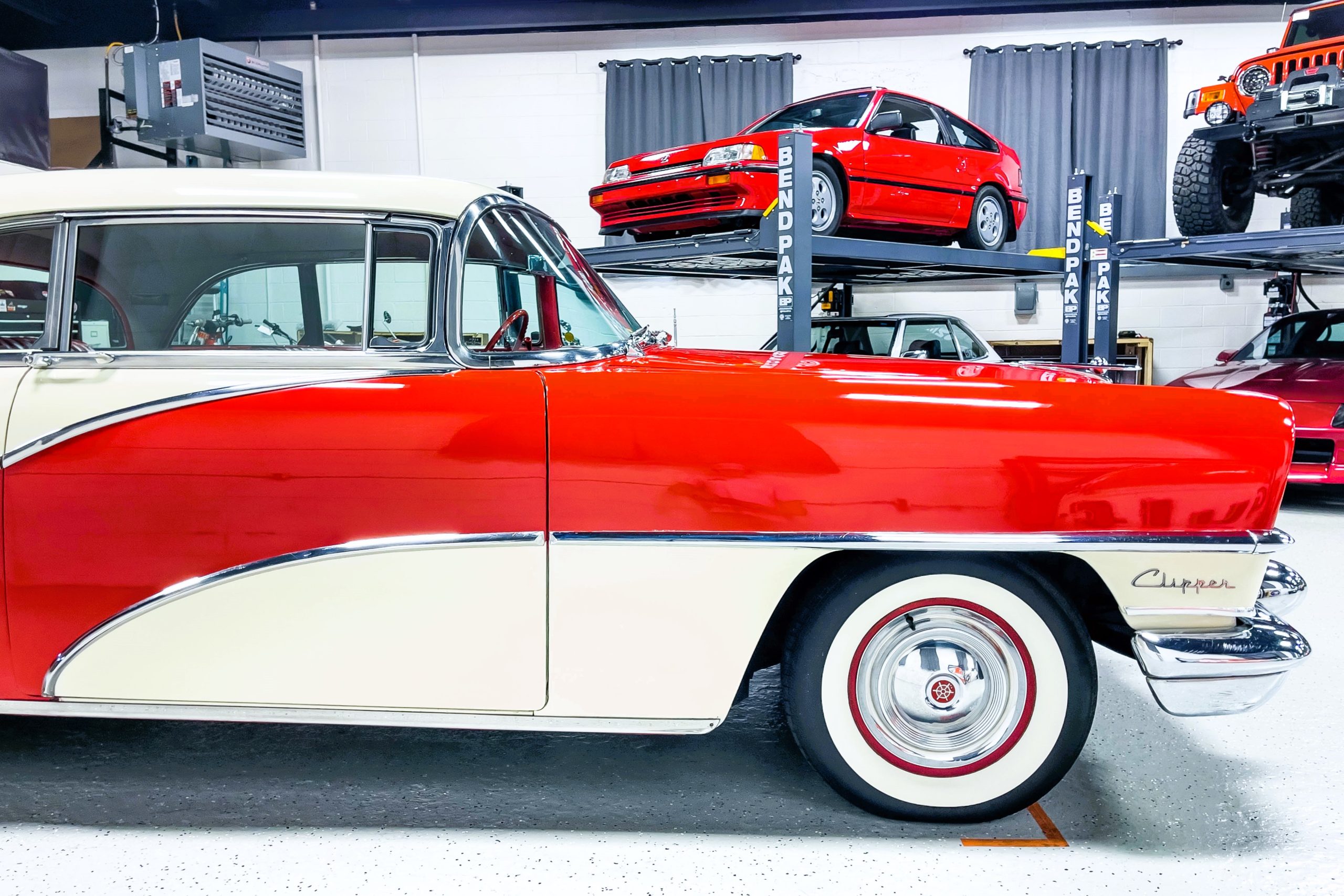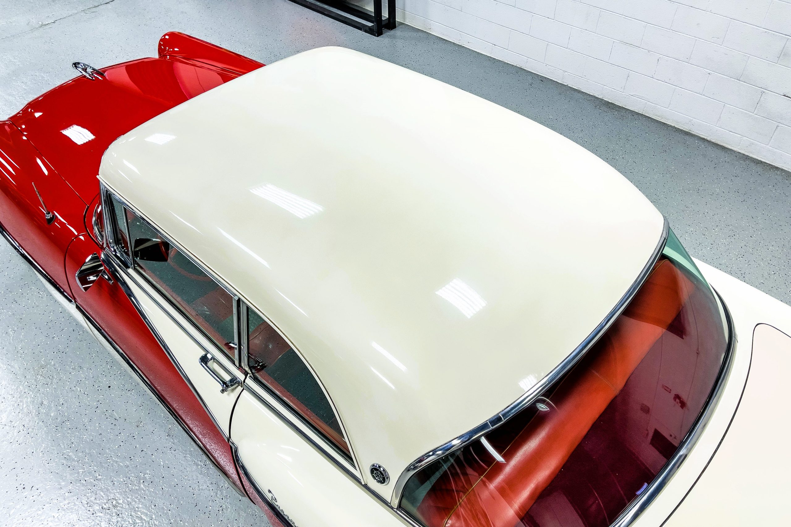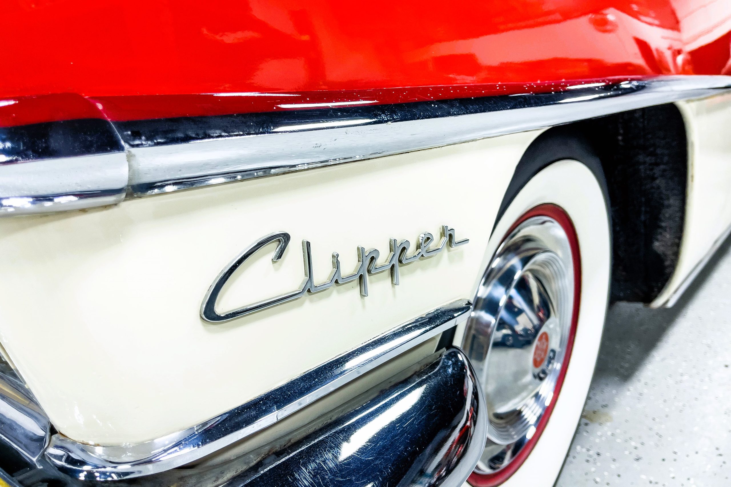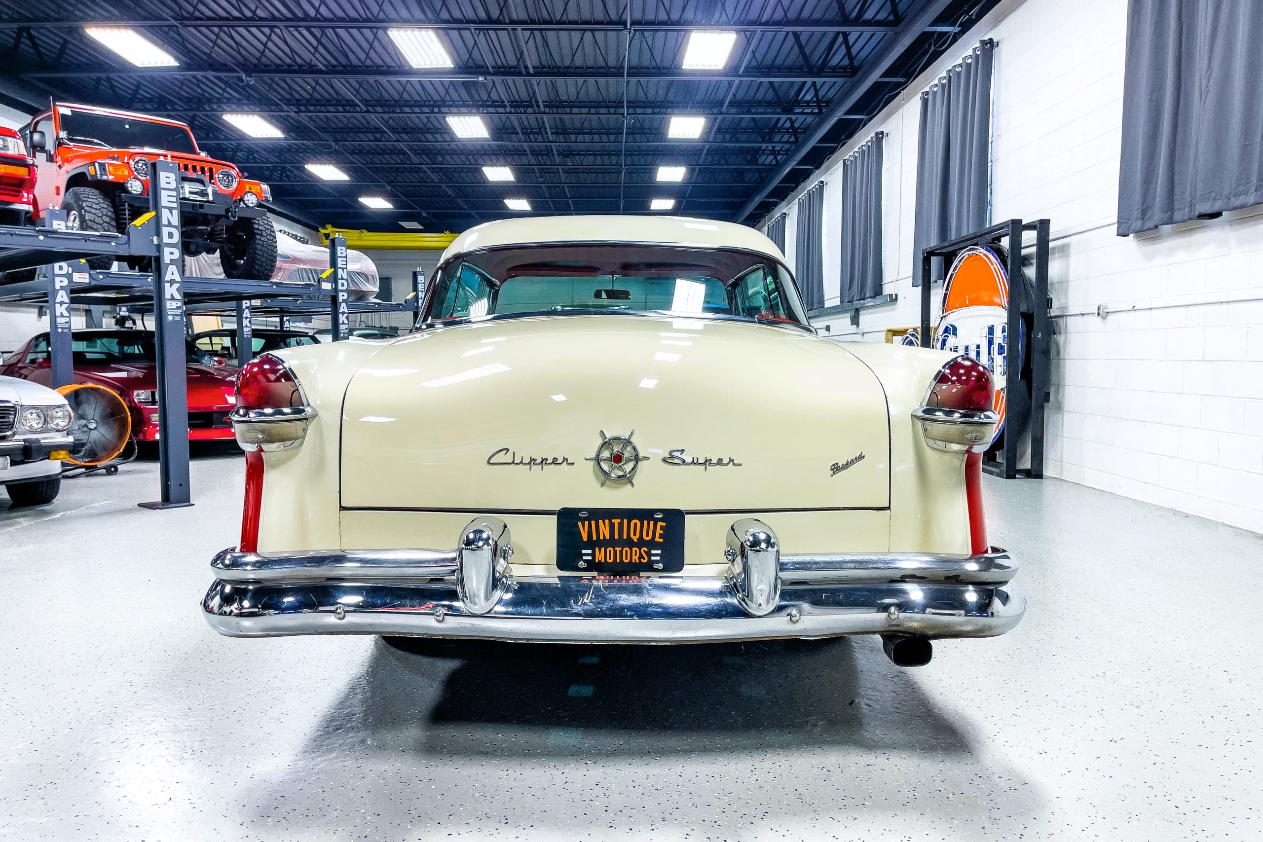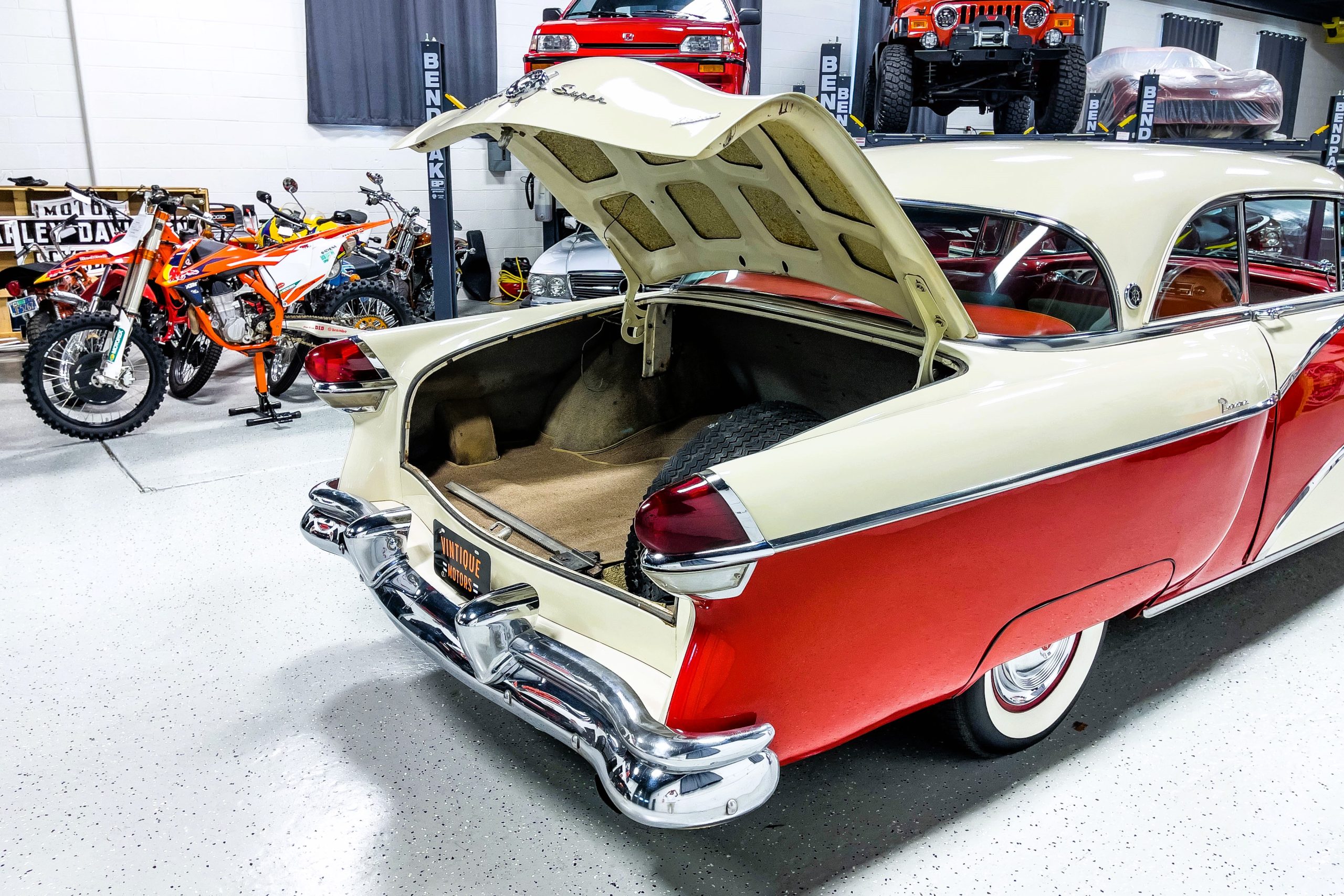 This 1955 Packard Clipper Super Panama, which was only offered as a 2-door hardtop coupe, is finished in two-tone Fire Opal and White Jade over a red interior. The Super Panama trim was the most expensive trim offered on the Clipper model with a retail cost of $3,100. Packard significantly altered the Clipper line in 1955 with a new design, new powertrain, and a new chassis. The car’s front was radically different, with a mesh grille, revised bumper, and a wraparound windshield. Mechanically, a 12-volt electrical system was adopted, a new torsion bar suspension was installed, the Ultramatic transmission was enhanced, and a V8 replaced the straight-eight engines.