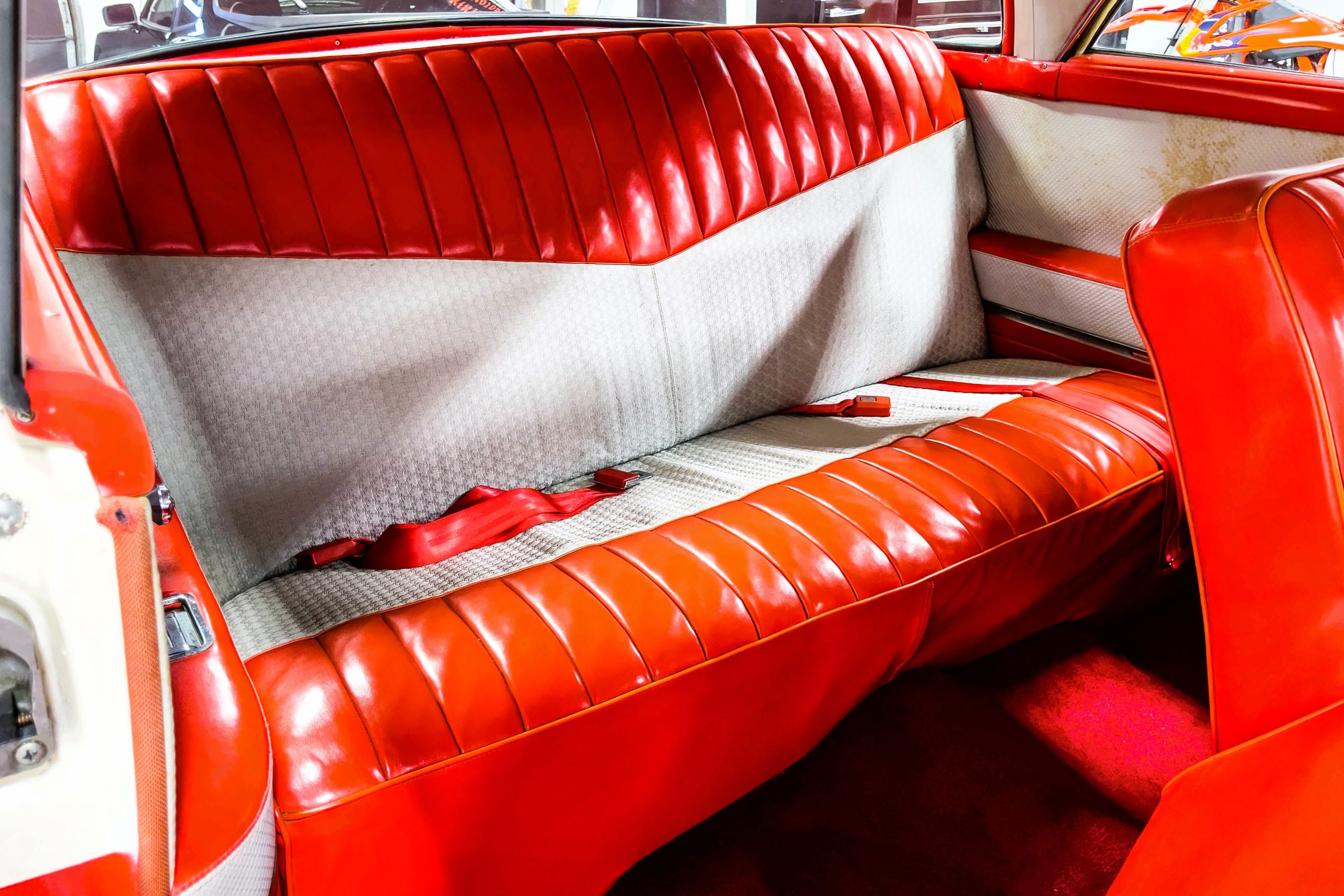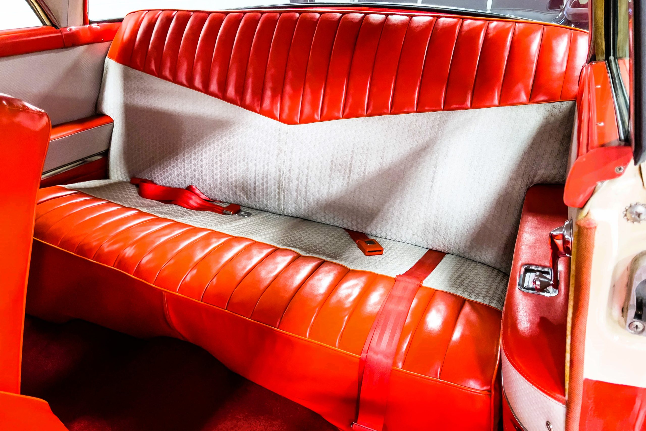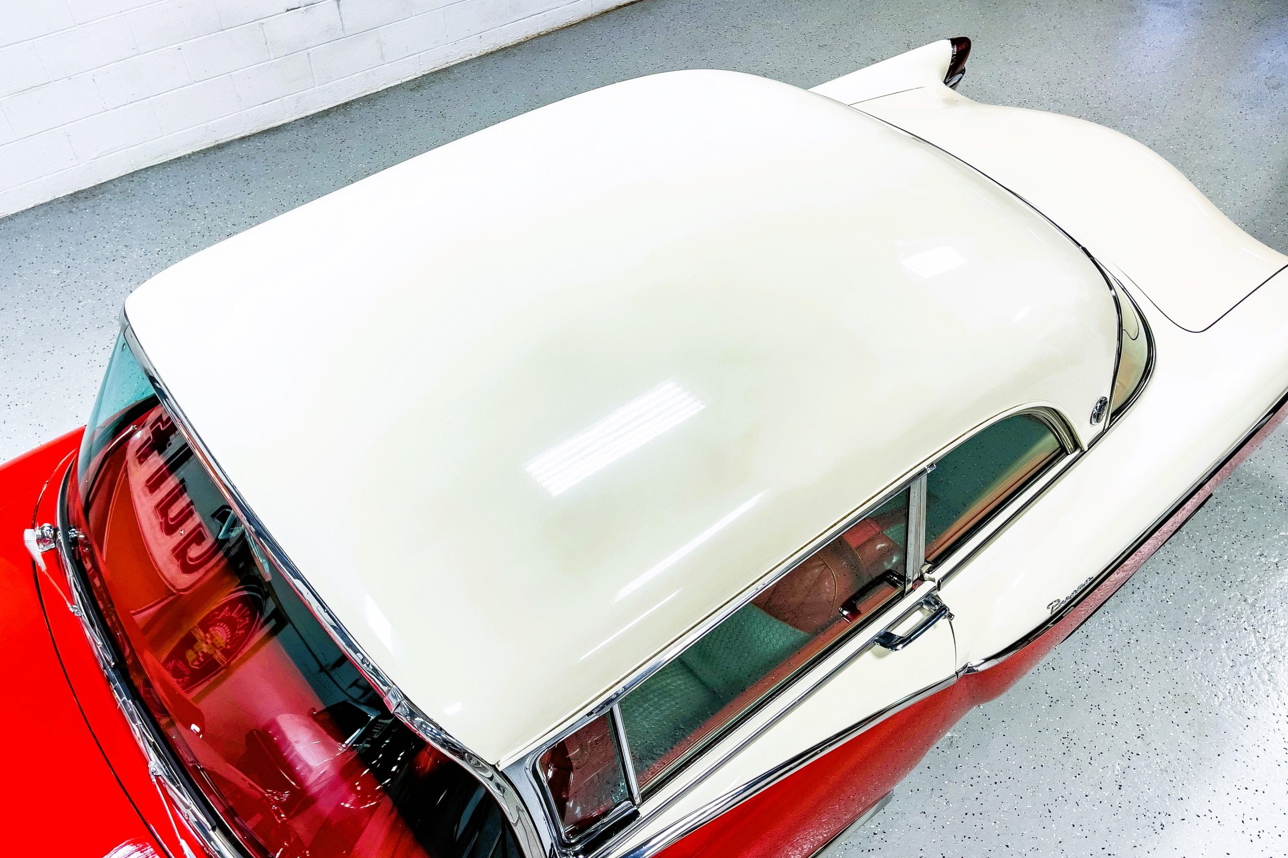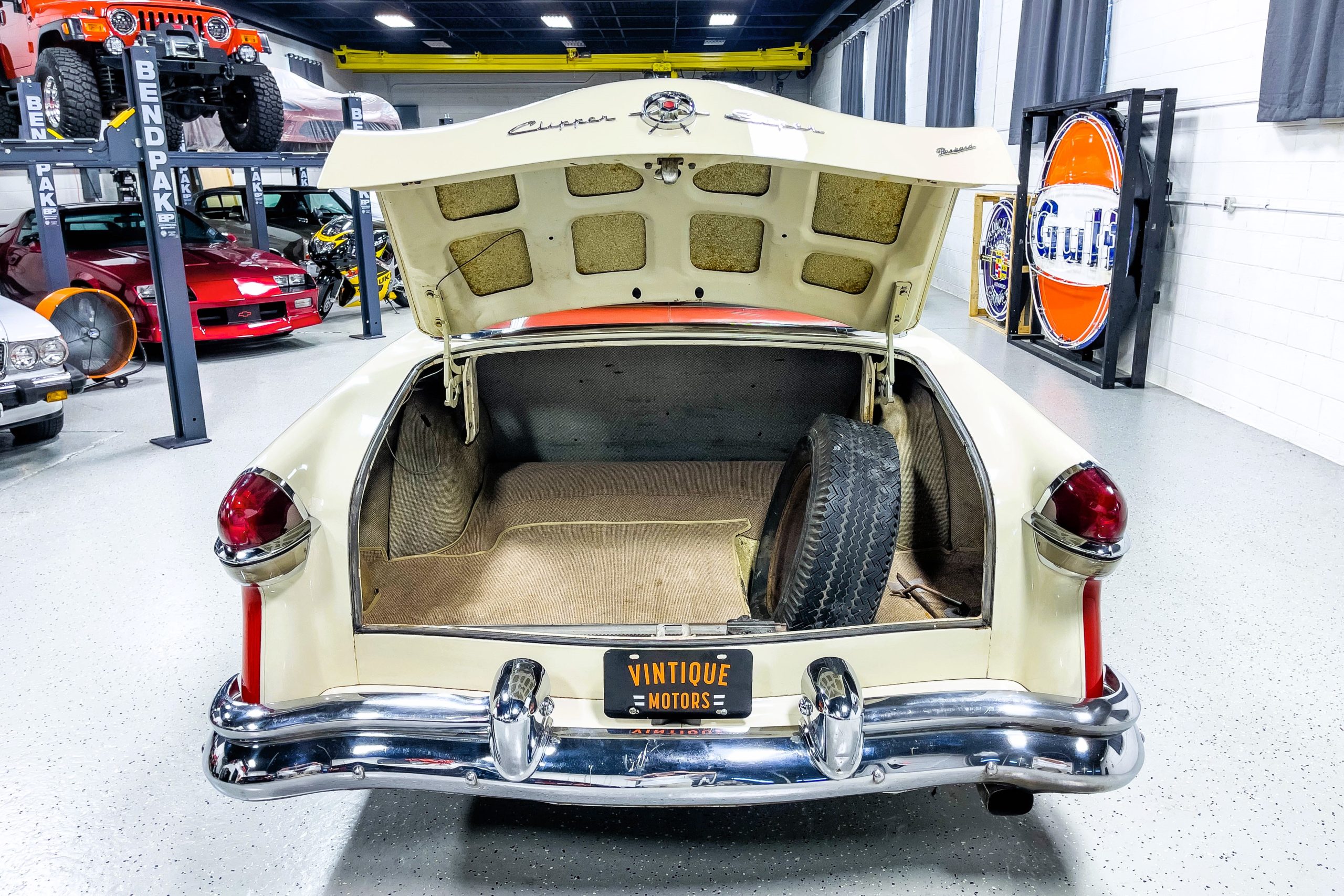 This 1955 Packard Clipper Super Panama, which was only offered as a 2-door hardtop coupe, is finished in two-tone Fire Opal and White Jade over a red interior. The Super Panama trim was the most expensive trim offered on the Clipper model with a retail cost of $3,100. Packard significantly altered the Clipper line in 1955 with a new design, new powertrain, and a new chassis. The car’s front was radically different, with a mesh grille, revised bumper, and a wraparound windshield. Mechanically, a 12-volt electrical system was adopted, a new torsion bar suspension was installed, the Ultramatic transmission was enhanced, and a V8 replaced the straight-eight engines.