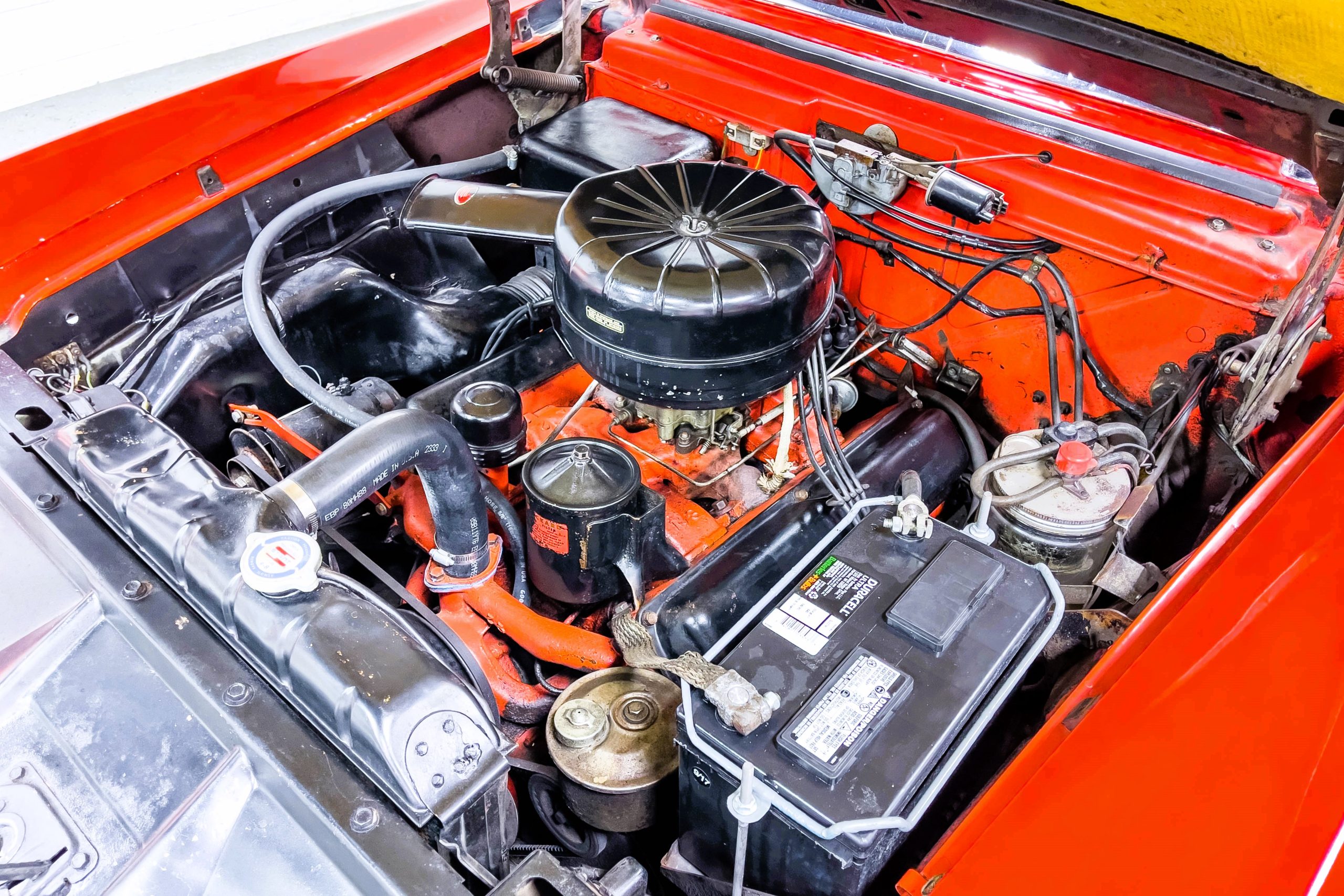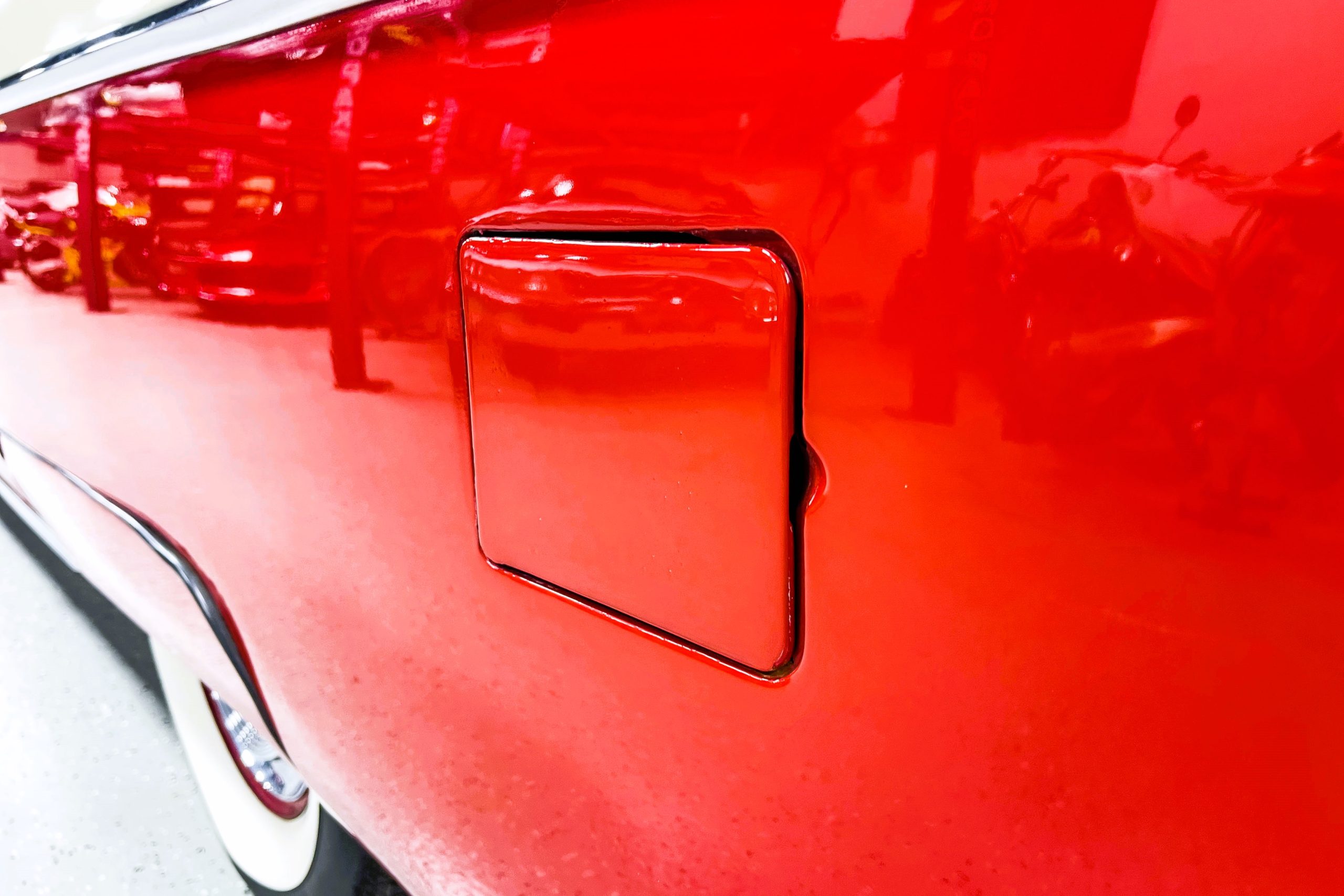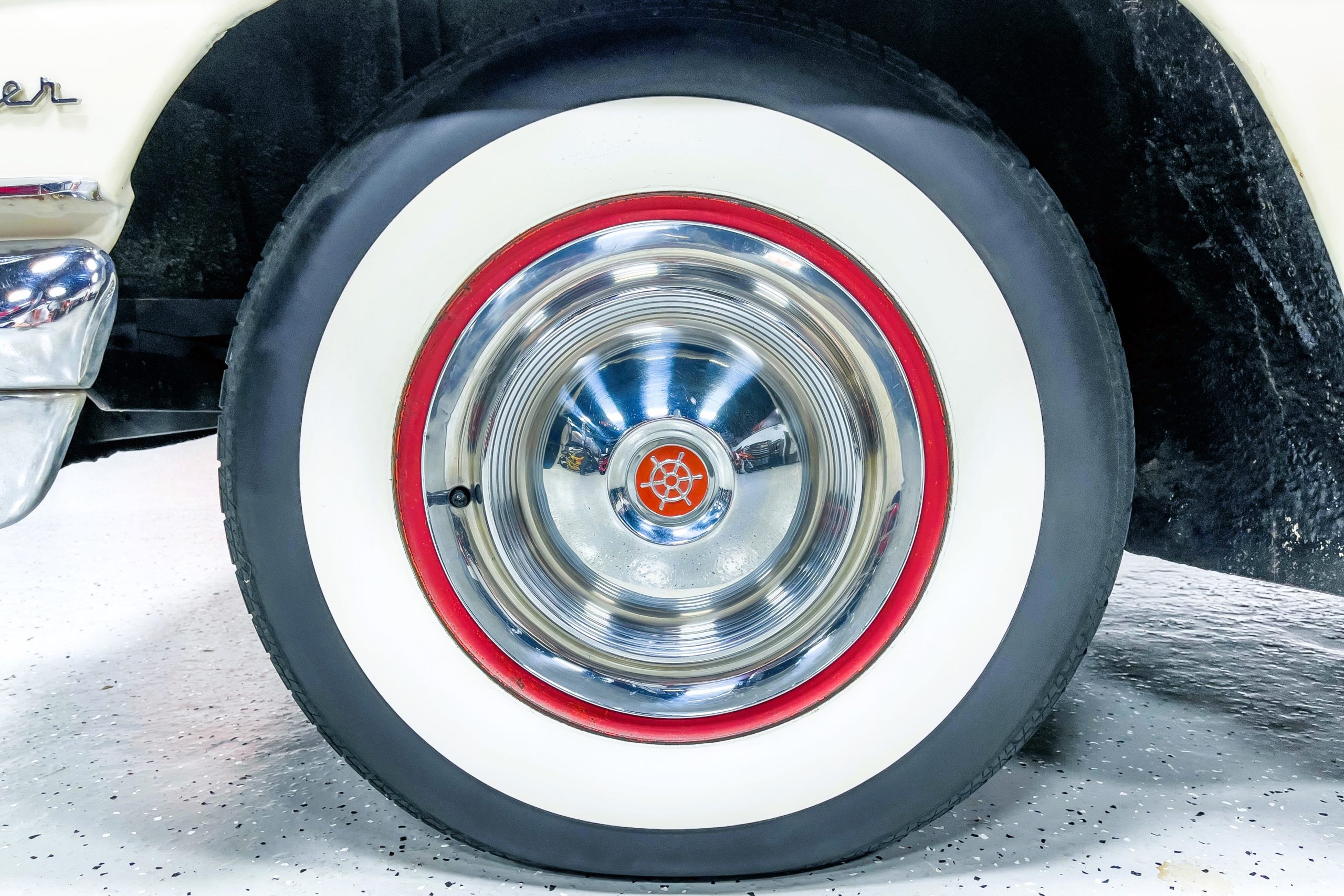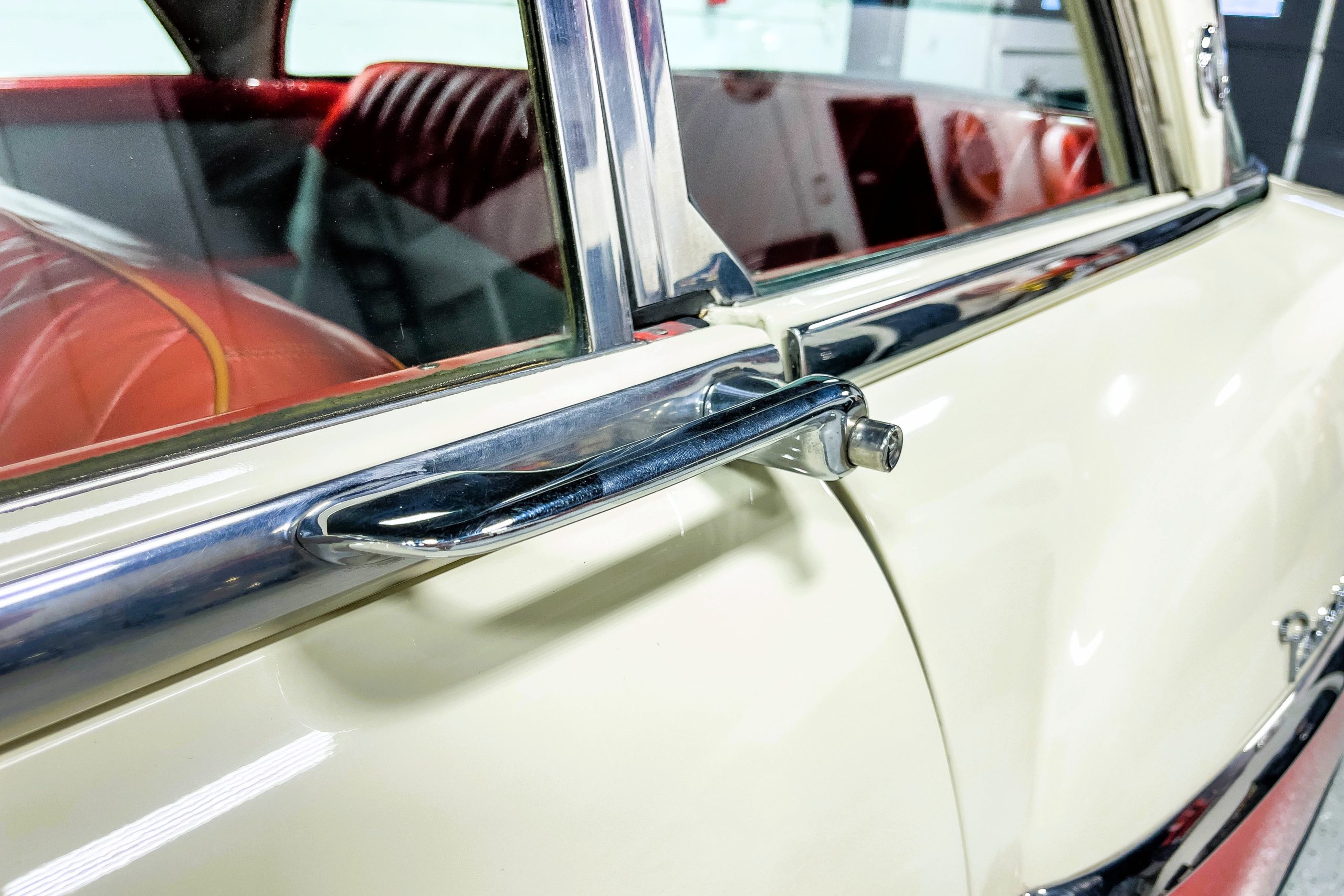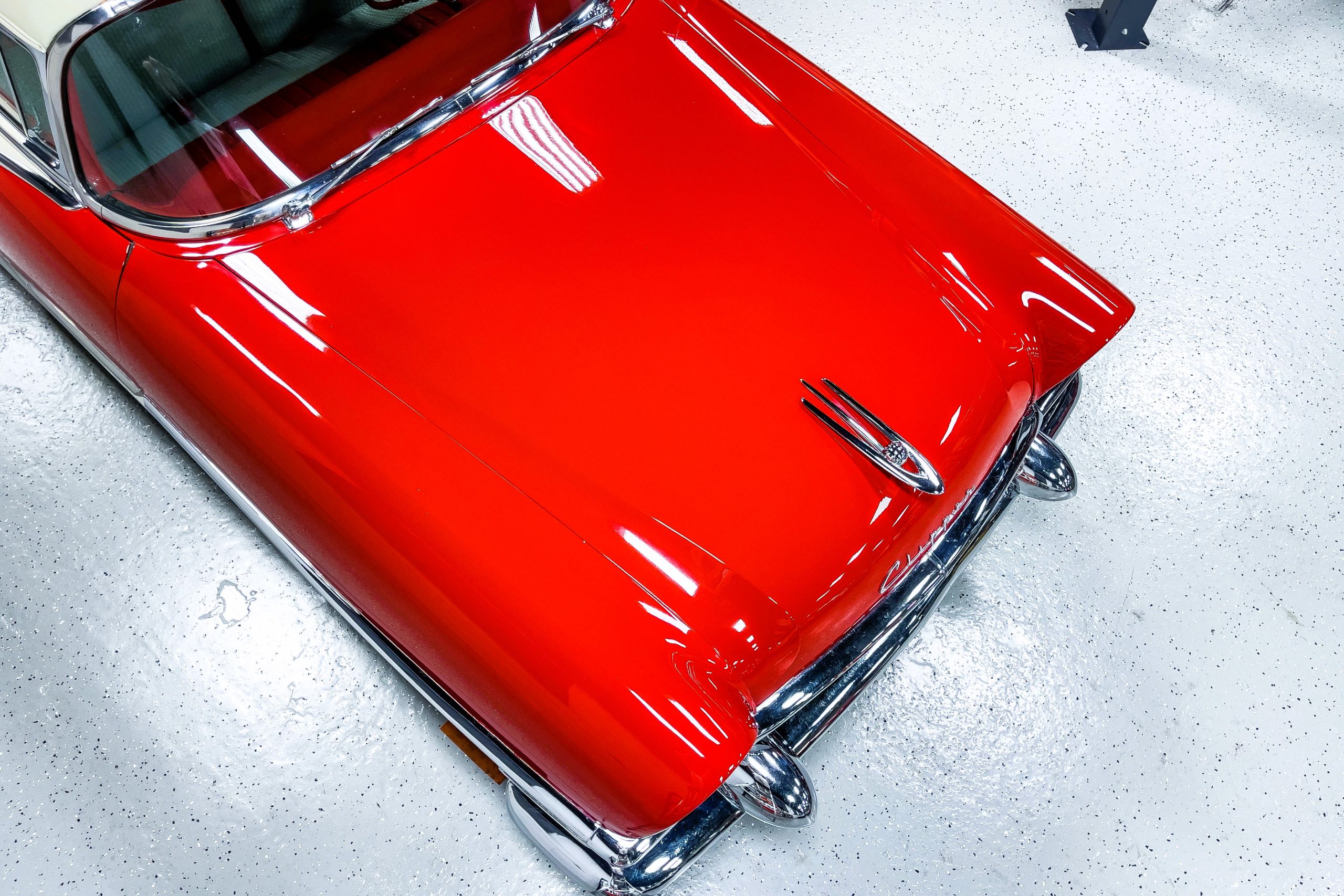 This 1955 Packard Clipper Super Panama, which was only offered as a 2-door hardtop coupe, is finished in two-tone Fire Opal and White Jade over a red interior. The Super Panama trim was the most expensive trim offered on the Clipper model with a retail cost of $3,100. Packard significantly altered the Clipper line in 1955 with a new design, new powertrain, and a new chassis. The car’s front was radically different, with a mesh grille, revised bumper, and a wraparound windshield. Mechanically, a 12-volt electrical system was adopted, a new torsion bar suspension was installed, the Ultramatic transmission was enhanced, and a V8 replaced the straight-eight engines.