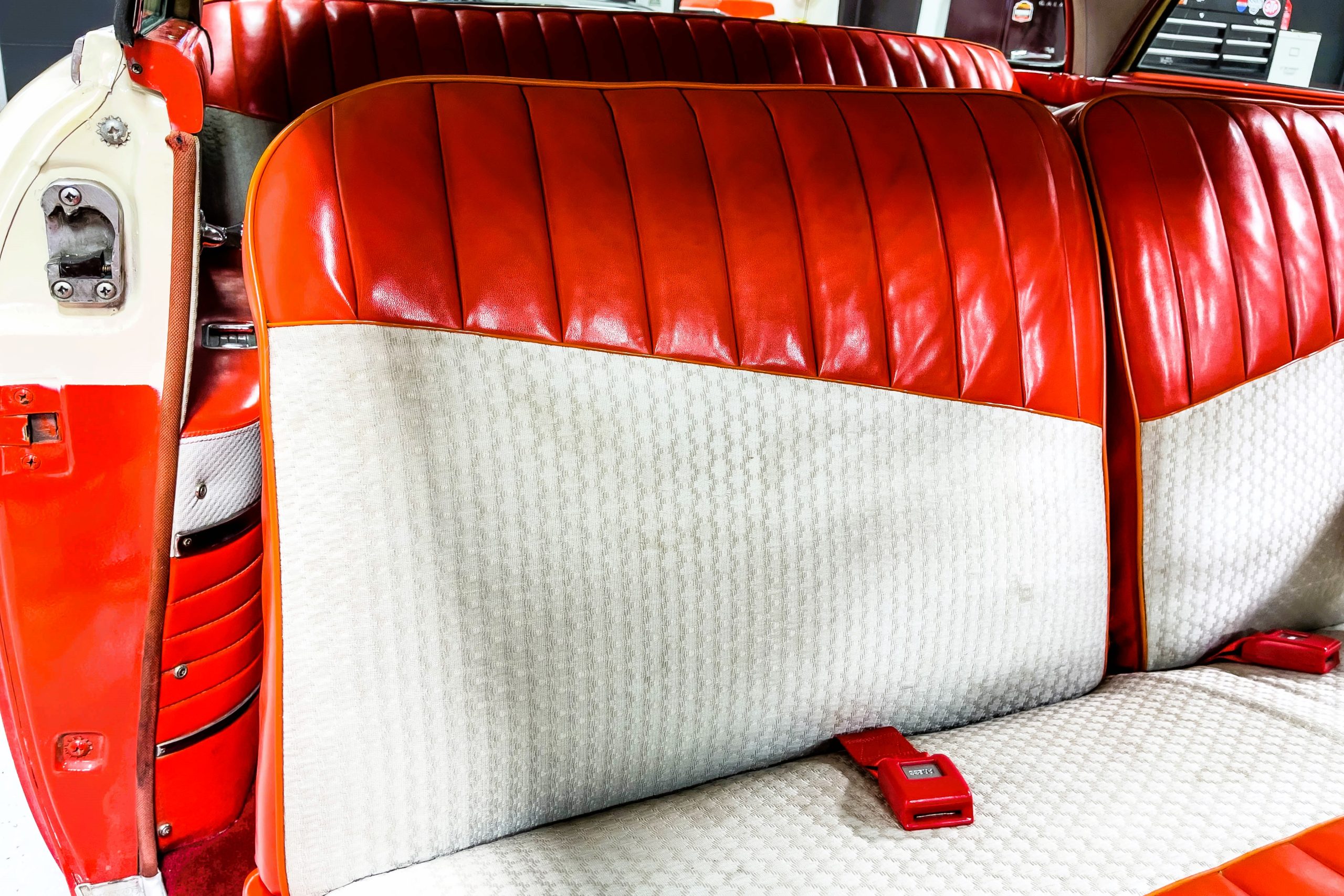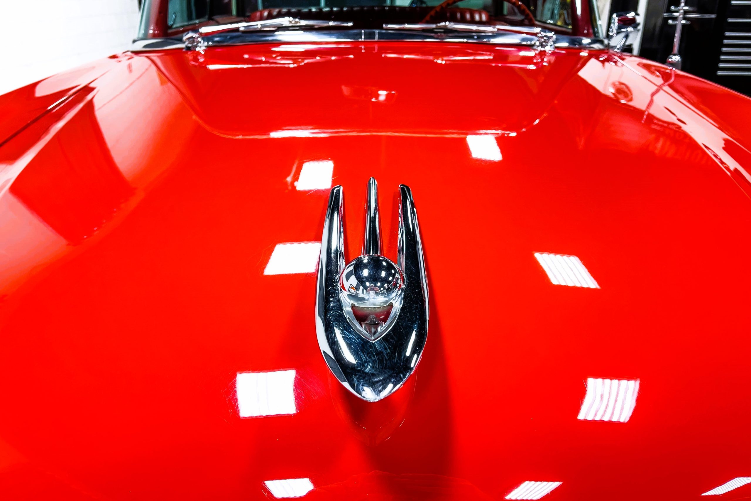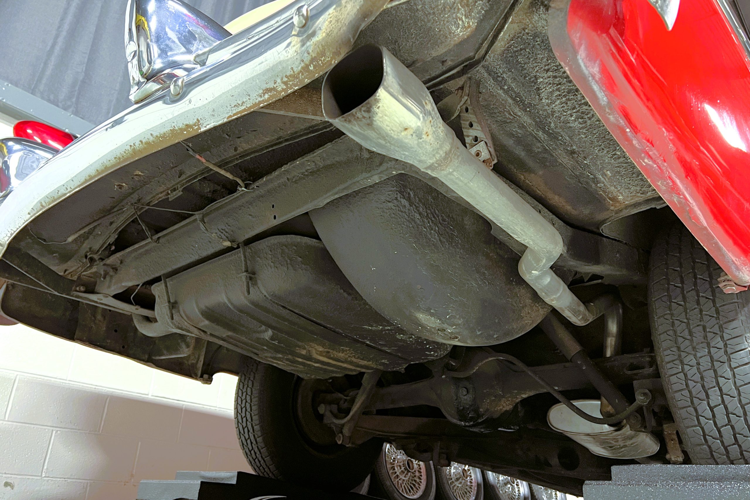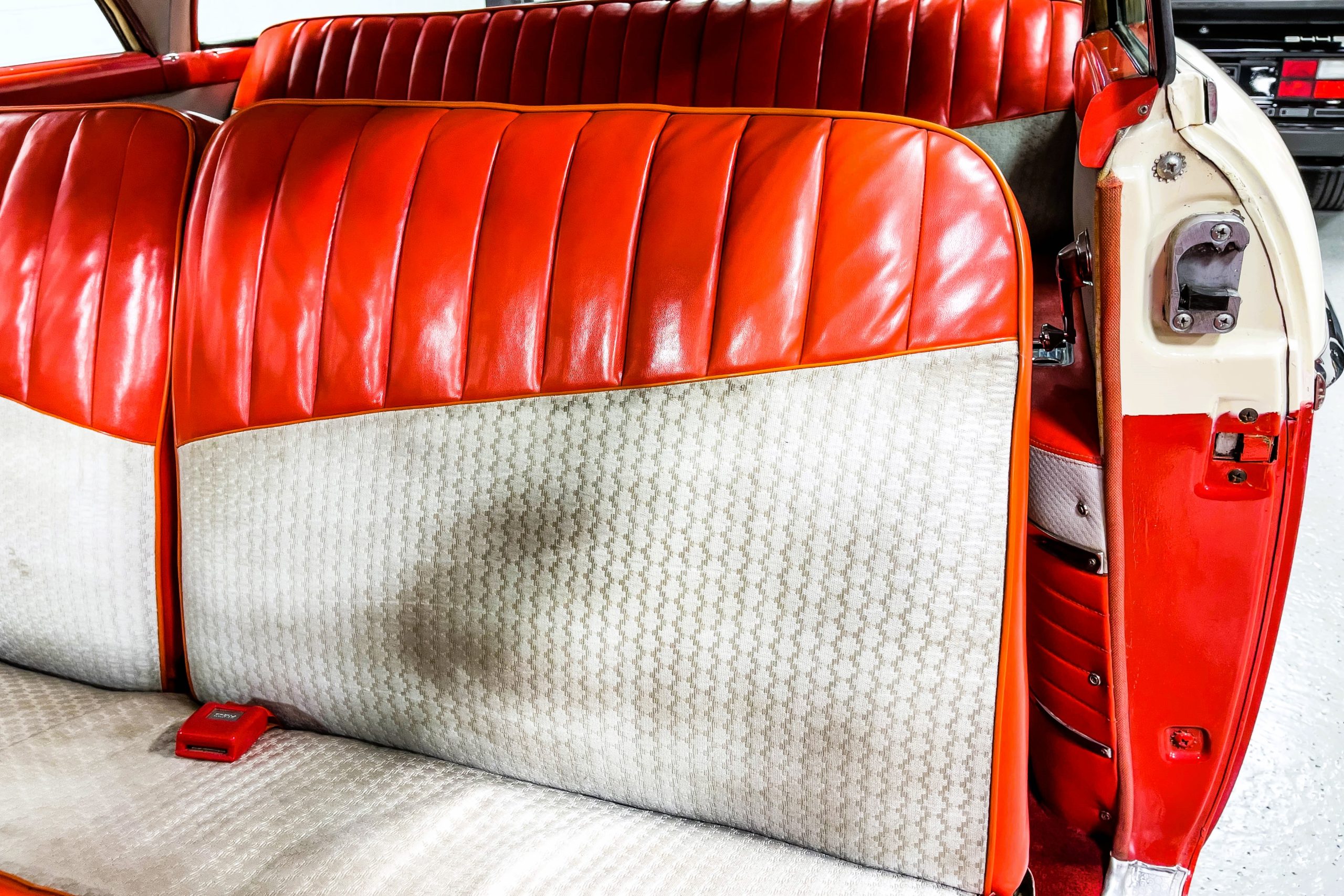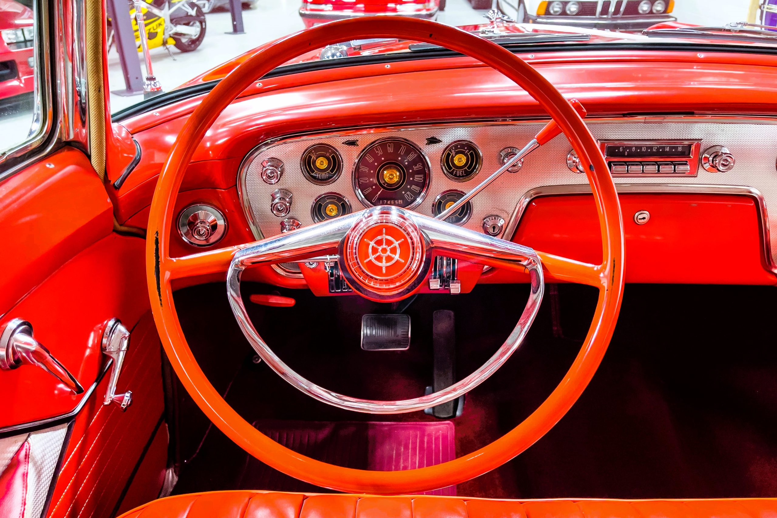This 1955 Packard Clipper Super Panama, which was only offered as a 2-door hardtop coupe, is finished in two-tone Fire Opal and White Jade over a red interior. The Super Panama trim was the most expensive trim offered on the Clipper model with a retail cost of $3,100. Packard significantly altered the Clipper line in 1955 with a new design, new powertrain, and a new chassis. The car’s front was radically different, with a mesh grille, revised bumper, and a wraparound windshield. Mechanically, a 12-volt electrical system was adopted, a new torsion bar suspension was installed, the Ultramatic transmission was enhanced, and a V8 replaced the straight-eight engines.