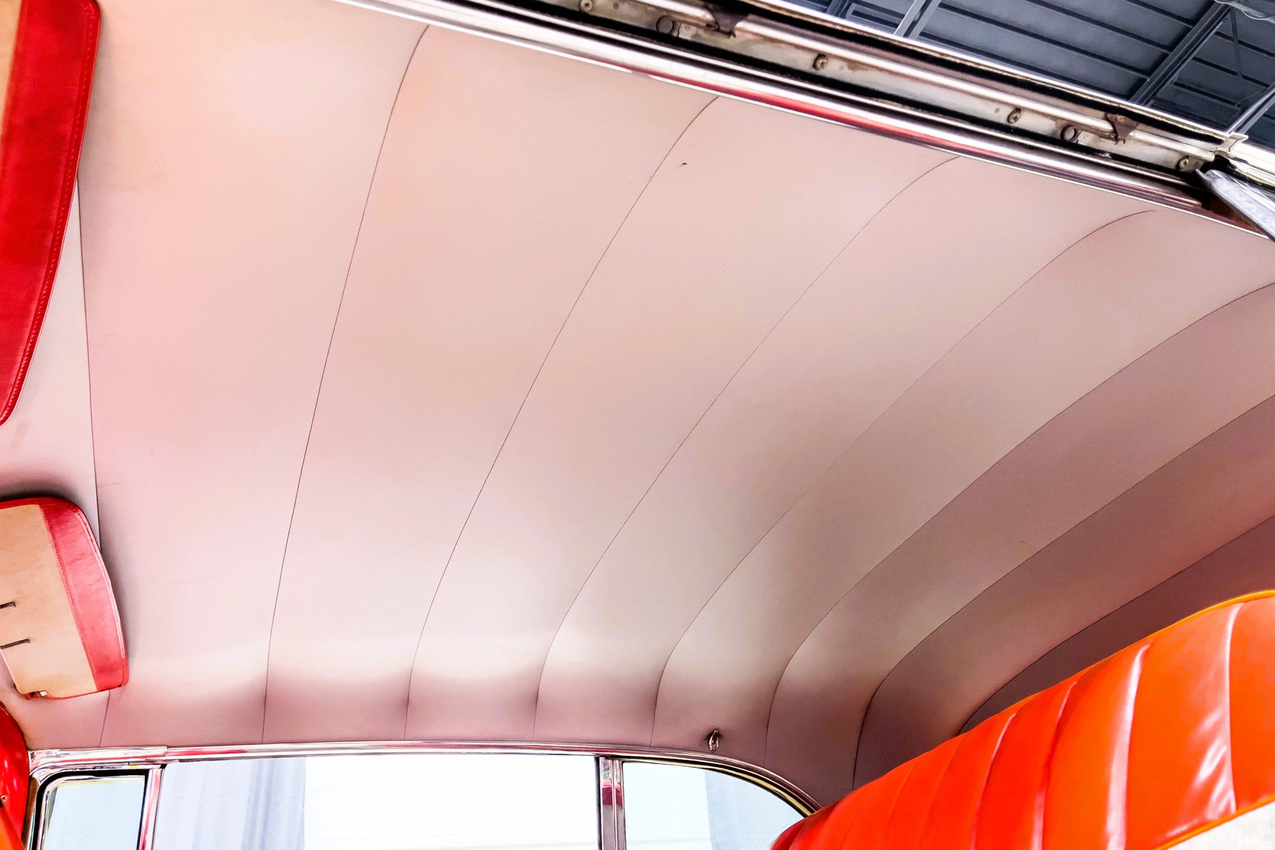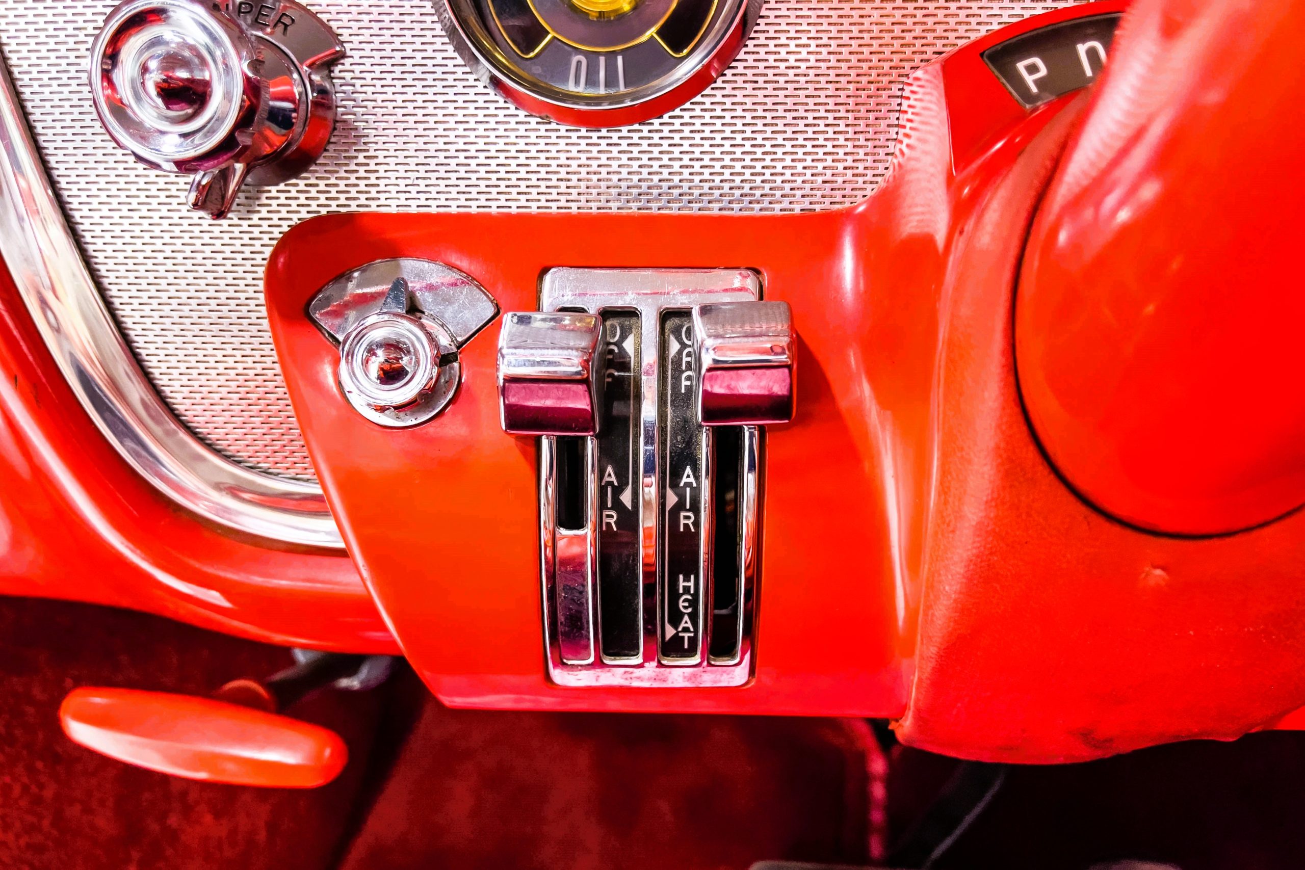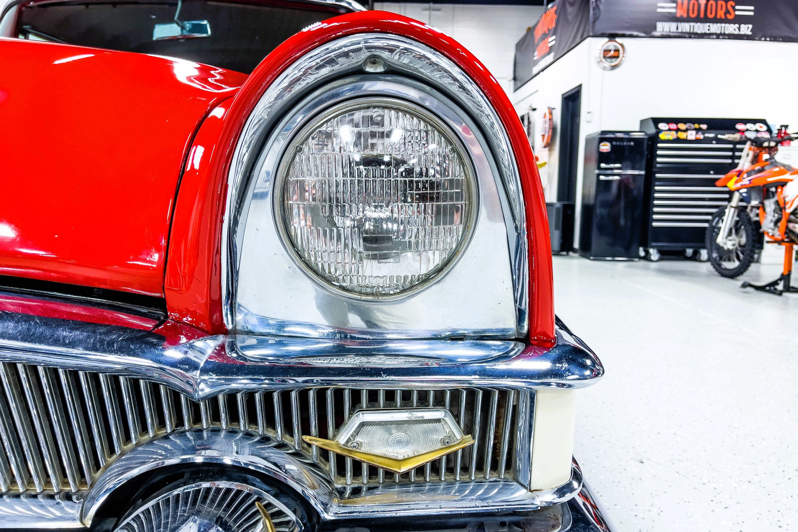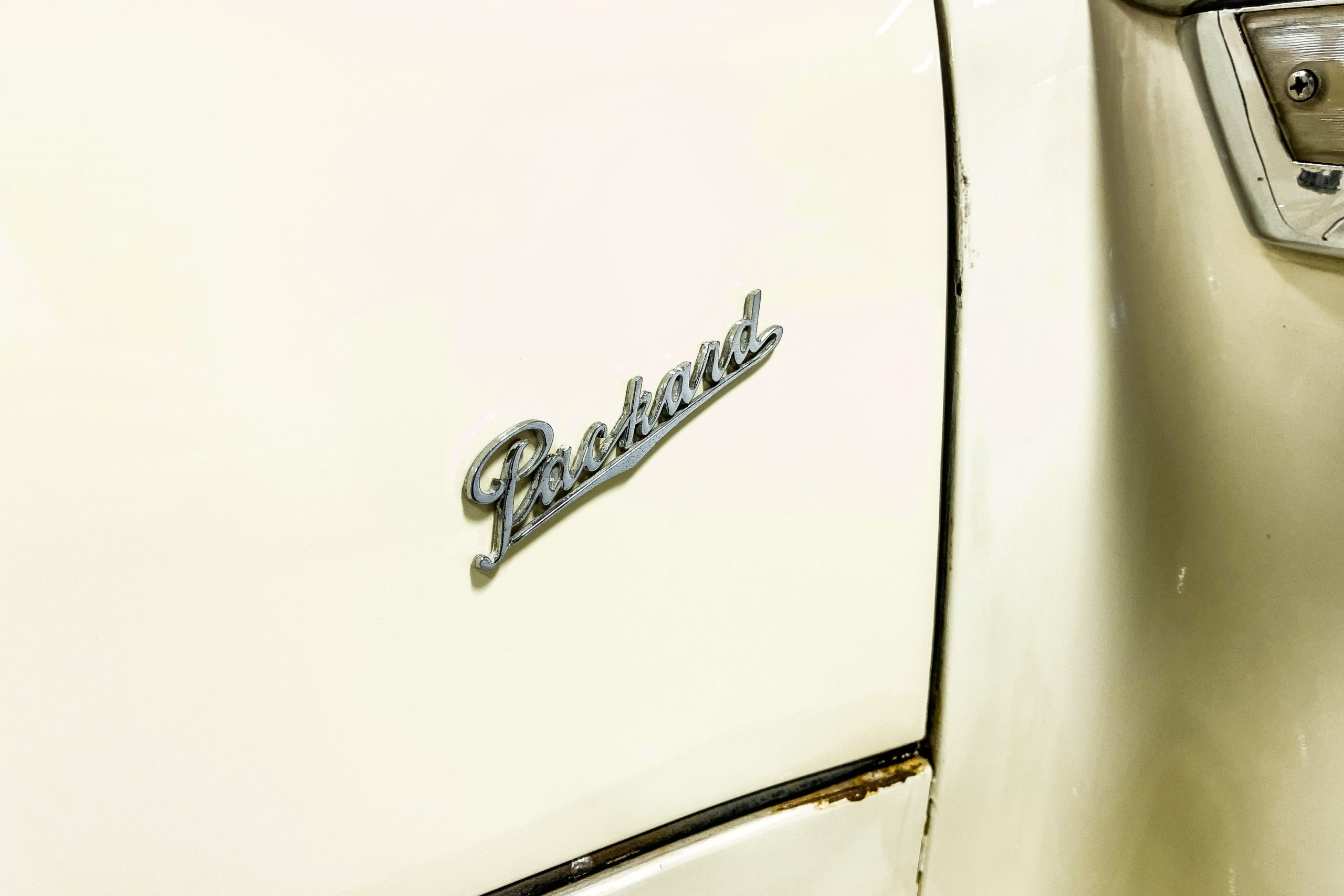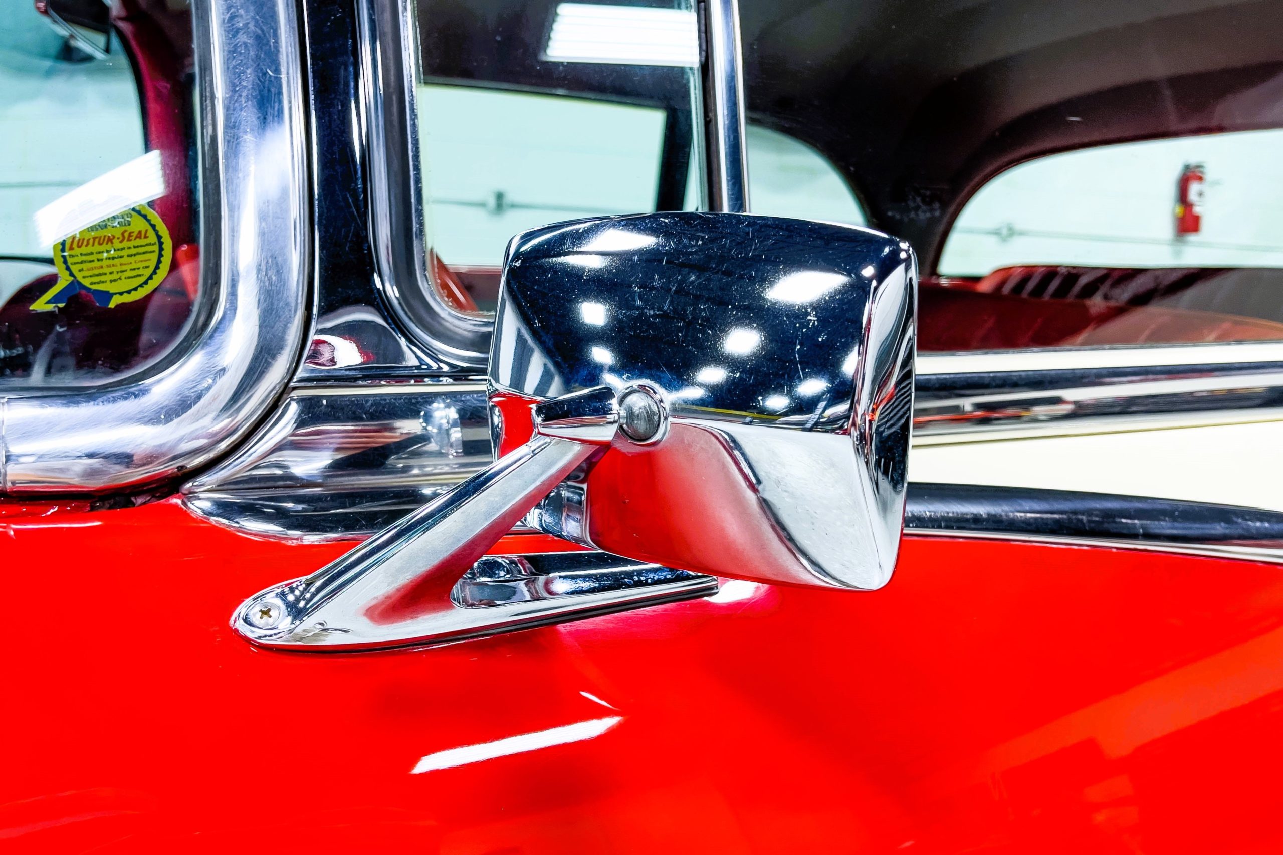 This 1955 Packard Clipper Super Panama, which was only offered as a 2-door hardtop coupe, is finished in two-tone Fire Opal and White Jade over a red interior. The Super Panama trim was the most expensive trim offered on the Clipper model with a retail cost of $3,100. Packard significantly altered the Clipper line in 1955 with a new design, new powertrain, and a new chassis. The car’s front was radically different, with a mesh grille, revised bumper, and a wraparound windshield. Mechanically, a 12-volt electrical system was adopted, a new torsion bar suspension was installed, the Ultramatic transmission was enhanced, and a V8 replaced the straight-eight engines.