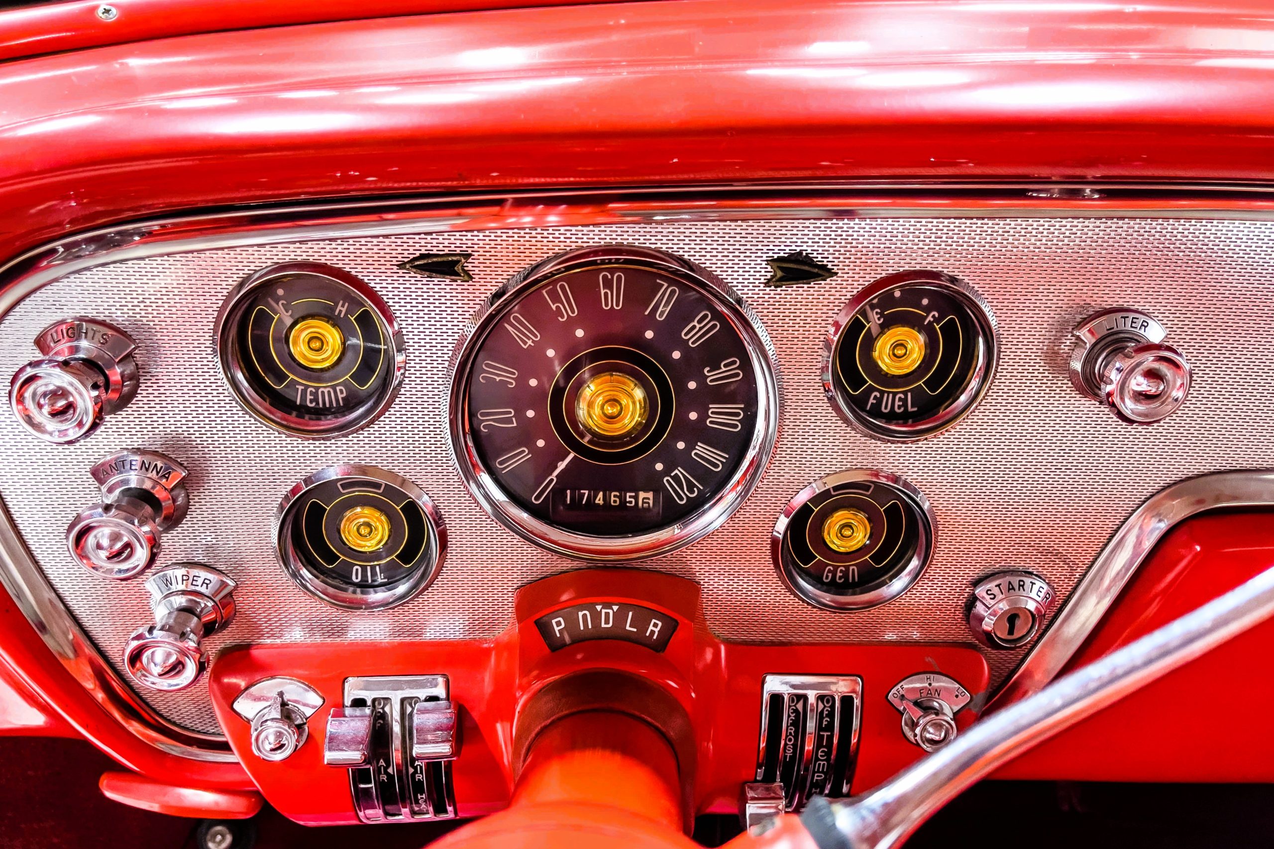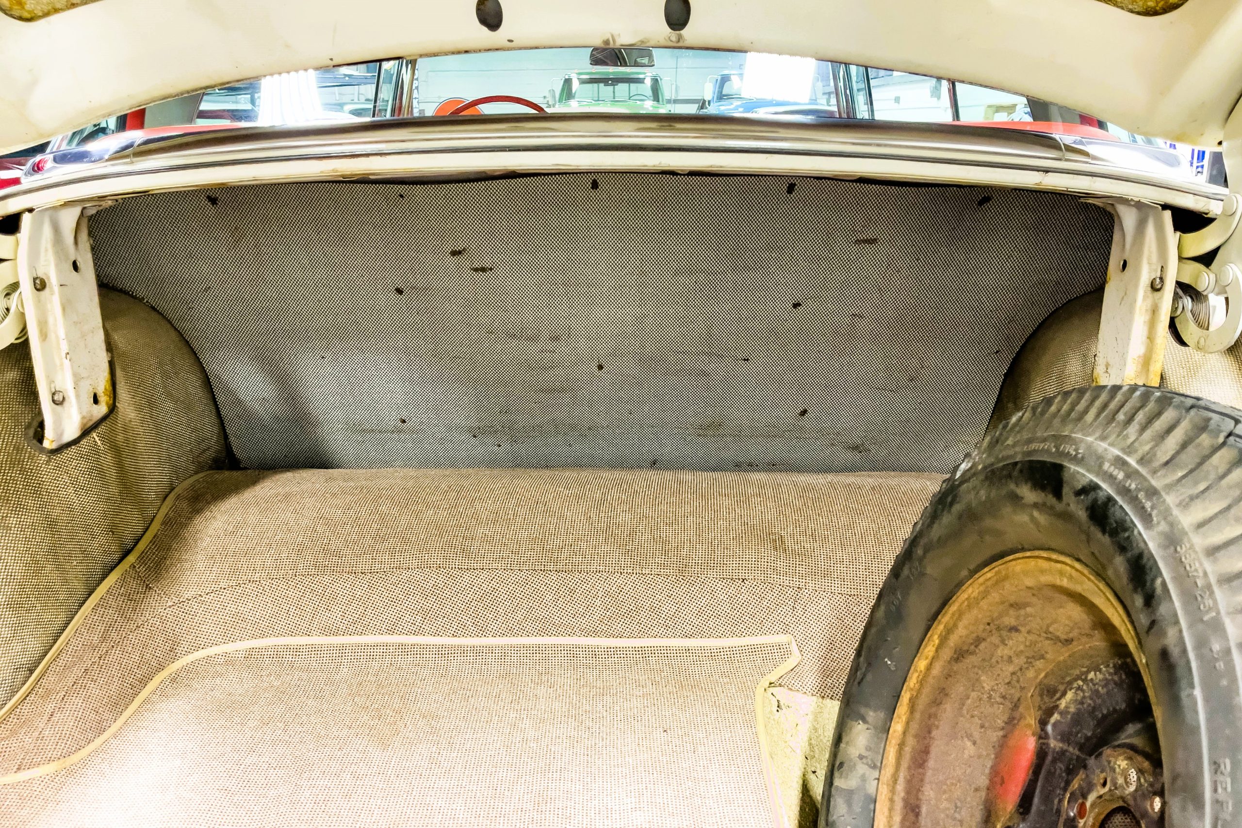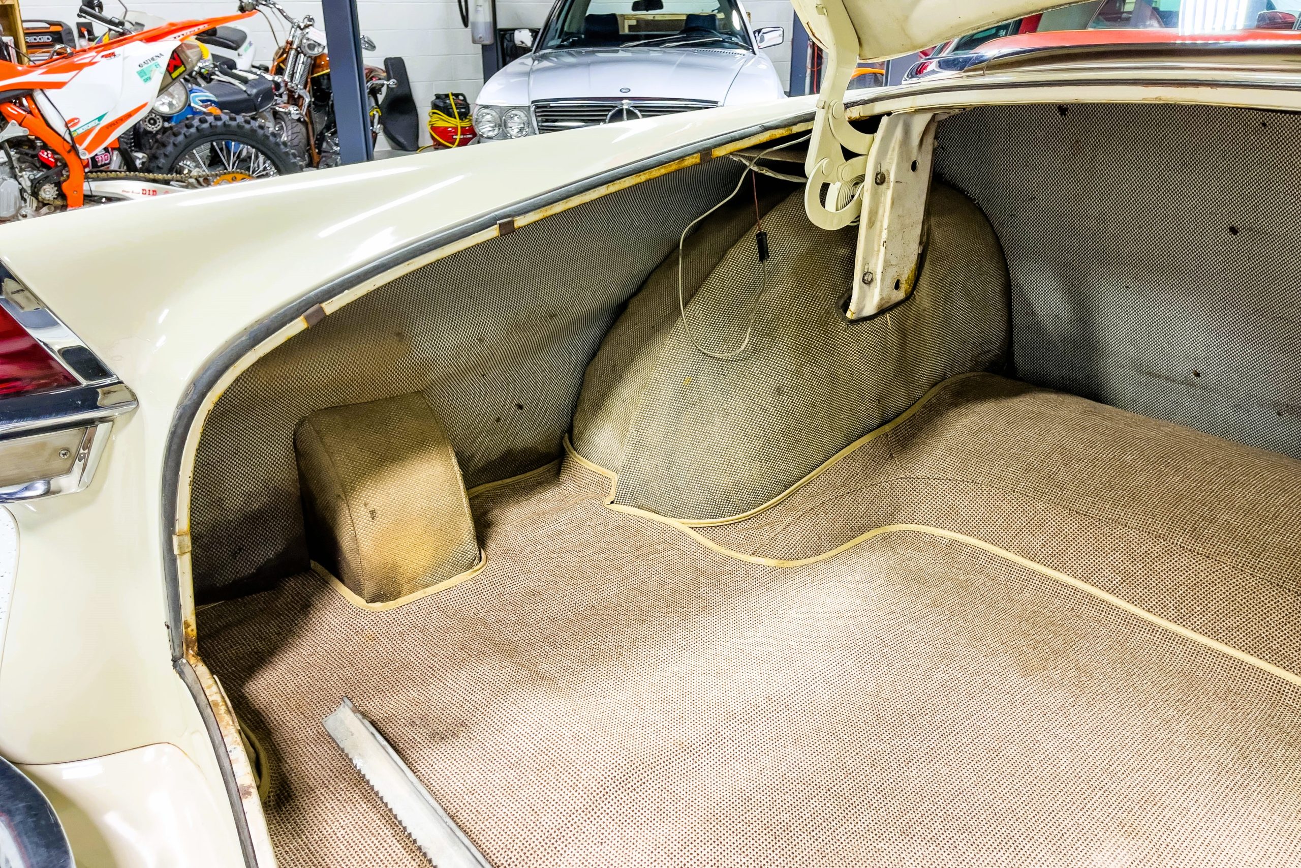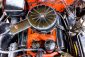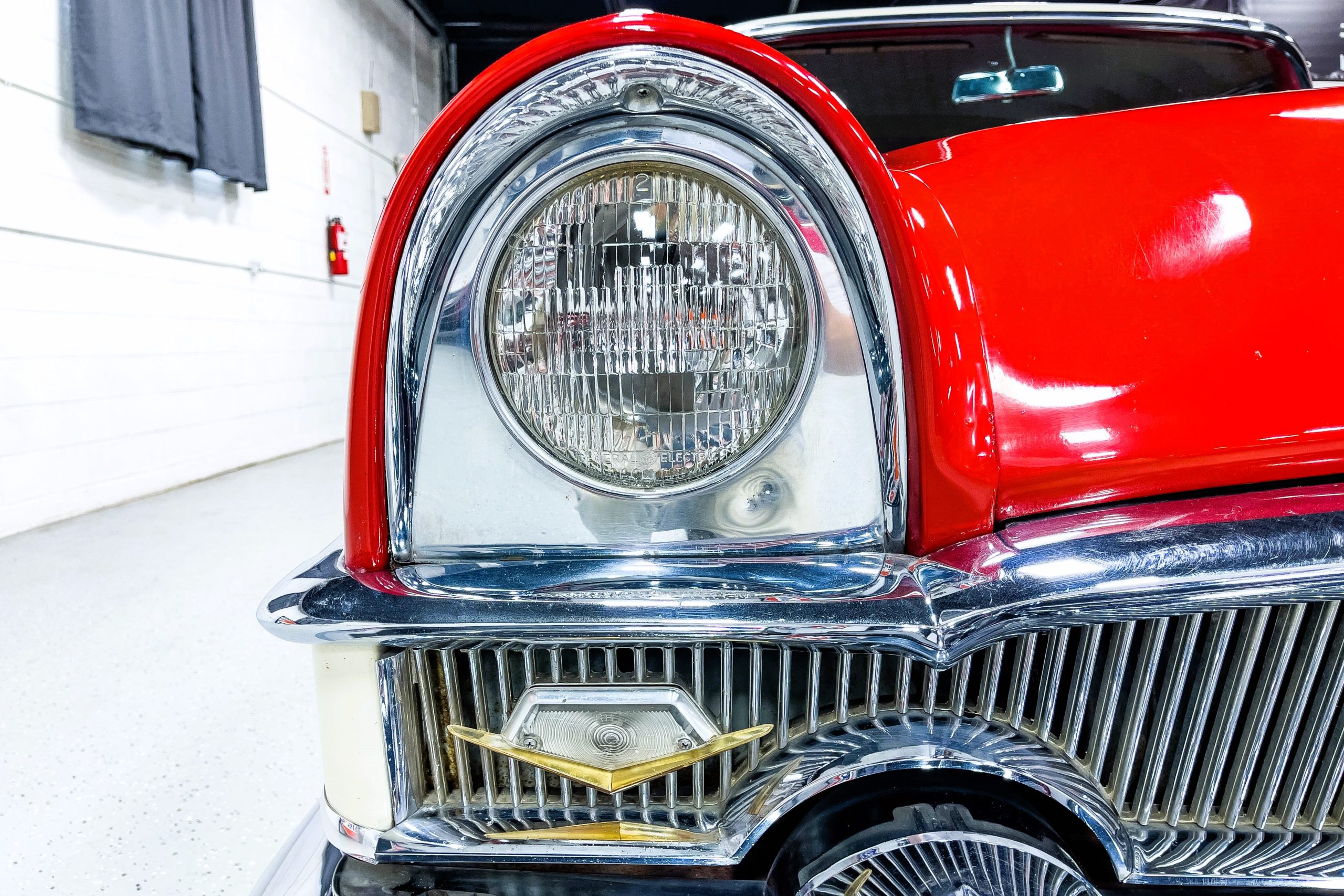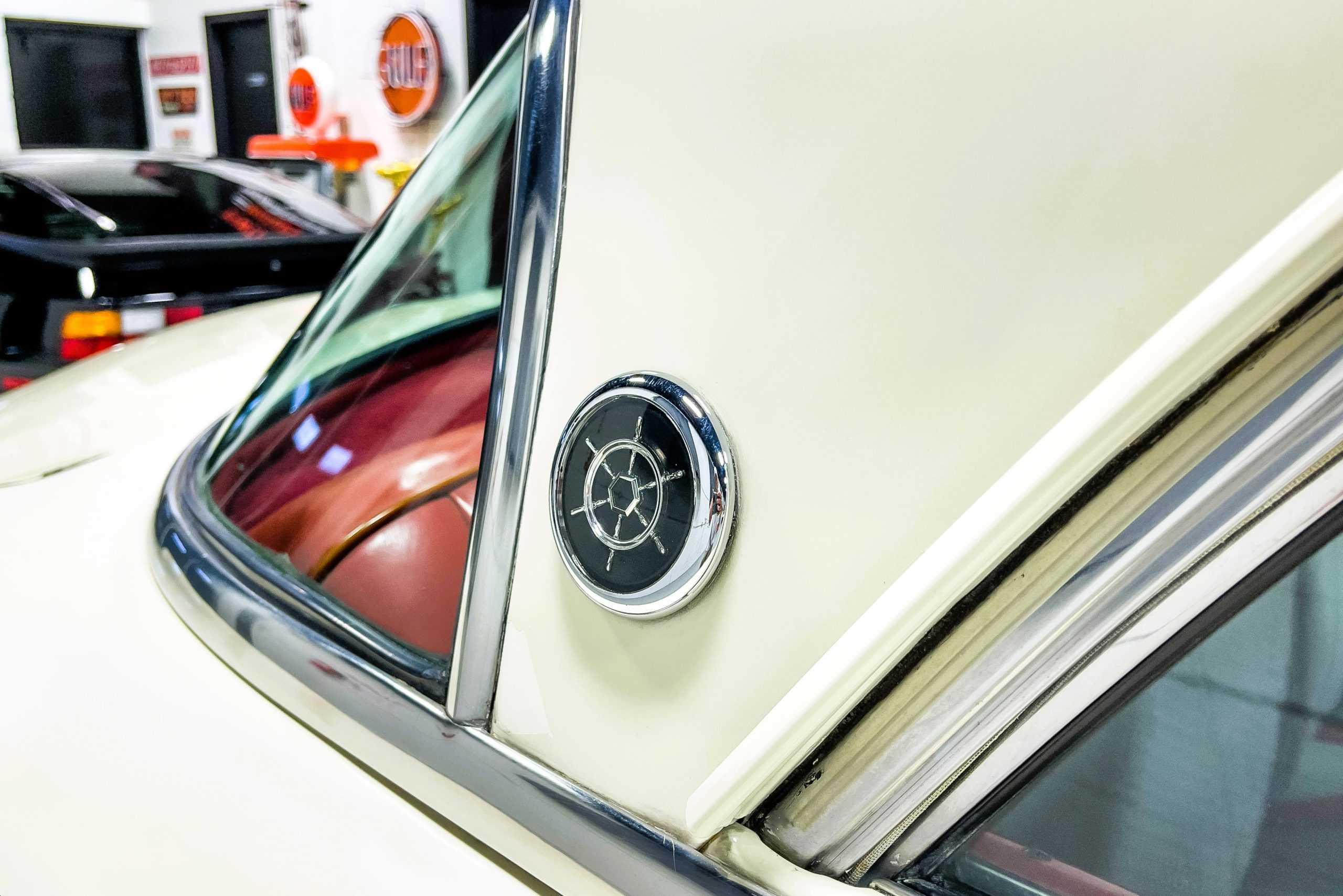This 1955 Packard Clipper Super Panama, which was only offered as a 2-door hardtop coupe, is finished in two-tone Fire Opal and White Jade over a red interior. The Super Panama trim was the most expensive trim offered on the Clipper model with a retail cost of $3,100. Packard significantly altered the Clipper line in 1955 with a new design, new powertrain, and a new chassis. The car’s front was radically different, with a mesh grille, revised bumper, and a wraparound windshield. Mechanically, a 12-volt electrical system was adopted, a new torsion bar suspension was installed, the Ultramatic transmission was enhanced, and a V8 replaced the straight-eight engines.