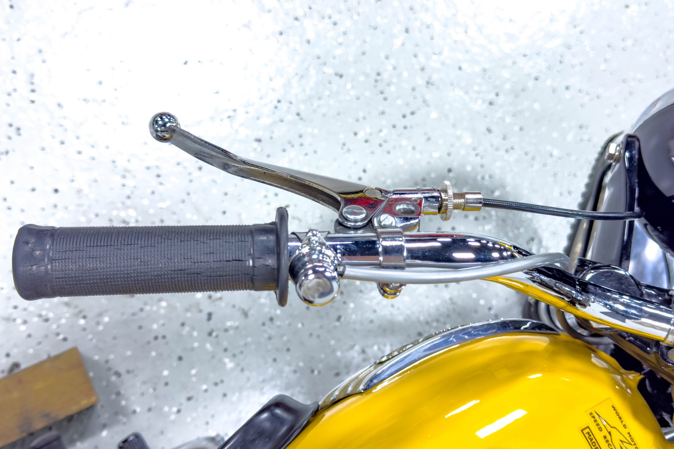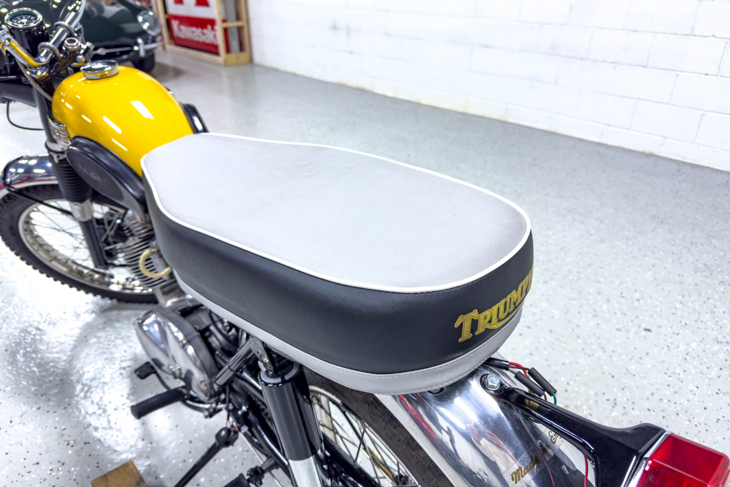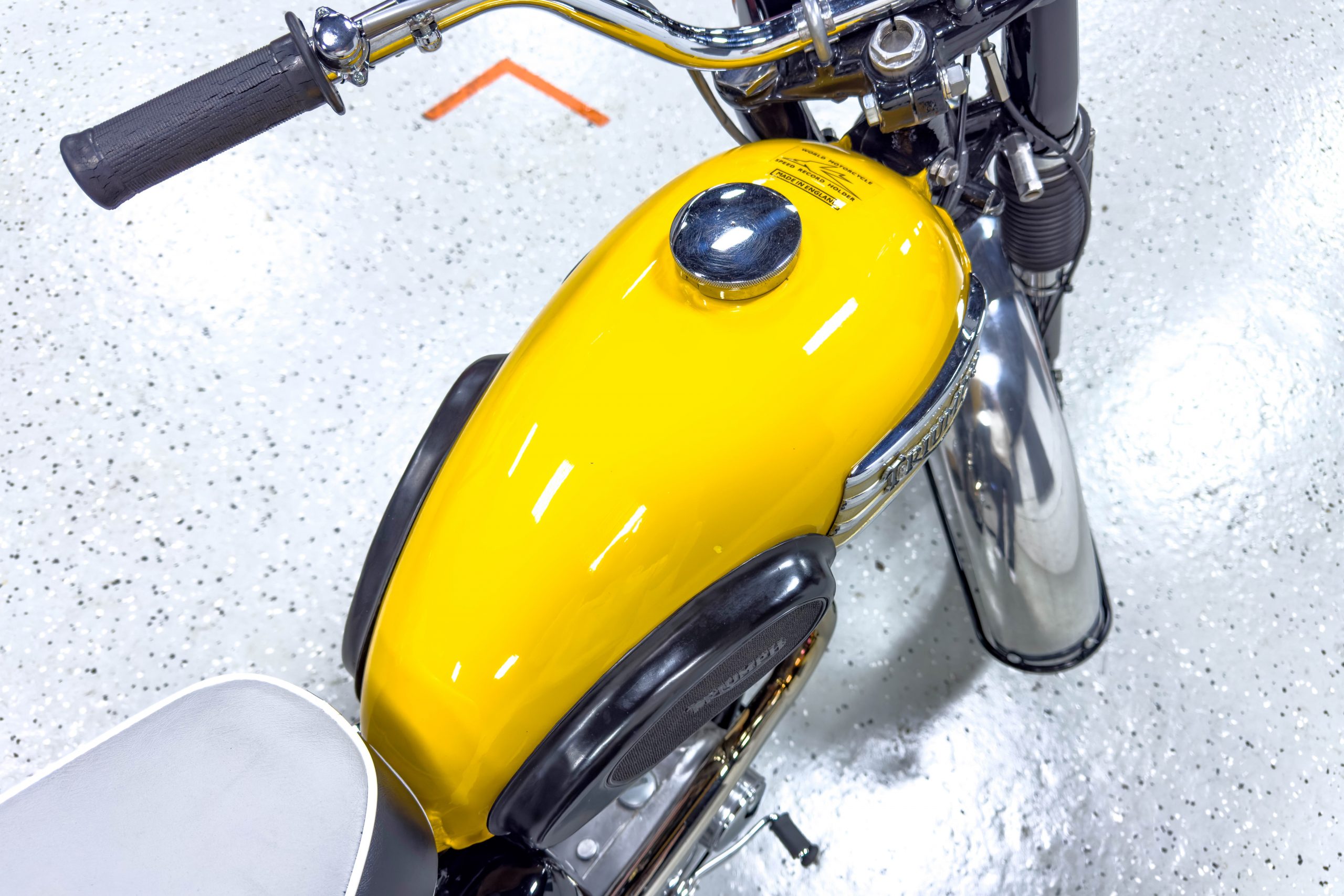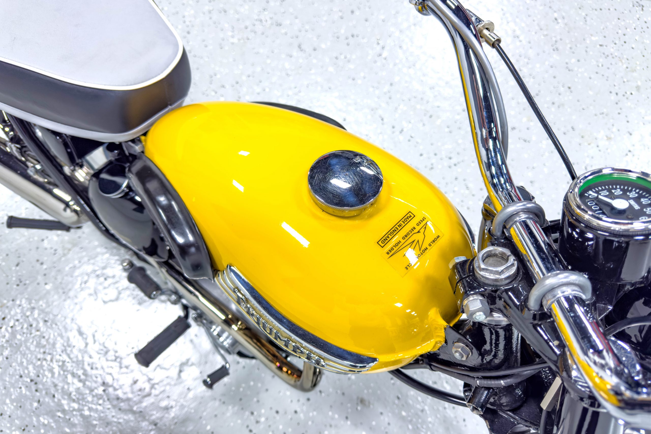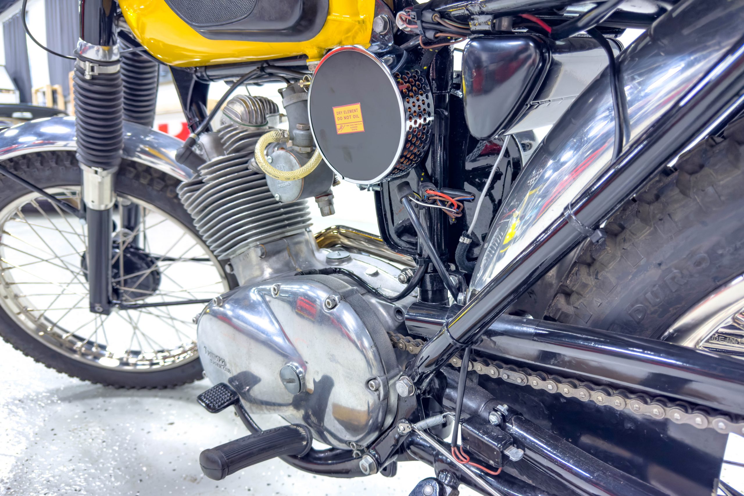This 1966 Triumph Mountain Cub is the recipient of a comprehensive restoration completed in 2021 and is beautifully presented in Hunting Yellow with Black oil tank and stainless-steel fenders. It is powered by a 199cc four-stroke single paired with a four-speed transmission.