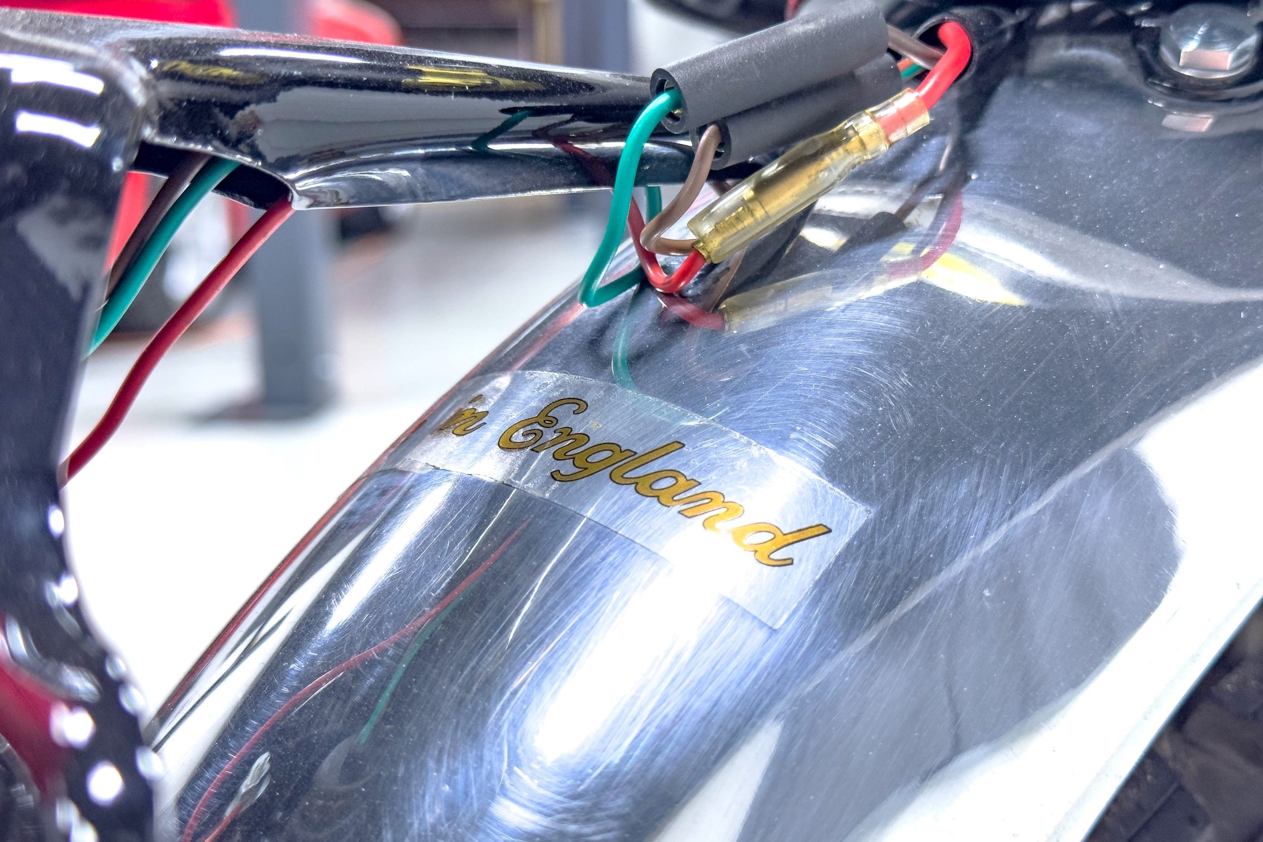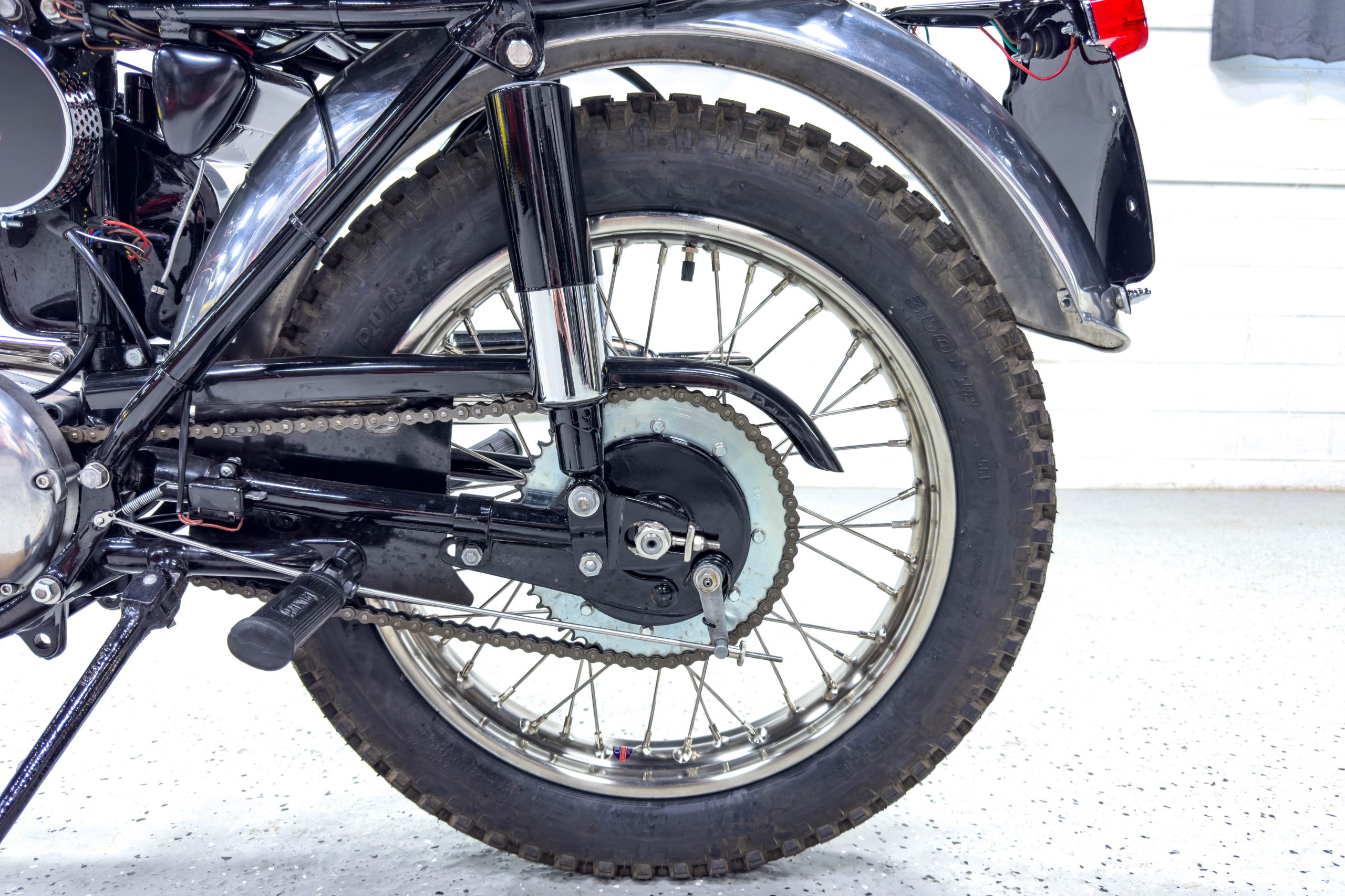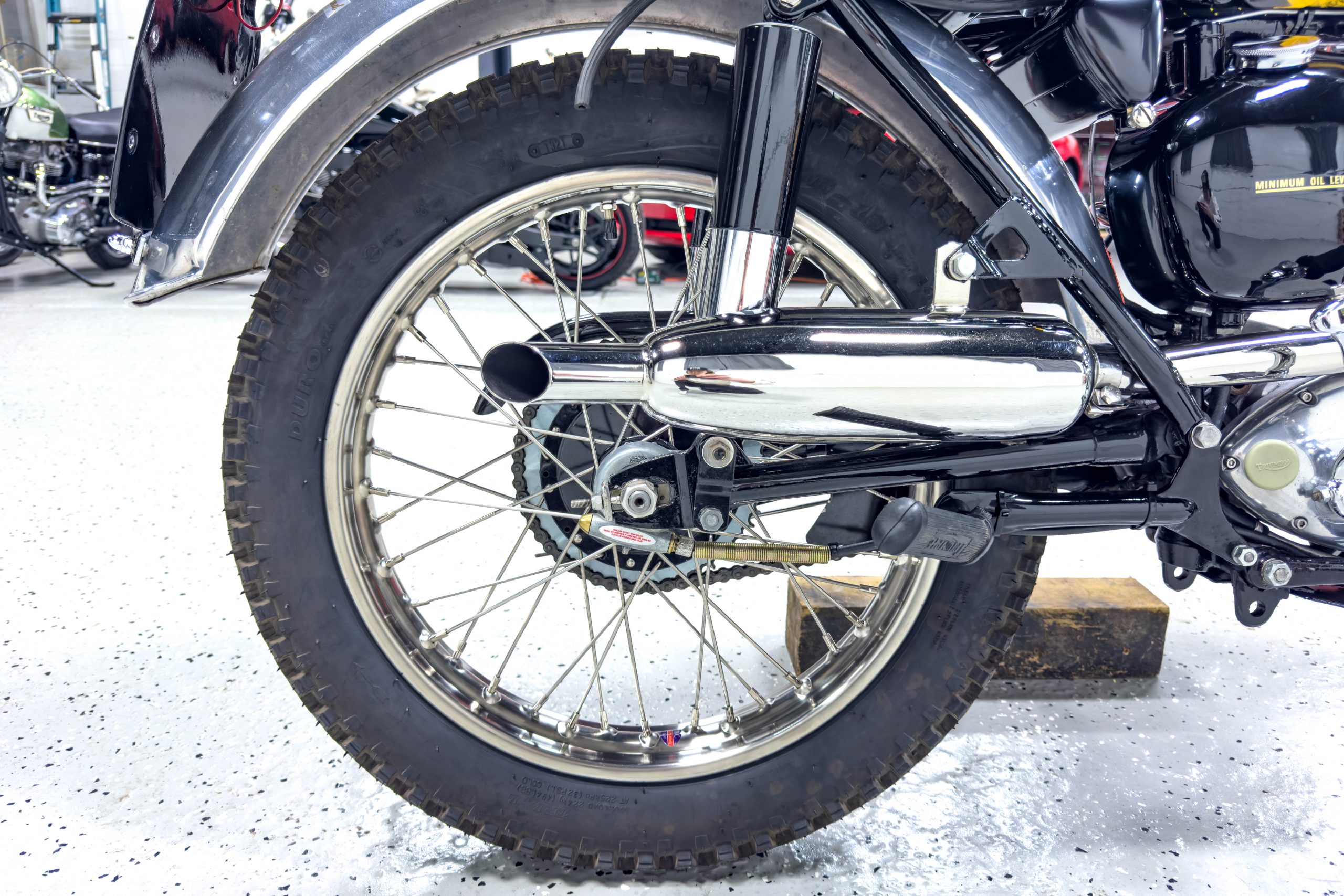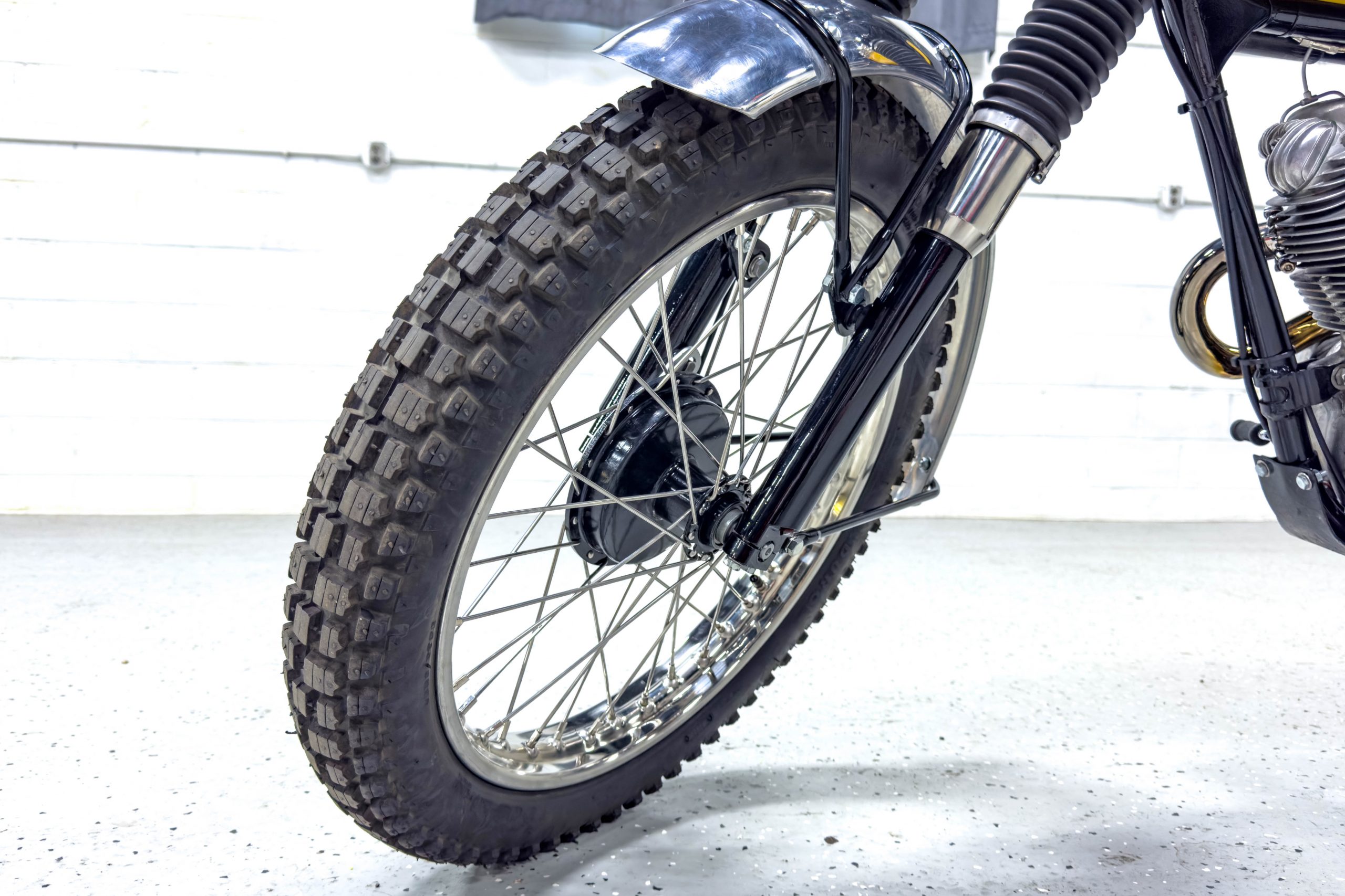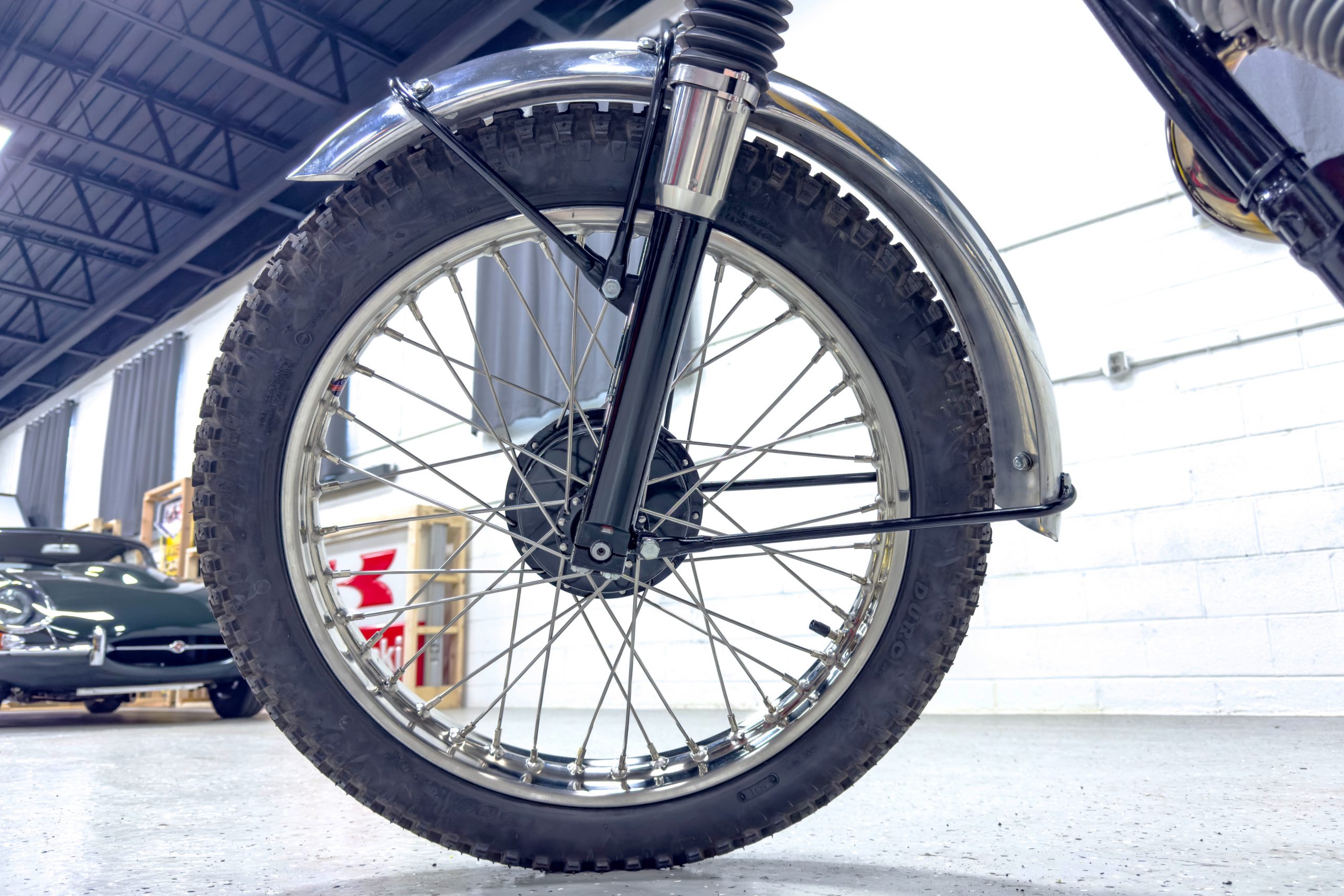 New stainless-steel wheels from Central Wheel Components in England measuring 19″ front and 18″ rear wheels are laced to hubs with drum brakes and wear Duro tires with 2021 date codes. The suspension consists of a conventional fork with rubber gaiters as well as twin shrouded shocks mounted to the swingarm.