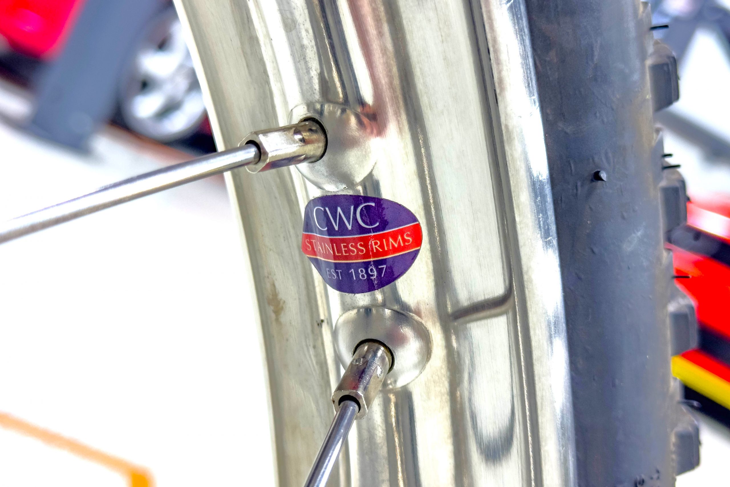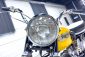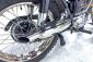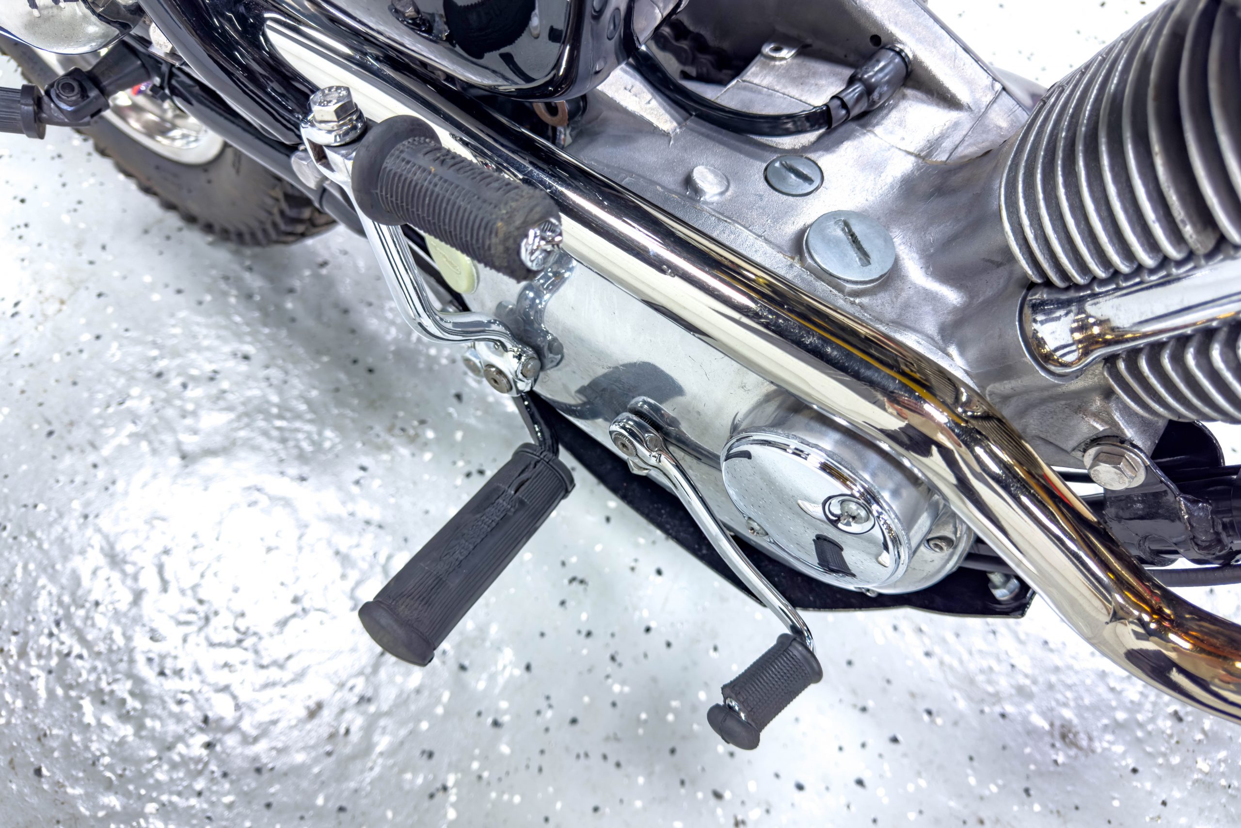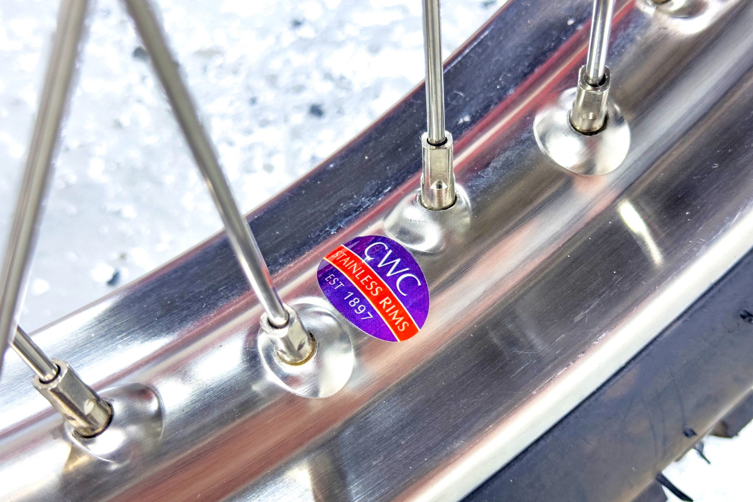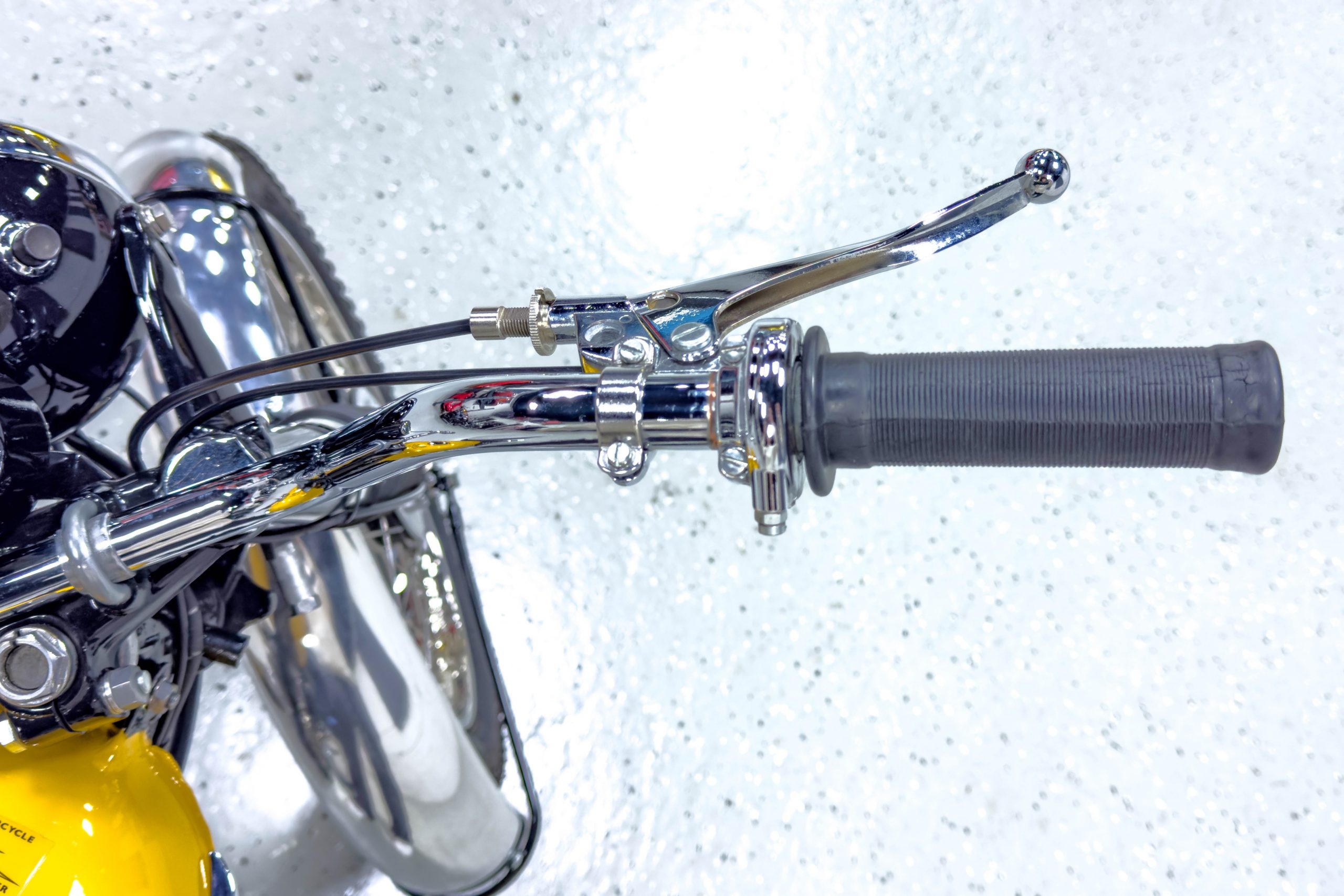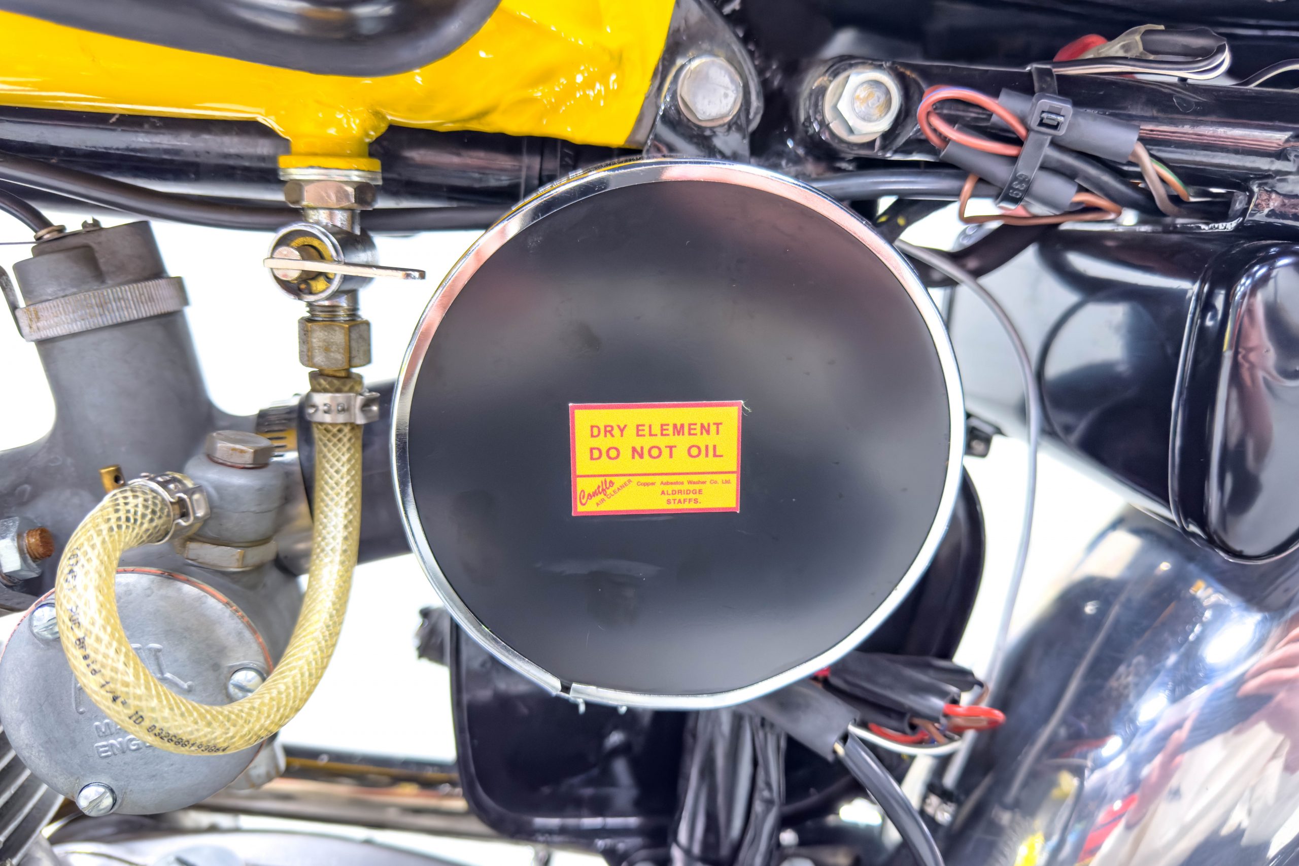 New stainless-steel wheels from Central Wheel Components in England measuring 19″ front and 18″ rear wheels are laced to hubs with drum brakes and wear Duro tires with 2021 date codes. The suspension consists of a conventional fork with rubber gaiters as well as twin shrouded shocks mounted to the swingarm.