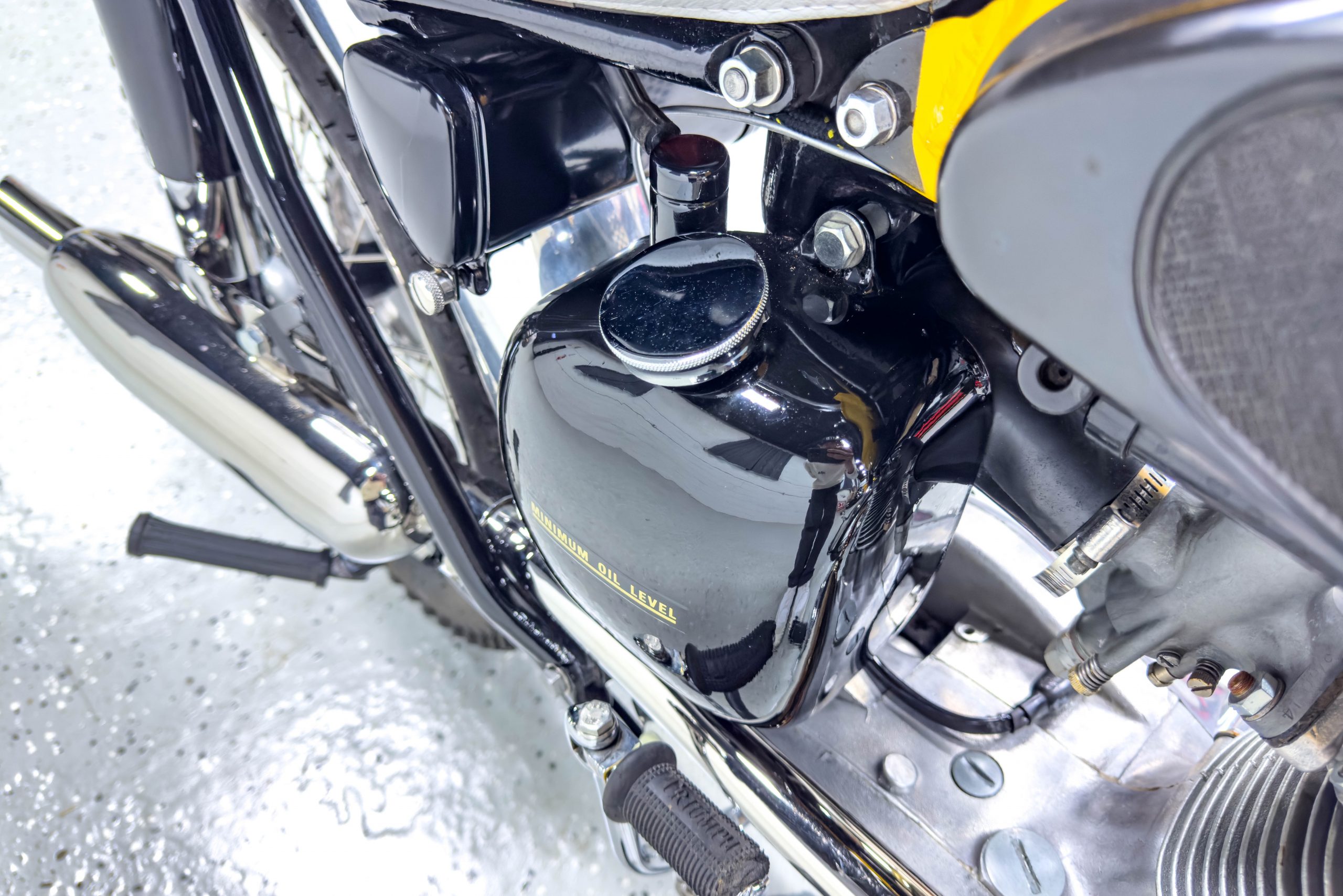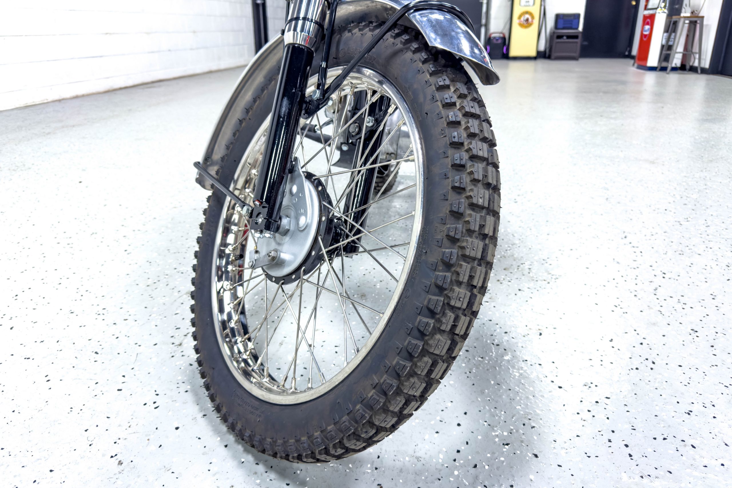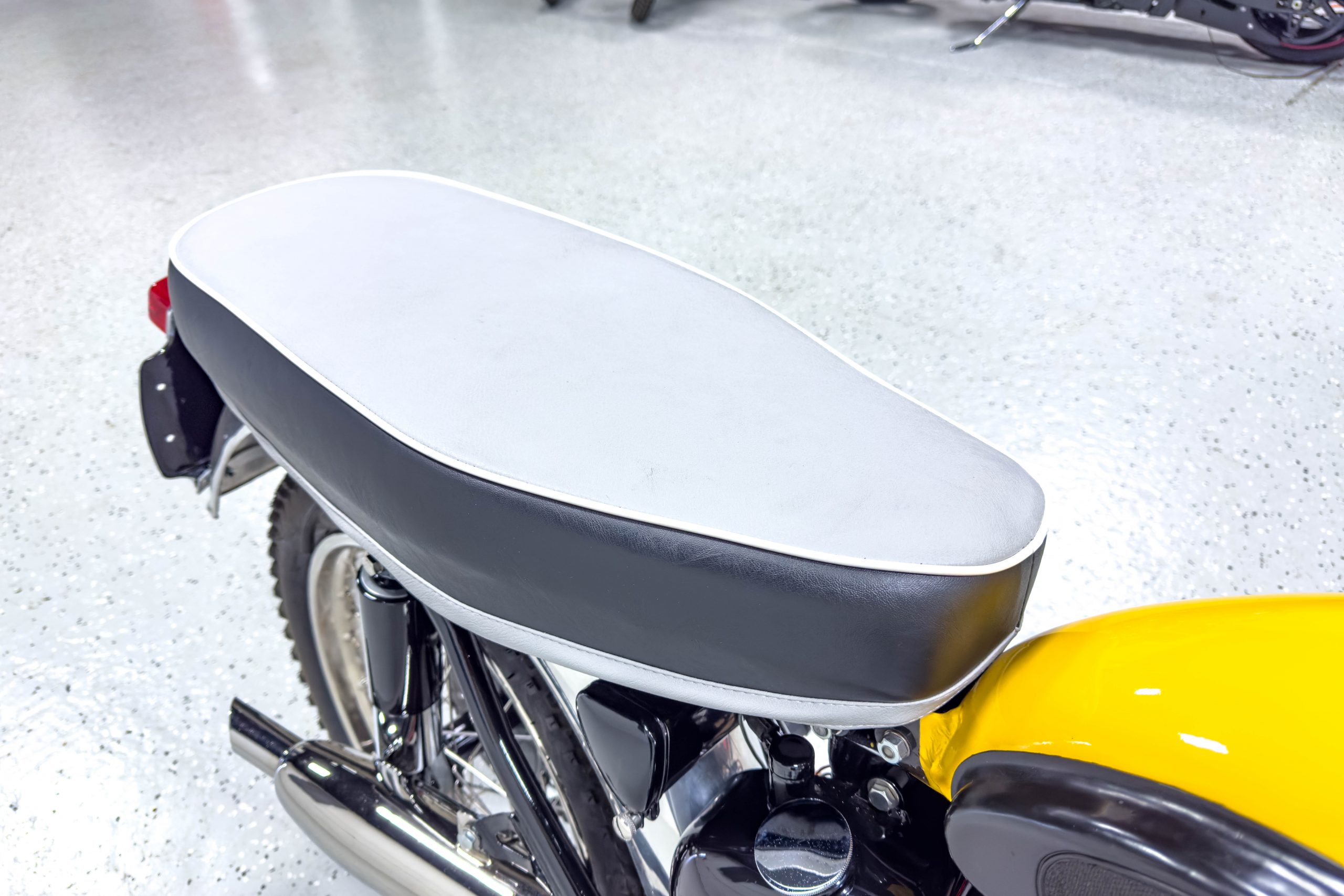 Equipment includes a two-up seat, an Amal carburetor, a polished mid-mounted exhaust system, a headlight, a taillight, a kickstarter, a skid plate, Smiths instrumentation, shrouded shocks, and a side stand.
