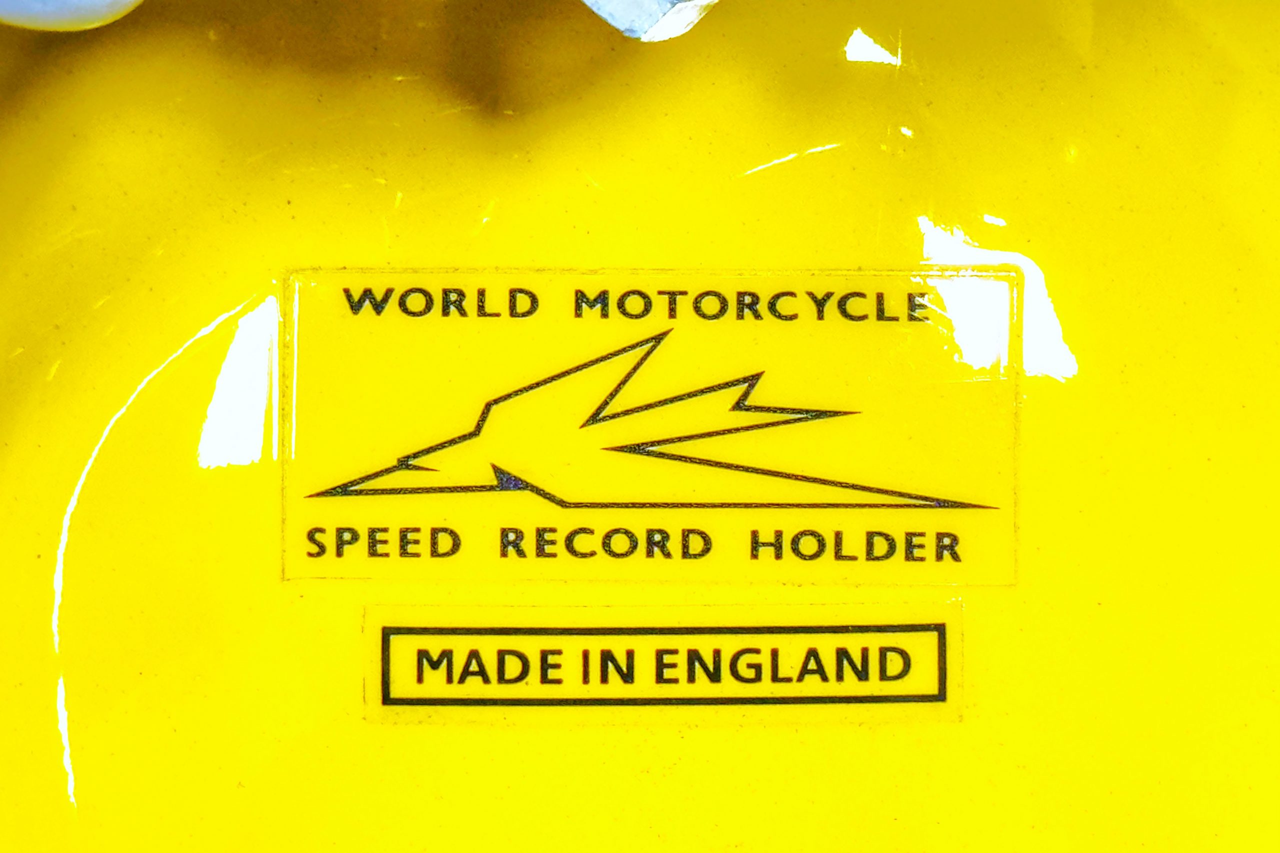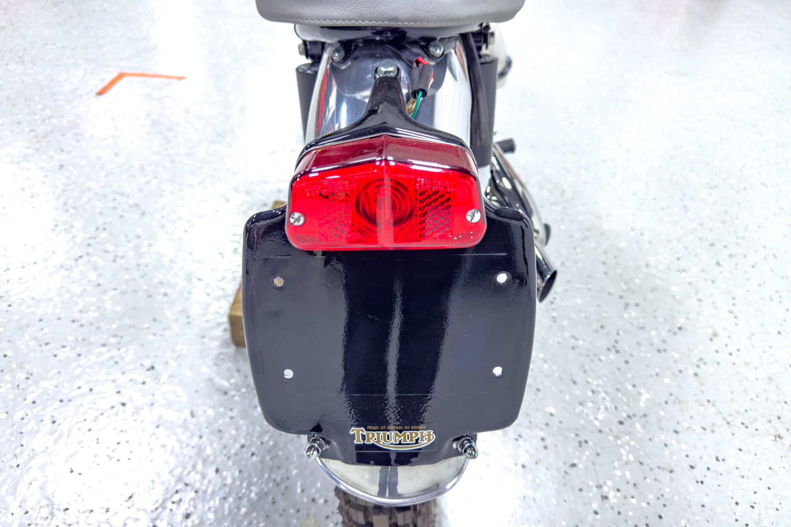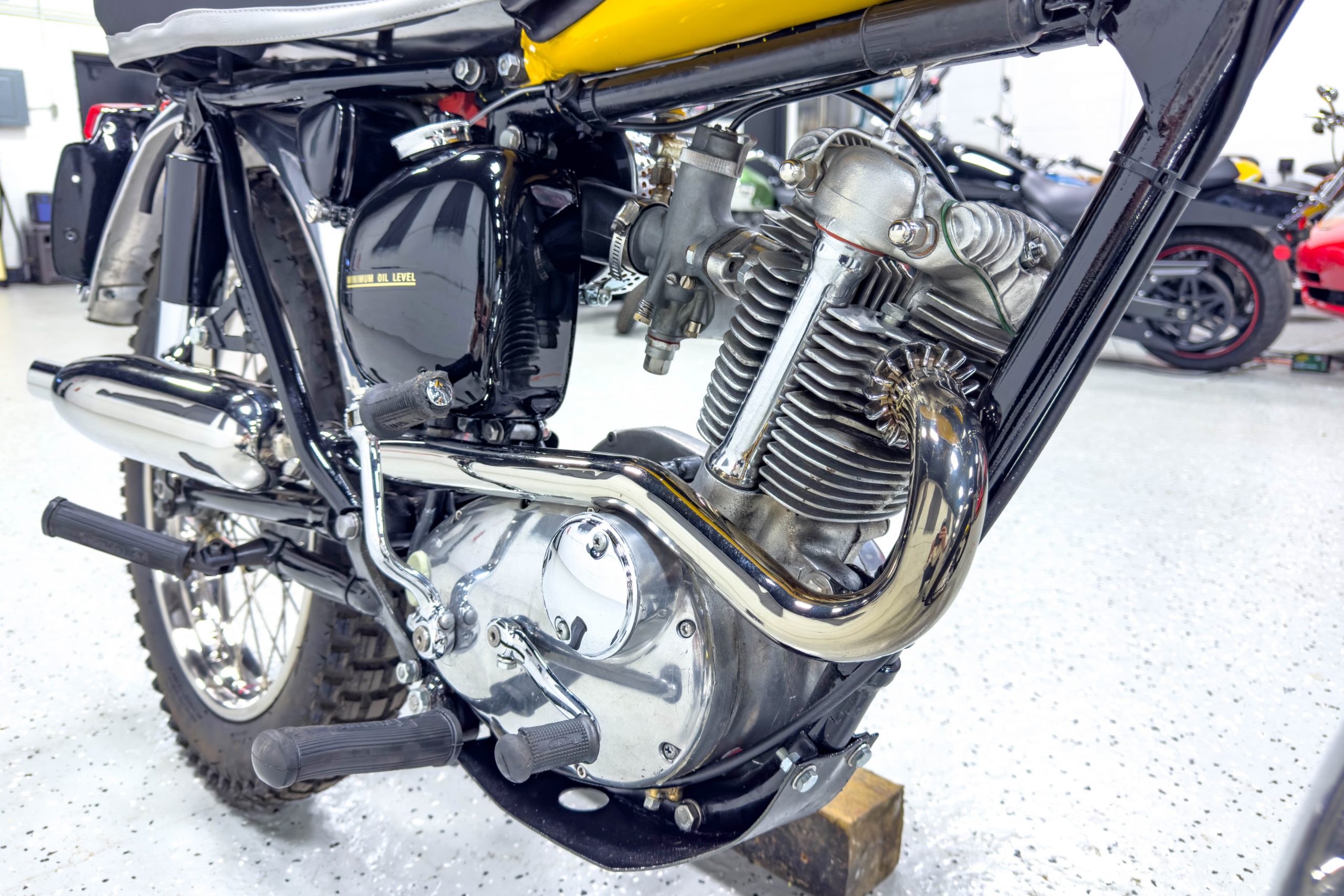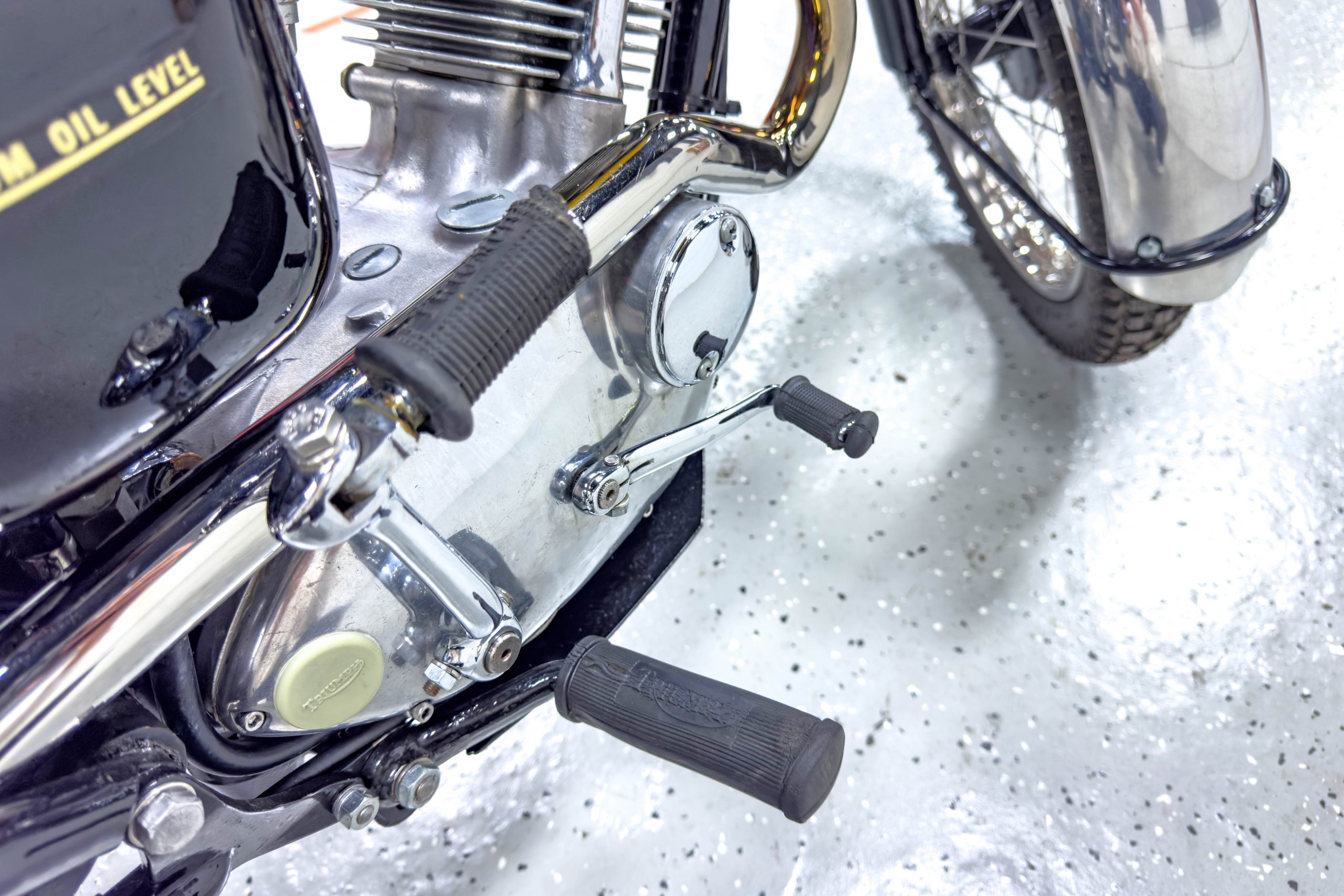 Equipment includes a two-up seat, an Amal carburetor, a polished mid-mounted exhaust system, a headlight, a taillight, a kickstarter, a skid plate, Smiths instrumentation, shrouded shocks, and a side stand.