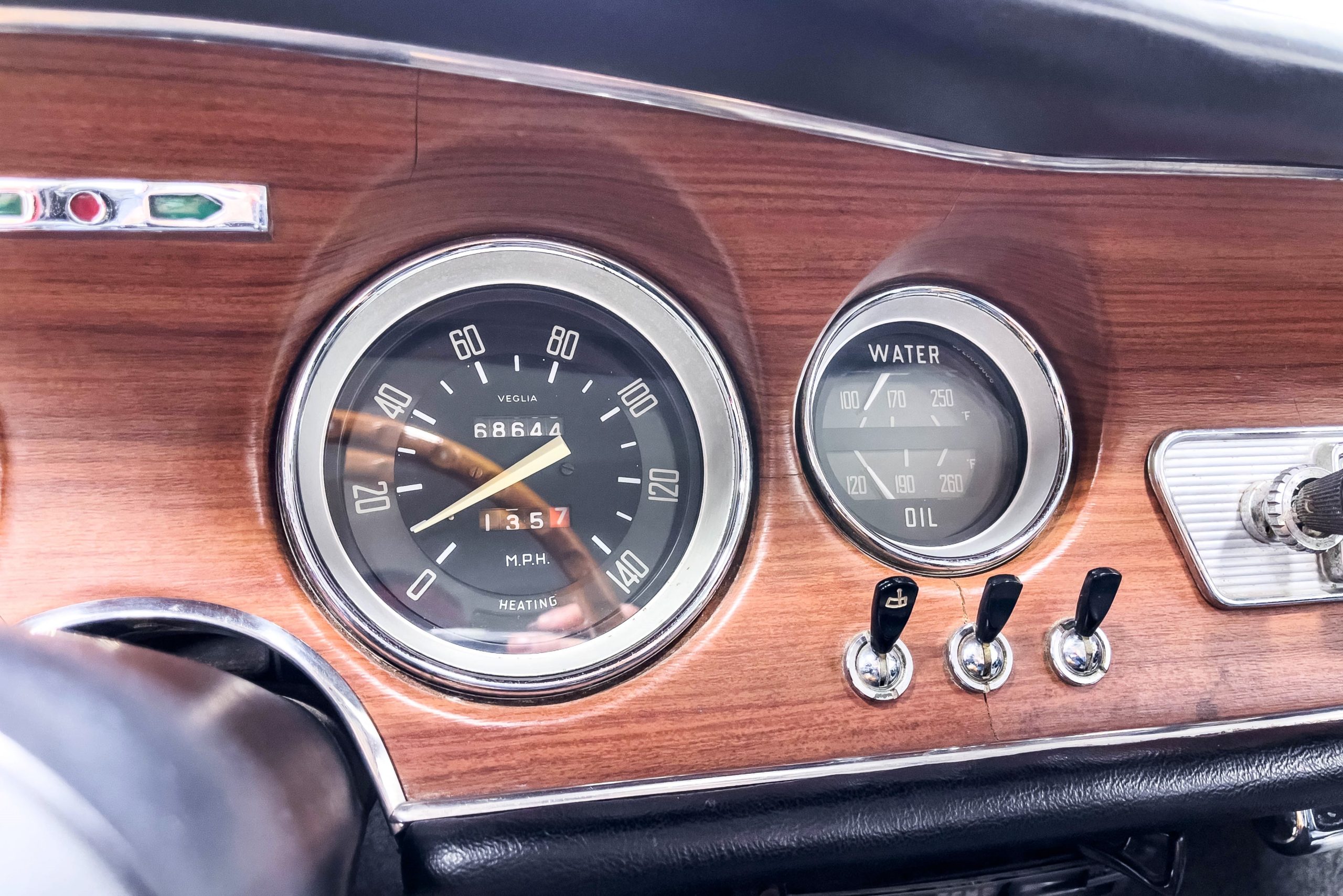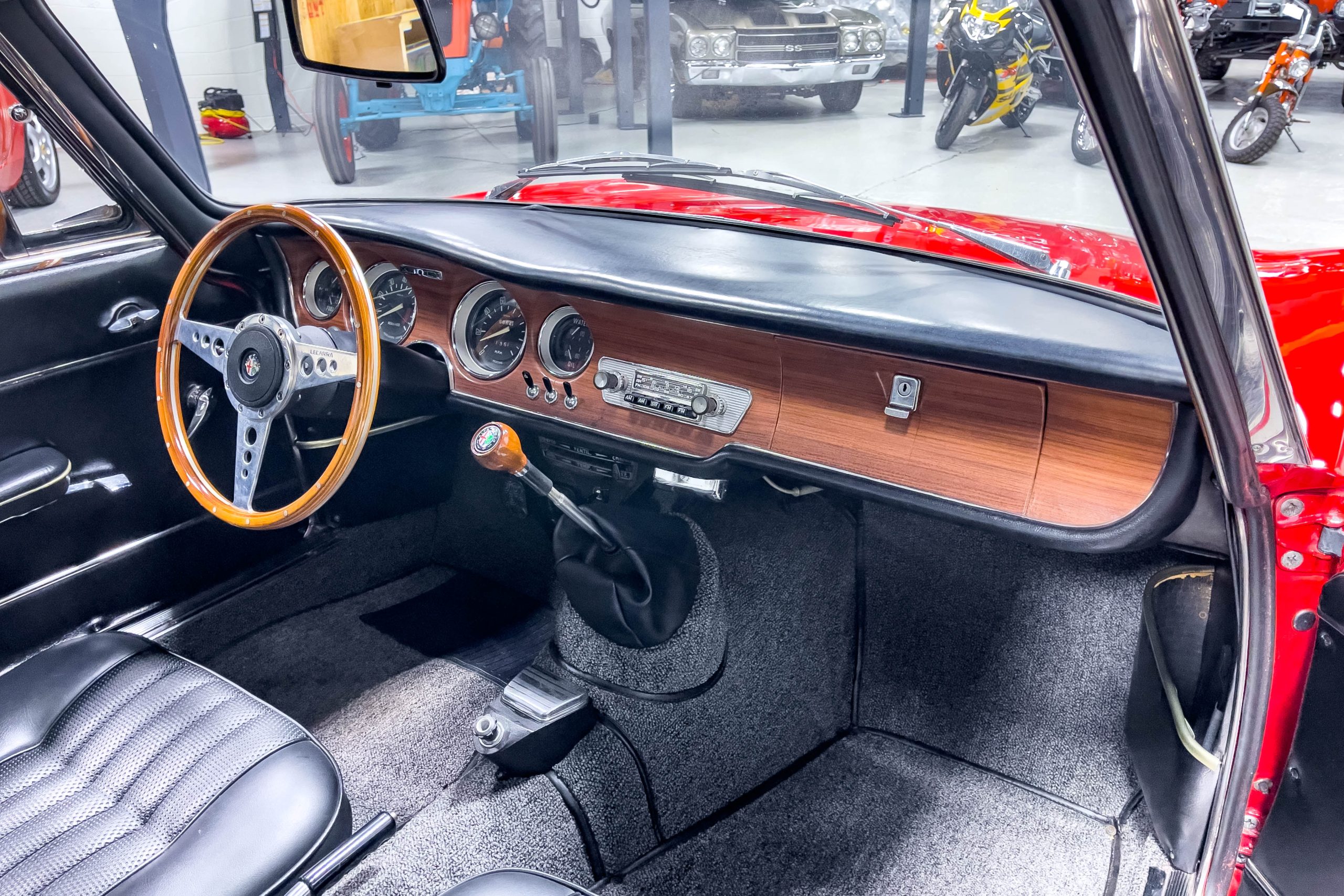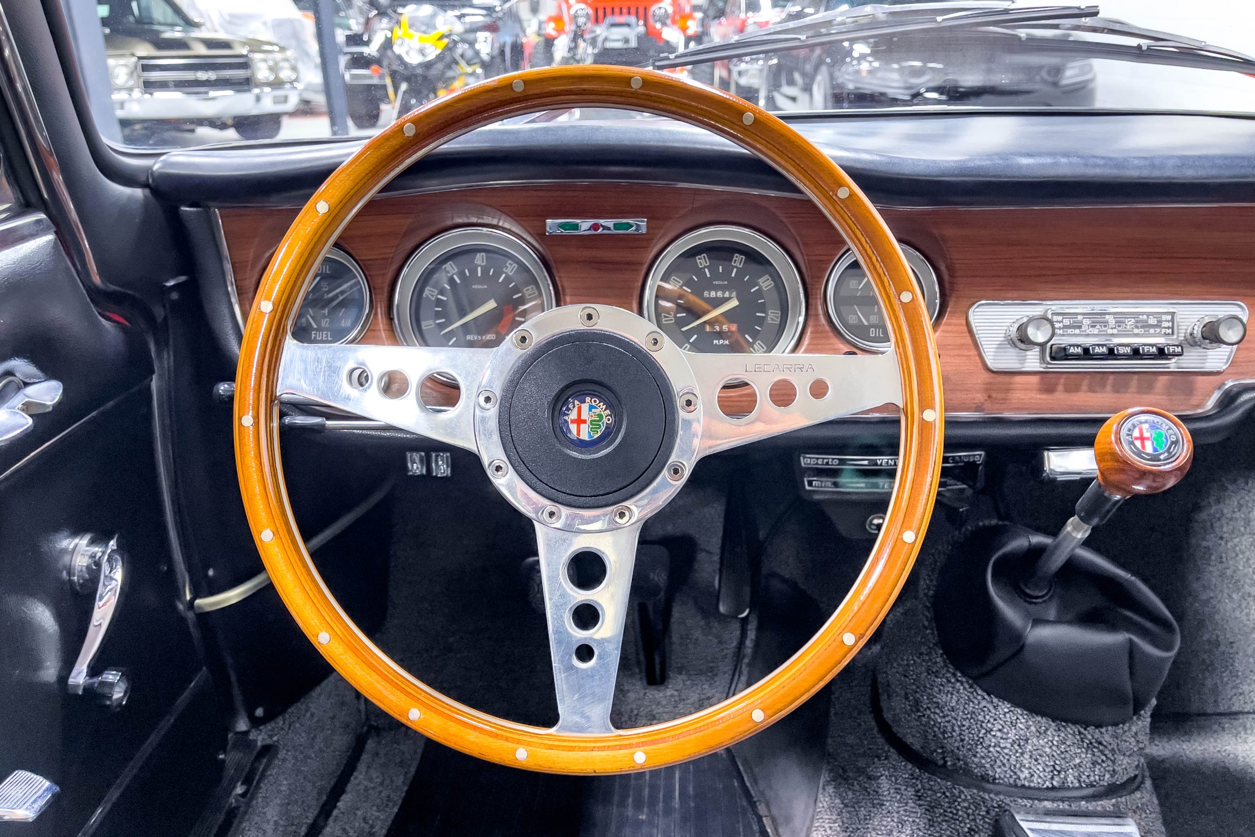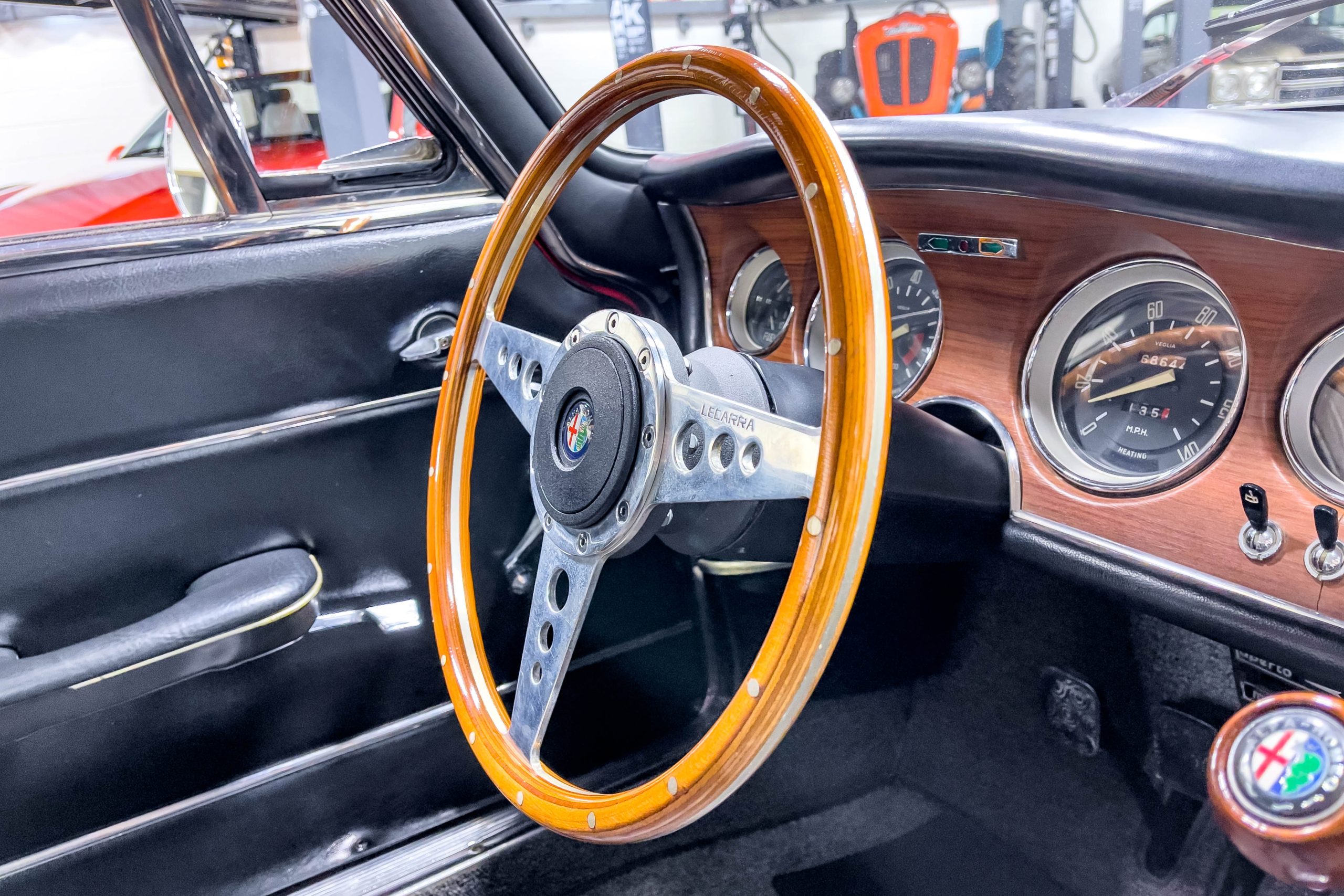 The Sprint GT Veloce was introduced at the 36th Geneva Motor Show in March 1966 to great fanfare. It featured several updates over the previous model including a revised engine, better interior fittings, and changes to the exterior trim. Inside the main changes from the Giulia Sprint GT were imitation wood dashboard fascia instead of the previous anti-glare grey finish, front seats revised to a mild “bucket” design, and a dished three aluminum spoke steering wheel, with a black rim and horn buttons through the spokes.