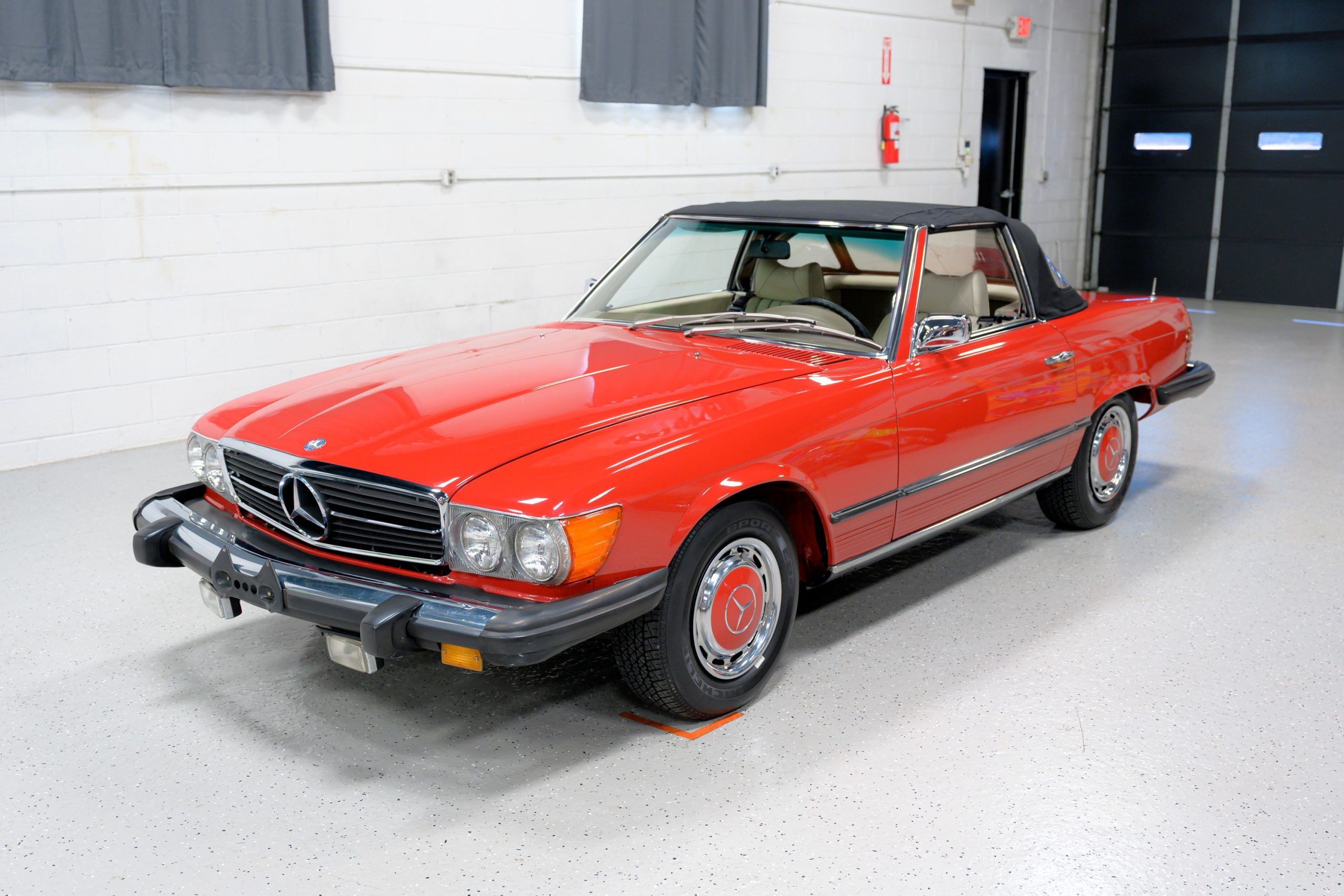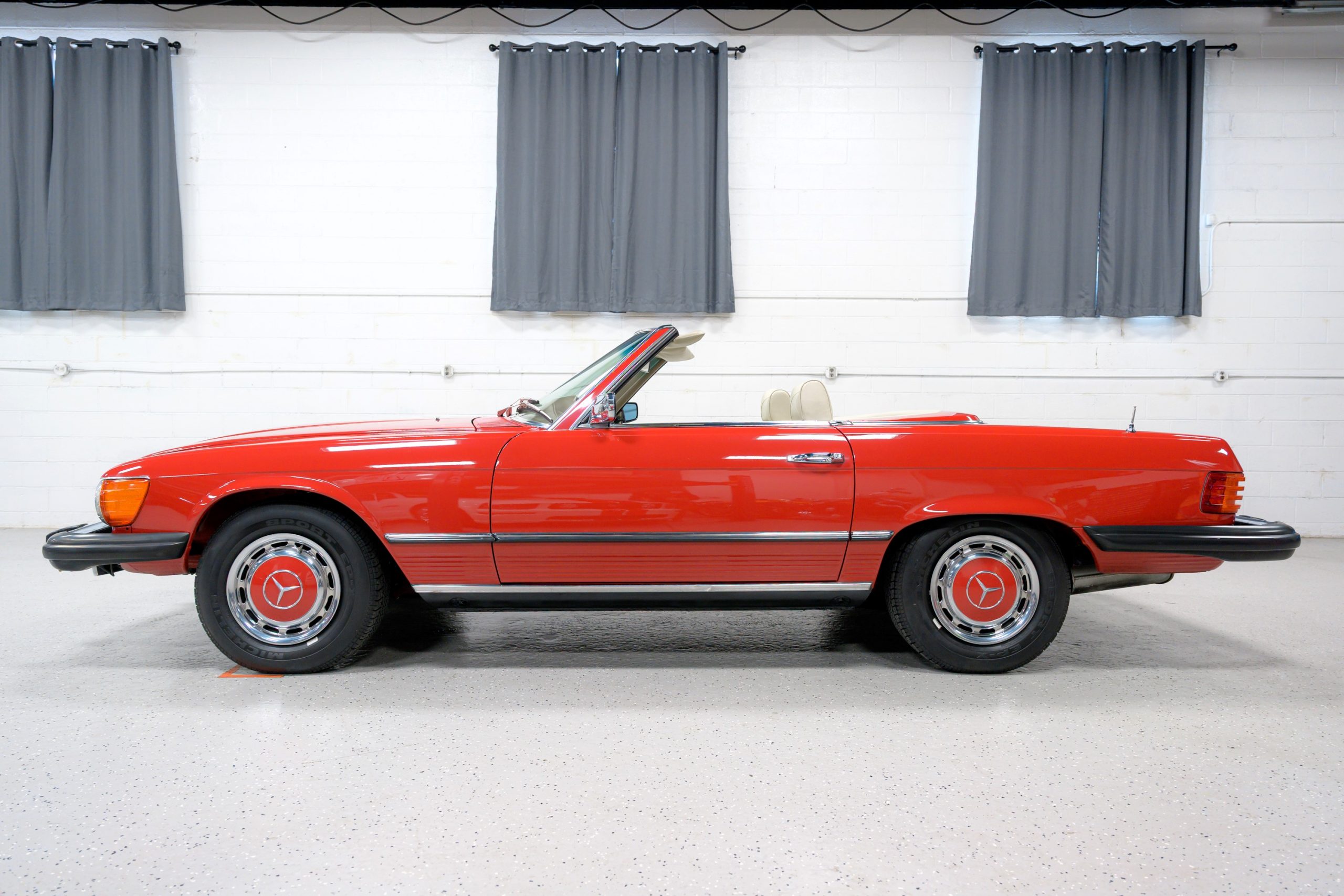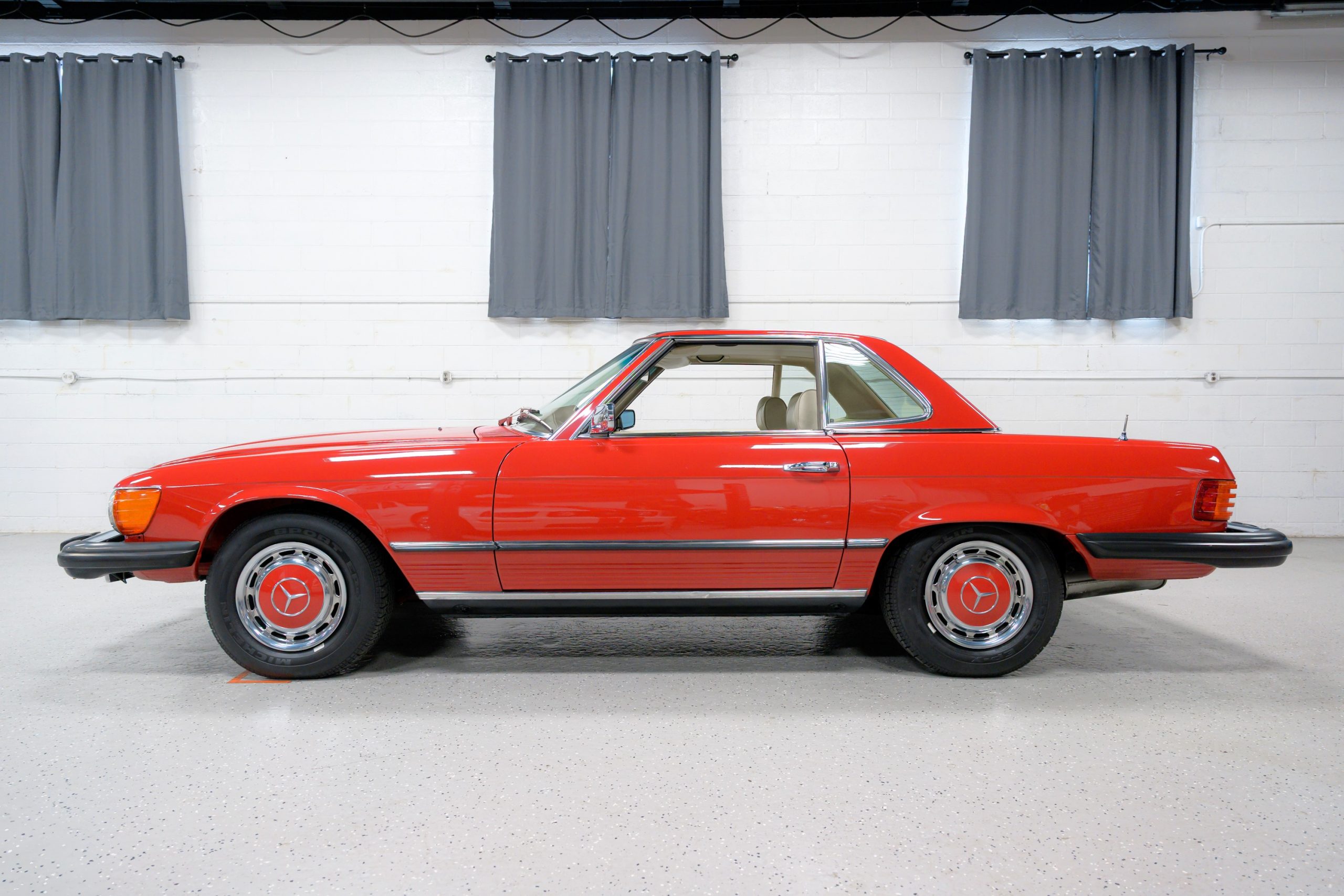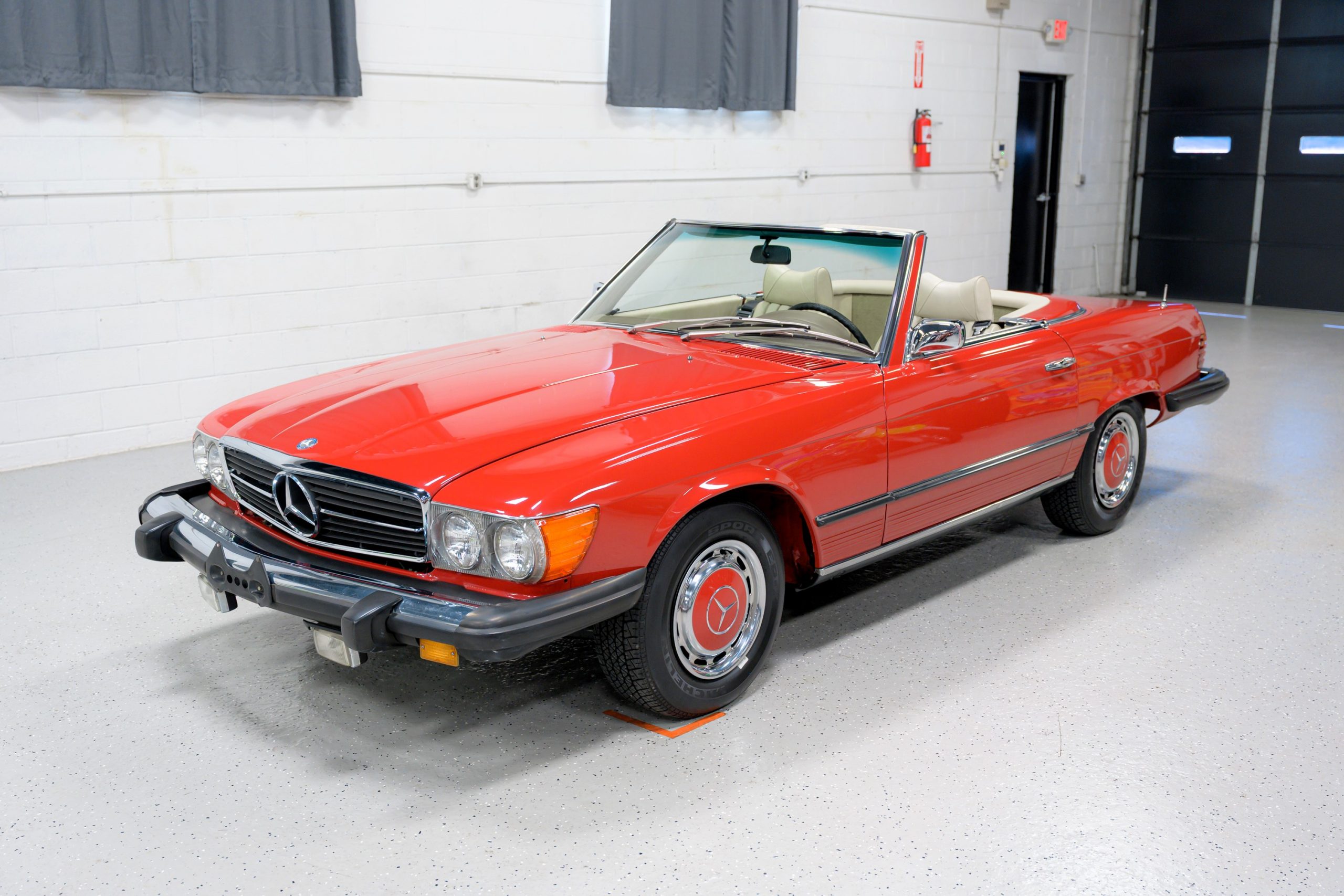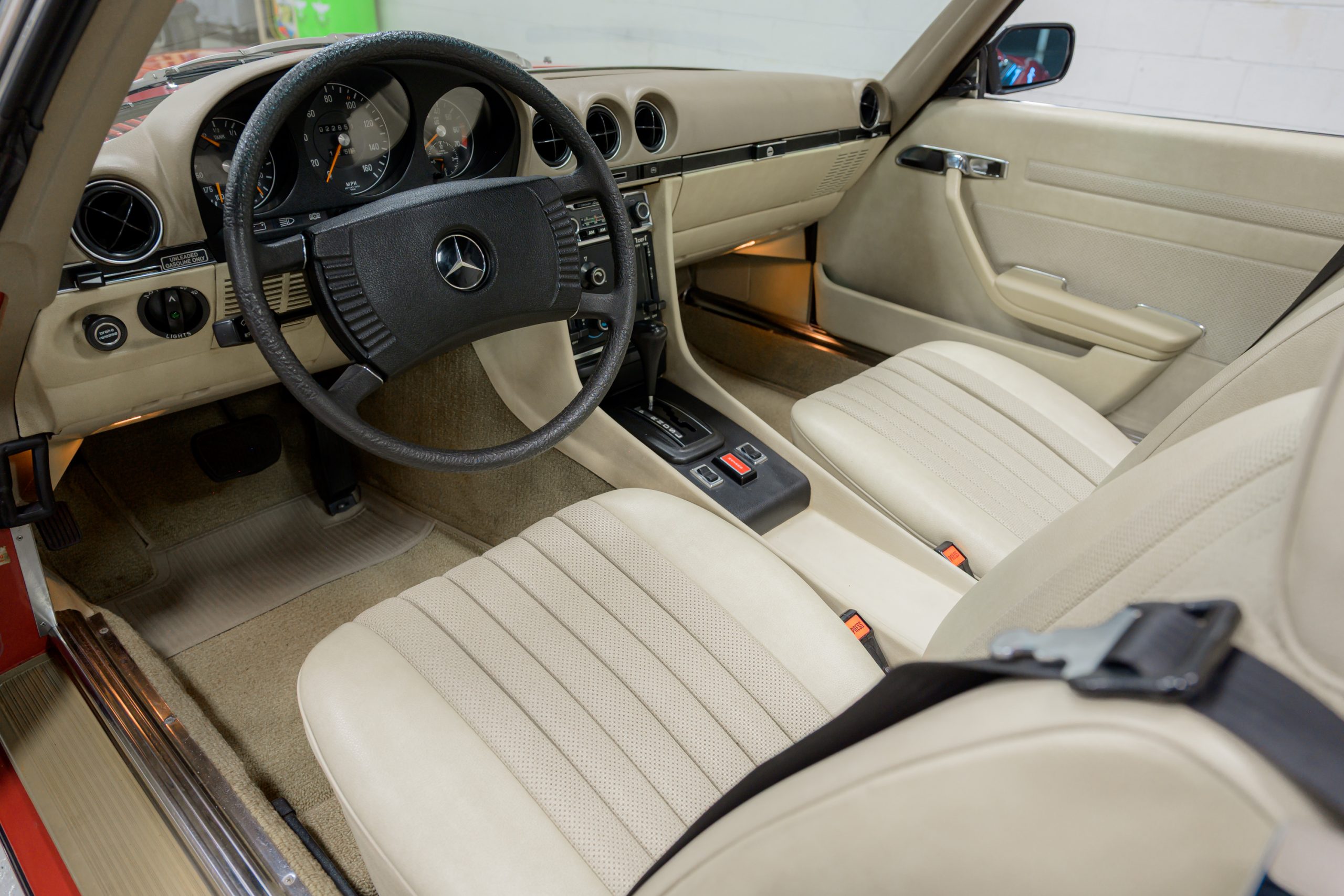 This 450SL is beautifully finished in rare Carnelian Red over a cream MB-Tex interior with a black soft top and a color-matched painted hardtop. Under the hood is a 4.5L M117 V8 featuring Bosch D-Jetronic fuel injection and was factory rated at 180 horsepower and 220 lb-ft of torque mated to a 3-speed automatic transmission.