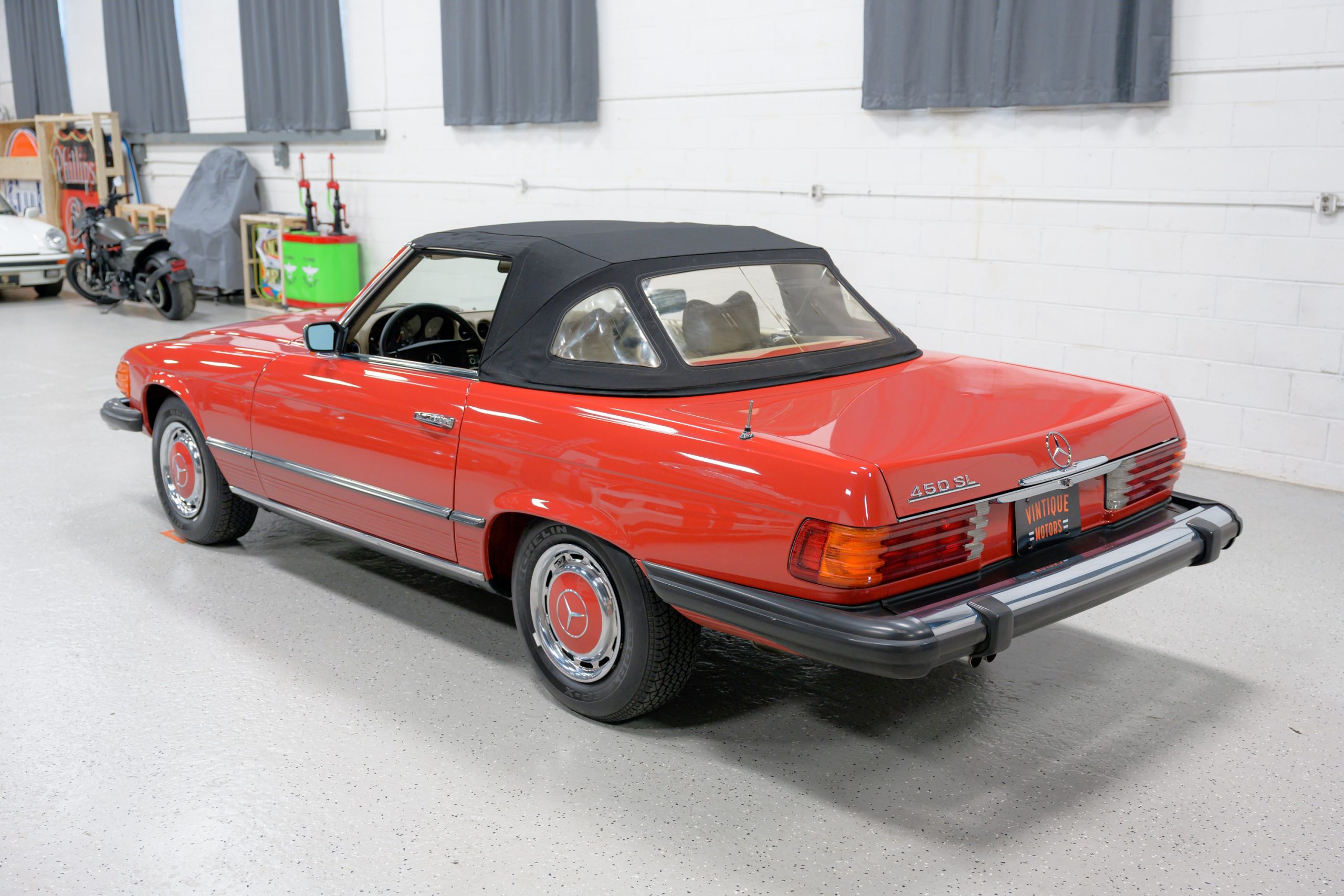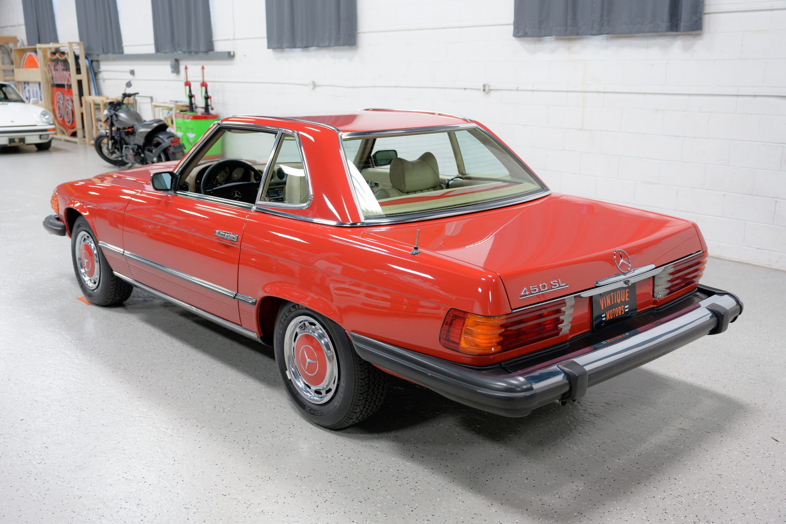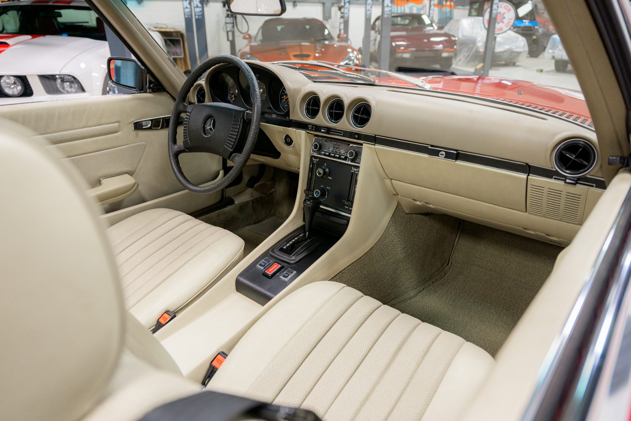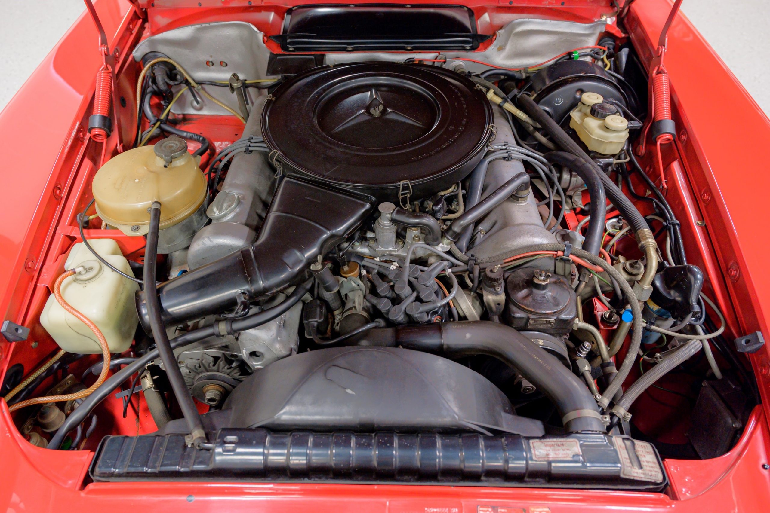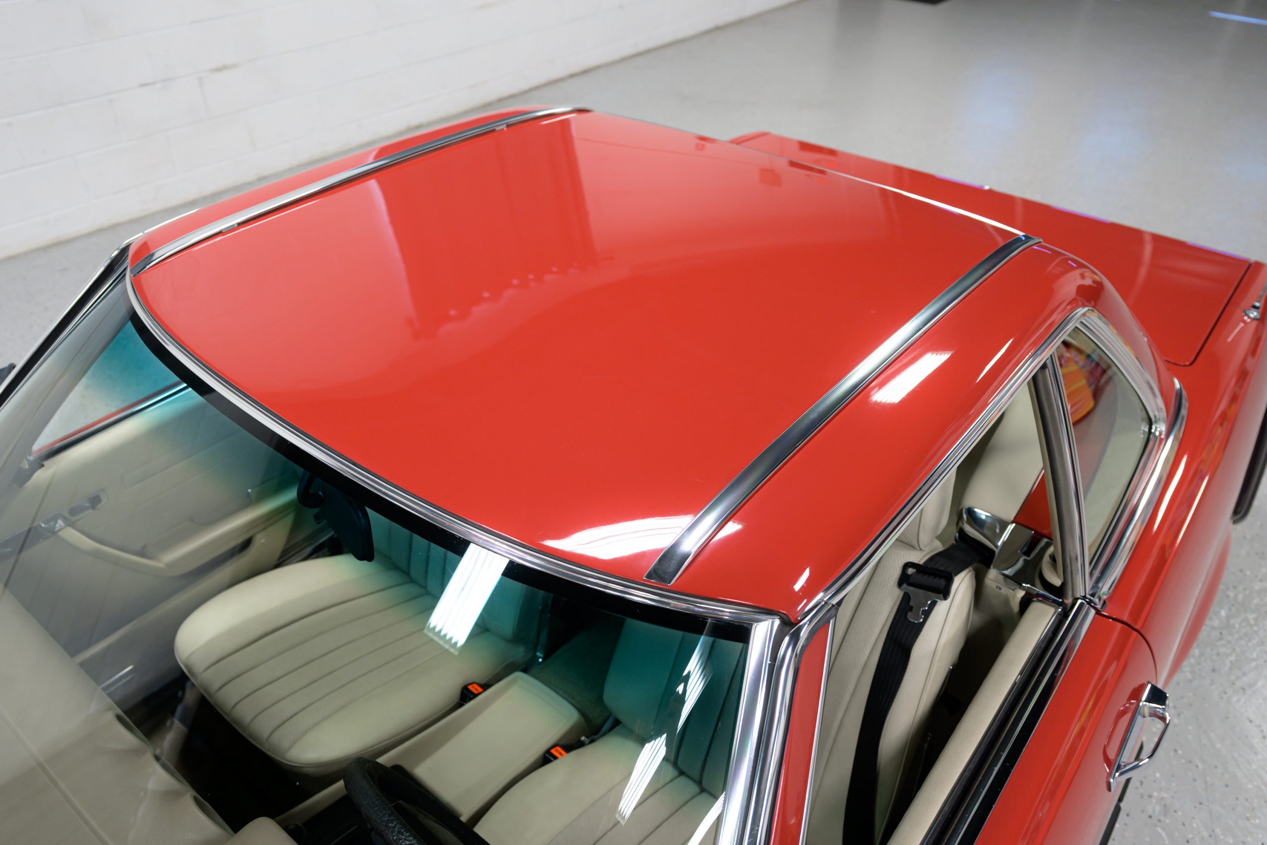 This 450SL is beautifully finished in rare Carnelian Red over a cream MB-Tex interior with a black soft top and a color-matched painted hardtop. Under the hood is a 4.5L M117 V8 featuring Bosch D-Jetronic fuel injection and was factory rated at 180 horsepower and 220 lb-ft of torque mated to a 3-speed automatic transmission.