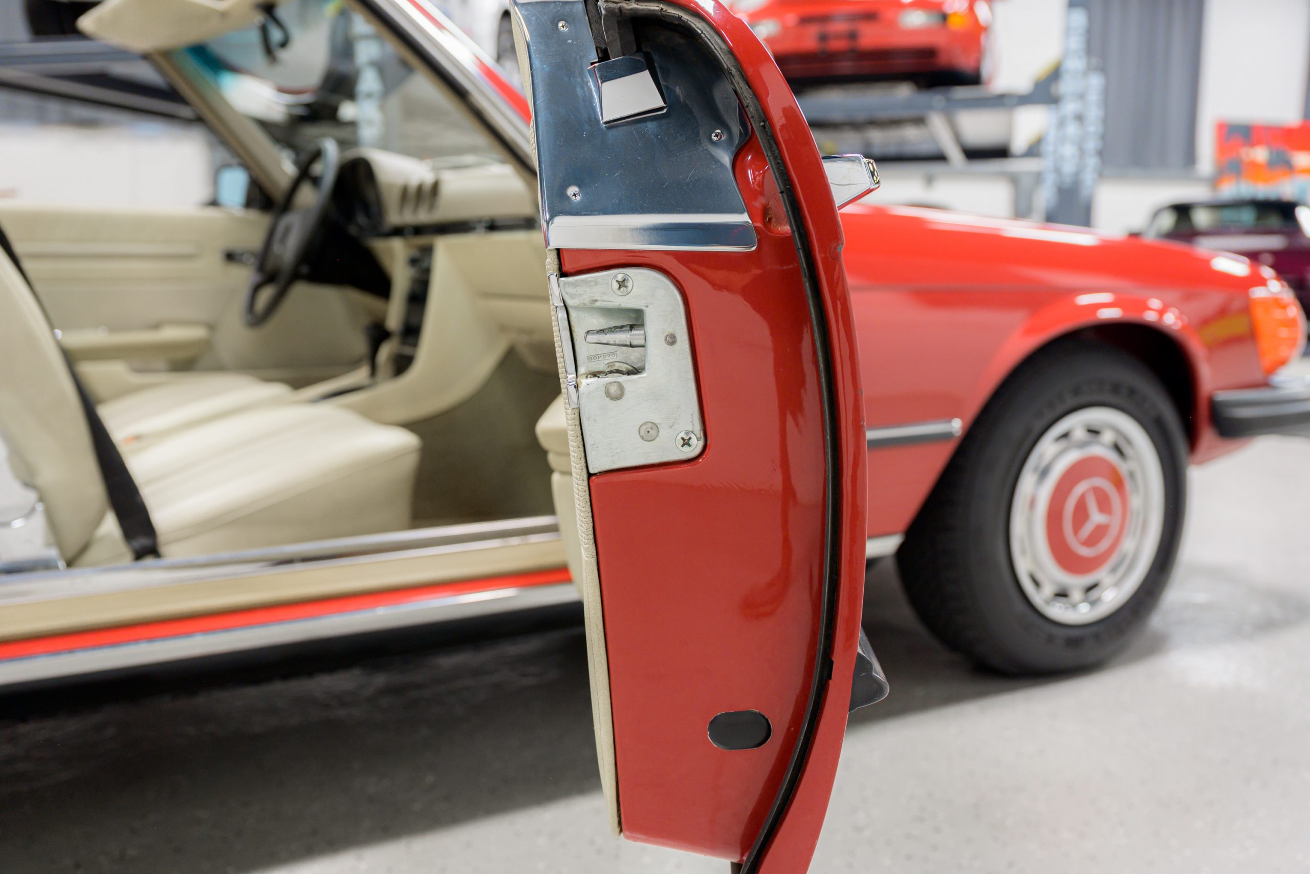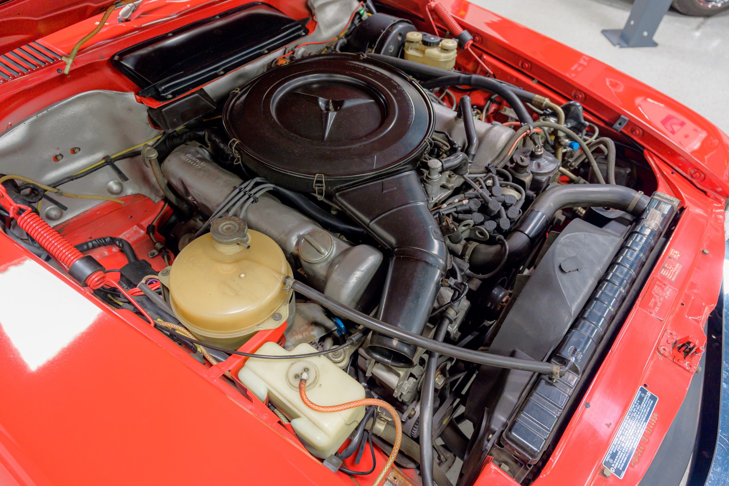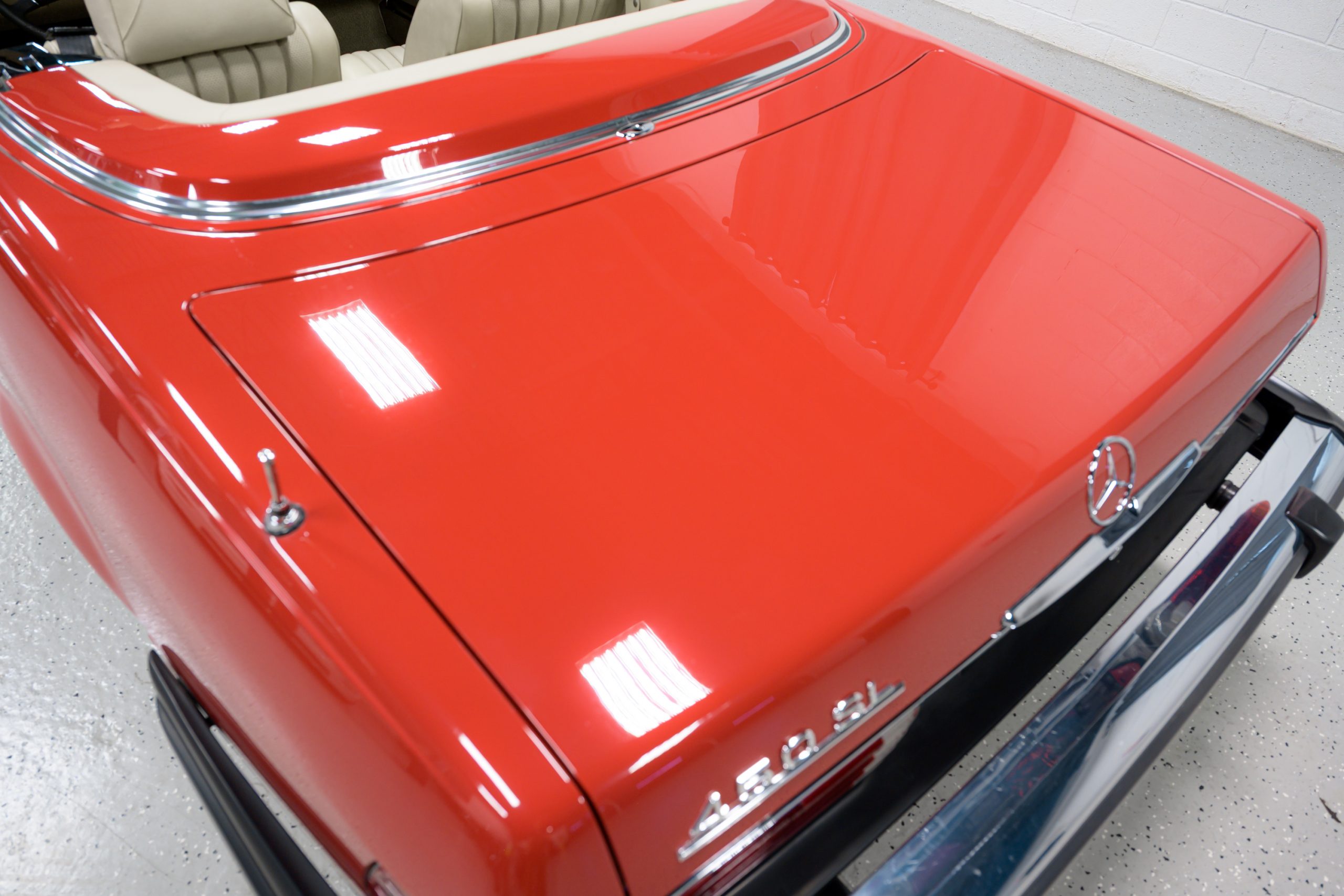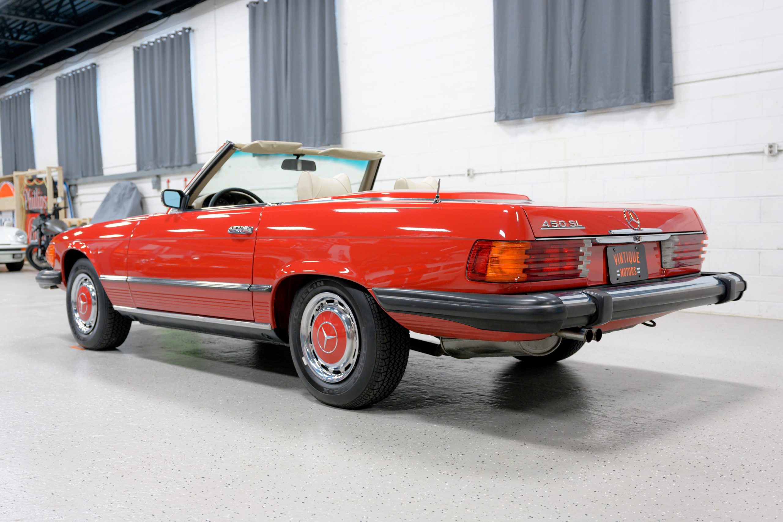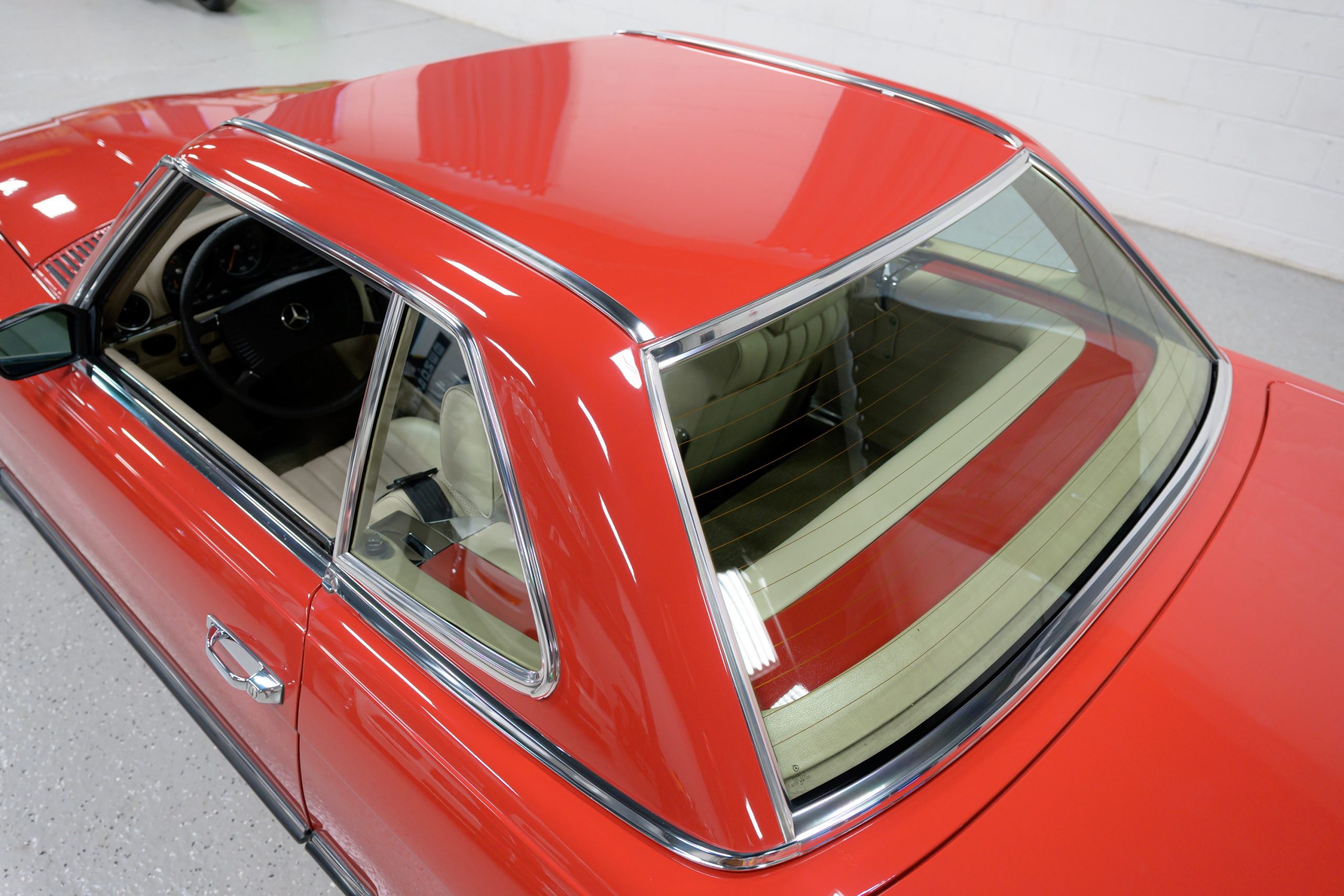 This 450SL is beautifully finished in rare Carnelian Red over a cream MB-Tex interior with a black soft top and a color-matched painted hardtop. Under the hood is a 4.5L M117 V8 featuring Bosch D-Jetronic fuel injection and was factory rated at 180 horsepower and 220 lb-ft of torque mated to a 3-speed automatic transmission.