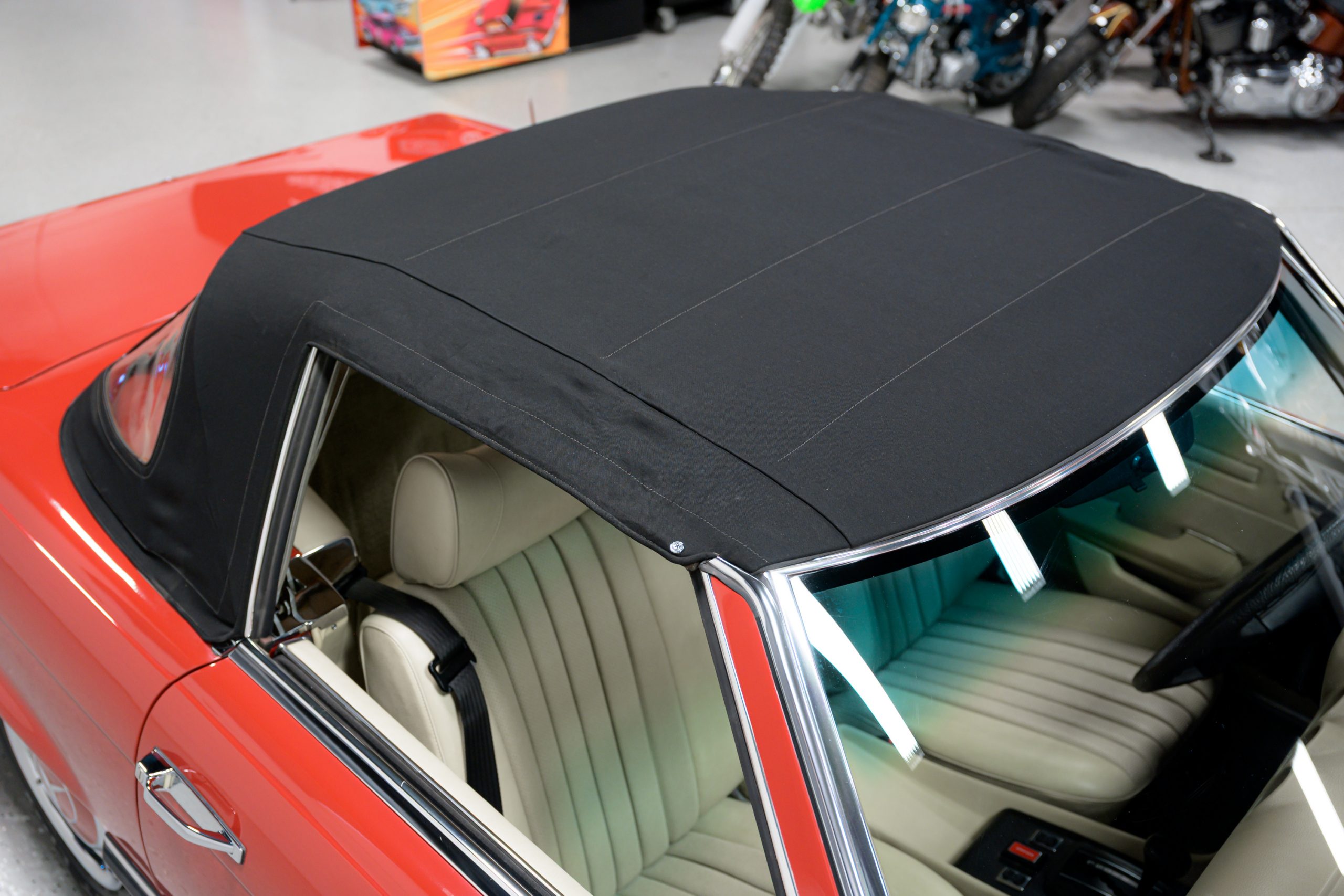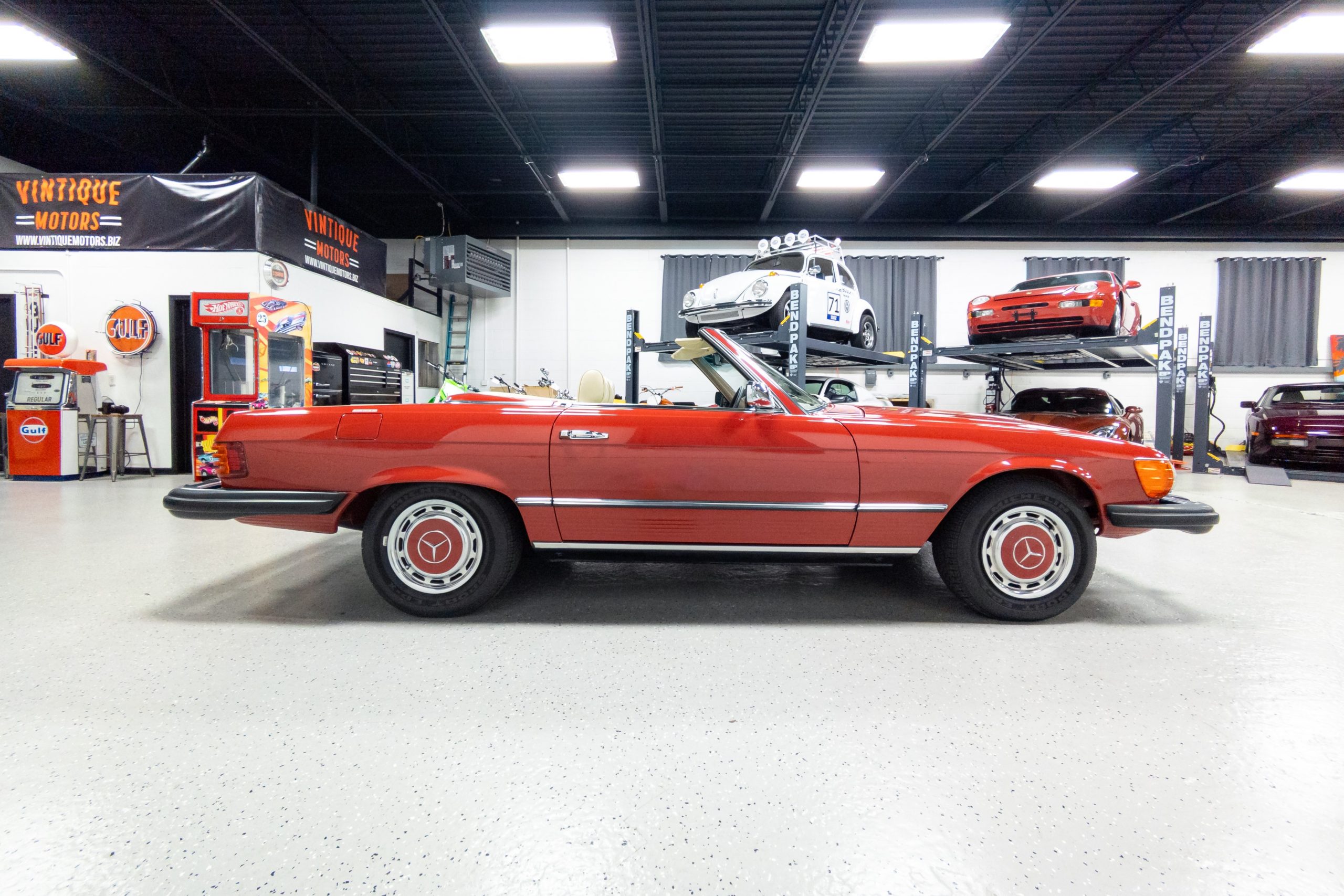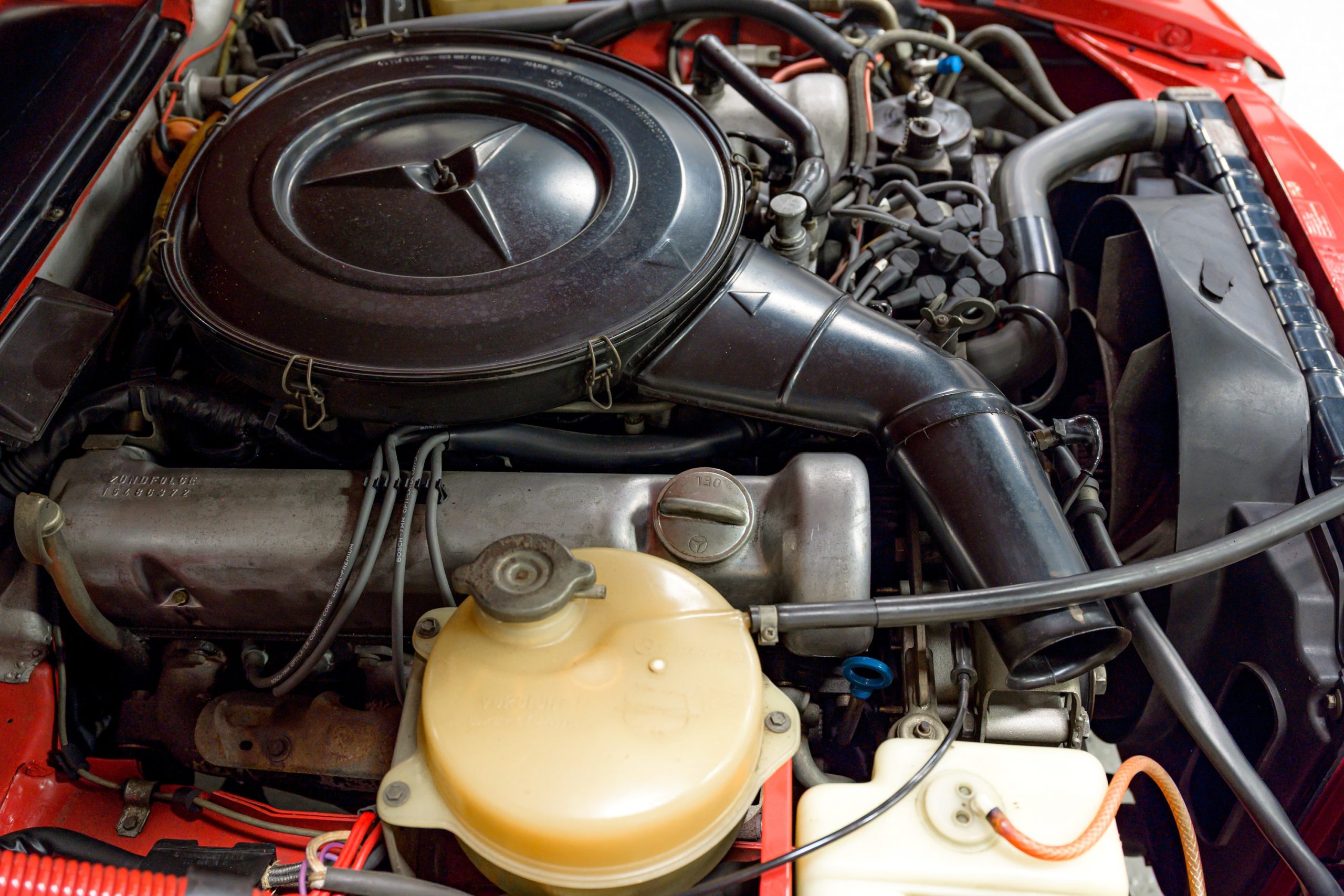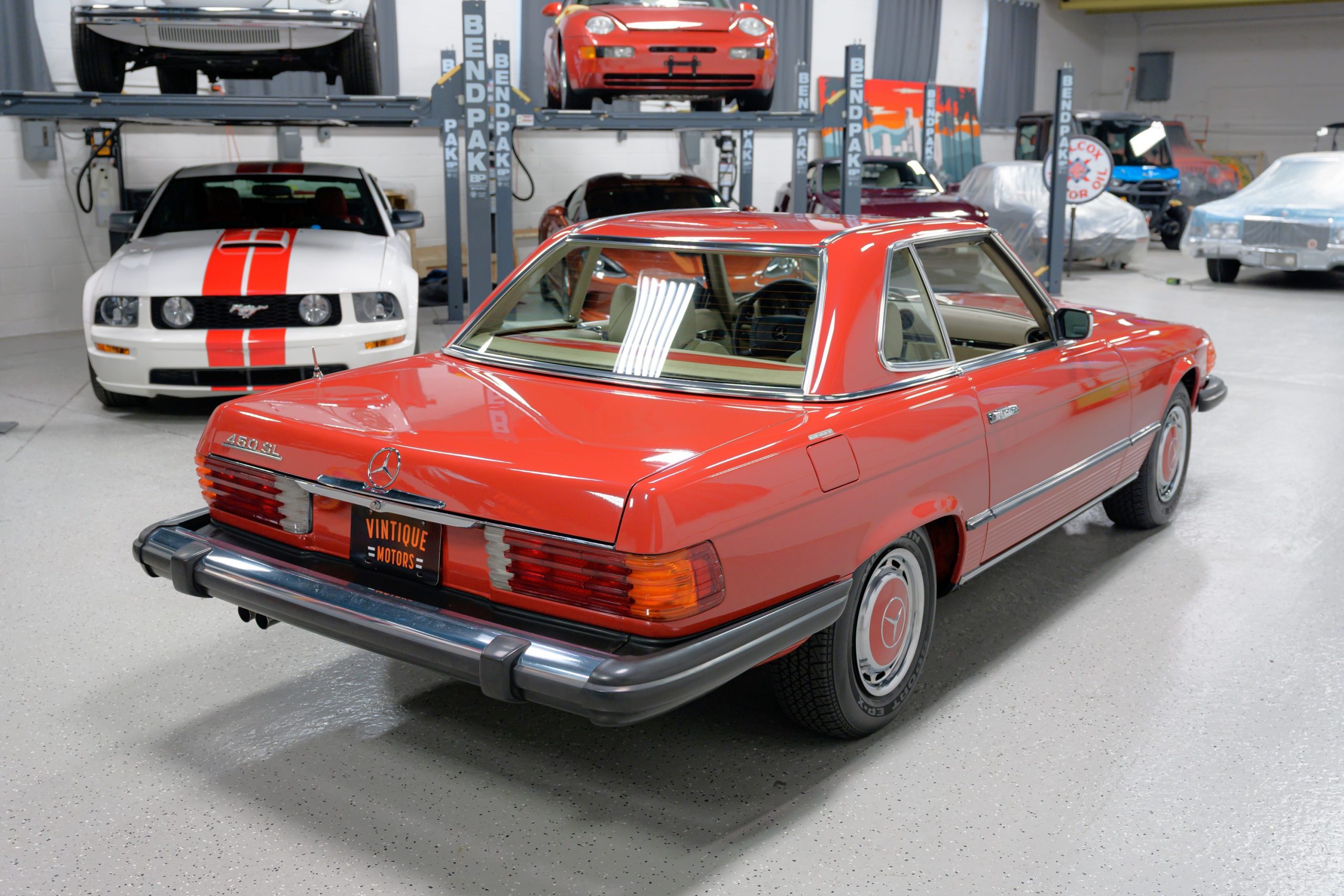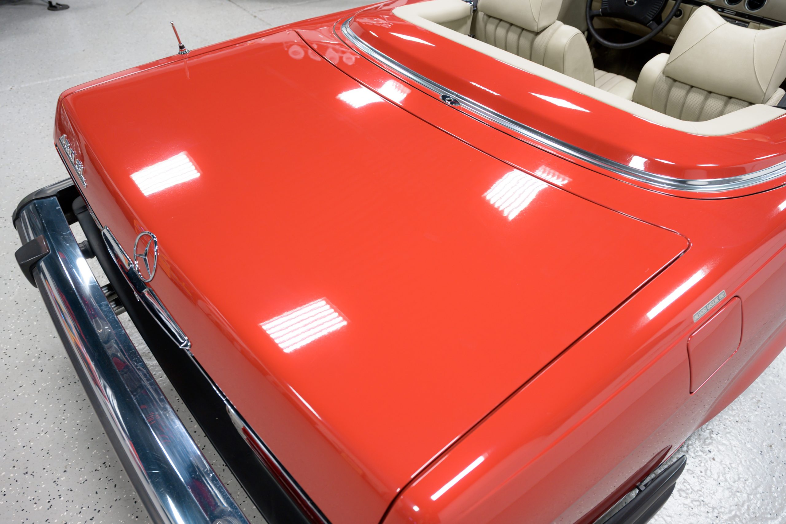 This 450SL is beautifully finished in rare Carnelian Red over a cream MB-Tex interior with a black soft top and a color-matched painted hardtop. Under the hood is a 4.5L M117 V8 featuring Bosch D-Jetronic fuel injection and was factory rated at 180 horsepower and 220 lb-ft of torque mated to a 3-speed automatic transmission.
