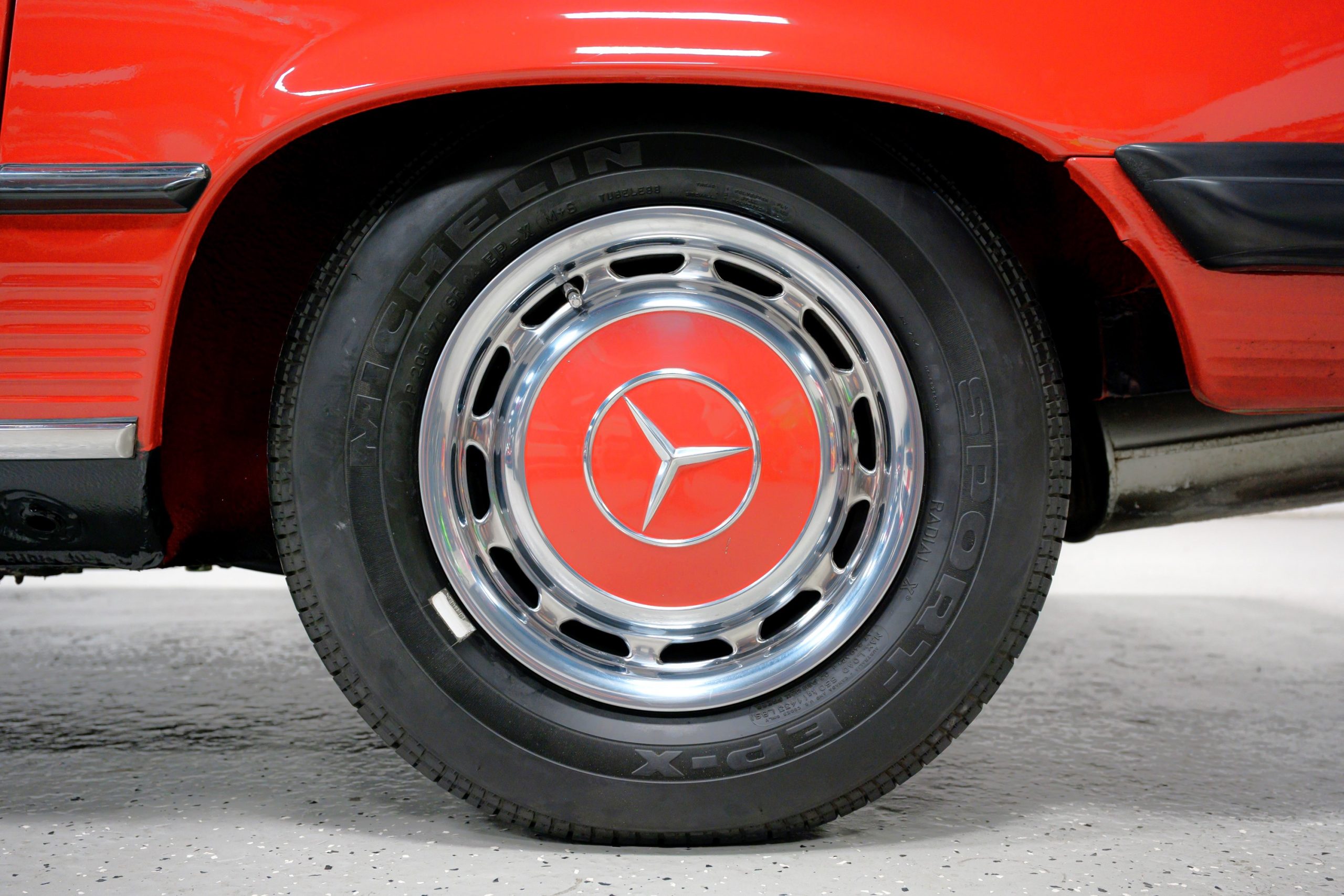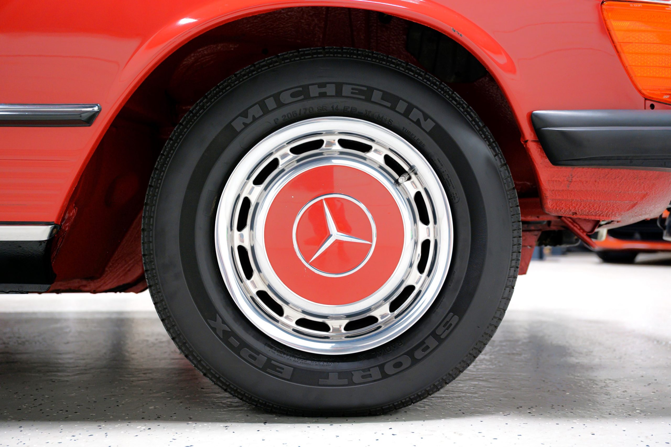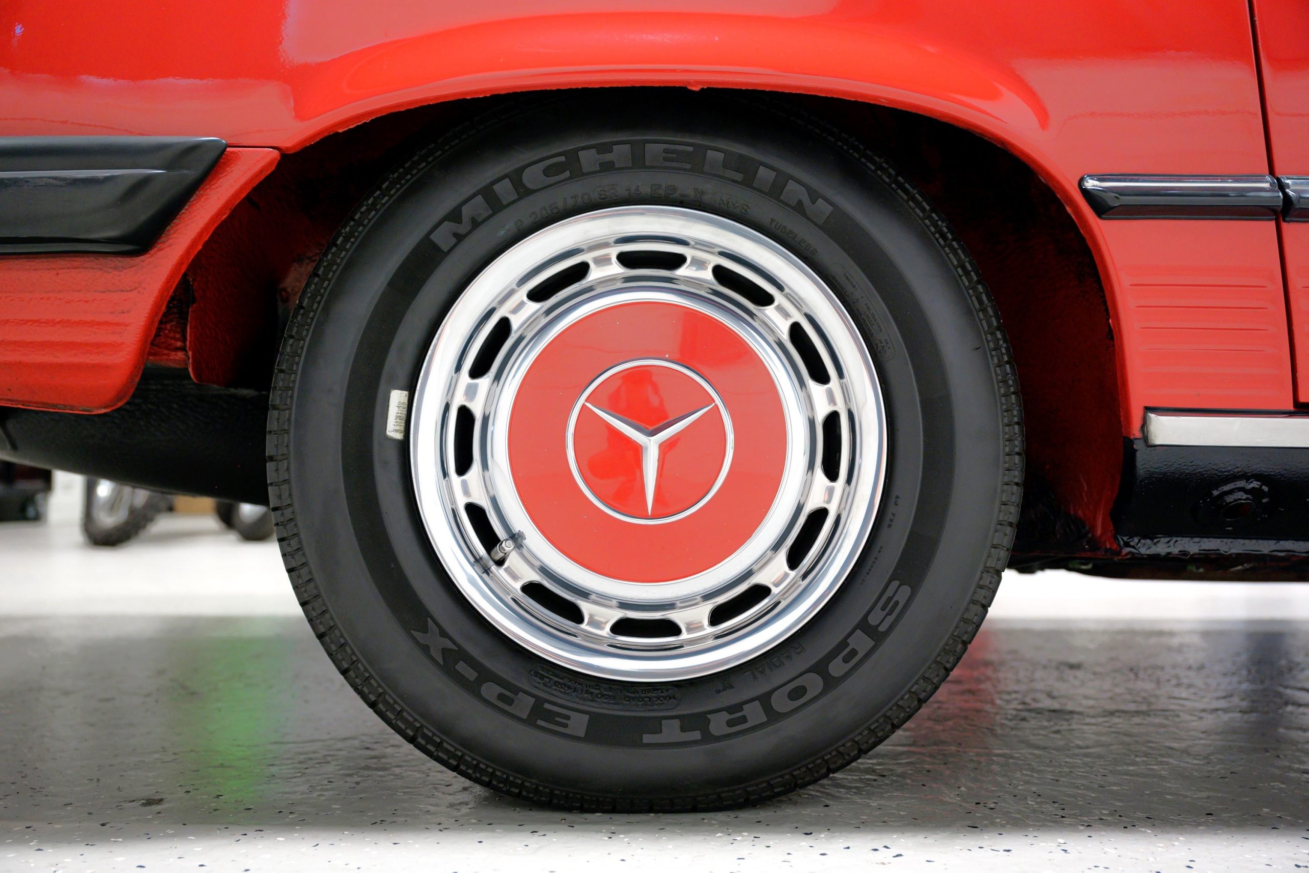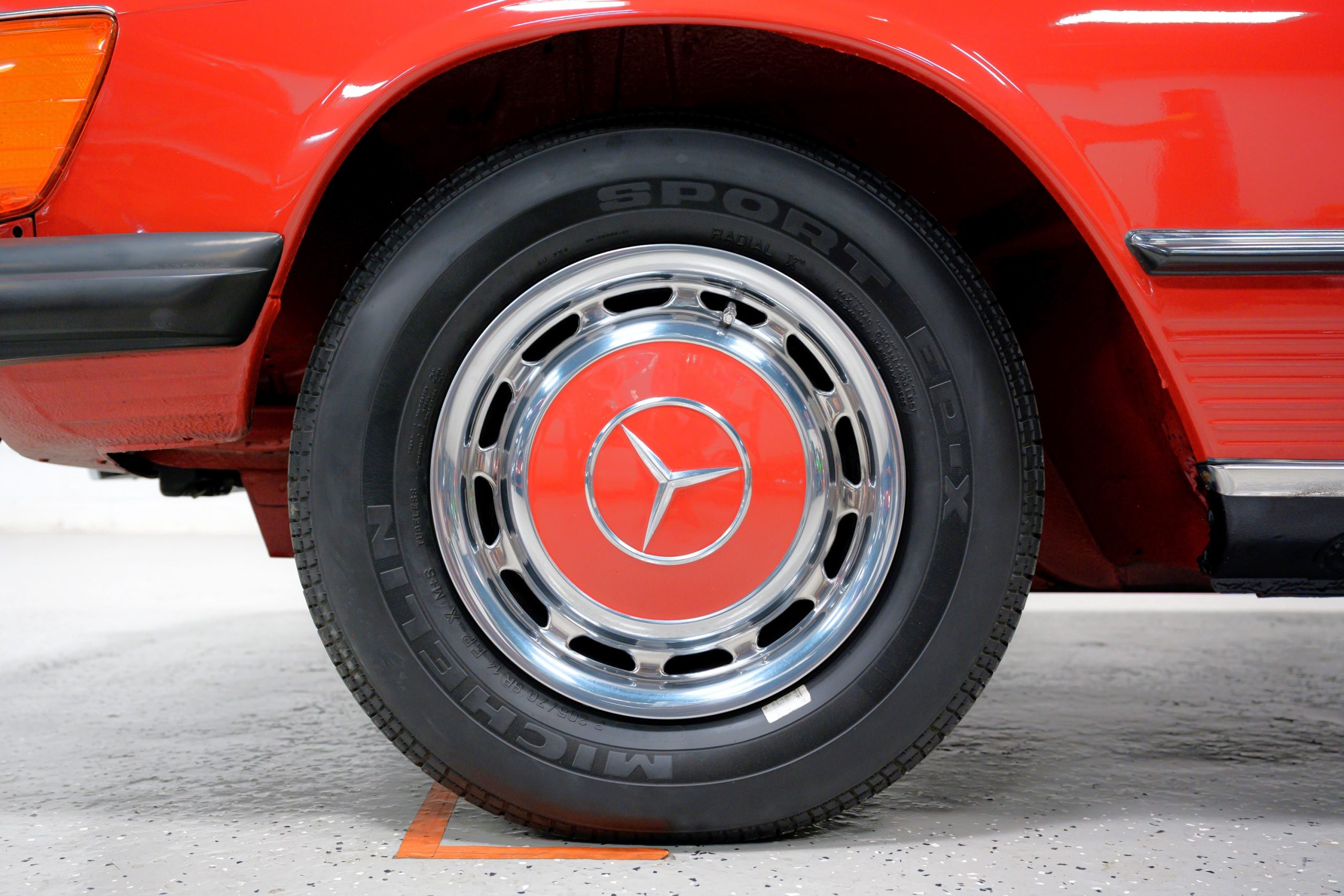 Equipment includes a body-color removable hardtop, a black soft top, fog lights, air conditioning, power steering, power disc brakes, a Becker Grand Prix stereo with power antenna, central locking, and power windows. It is also equipped with 14″ steel wheels with bright covers and color-matched painted centers mounted with 205/70 Michelin Sport EP-X tires.