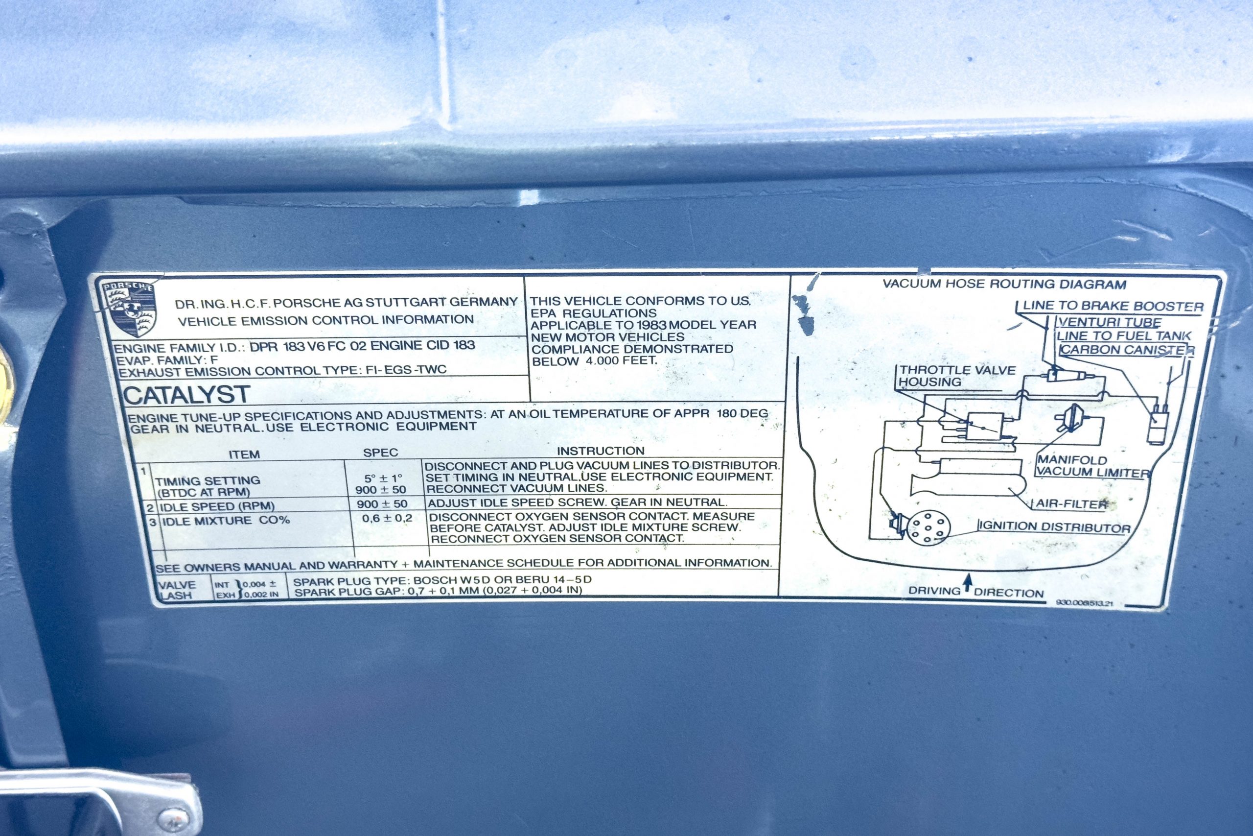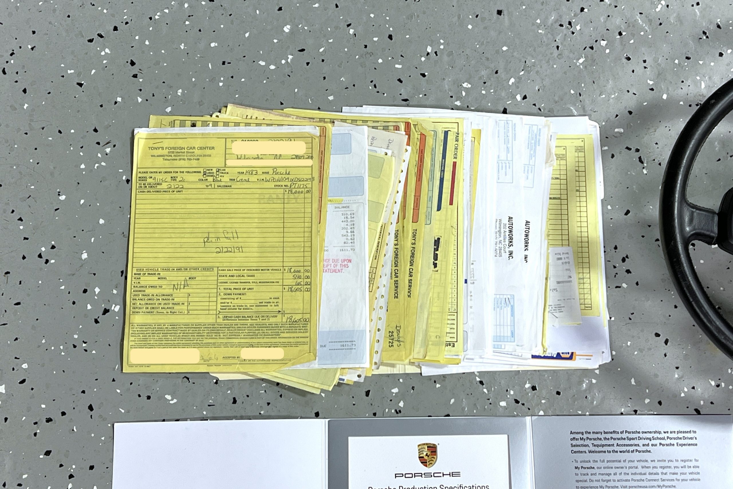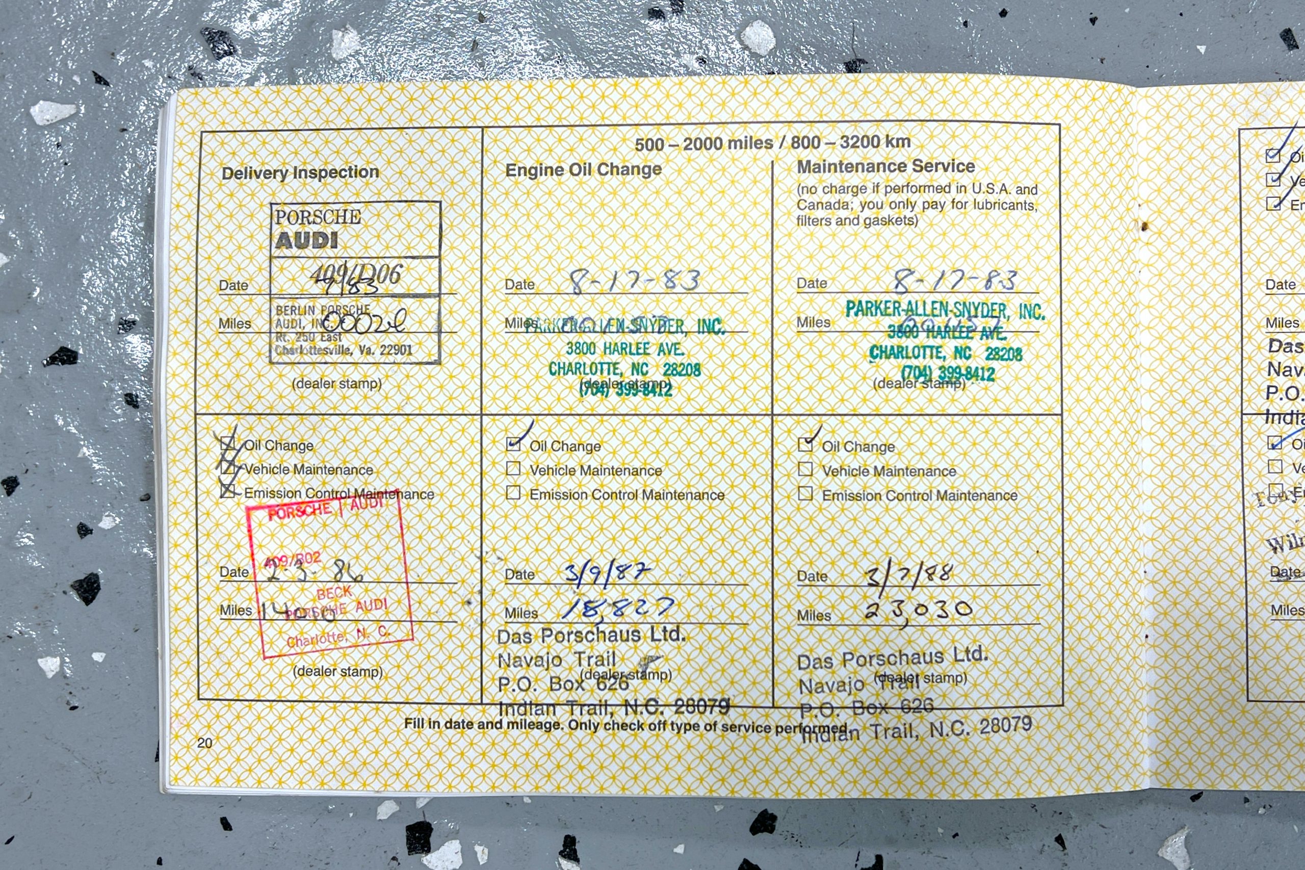 Per the stamped service booklet, it was sold new at Berlin Porsche and Audi in Charlottsville, VA on 7/15/1983 to Mr. and Mrs. Lewis from Gastonia, NC who retained it for approximately 8 years until 1991. They had it serviced by Parker-Allen-Snyder and Beck Porsche in Charlotte, NC as well as Das Porschaus in Indian Trail, NC during their ownership documenting mileage increments through 32,500 miles.