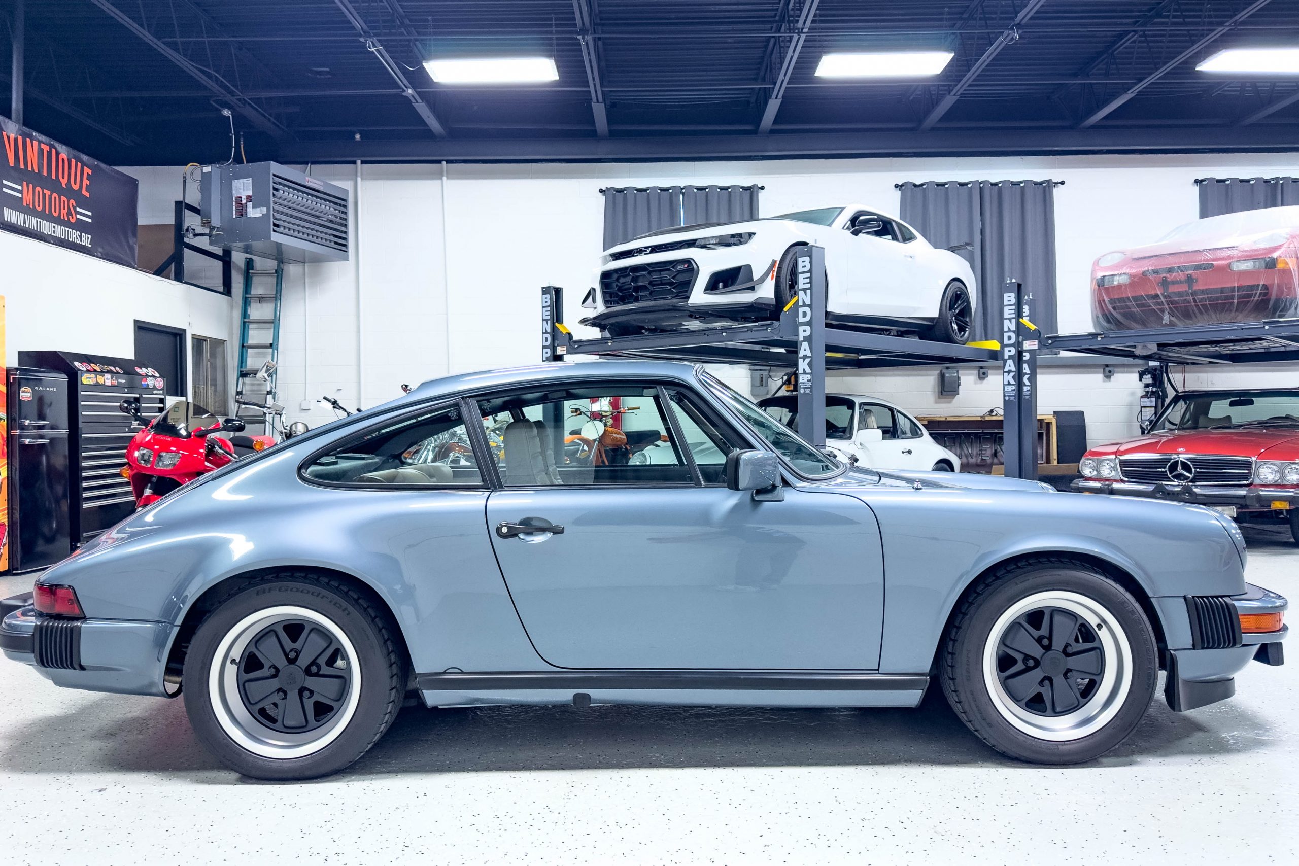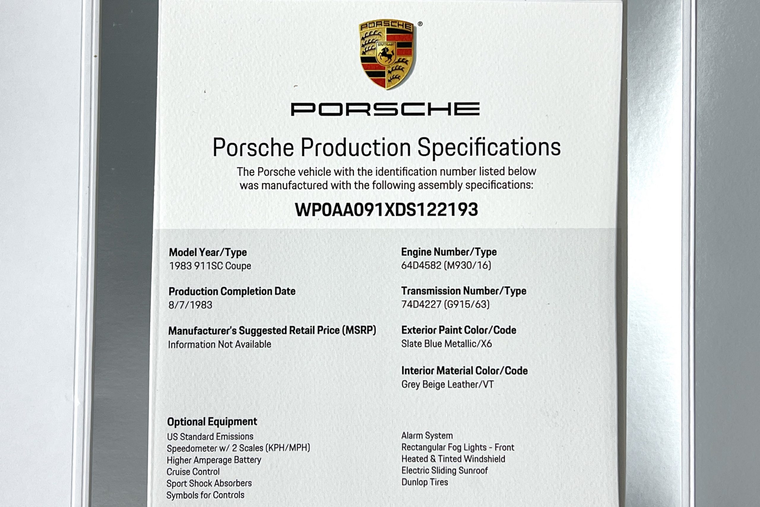 On offer is this 1983 Porsche 911SC Coupe beautifully finished in its original factory colors of Slate Blue Metallic over a Grey Beige leather interior complete with a 3.0L flat 6-cylinder engine with Bosch fuel injection rated at 172 horsepower and 189 lb-ft of torque mated to type 915 5-speed manual transmission. Per the Porsche Certificate of Authenticity its factory optional equipment consists of U.S. standard emissions, KPH and MPH speedometer, higher amperage battery, cruise control, sport shock absorbers, symbols for controls, alarm system, rectangular fog lights, heated and tinted windshield, electric sunroof, and Dunlop tires.