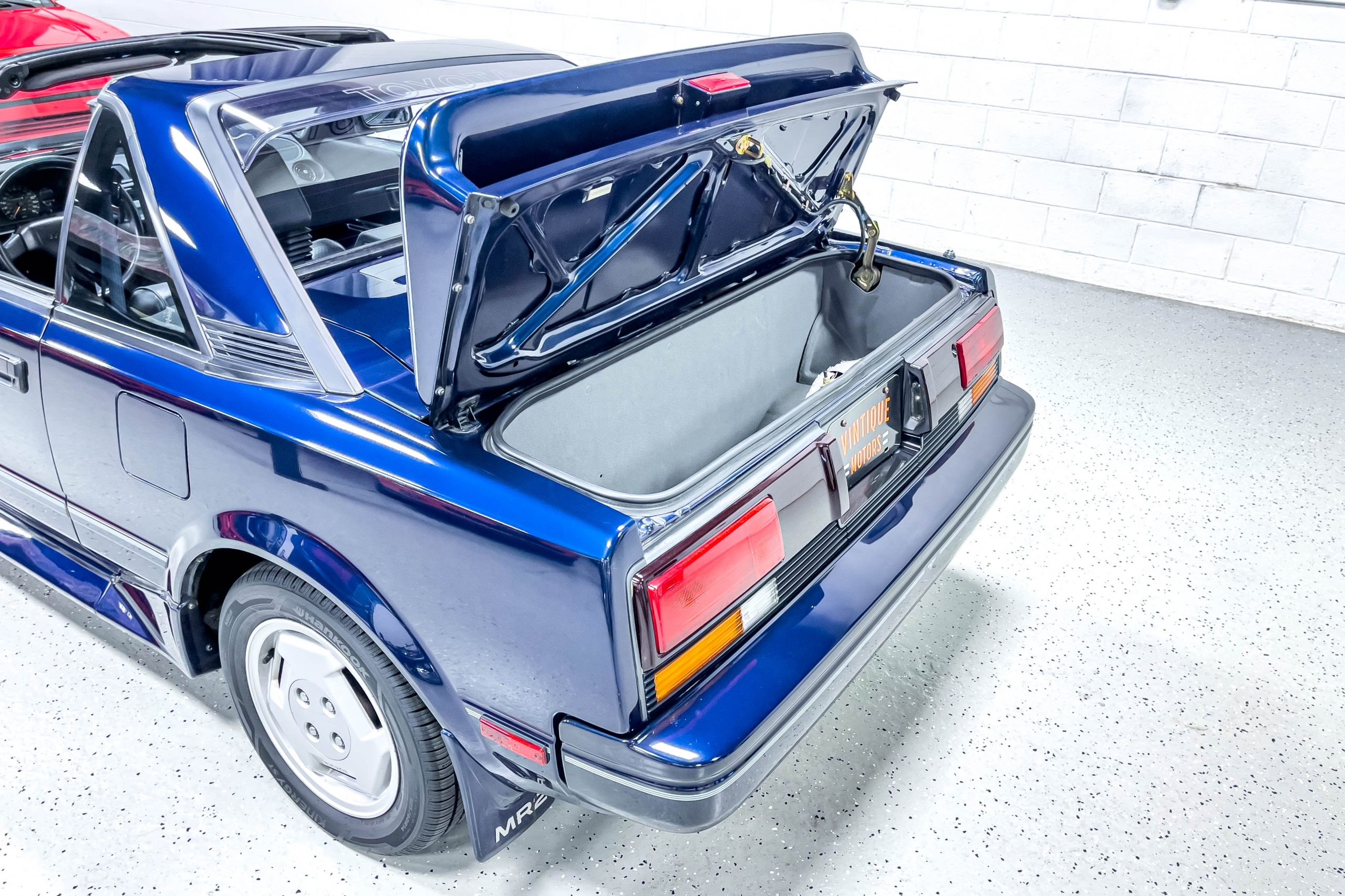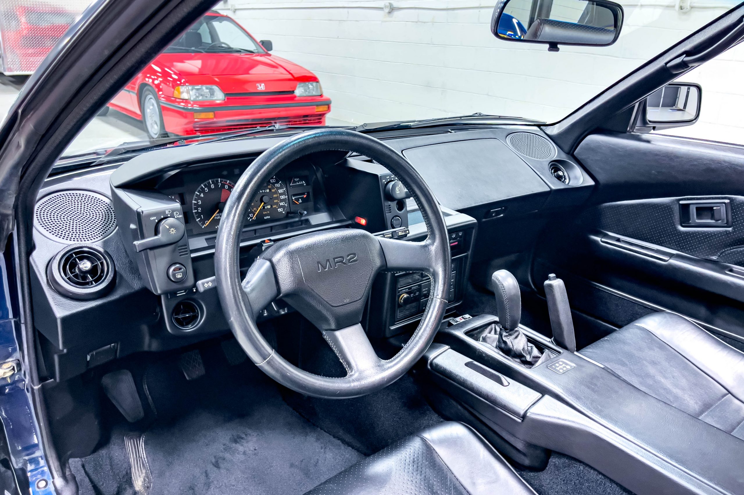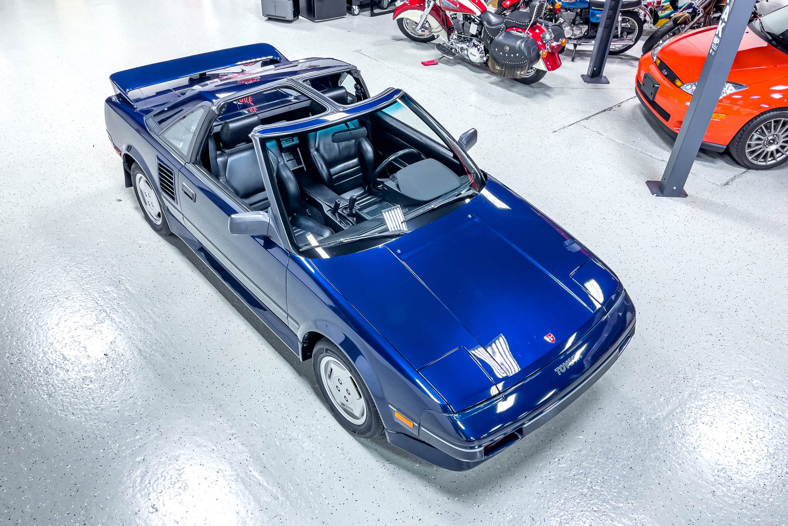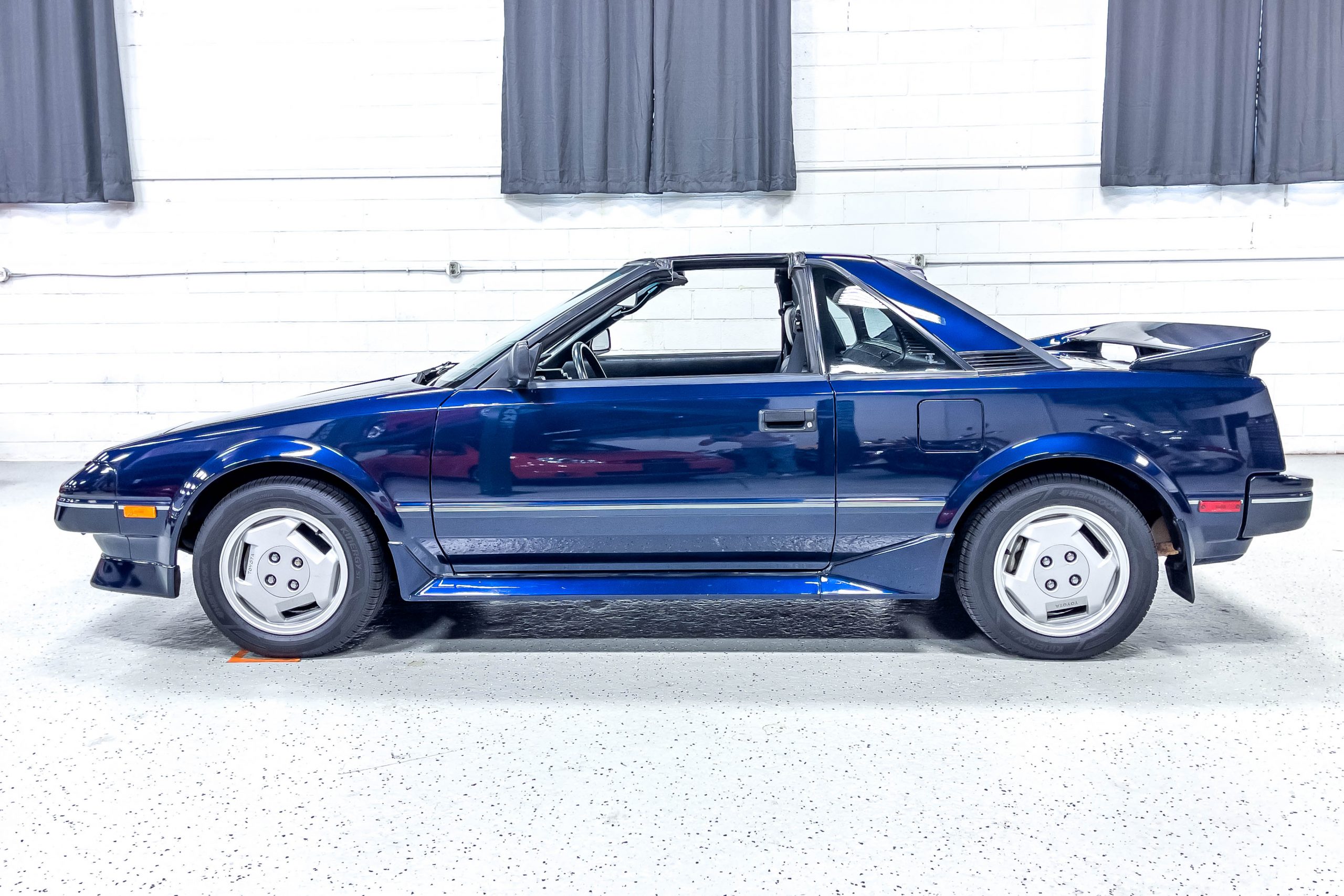 This MR2 is finished in its factory shade of Dark Blue Pearl over a black leather interior and features a 1.6L 4-cylinder engine mated to a 5-speed manual transmission. The mid-mounted engine features fuel injection and DOHC and was rated at 112 horsepower and 97 lb.-ft. of torque. Additional standard features include 4-wheel power disc brakes, 4-wheel independent suspension, tilt steering wheel, digital clock, and a rear window defogger. This example is well equipped with several desirable options and packages consisting of 14″ aluminum alloy wheels, Aero Package with color-keyed rear spoiler, Performance Interior Package with 7-way leather bucket seats, Power Package with power windows and locks, Super Sound AM/FM/MPX receiver with equalizer, air conditioning, cruise control, removable T-top glass roof panels, alarm system, and mudguards.