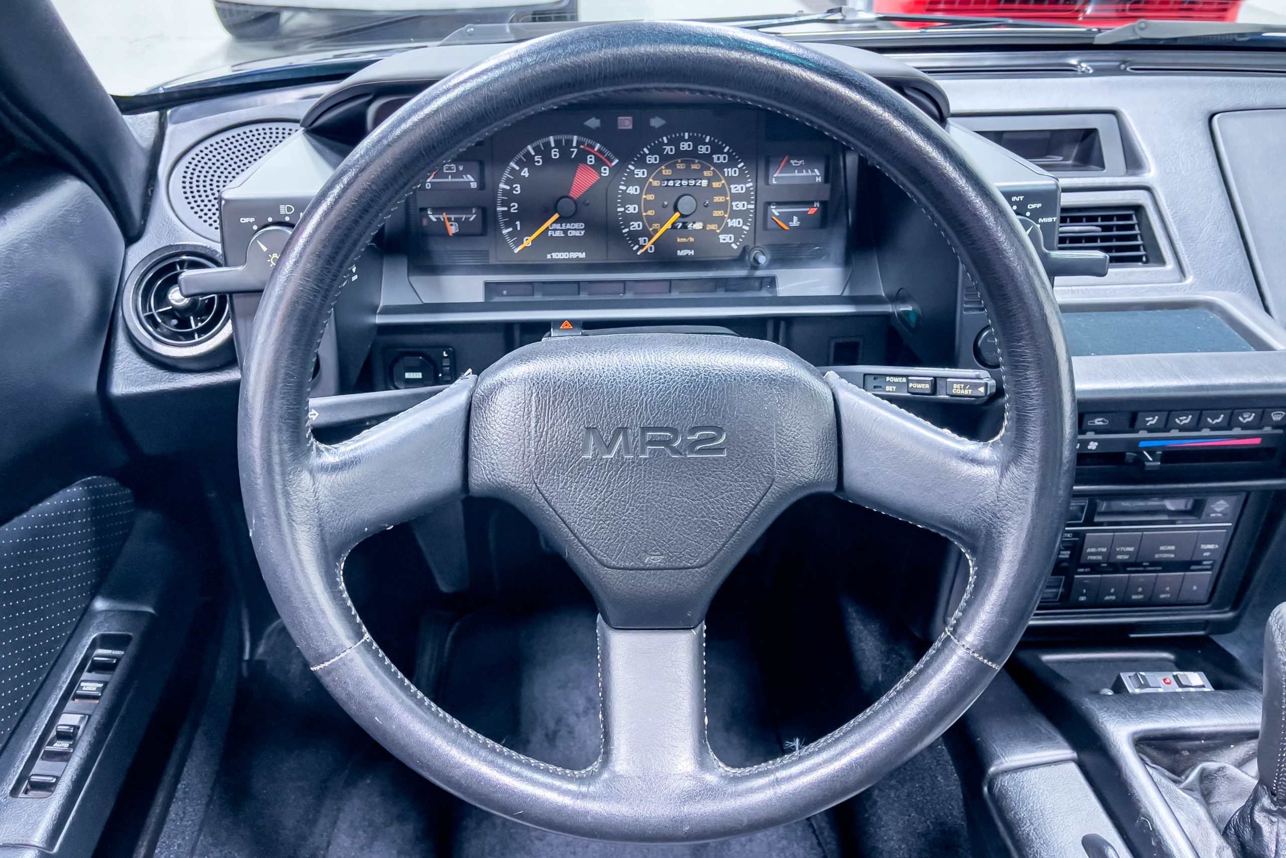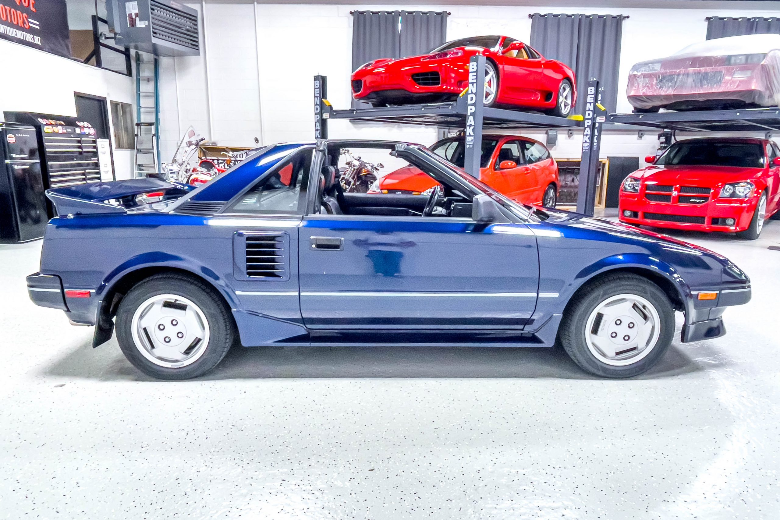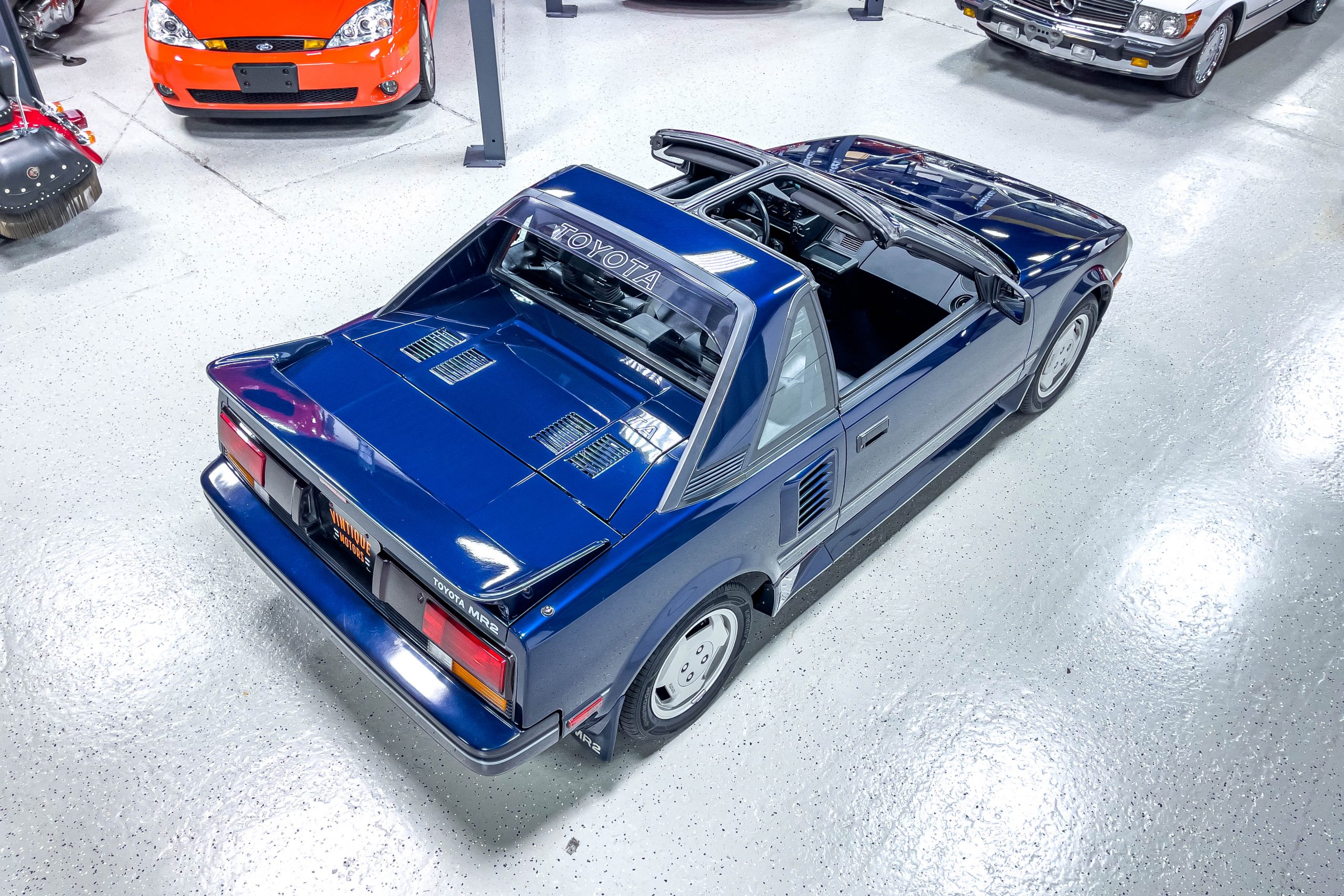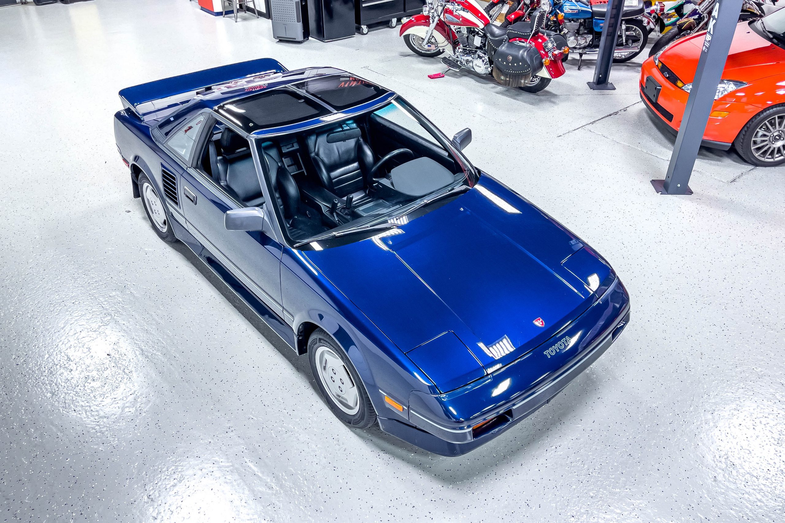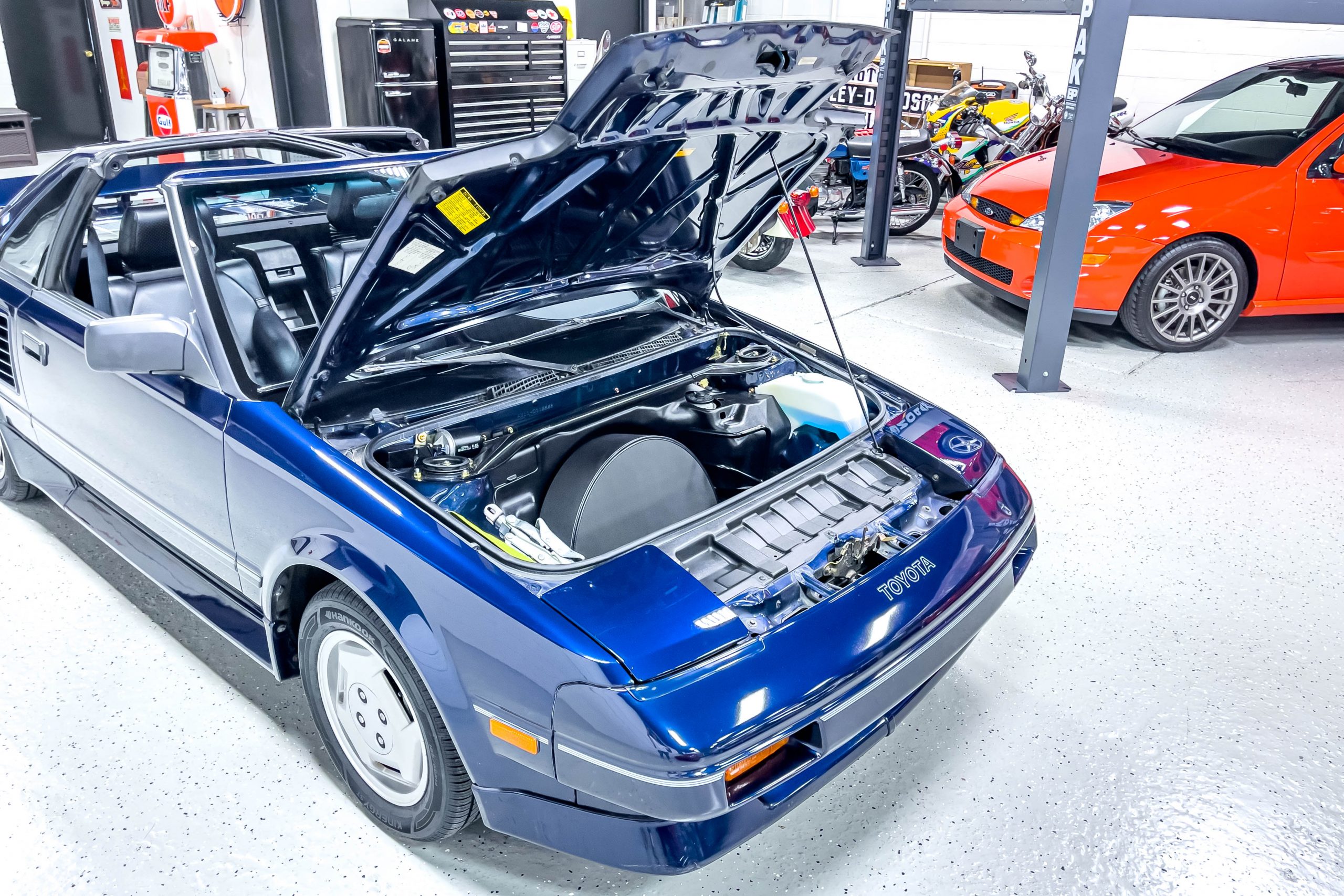 This MR2 is finished in its factory shade of Dark Blue Pearl over a black leather interior and features a 1.6L 4-cylinder engine mated to a 5-speed manual transmission. The mid-mounted engine features fuel injection and DOHC and was rated at 112 horsepower and 97 lb.-ft. of torque. Additional standard features include 4-wheel power disc brakes, 4-wheel independent suspension, tilt steering wheel, digital clock, and a rear window defogger. This example is well equipped with several desirable options and packages consisting of 14″ aluminum alloy wheels, Aero Package with color-keyed rear spoiler, Performance Interior Package with 7-way leather bucket seats, Power Package with power windows and locks, Super Sound AM/FM/MPX receiver with equalizer, air conditioning, cruise control, removable T-top glass roof panels, alarm system, and mudguards.