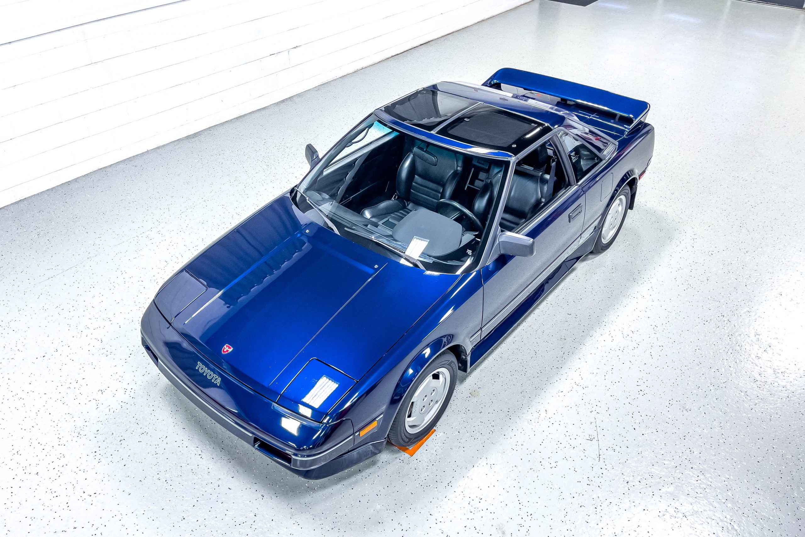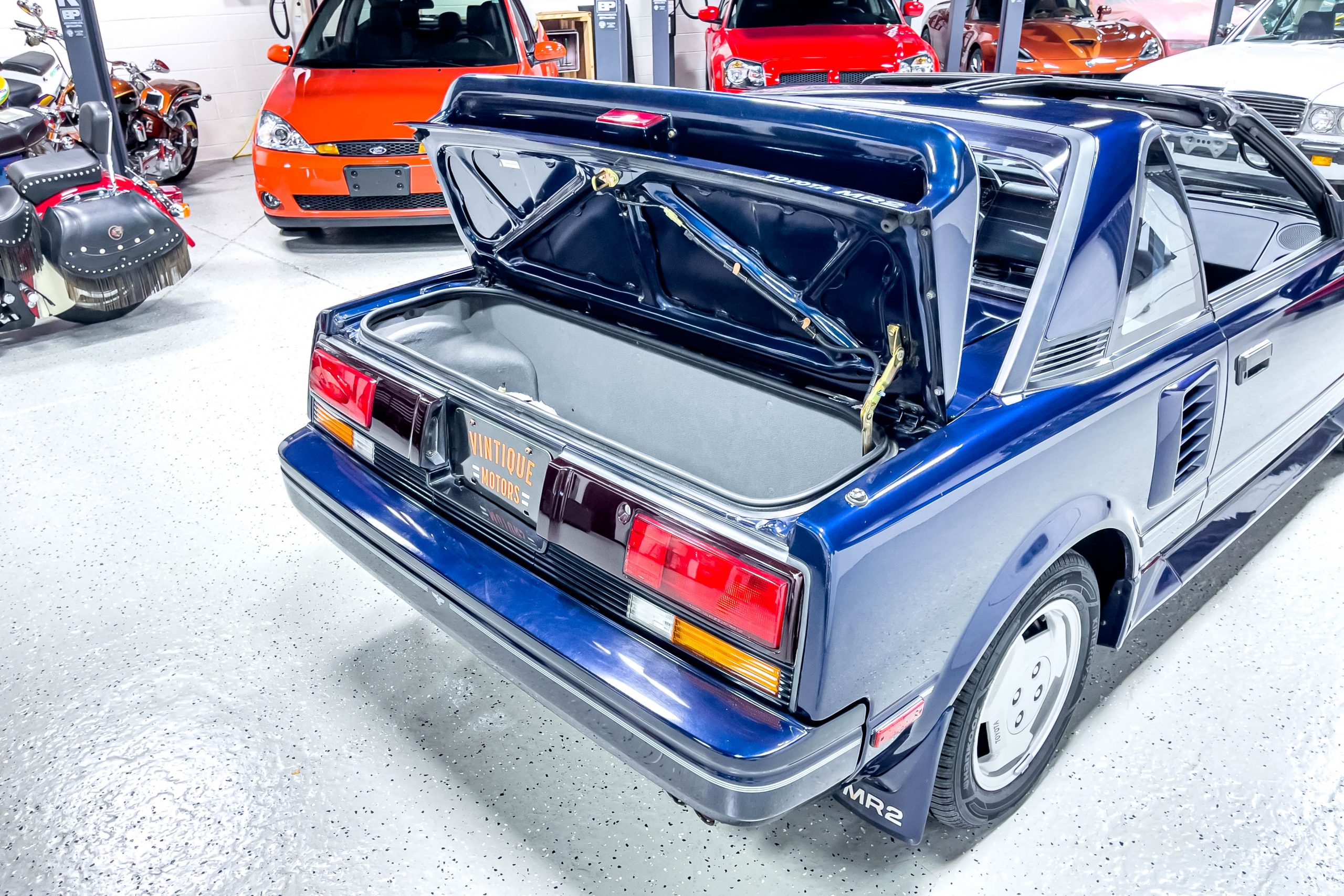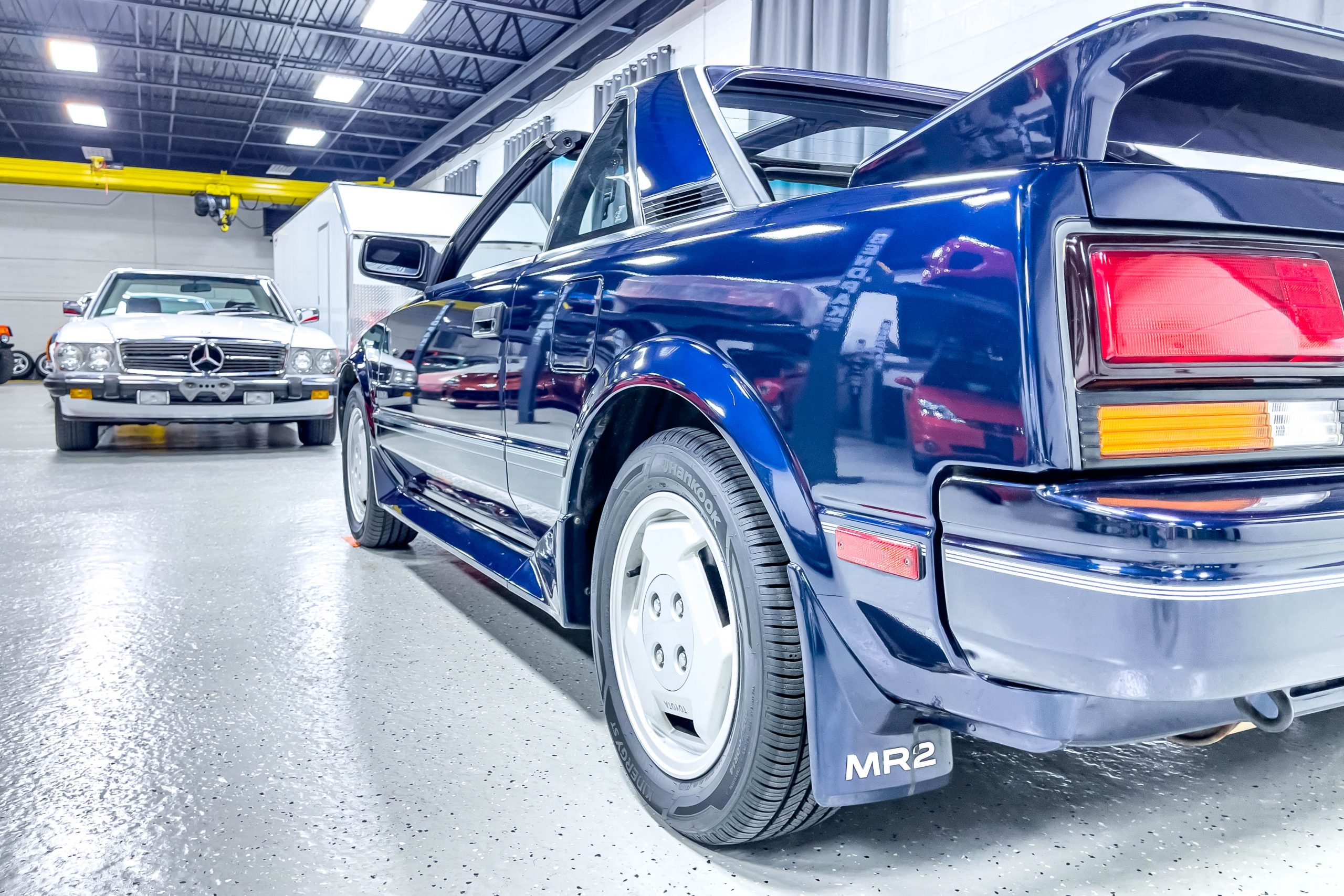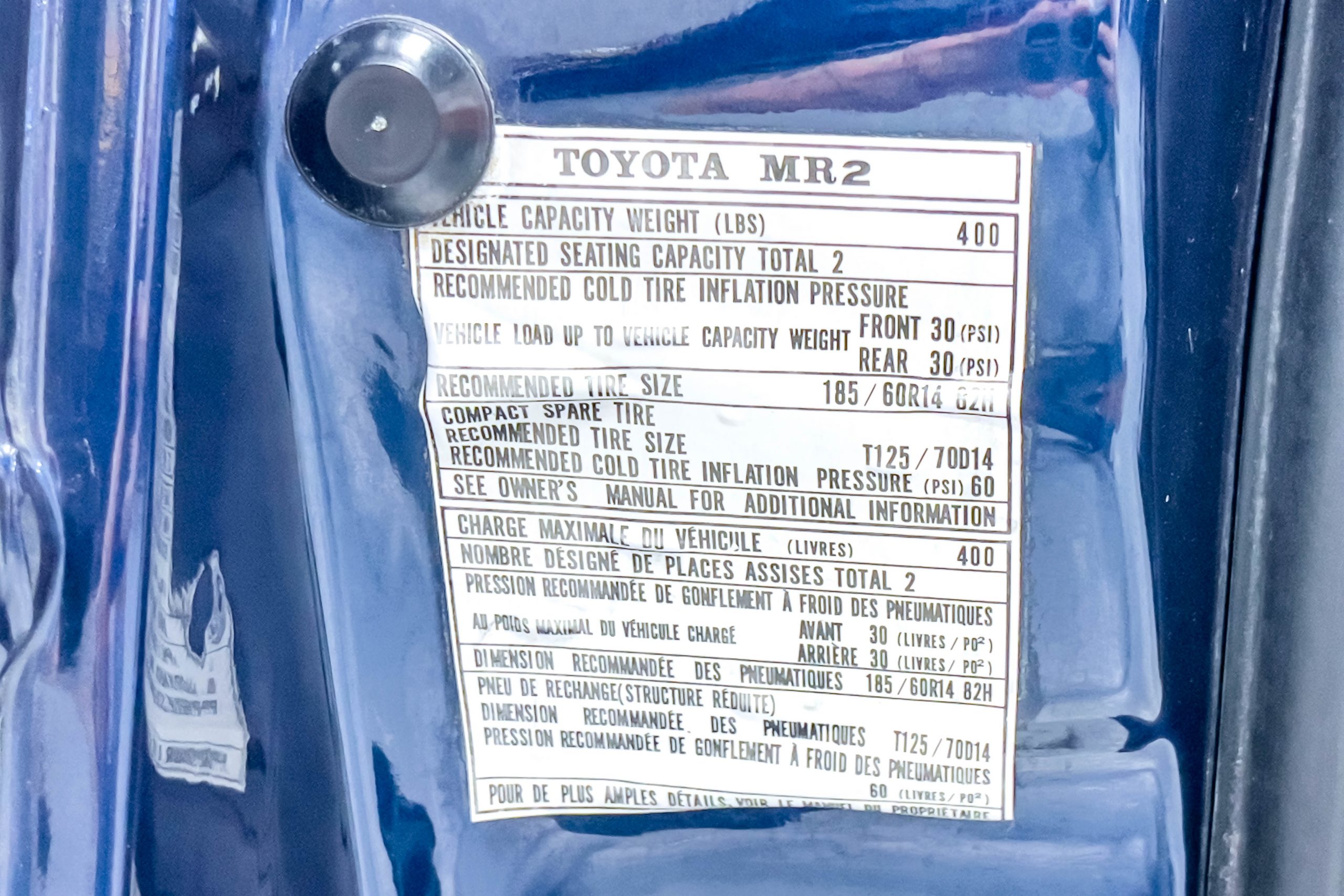 This MR2 is finished in its factory shade of Dark Blue Pearl over a black leather interior and features a 1.6L 4-cylinder engine mated to a 5-speed manual transmission. The mid-mounted engine features fuel injection and DOHC and was rated at 112 horsepower and 97 lb.-ft. of torque. Additional standard features include 4-wheel power disc brakes, 4-wheel independent suspension, tilt steering wheel, digital clock, and a rear window defogger. This example is well equipped with several desirable options and packages consisting of 14″ aluminum alloy wheels, Aero Package with color-keyed rear spoiler, Performance Interior Package with 7-way leather bucket seats, Power Package with power windows and locks, Super Sound AM/FM/MPX receiver with equalizer, air conditioning, cruise control, removable T-top glass roof panels, alarm system, and mudguards.