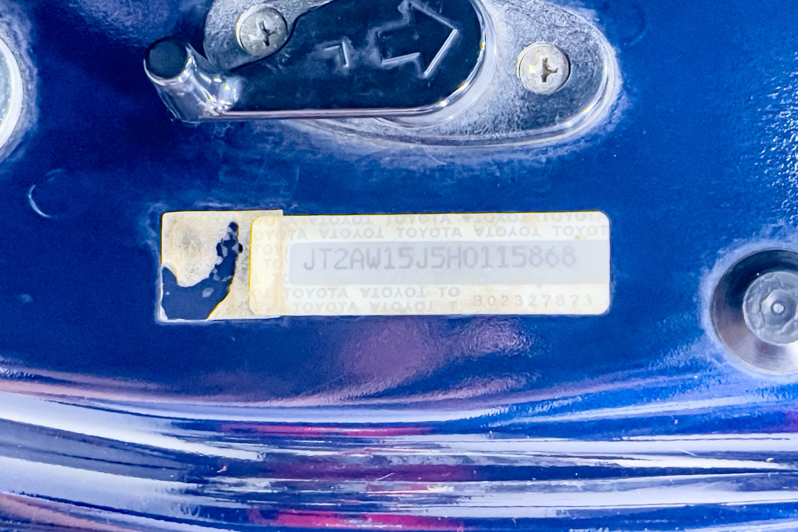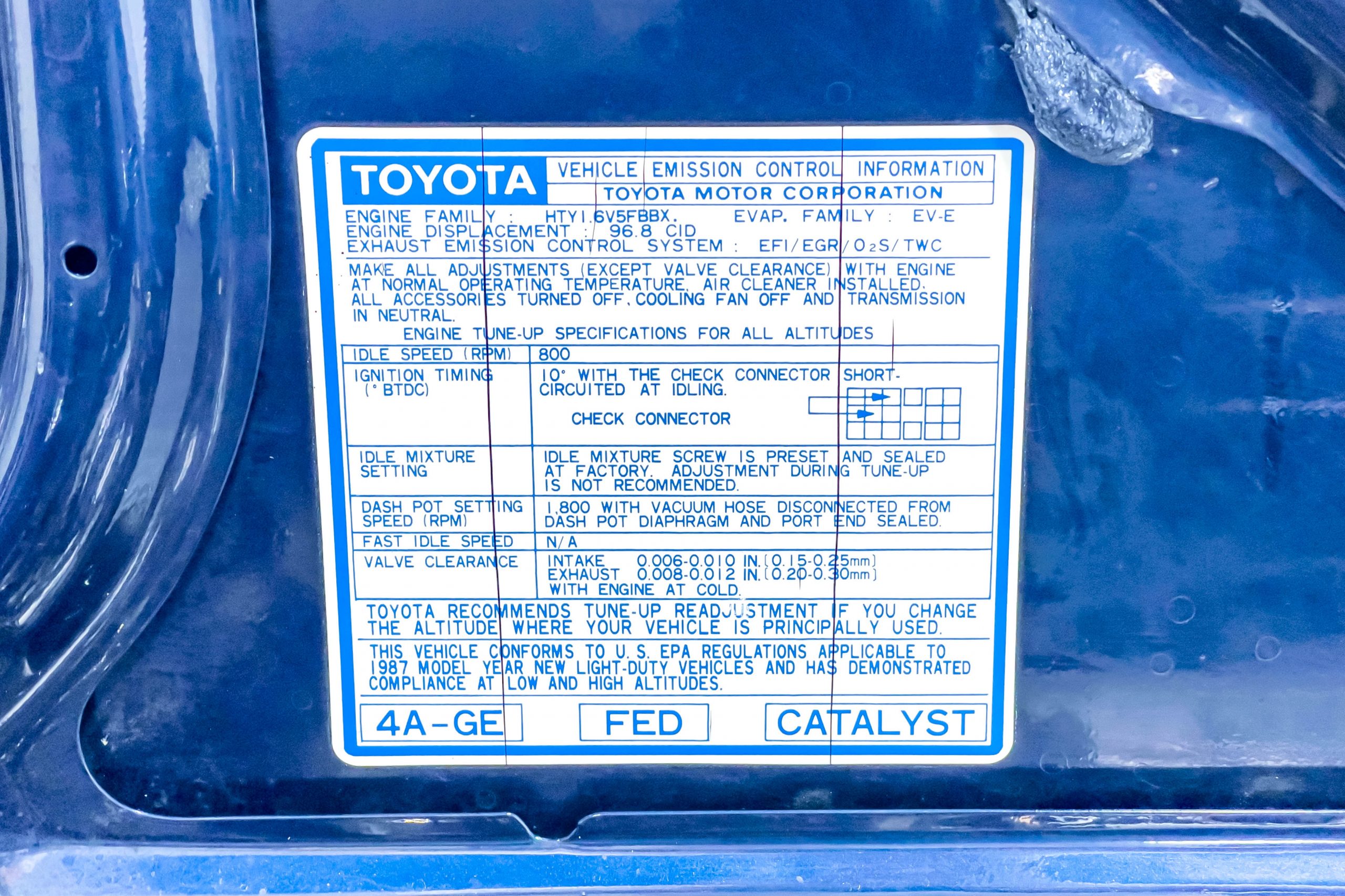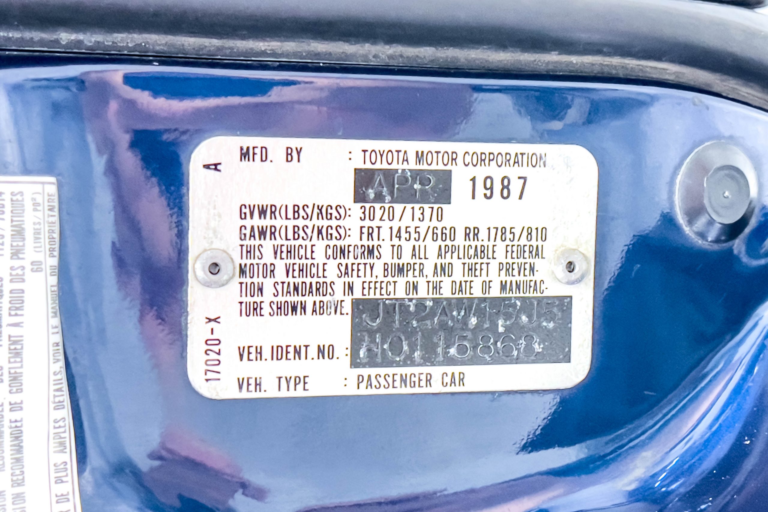 It was purchased new in Michigan, believed to be from Bob Saks Toyota in Farmington Hills, MI, on 6/3/1987 and subsequently registered in Walled Lake, MI. It would remain with the original owner for 36 years until his passing in which it was retitled in his spouse’s name on 1/9/2023 for the purposes of selling it. It had been in storage for 21 years as its last registration tag is from 2002 in which a friend of the family also from Walled Lake, MI came to understand the original owner’s widow was going to donate it and instead, he purchased it on 7/25/2023 becoming the DeFacto second owner. Being mechanically inclined, he went through the car front to back replacing and updating components to return it top operating condition. Following this, as a friend of ours he contacted us to gauge our interest in purchasing it in which we acquired it from him on 8/25/2023. We proceeded to install new Hankook Kinergy ST tires in factory sized 185/60R14 and conduct an in-house detailing and two-stage paint correction and polishing.