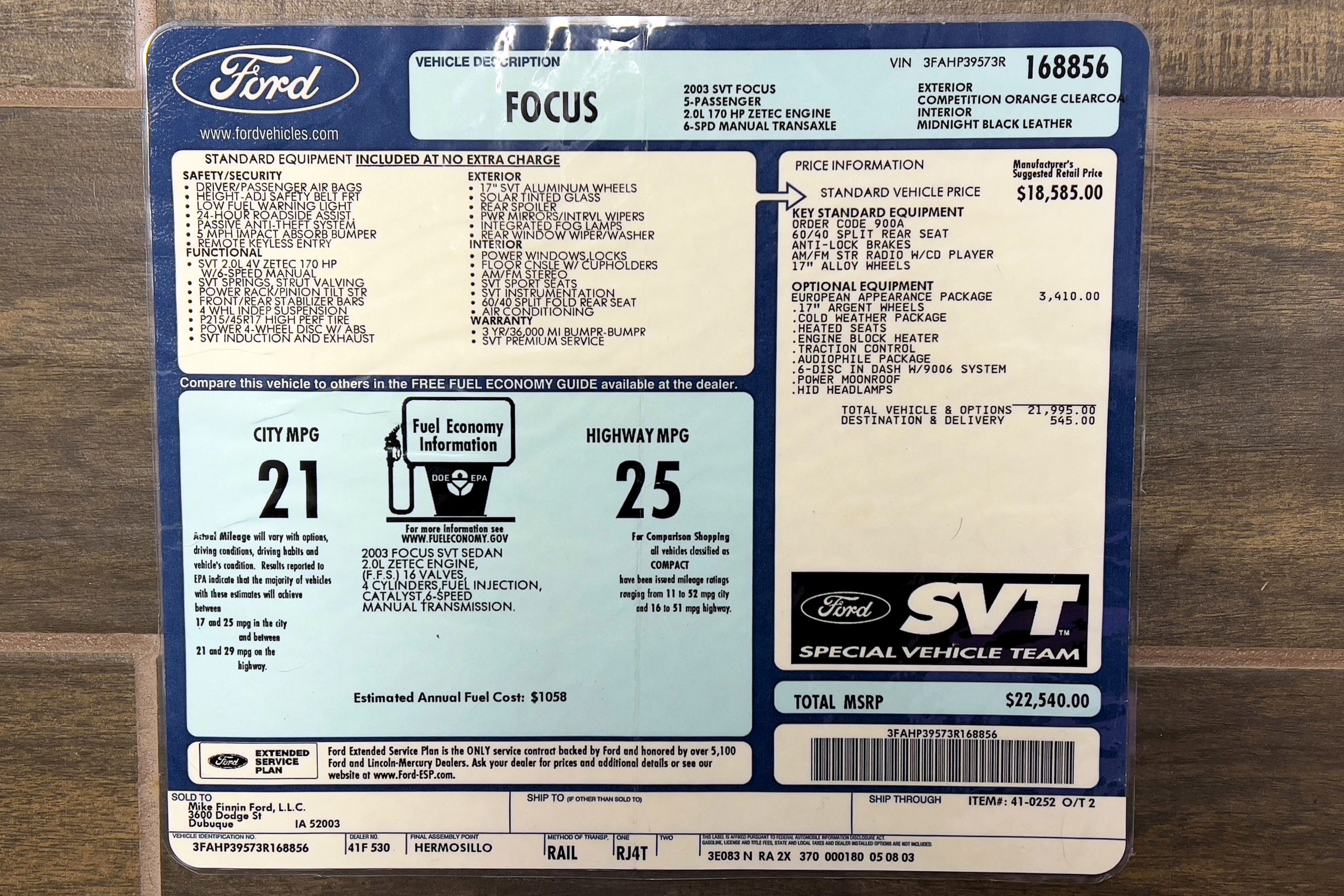 This ’03 Focus SVT was sold new at Mike Finnin Ford in Dubuqu, IA on 1/31/2004 and subsequently registered in Platteville, WI where it would remain with its original owner until our acquisition on 10/6/2023 with 343 miles and today it is offered with 345 miles. It is built in likely the most desirable spec with the $3,410 European Appearance Package and finished in Competition Orange with an original MSRP of $22,540. Per our research on Ford’s production figures, it is reported that 14,003 Focus SVT’s were produced: 10,751 as 3-door coupes and 3,252 as 5-door sedans. Of these 14,003 produced, just 422 of these were Competition Orange 3-door coupes; 301 for model year 2003 and 121 for model year 2004.