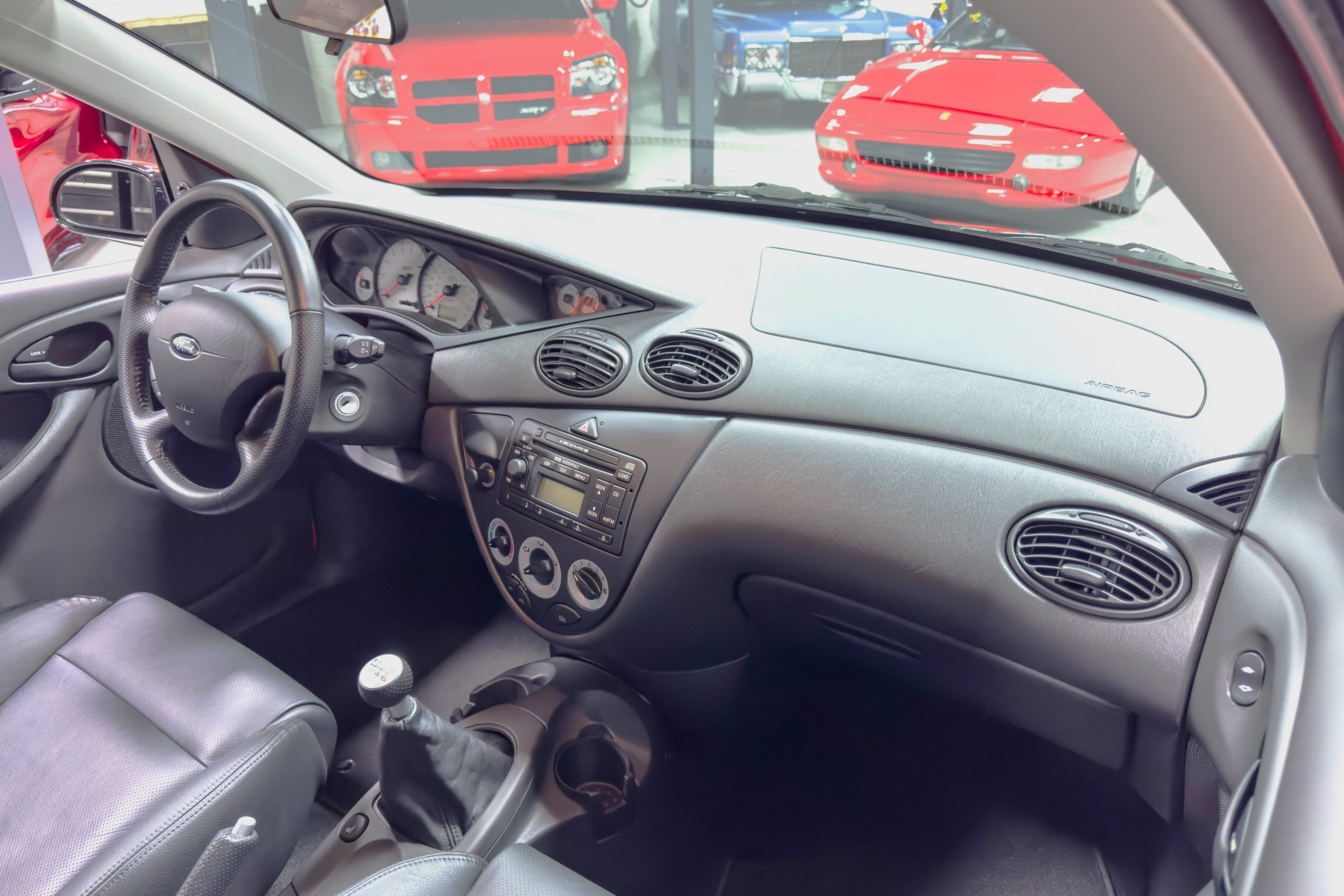 Additional enhancements by the SVT team included revised front and rear bumper facias’, side skirts, fog lamps, rear diffuser, hatch lip spoiler, and 17″ 5-spoke alloy wheels wearing sticky “Y” rated 215/45R17 Continental tires. For 2003, Ford offered the European Appearance Package which included HID headlights, power moonroof, the audiophile package with 6-disc in dash system, cold weather package with heated black perforated leather Recaro seats, engine block heater, traction control, and 15-spoke Dark Argent colored 17″ wheels. Additionally, only cars optioned with this package could be ordered in either Screamin’ Yellow or Competition Orange.