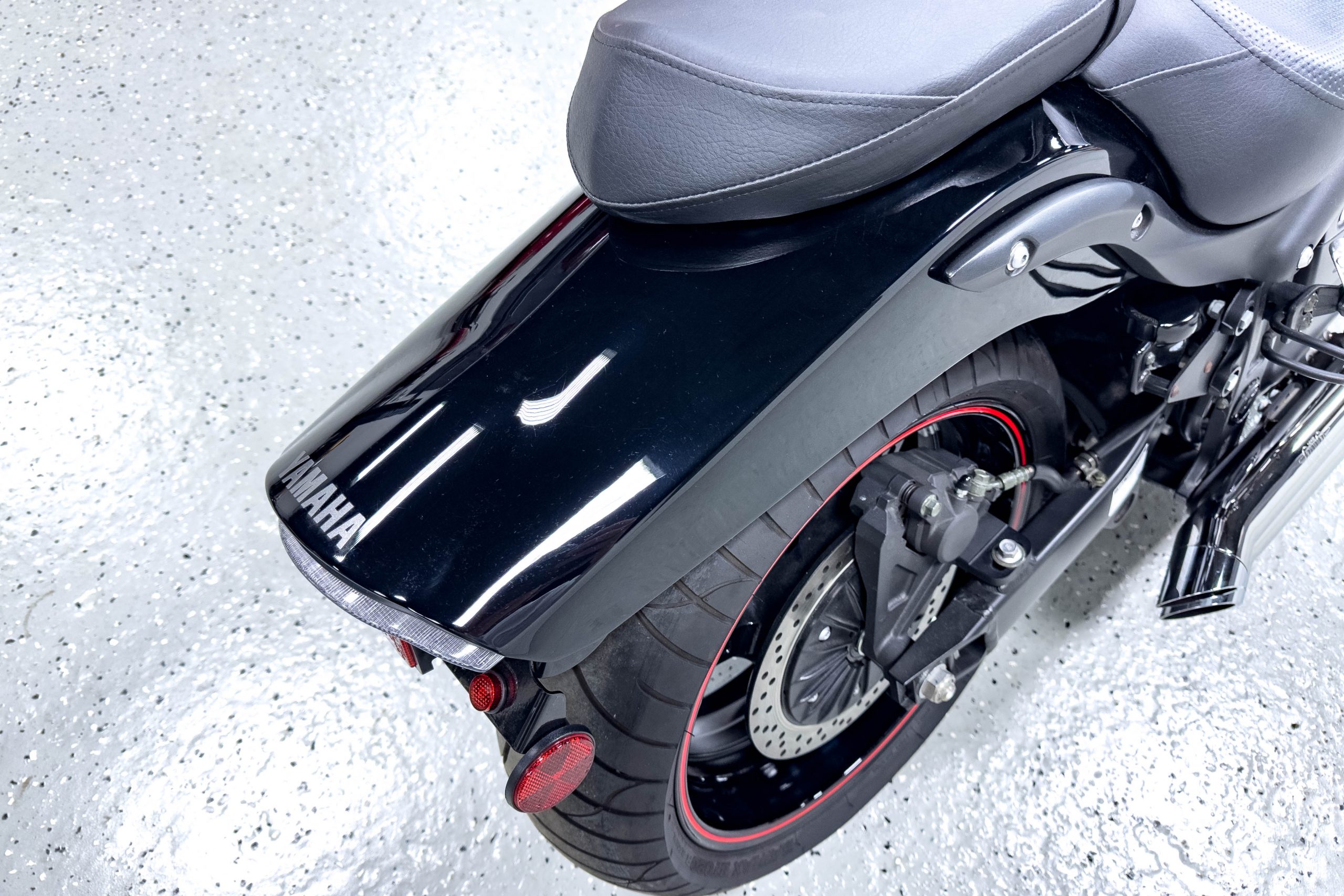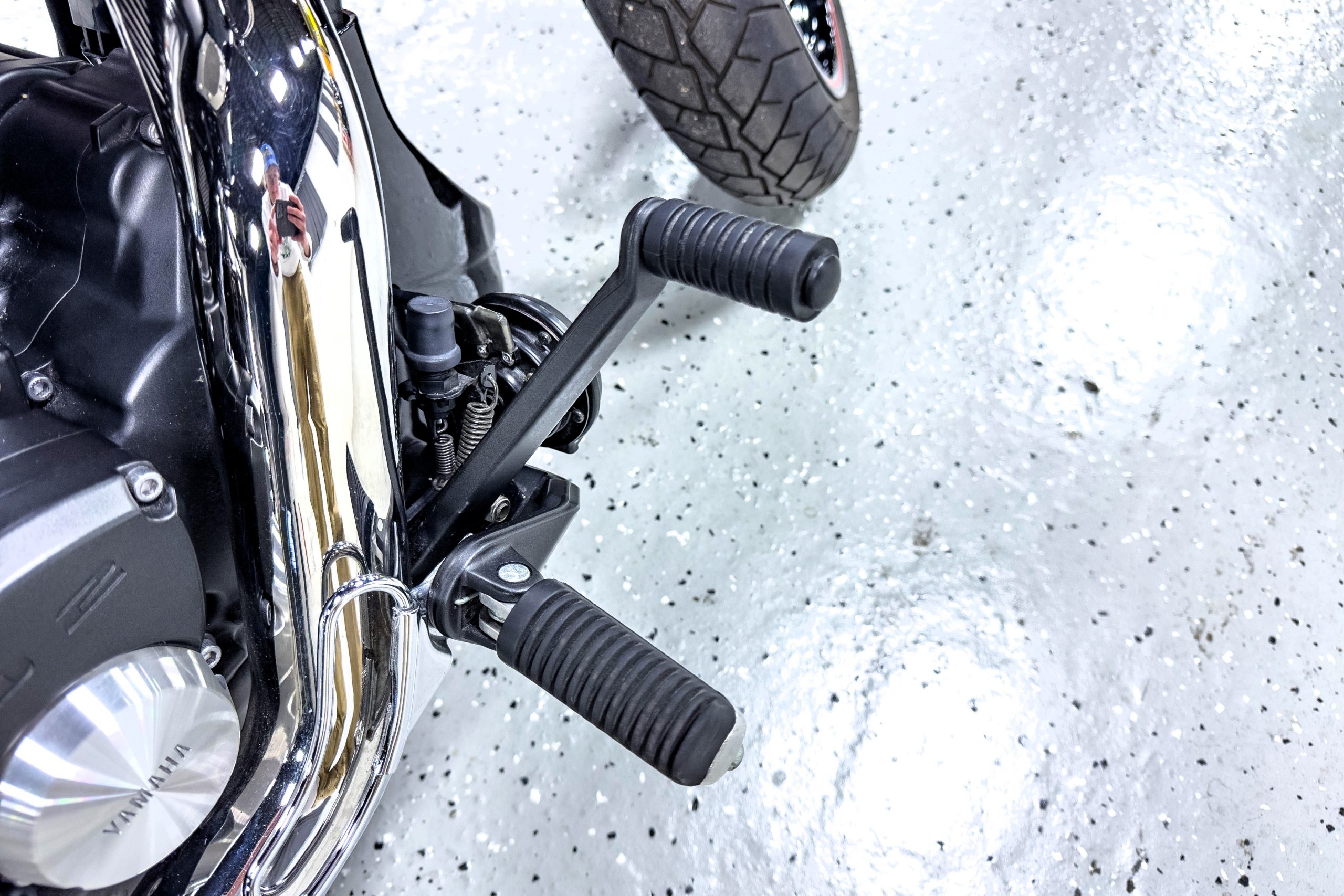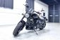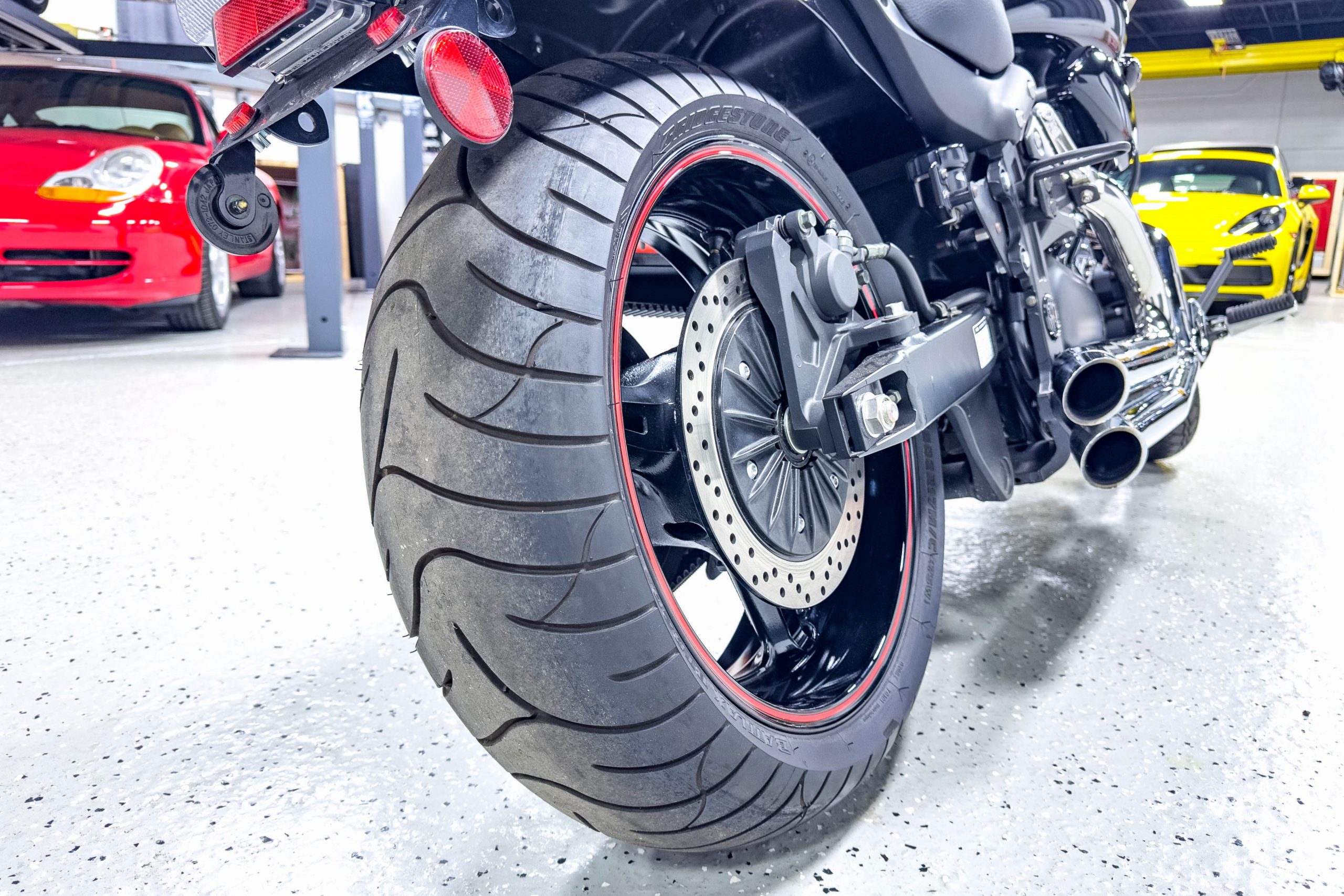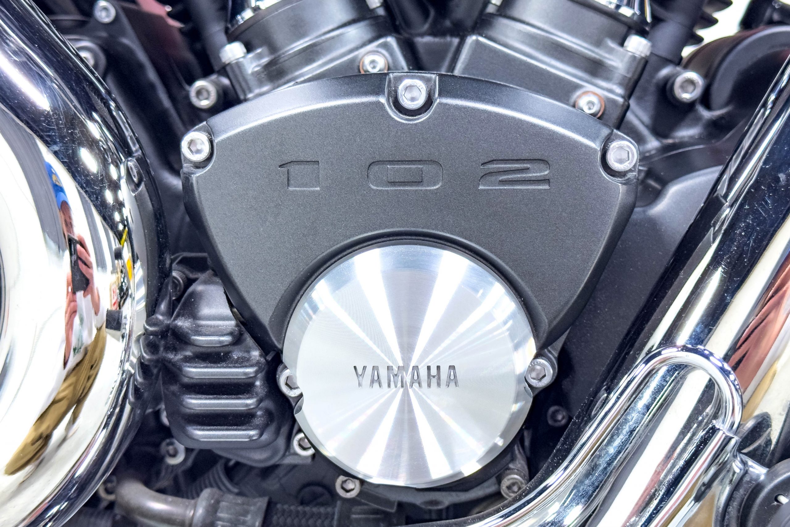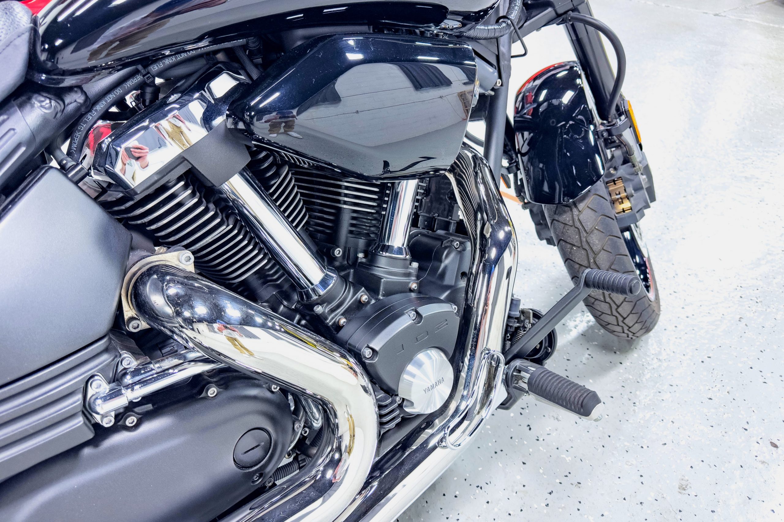 The Midnight Warrior is powered by a fuel injected 1,670cc 4-stroke V-twin air-cooled engine rated at 84 horsepower at 4,400 rpm and 99 lb.-ft. of torque at 3,750 rpm mated to a 5-speed manual transmission with a wet multi-disc clutch and a belt drive. The bike features an aluminum frame with 41mm Kayaba inverted telescoping front fork suspension borrowed from the R1 super bike and an adjustable link monocross rear suspension. Braking is handled by a dual 298mm front discs and a single 282mm rear disc. It rides on 3-spoke cast aluminum wheels sized 18″ up front with a 120mm tire and a 17″ out back with a 200mm tire. Weighing in at just 606lbs, this cruiser has 7.2 horsepower per 1 pound of weight enabling it to blast through the 1/4 mile in 12.7 seconds at 103mph.