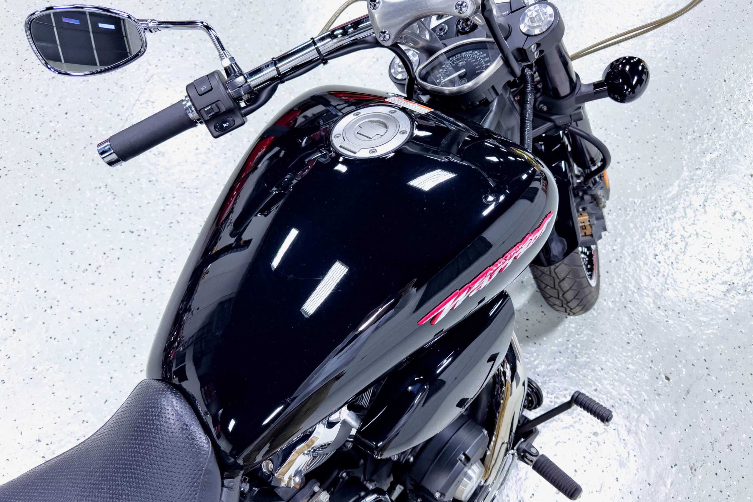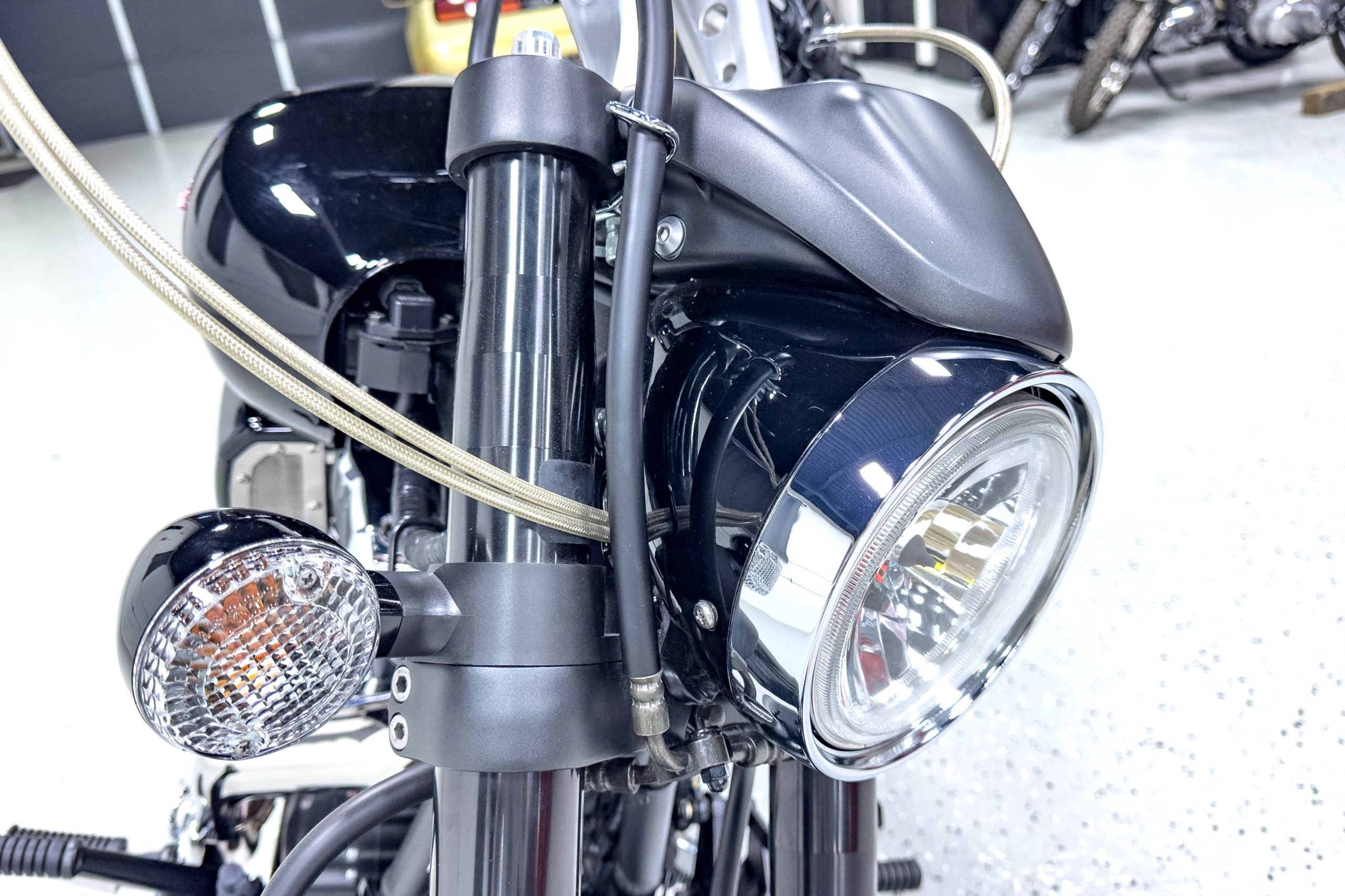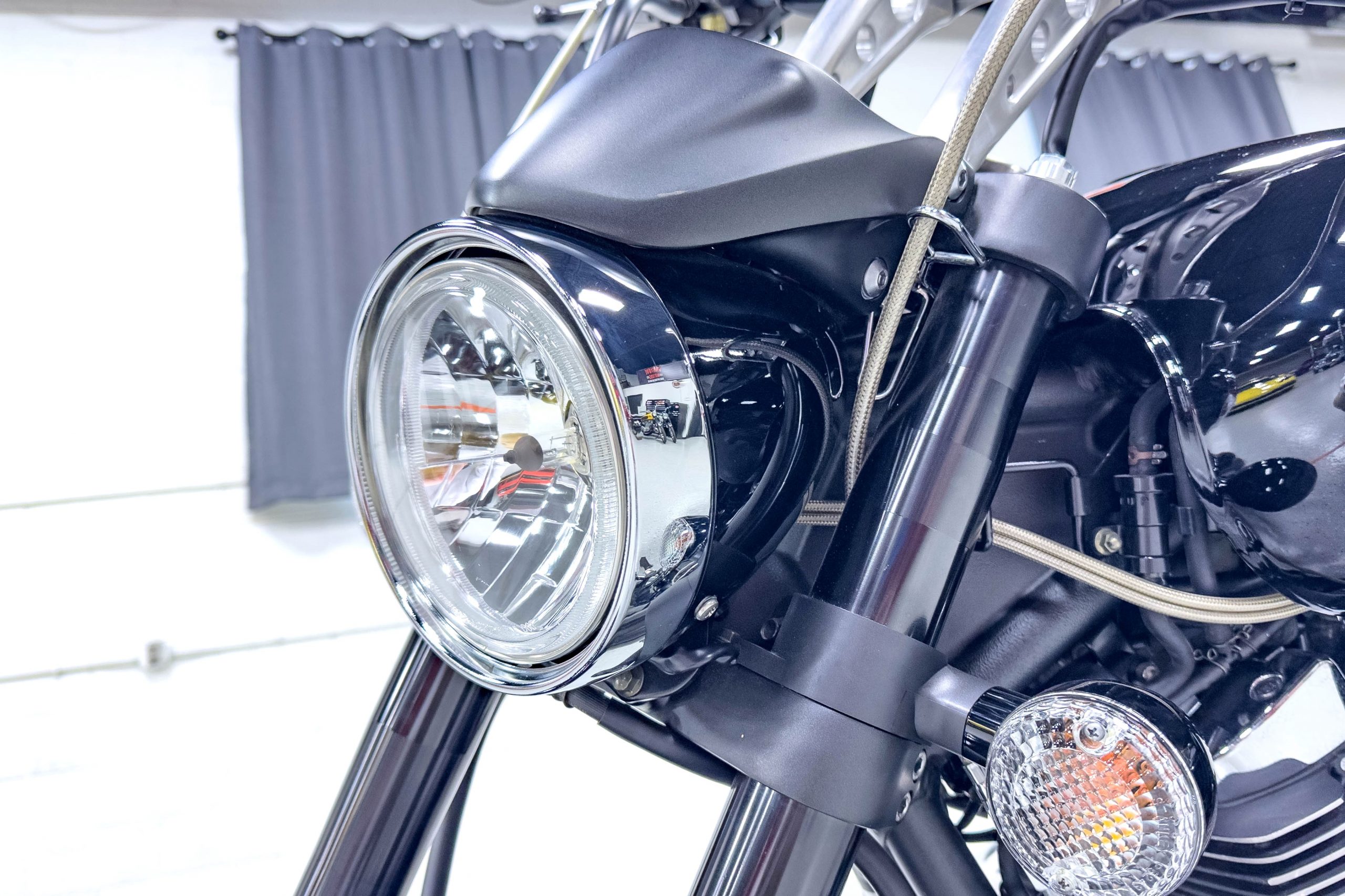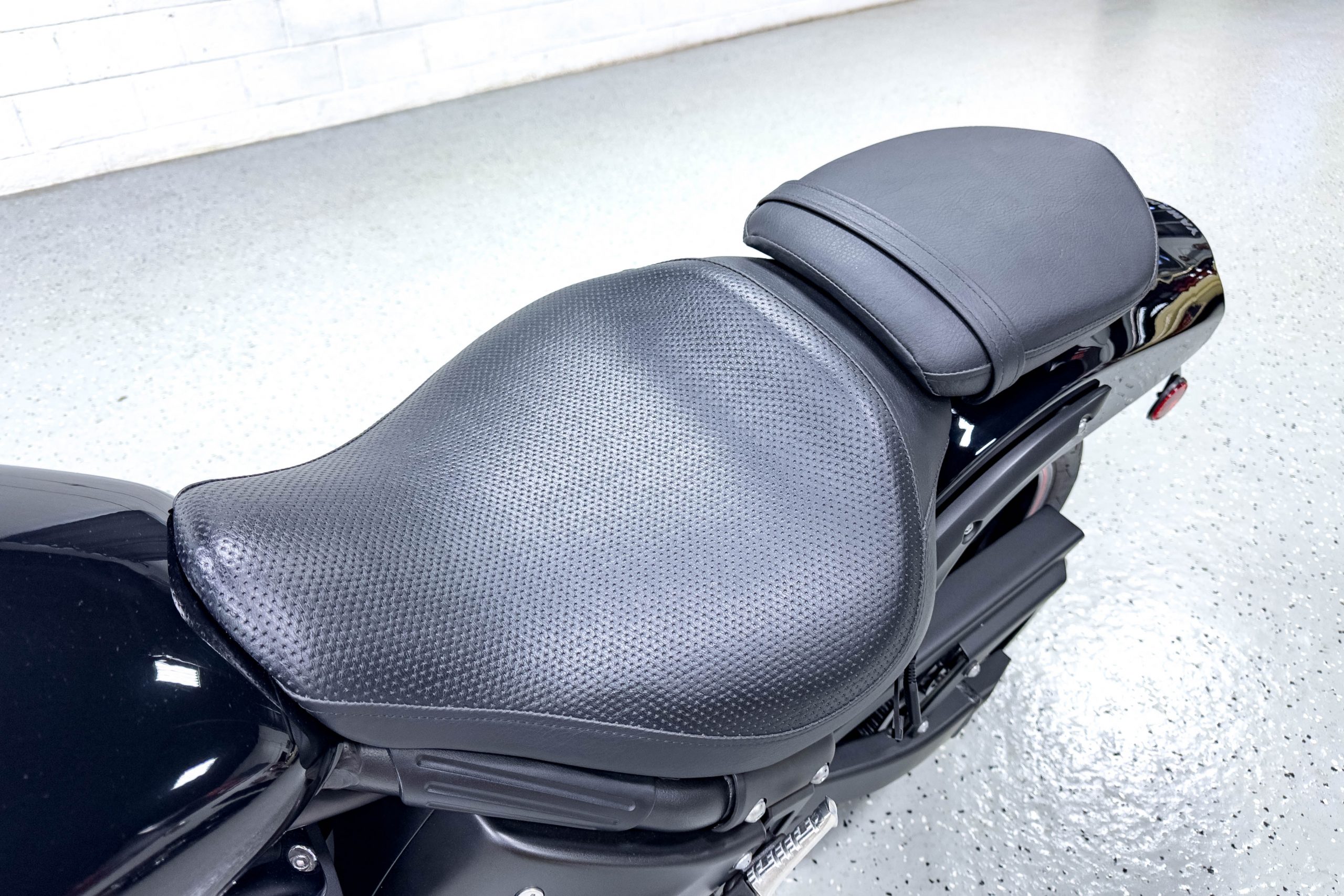 The Midnight Warrior is powered by a fuel injected 1,670cc 4-stroke V-twin air-cooled engine rated at 84 horsepower at 4,400 rpm and 99 lb.-ft. of torque at 3,750 rpm mated to a 5-speed manual transmission with a wet multi-disc clutch and a belt drive. The bike features an aluminum frame with 41mm Kayaba inverted telescoping front fork suspension borrowed from the R1 super bike and an adjustable link monocross rear suspension. Braking is handled by a dual 298mm front discs and a single 282mm rear disc. It rides on 3-spoke cast aluminum wheels sized 18″ up front with a 120mm tire and a 17″ out back with a 200mm tire. Weighing in at just 606lbs, this cruiser has 7.2 horsepower per 1 pound of weight enabling it to blast through the 1/4 mile in 12.7 seconds at 103mph.
