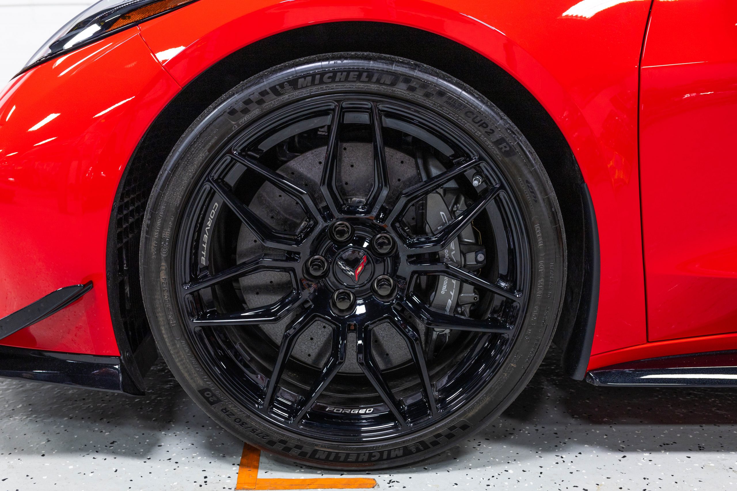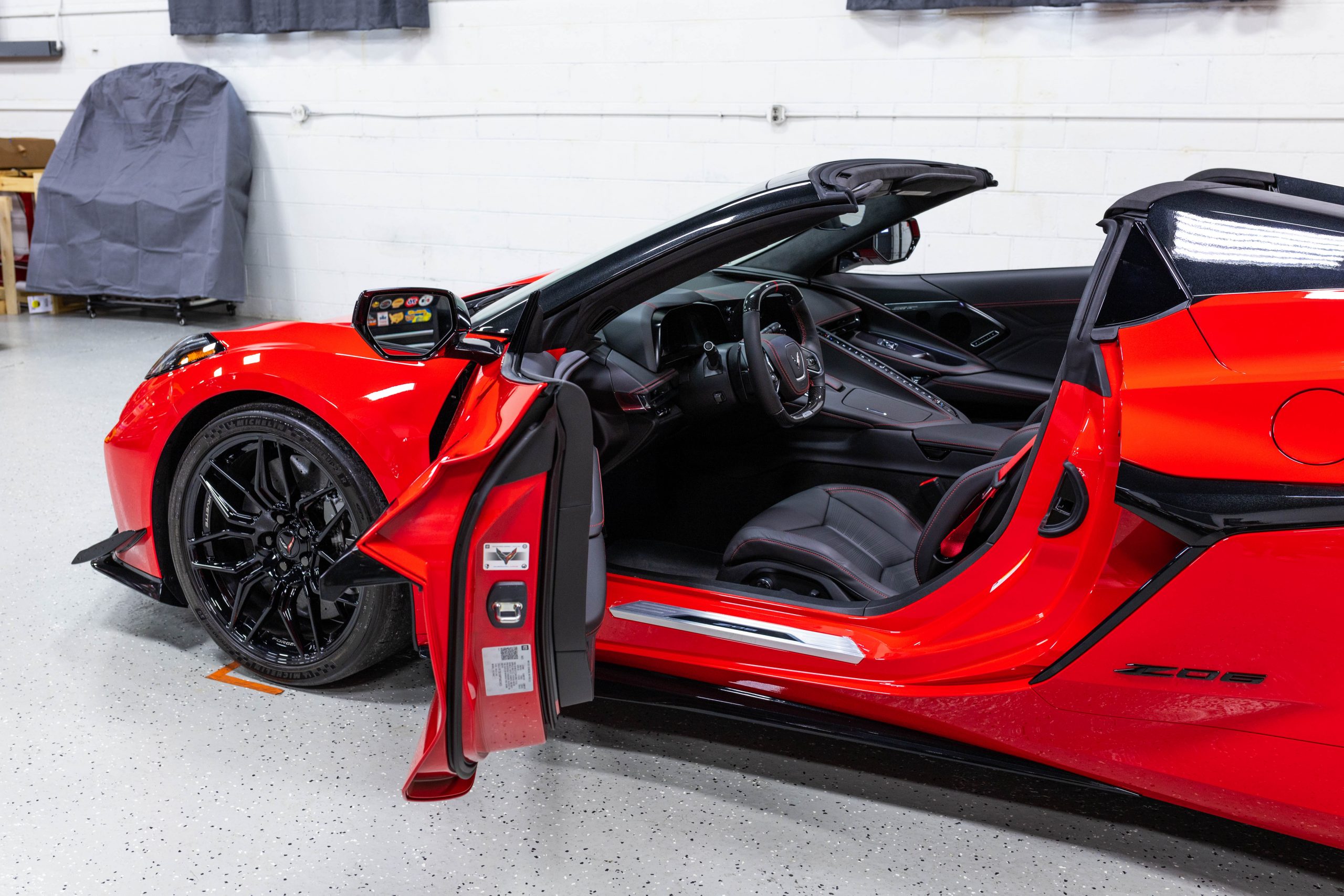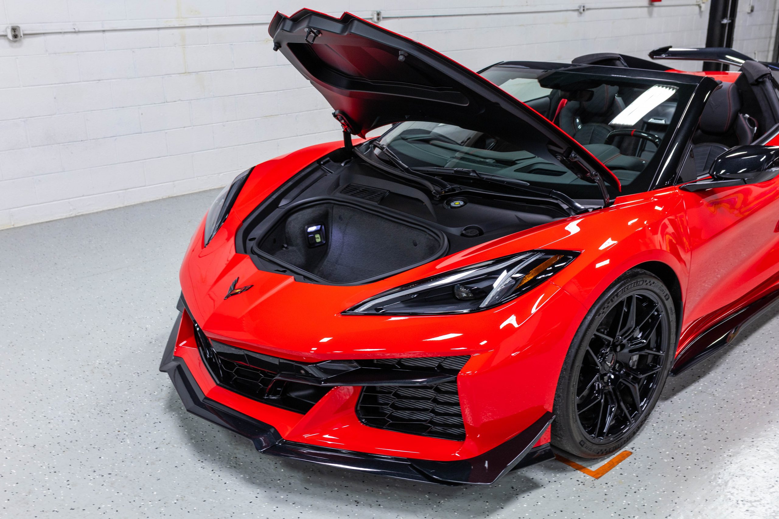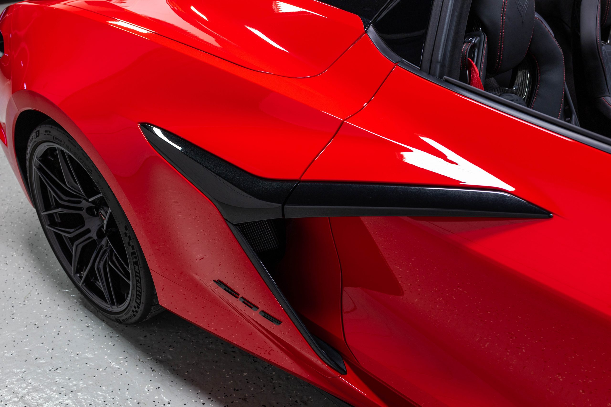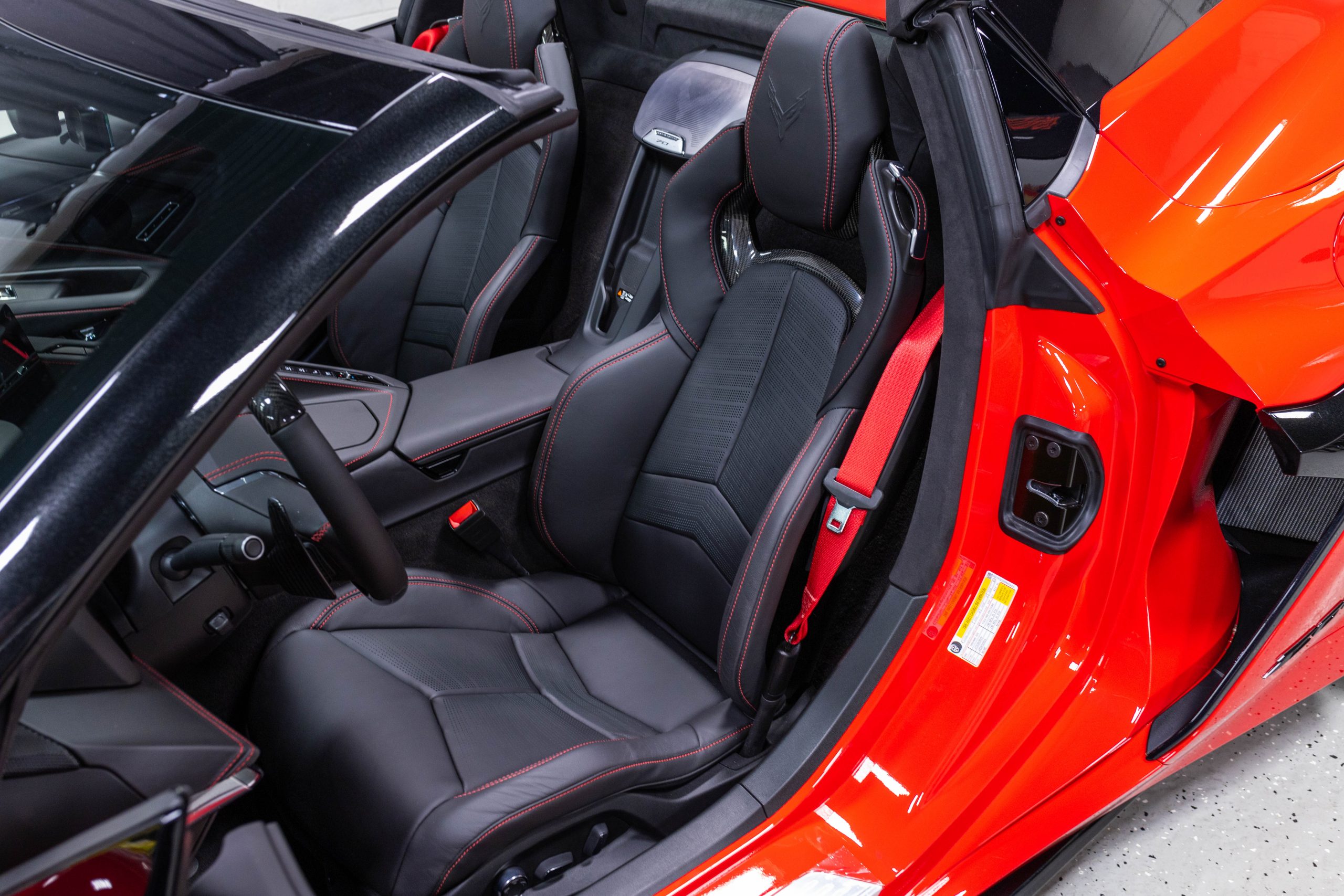 Most notably, it is equipped with the $8,995 Z06 Ultimate Performance Package which afforded the Z07 suspension and Brembo ceramic brakes, the $8,495 Carbon Aero Package, and the $2,595 Front Axle Lift Suspension. Additional optional equipment includes black painted spider design aluminum wheels, red seat belts, red seat stitching, and carbon flash painted exterior accents.