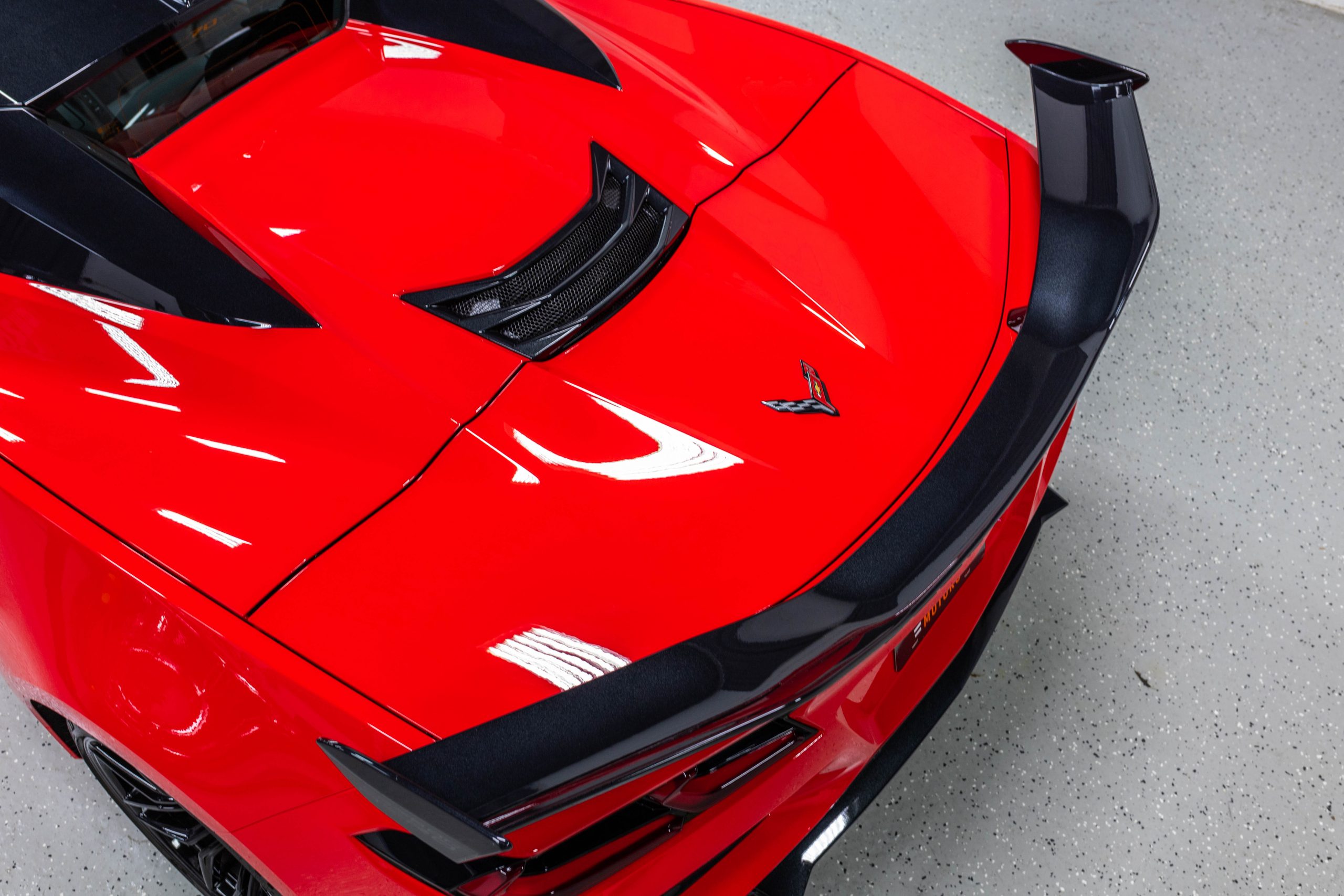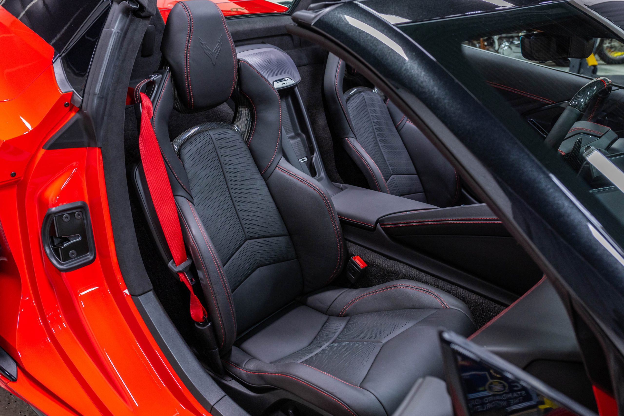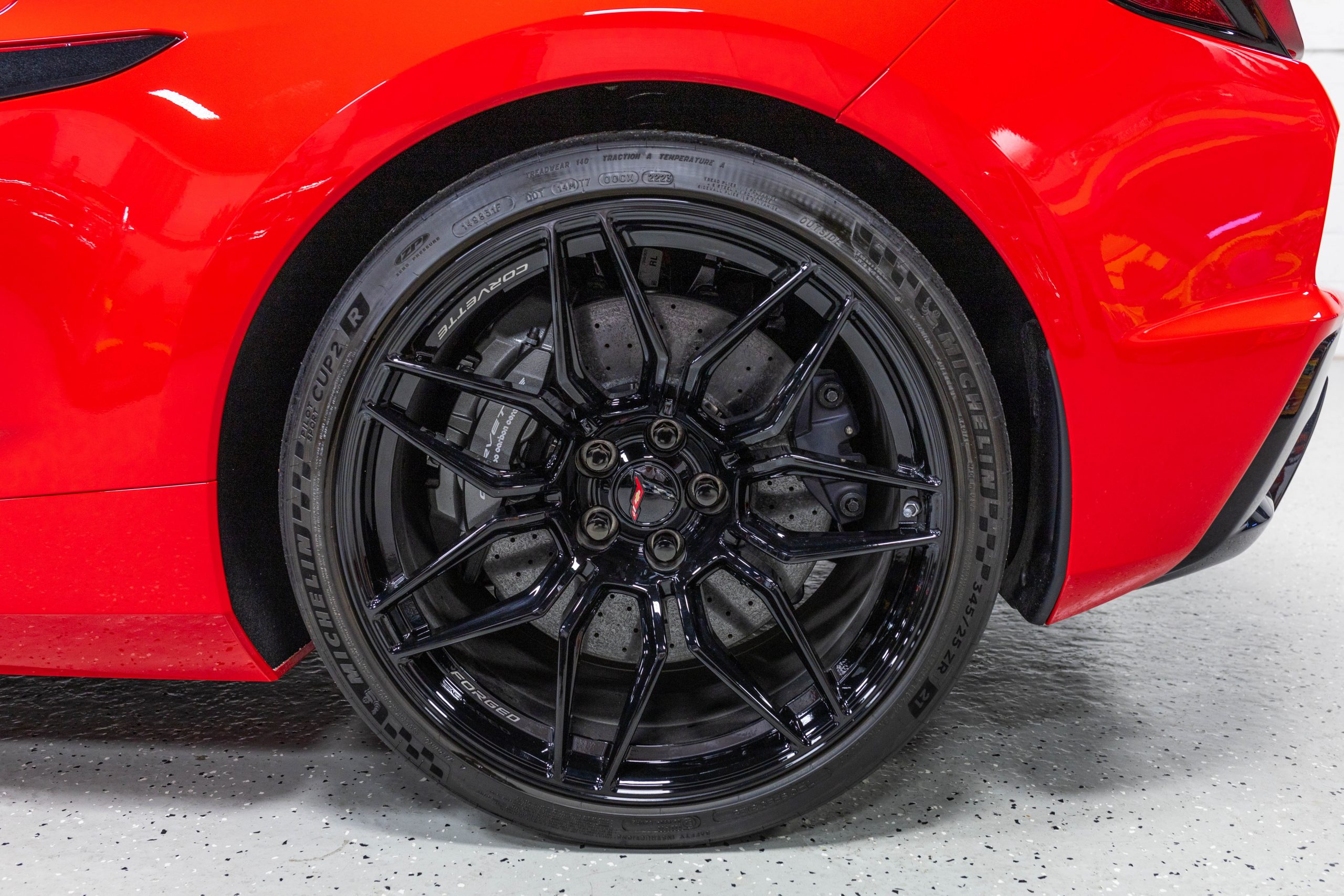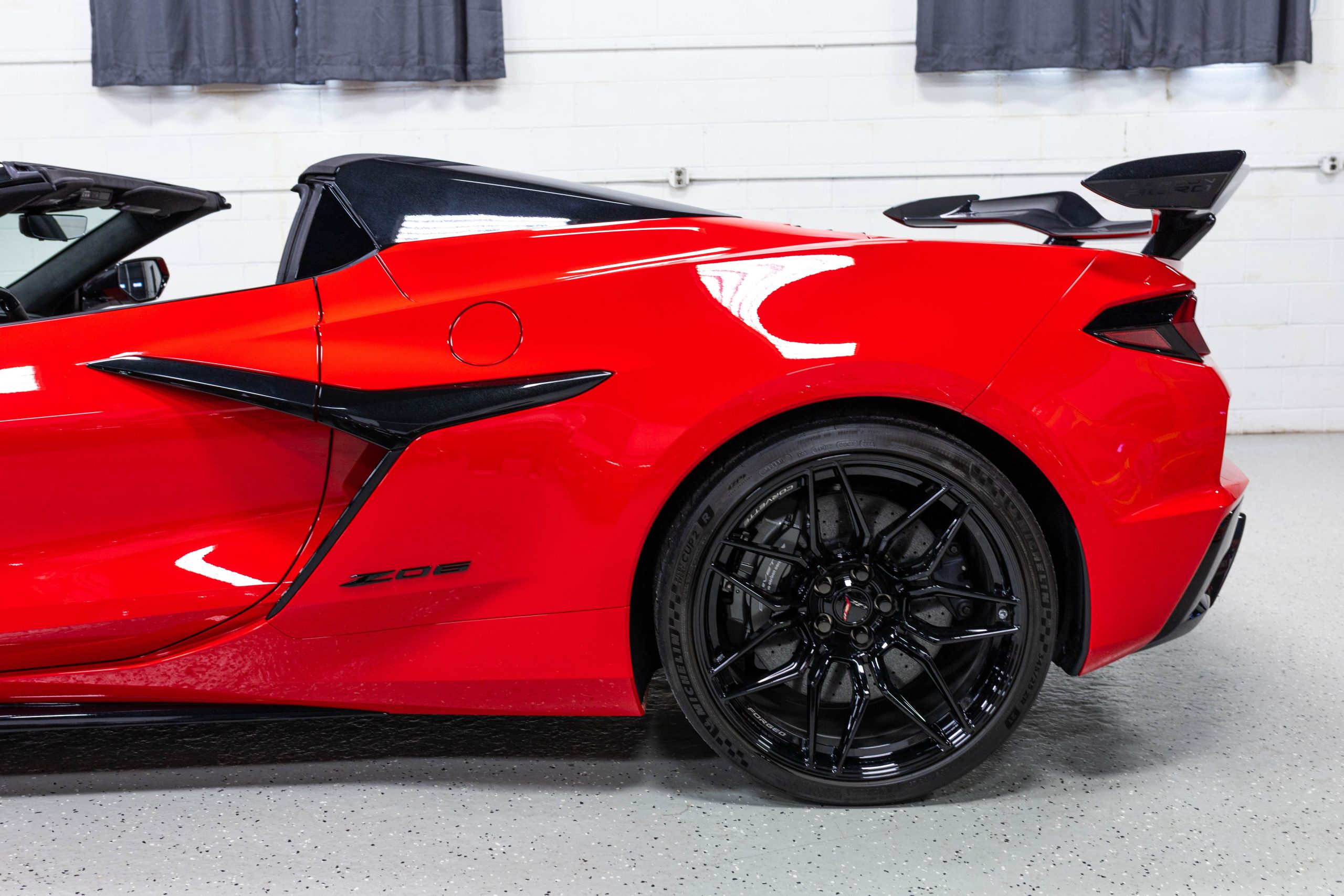 Most notably, it is equipped with the $8,995 Z06 Ultimate Performance Package which afforded the Z07 suspension and Brembo ceramic brakes, the $8,495 Carbon Aero Package, and the $2,595 Front Axle Lift Suspension. Additional optional equipment includes black painted spider design aluminum wheels, red seat belts, red seat stitching, and carbon flash painted exterior accents.