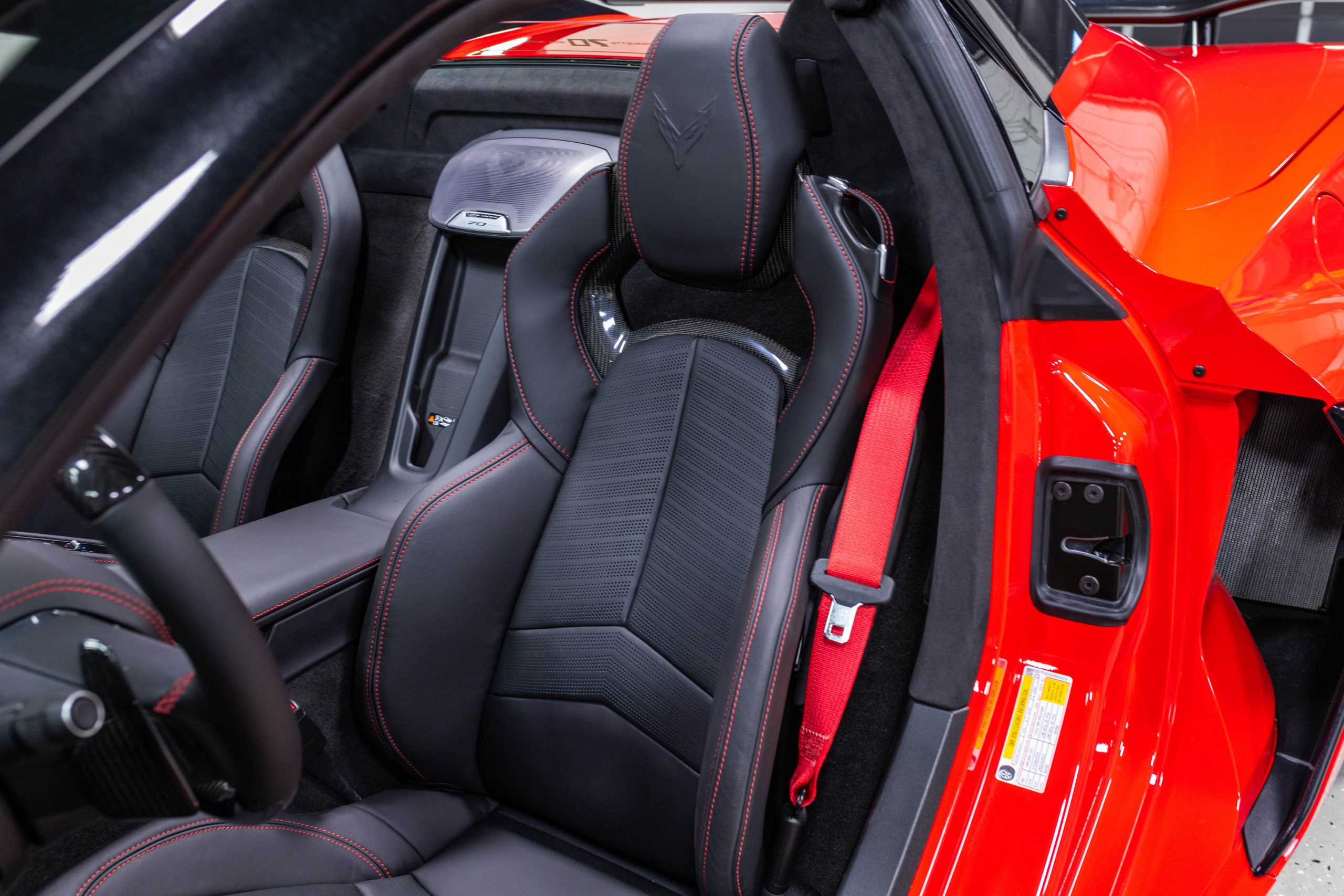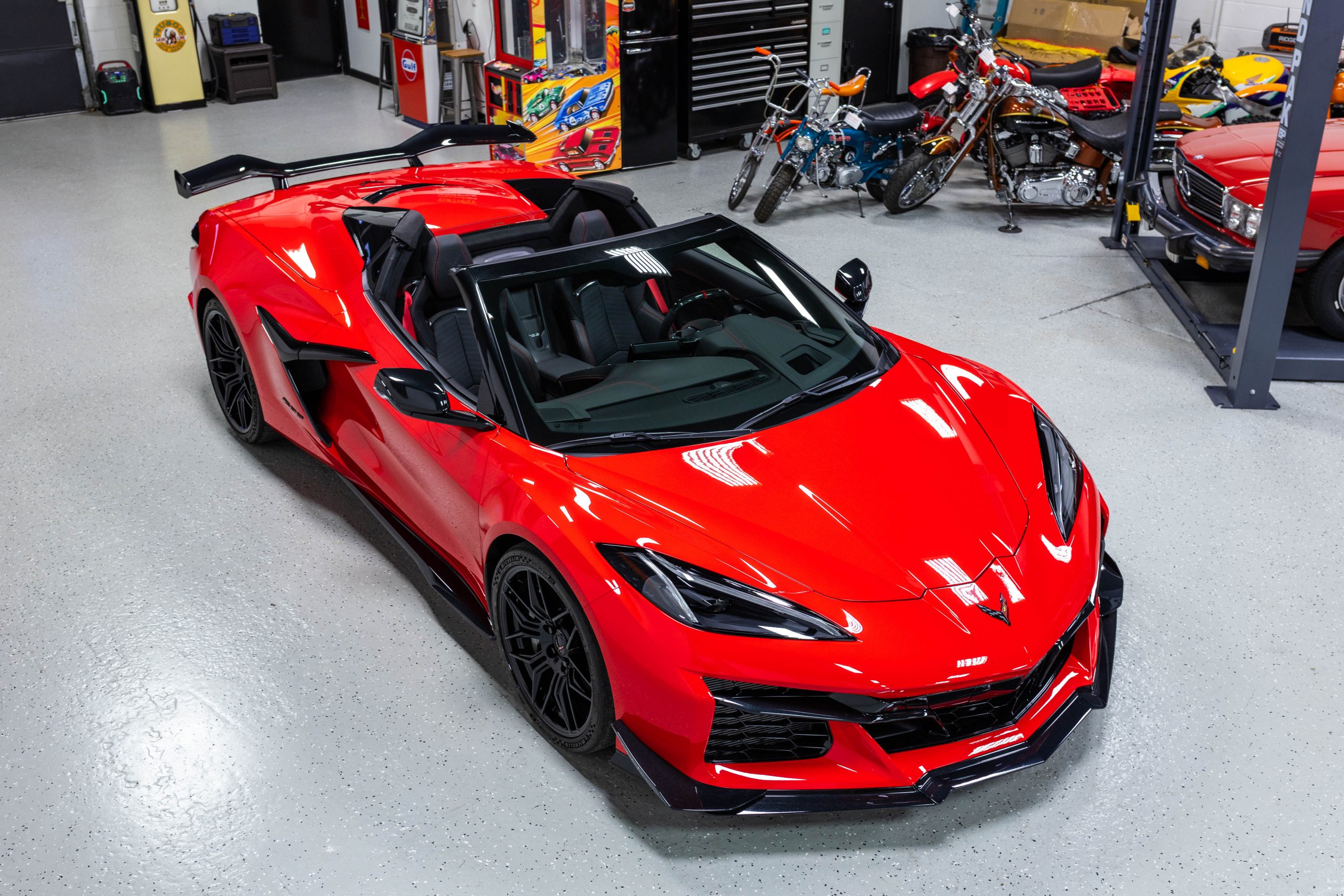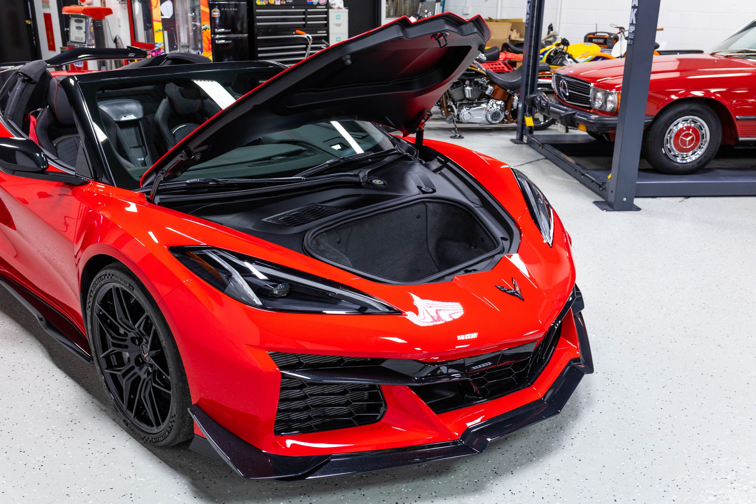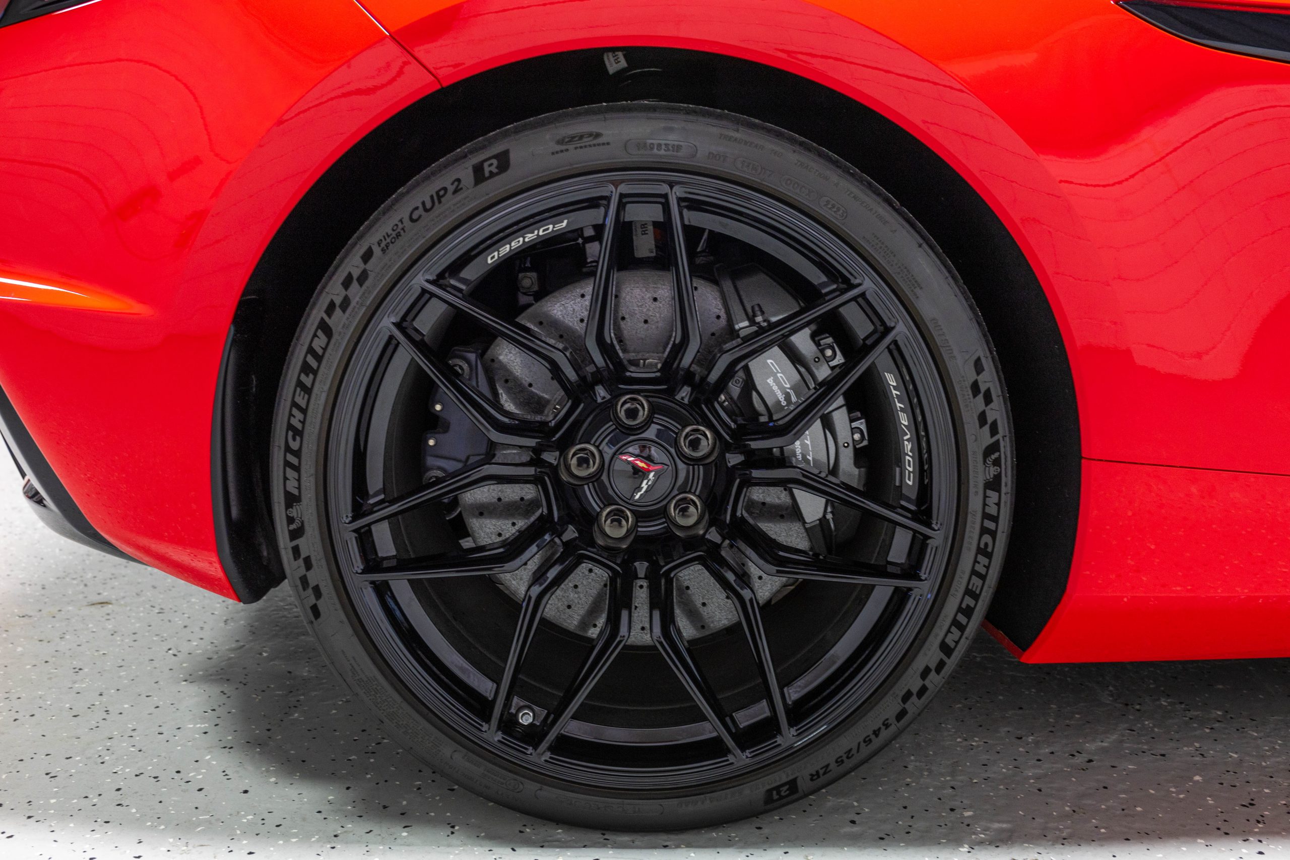 Most notably, it is equipped with the $8,995 Z06 Ultimate Performance Package which afforded the Z07 suspension and Brembo ceramic brakes, the $8,495 Carbon Aero Package, and the $2,595 Front Axle Lift Suspension. Additional optional equipment includes black painted spider design aluminum wheels, red seat belts, red seat stitching, and carbon flash painted exterior accents.