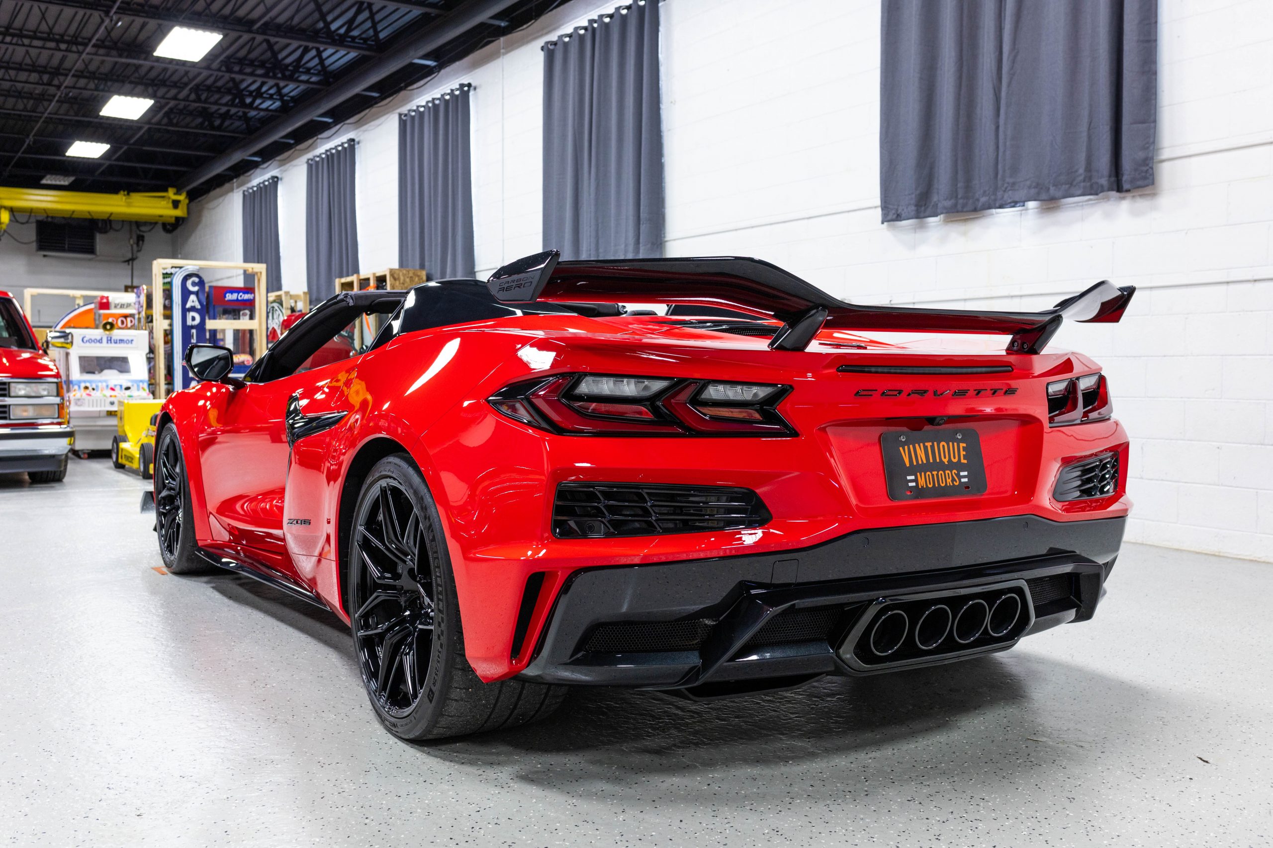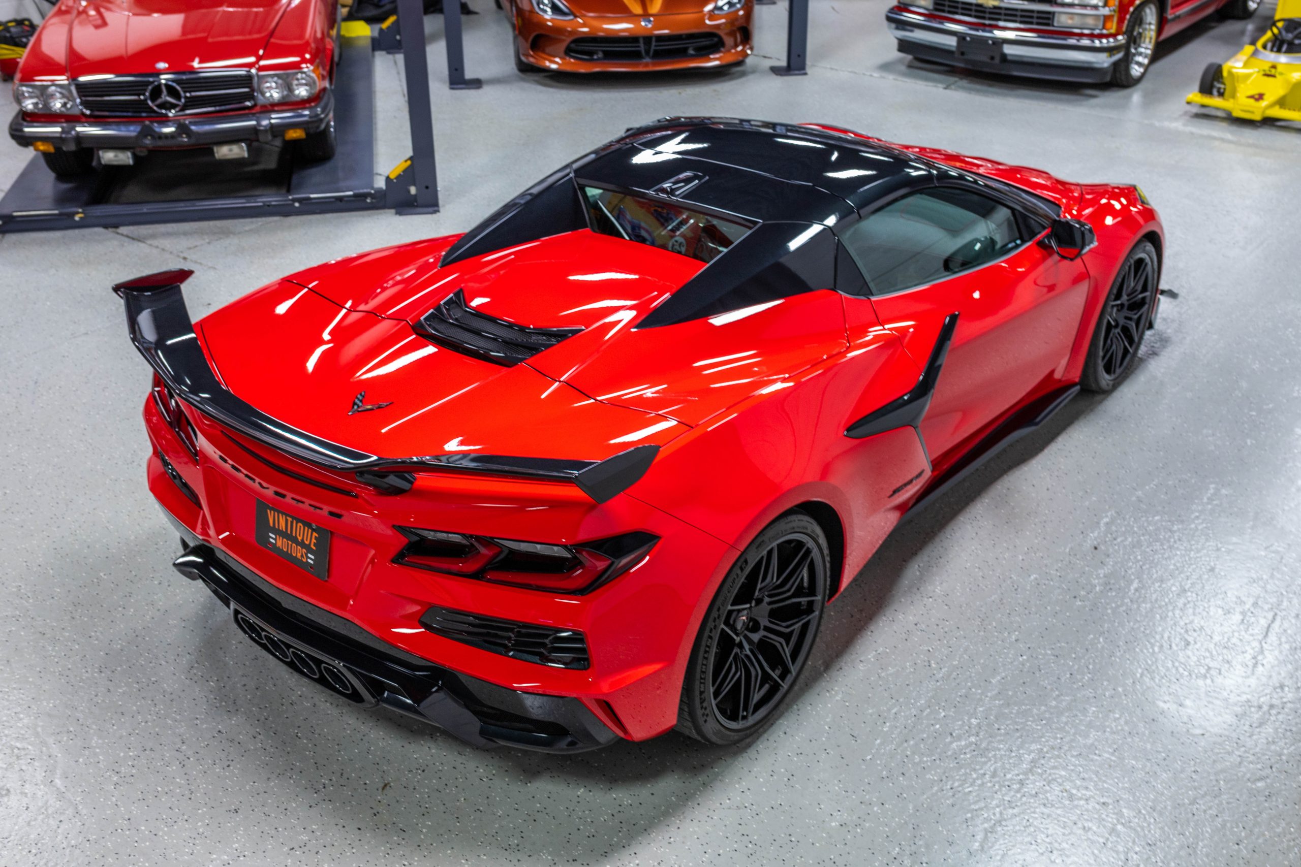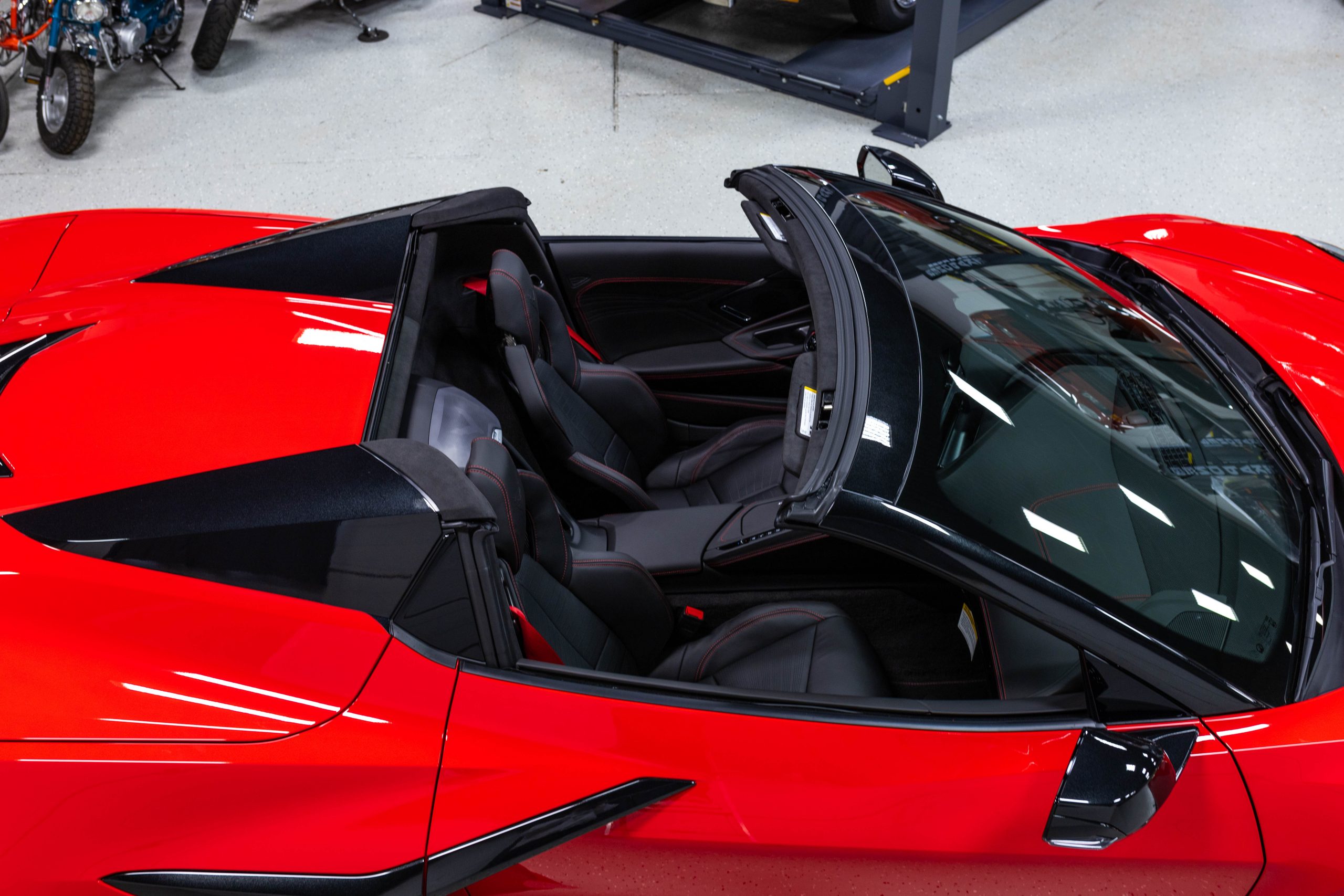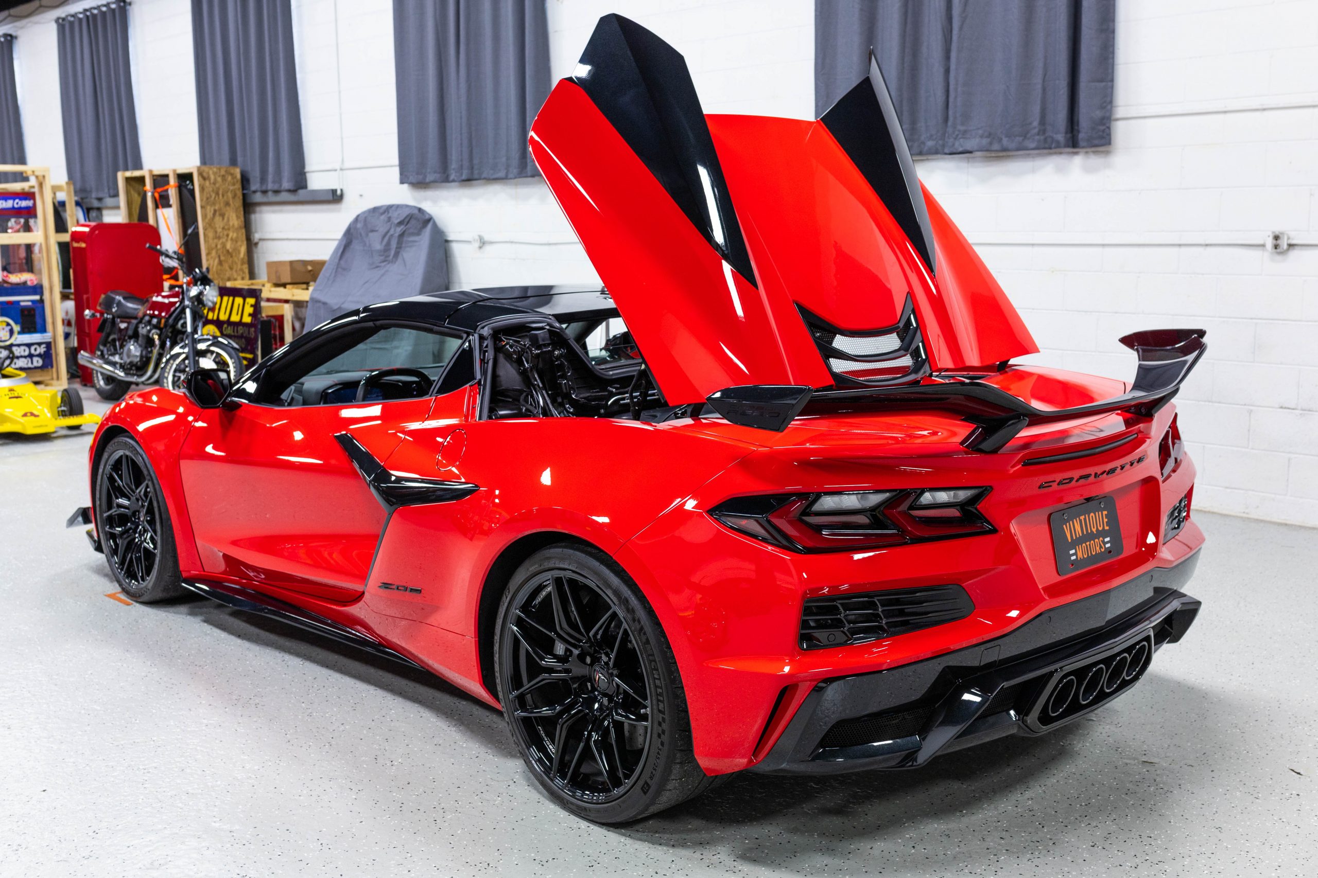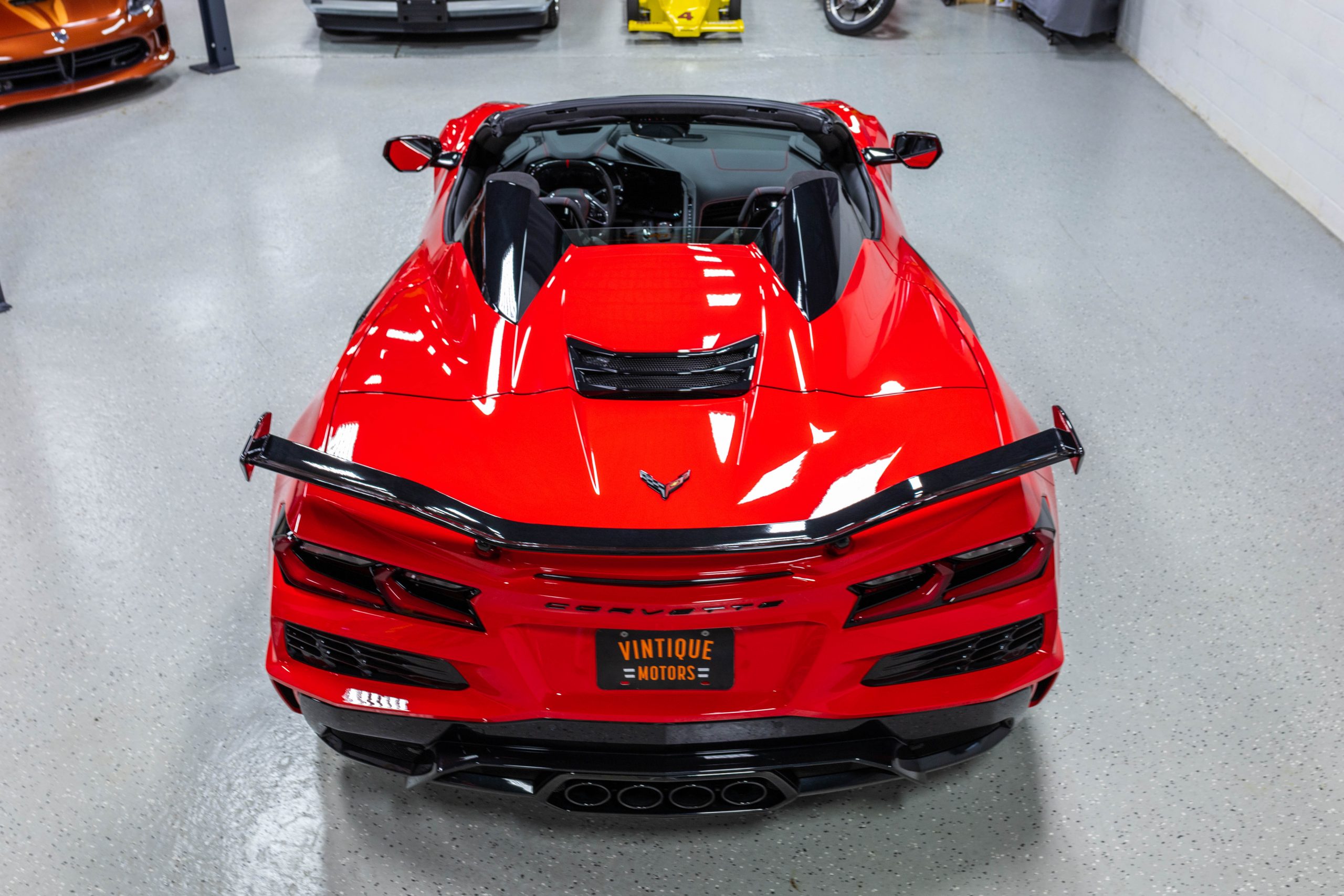 The mid-mounted 5.5-liter LT6 V8 is equipped with a flat-plane crankshaft and was factory rated at 670 horsepower and 460 lb-ft of torque mated to a 8-speed dual-clutch automatic with paddle shifters. It is also factory equipped with a performance exhaust system with driver-selectable modes. Other equipment includes a power-retractable hardtop, stealth interior trim package, a Bose 14-speaker sound system, and a Performance Data Recorder.